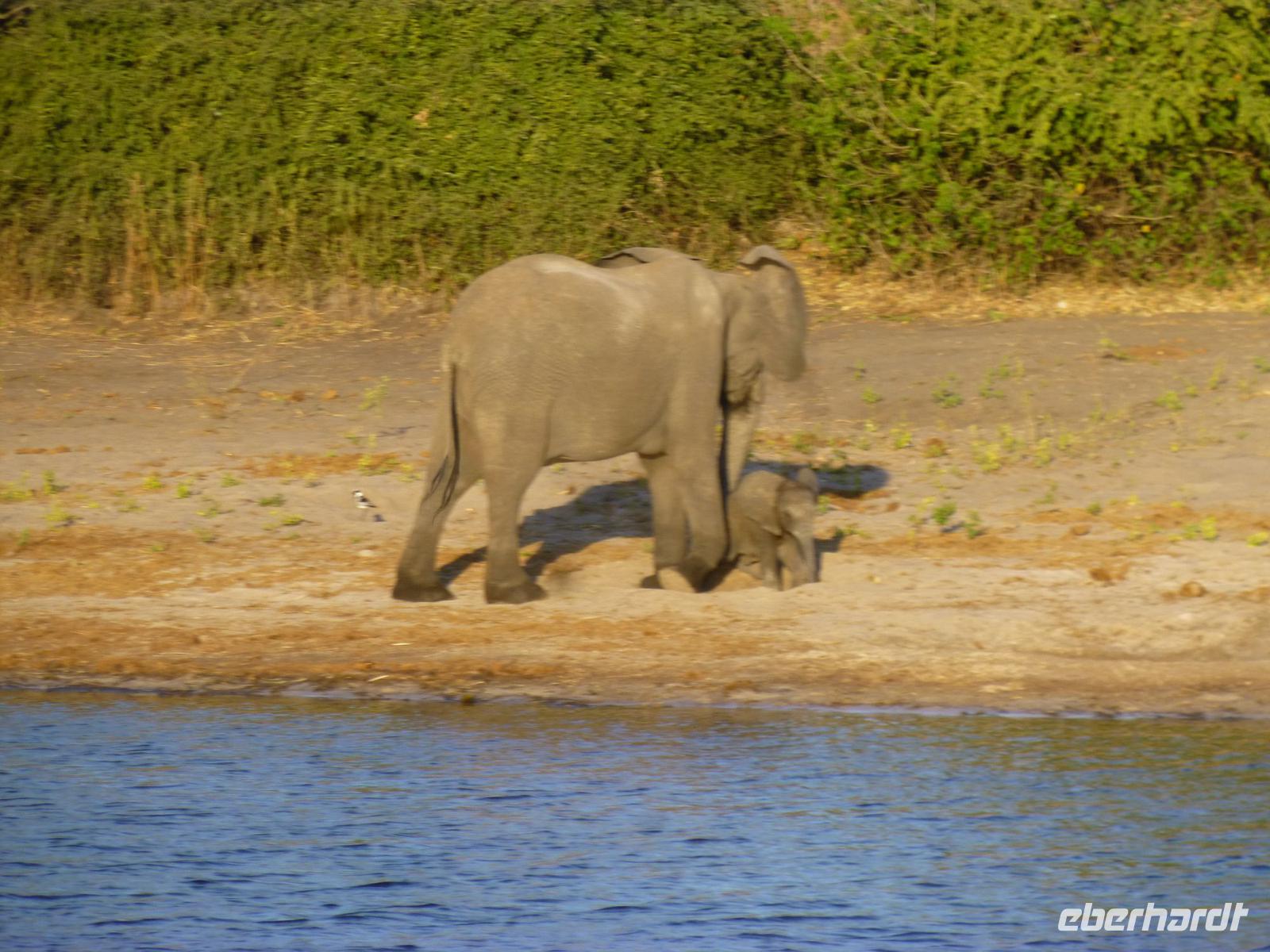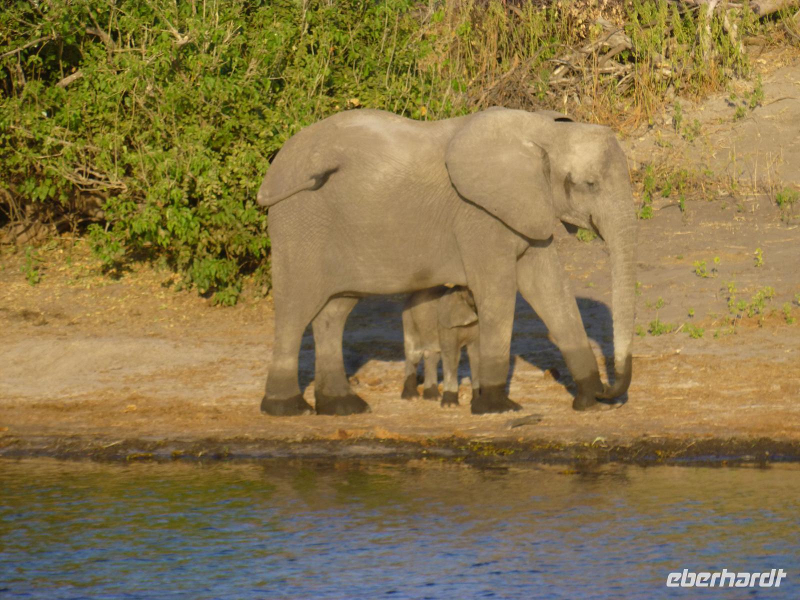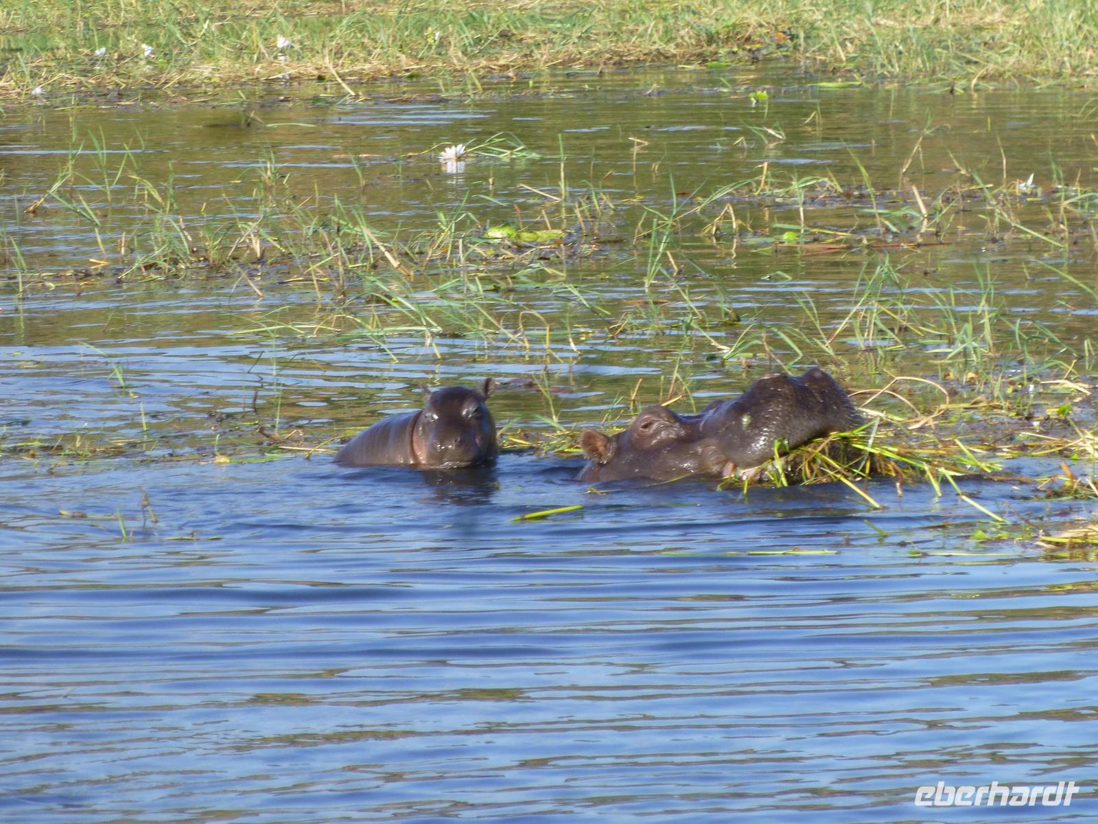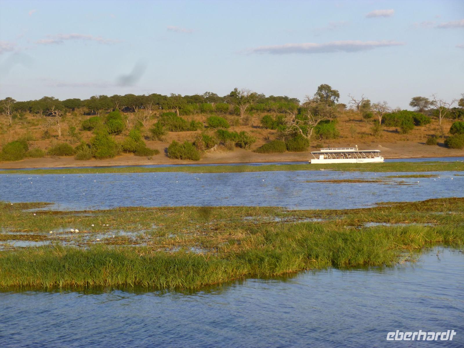 Früh am Morgen klingelt der Wecker und wir begeben uns mit dem Jeep auf eine Pirschfahrt durch den Nationalpark. Nach unserer Einfahrt in den Nationalpark waren wir noch gar nicht auf Tierbeobachtungen vorbereitet. Plötzlich tauchte direkt an der Straße ein Löwenpärchen auf. Erst sahen wir die Löwin und majestätisch stolzierte der Löwe hinter ihr her. Weiter ging die Fahrt durch den Nationalpark. Besonders beeindruckt waren wir von der Kraft des Leoparden. Leider war keiner zu sehen. Aber in der Gabelung eines Baumes hing ein erlegte Antilope. Auf der Rückfahrt sahen wir noch eine große Herde Büffel, Elefanten und die ersten Hypos. Das frühe aufstehen hatte sich gelohnt eine sehr gute Ausbeute. Nach unserer Rückkehr in der Lodge stärken wir uns am Frühstücksbuffet. Wir hatten etwas Zeit zum relaxen bevor wir eine Bootsfahrt auf dem Chope unternahmen. Wir hatten Glück wir fuhren mit dem großen Boot hinaus und nur eine kleine Gruppe aus Deutschland mit uns. Wir beobachten Krokodile und eine Herde Elefanten sowie die kleinen Bienenfresser. Besonders interessant war die Beobachtung eines kleinen Elefanten der gerade säugte. Und nun endlich die ersten Hypos von der Nähe. Sie standen am Ufer begaben sich in die richtige Foto Position. Auf einer kleinen Insel waren einige Hypos zu sehen. Wir konnten sie beim fressen beobachten schön war zu sehen wir eine Mutter ihr Kleines auf dem Rücken trug. Ein schöner Sonnenuntergang beendete diesen ereignisreichen Tag.