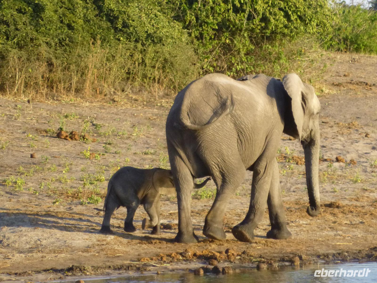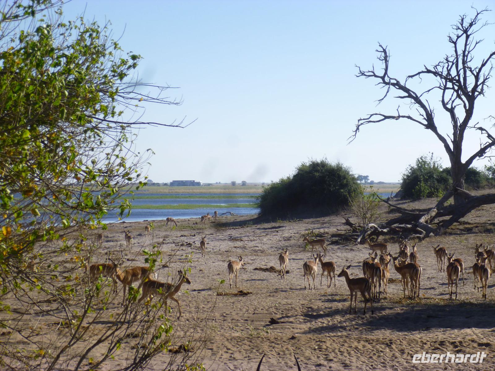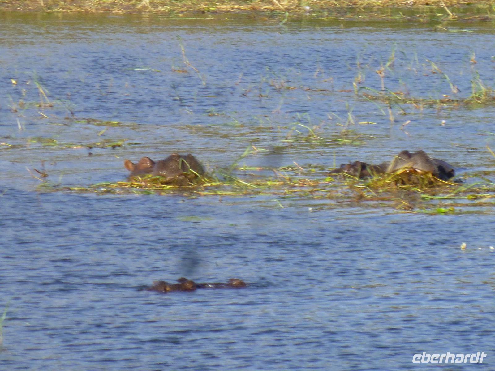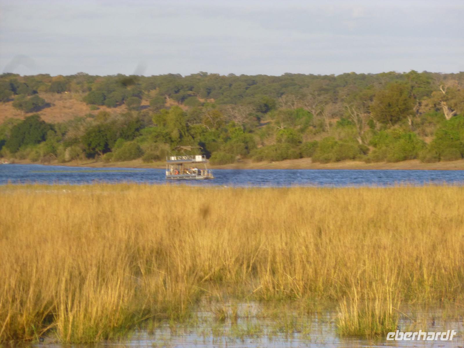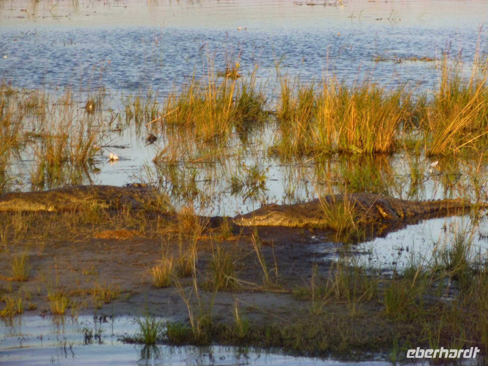 Früh am Morgen klingelt der Wecker und wir begeben uns mit dem Jeep auf eine Pirschfahrt durch den Nationalpark. Nach unserer Einfahrt in den Nationalpark waren wir noch gar nicht auf Tierbeobachtungen vorbereitet. Plötzlich tauchte direkt an der Straße ein Löwenpärchen auf. Erst sahen wir die Löwin und majestätisch stolzierte der Löwe hinter ihr her. Weiter ging die Fahrt durch den Nationalpark. Besonders beeindruckt waren wir von der Kraft des Leoparden. Leider war keiner zu sehen. Aber in der Gabelung eines Baumes hing ein erlegte Antilope. Auf der Rückfahrt sahen wir noch eine große Herde Büffel, Elefanten und die ersten Hypos. Das frühe aufstehen hatte sich gelohnt eine sehr gute Ausbeute. Nach unserer Rückkehr in der Lodge stärken wir uns am Frühstücksbuffet. Wir hatten etwas Zeit zum relaxen bevor wir eine Bootsfahrt auf dem Chope unternahmen. Wir hatten Glück wir fuhren mit dem großen Boot hinaus und nur eine kleine Gruppe aus Deutschland mit uns. Wir beobachten Krokodile und eine Herde Elefanten sowie die kleinen Bienenfresser. Besonders interessant war die Beobachtung eines kleinen Elefanten der gerade säugte. Und nun endlich die ersten Hypos von der Nähe. Sie standen am Ufer begaben sich in die richtige Foto Position. Auf einer kleinen Insel waren einige Hypos zu sehen. Wir konnten sie beim fressen beobachten schön war zu sehen wir eine Mutter ihr Kleines auf dem Rücken trug. Ein schöner Sonnenuntergang beendete diesen ereignisreichen Tag.