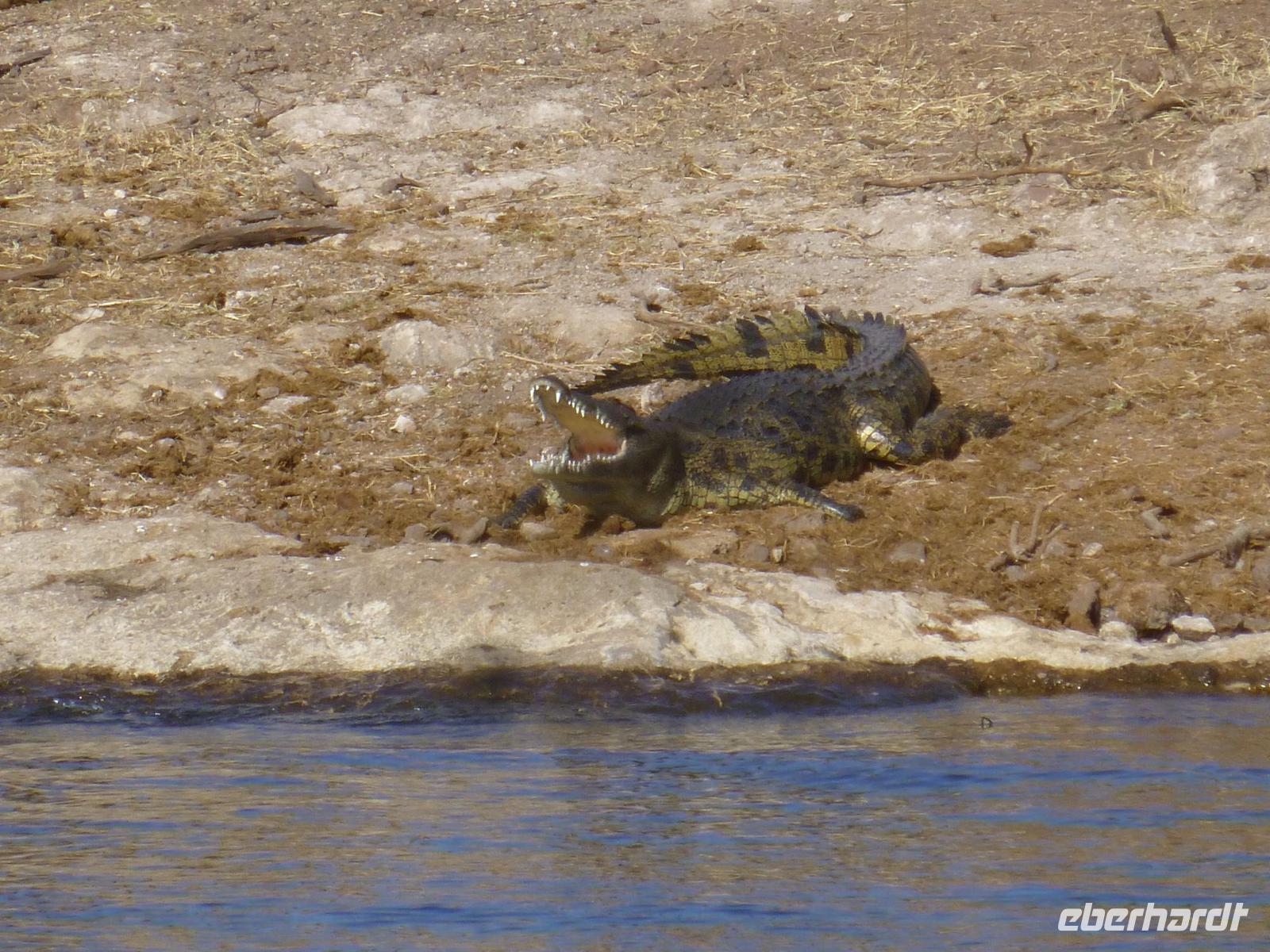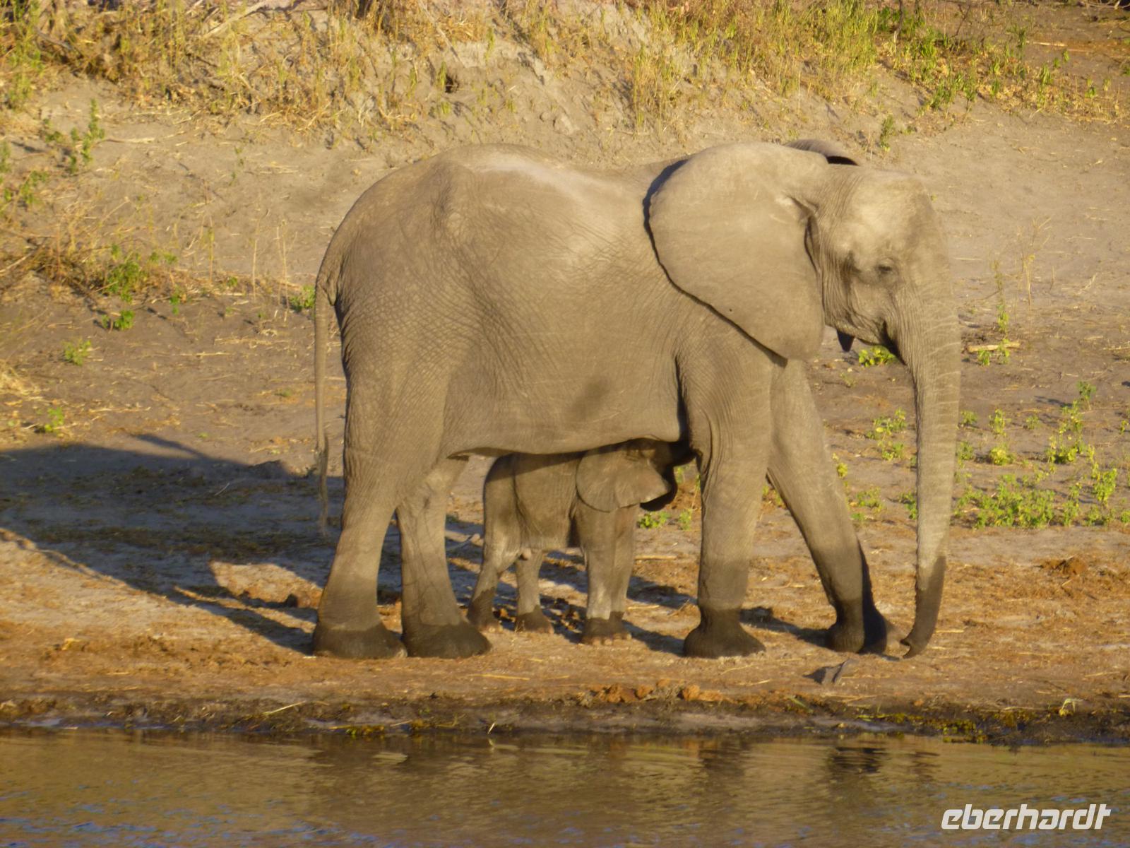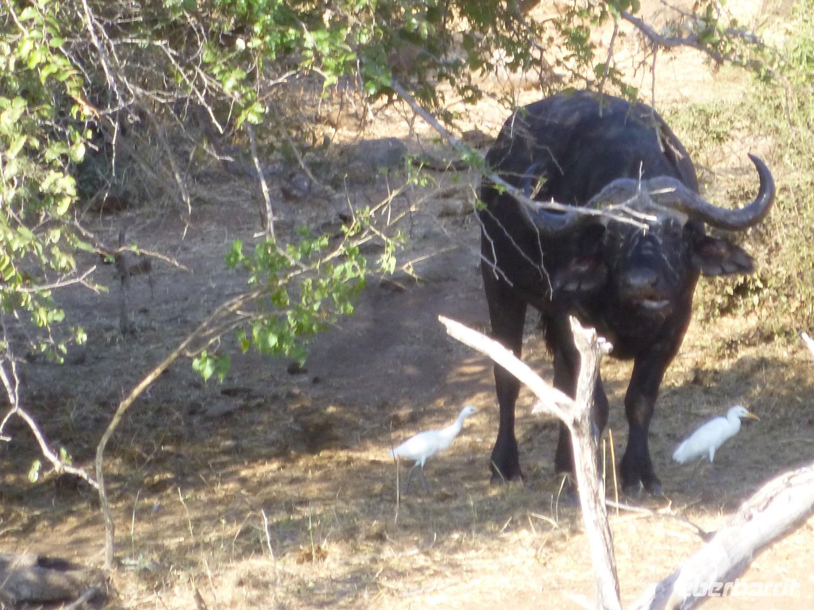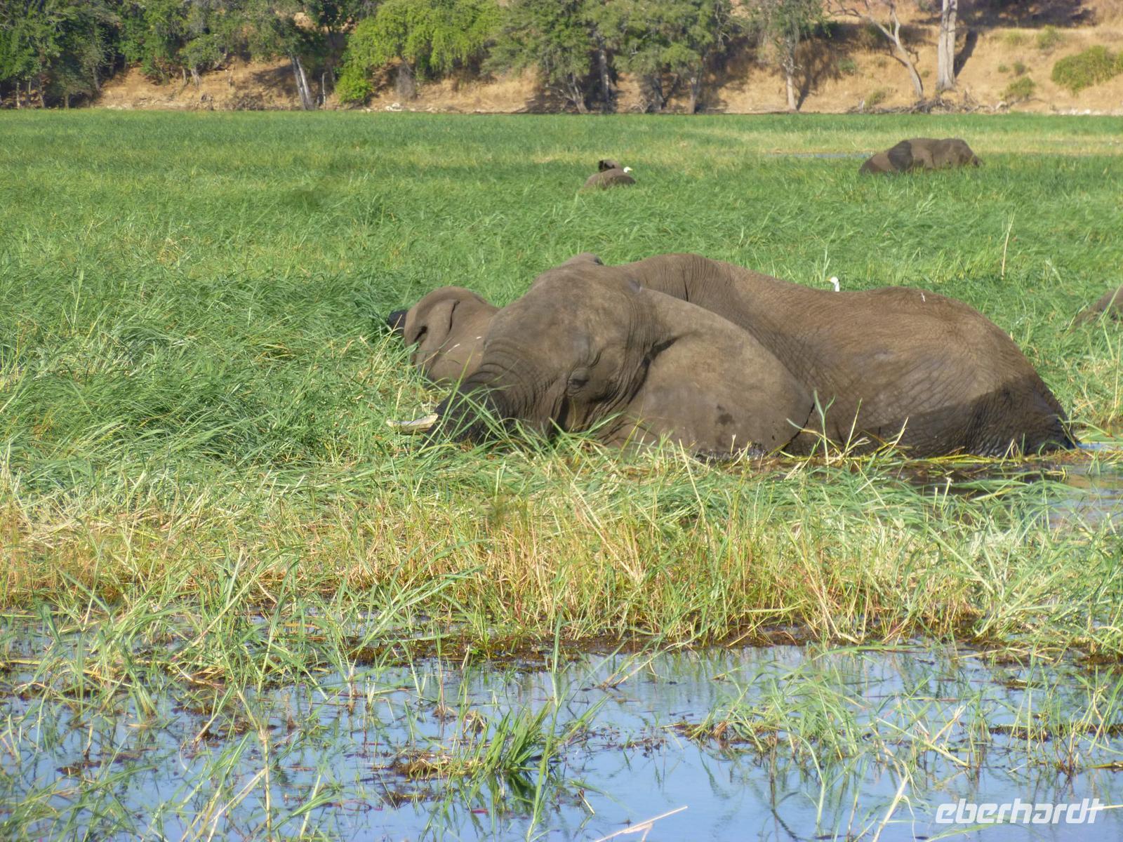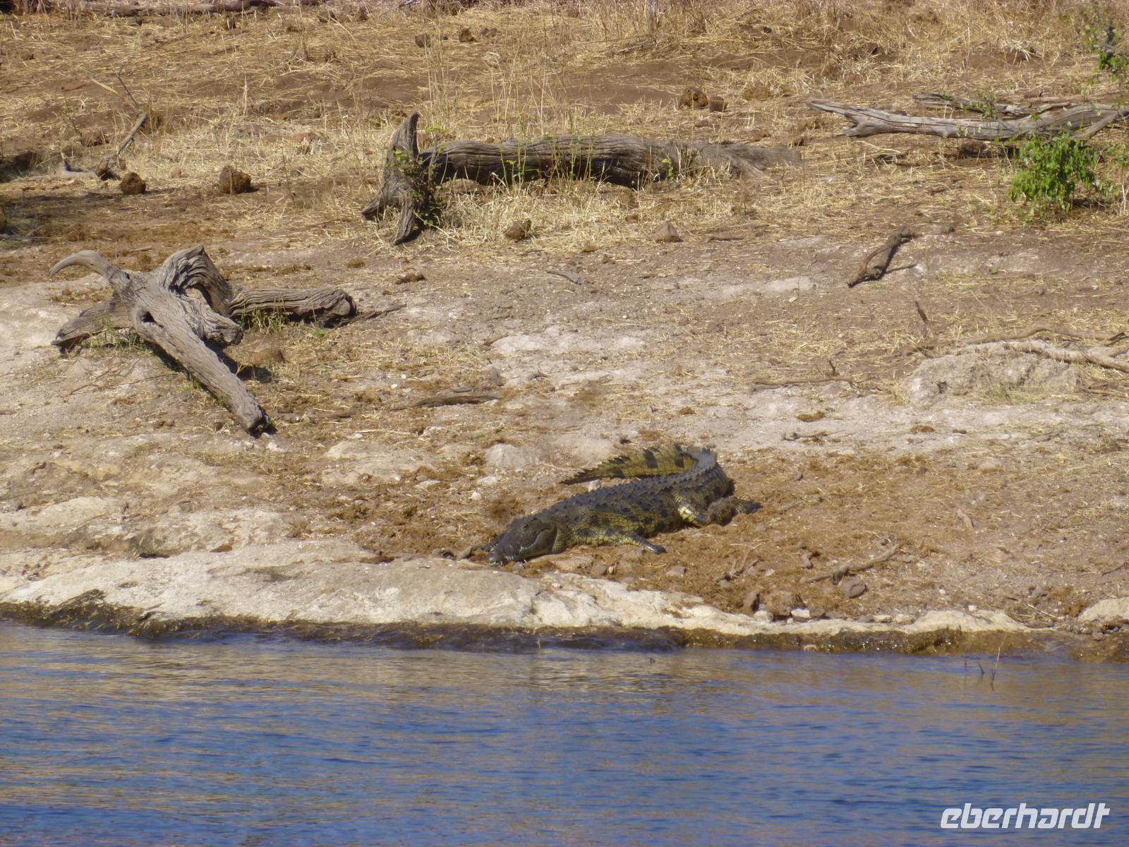 Früh am Morgen klingelt der Wecker und wir begeben uns mit dem Jeep auf eine Pirschfahrt durch den Nationalpark. Nach unserer Einfahrt in den Nationalpark waren wir noch gar nicht auf Tierbeobachtungen vorbereitet. Plötzlich tauchte direkt an der Straße ein Löwenpärchen auf. Erst sahen wir die Löwin und majestätisch stolzierte der Löwe hinter ihr her. Weiter ging die Fahrt durch den Nationalpark. Besonders beeindruckt waren wir von der Kraft des Leoparden. Leider war keiner zu sehen. Aber in der Gabelung eines Baumes hing ein erlegte Antilope. Auf der Rückfahrt sahen wir noch eine große Herde Büffel, Elefanten und die ersten Hypos. Das frühe aufstehen hatte sich gelohnt eine sehr gute Ausbeute. Nach unserer Rückkehr in der Lodge stärken wir uns am Frühstücksbuffet. Wir hatten etwas Zeit zum relaxen bevor wir eine Bootsfahrt auf dem Chope unternahmen. Wir hatten Glück wir fuhren mit dem großen Boot hinaus und nur eine kleine Gruppe aus Deutschland mit uns. Wir beobachten Krokodile und eine Herde Elefanten sowie die kleinen Bienenfresser. Besonders interessant war die Beobachtung eines kleinen Elefanten der gerade säugte. Und nun endlich die ersten Hypos von der Nähe. Sie standen am Ufer begaben sich in die richtige Foto Position. Auf einer kleinen Insel waren einige Hypos zu sehen. Wir konnten sie beim fressen beobachten schön war zu sehen wir eine Mutter ihr Kleines auf dem Rücken trug. Ein schöner Sonnenuntergang beendete diesen ereignisreichen Tag.