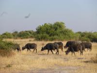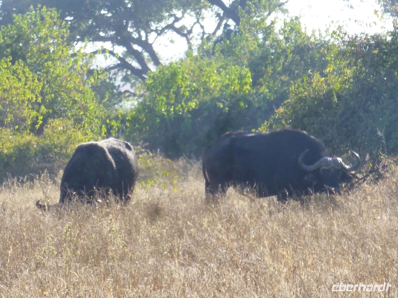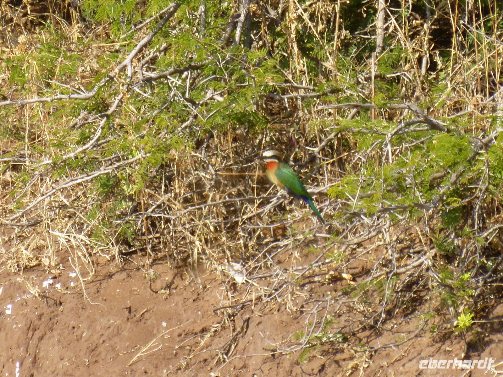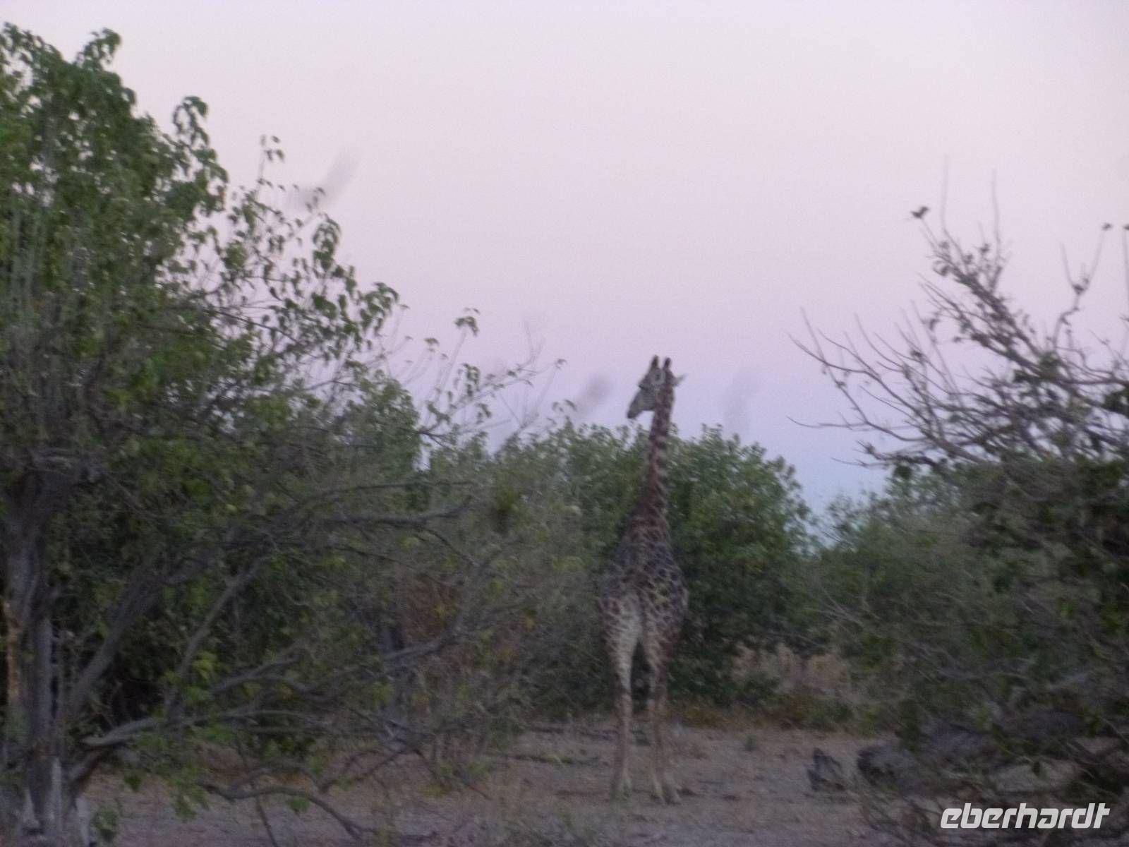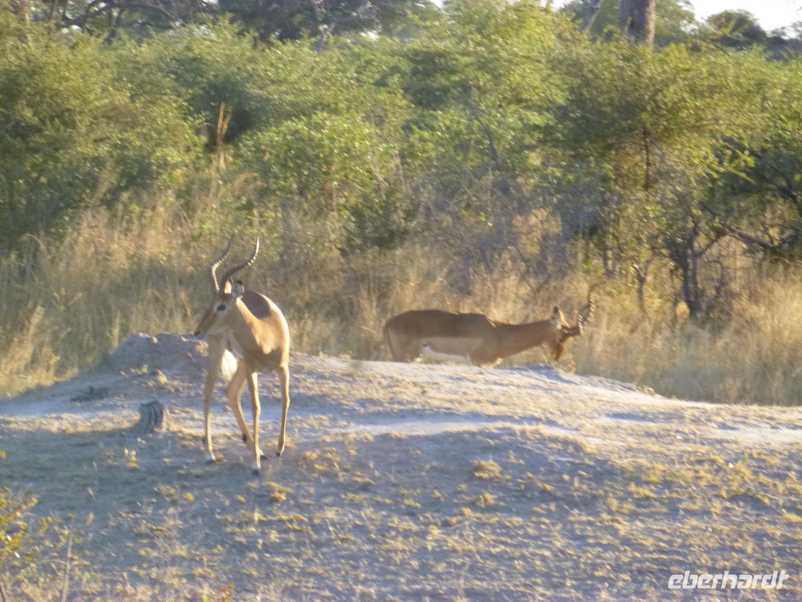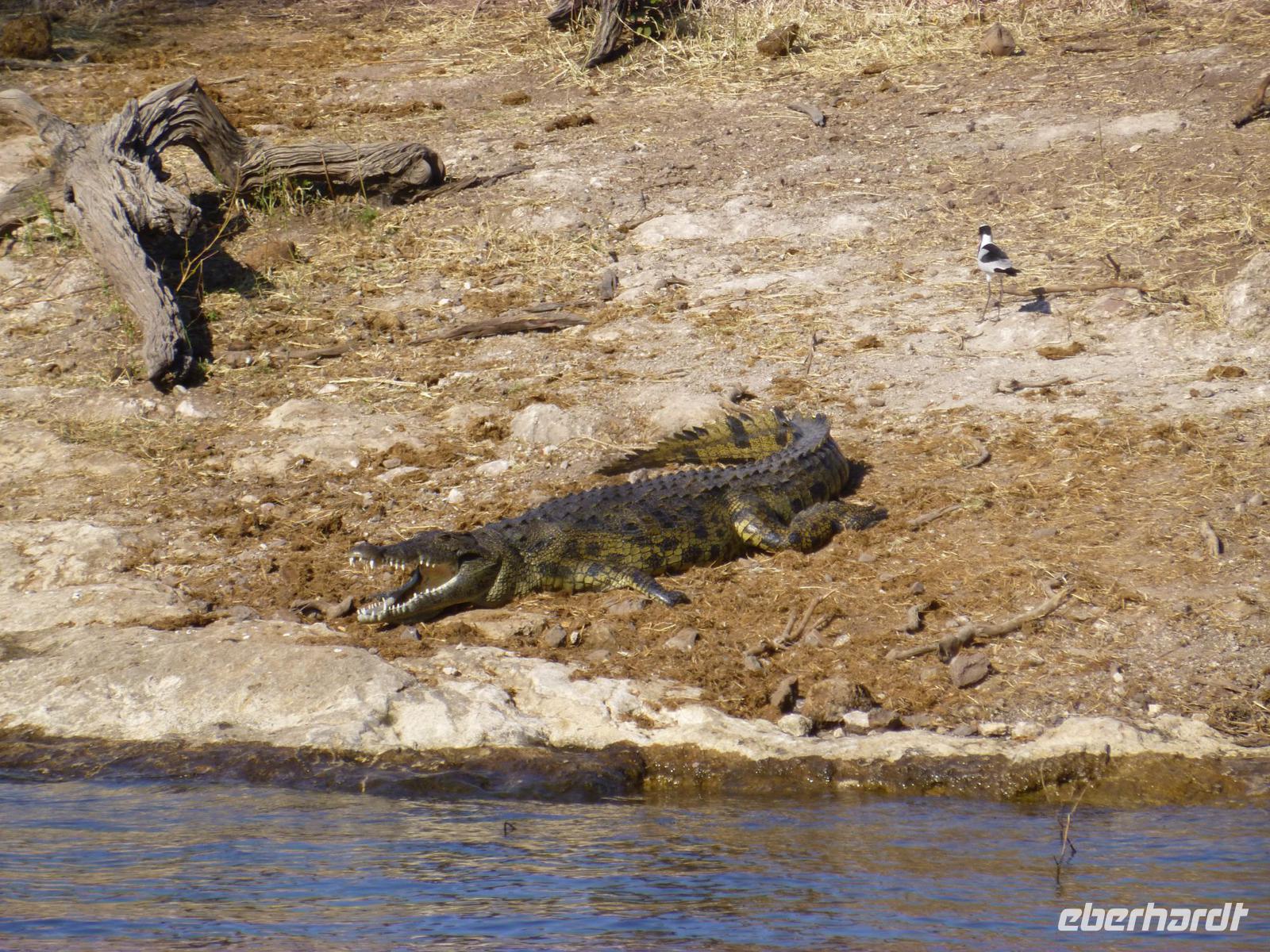 Früh am Morgen klingelt der Wecker und wir begeben uns mit dem Jeep auf eine Pirschfahrt durch den Nationalpark. Nach unserer Einfahrt in den Nationalpark waren wir noch gar nicht auf Tierbeobachtungen vorbereitet. Plötzlich tauchte direkt an der Straße ein Löwenpärchen auf. Erst sahen wir die Löwin und majestätisch stolzierte der Löwe hinter ihr her. Weiter ging die Fahrt durch den Nationalpark. Besonders beeindruckt waren wir von der Kraft des Leoparden. Leider war keiner zu sehen. Aber in der Gabelung eines Baumes hing ein erlegte Antilope. Auf der Rückfahrt sahen wir noch eine große Herde Büffel, Elefanten und die ersten Hypos. Das frühe aufstehen hatte sich gelohnt eine sehr gute Ausbeute. Nach unserer Rückkehr in der Lodge stärken wir uns am Frühstücksbuffet. Wir hatten etwas Zeit zum relaxen bevor wir eine Bootsfahrt auf dem Chope unternahmen. Wir hatten Glück wir fuhren mit dem großen Boot hinaus und nur eine kleine Gruppe aus Deutschland mit uns. Wir beobachten Krokodile und eine Herde Elefanten sowie die kleinen Bienenfresser. Besonders interessant war die Beobachtung eines kleinen Elefanten der gerade säugte. Und nun endlich die ersten Hypos von der Nähe. Sie standen am Ufer begaben sich in die richtige Foto Position. Auf einer kleinen Insel waren einige Hypos zu sehen. Wir konnten sie beim fressen beobachten schön war zu sehen wir eine Mutter ihr Kleines auf dem Rücken trug. Ein schöner Sonnenuntergang beendete diesen ereignisreichen Tag.