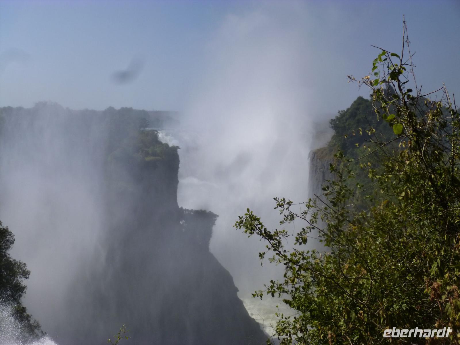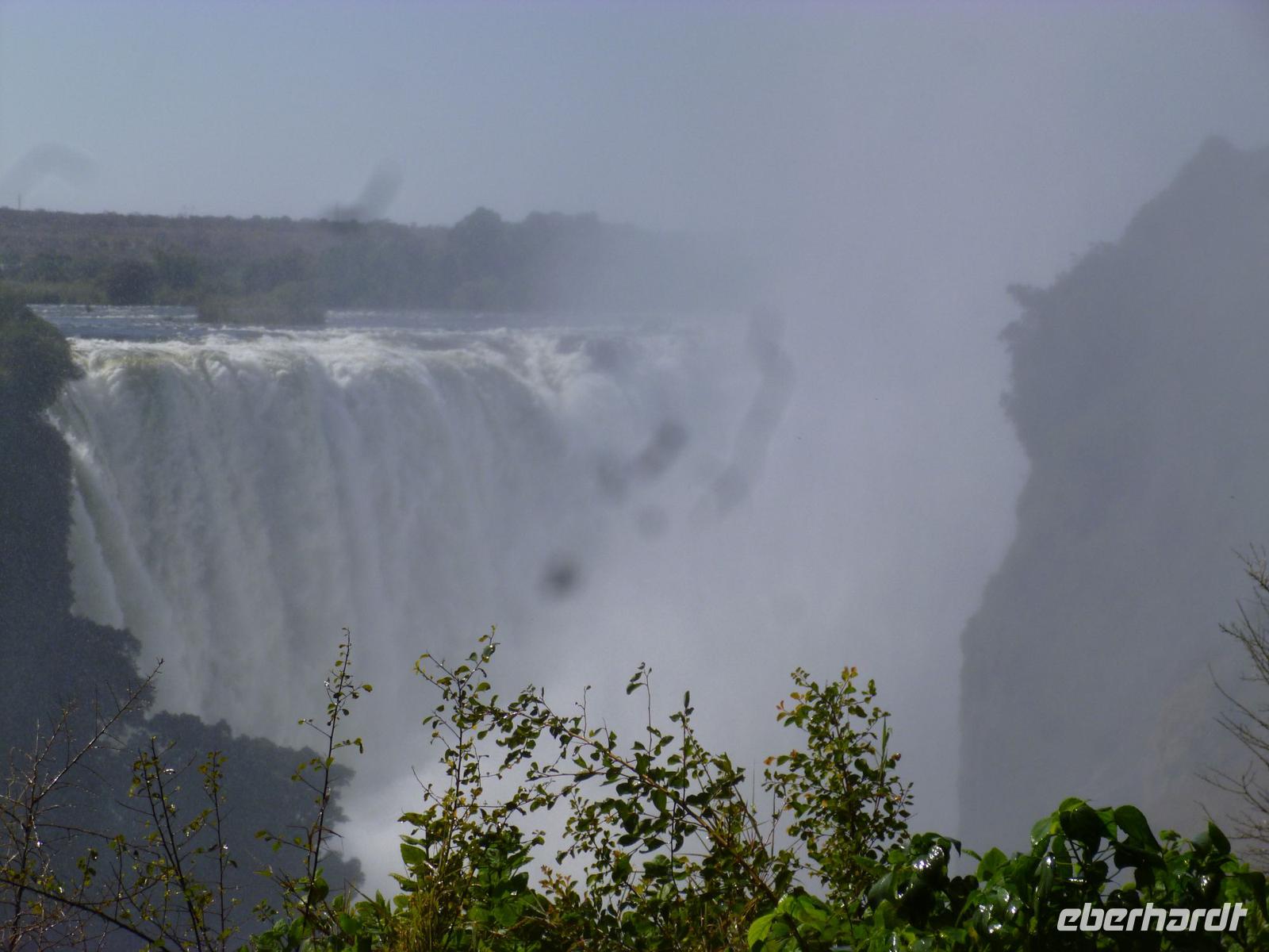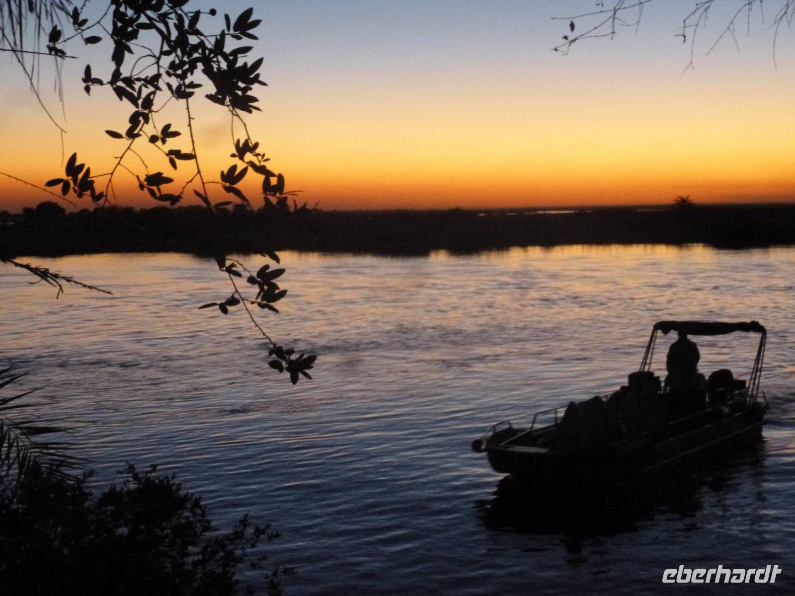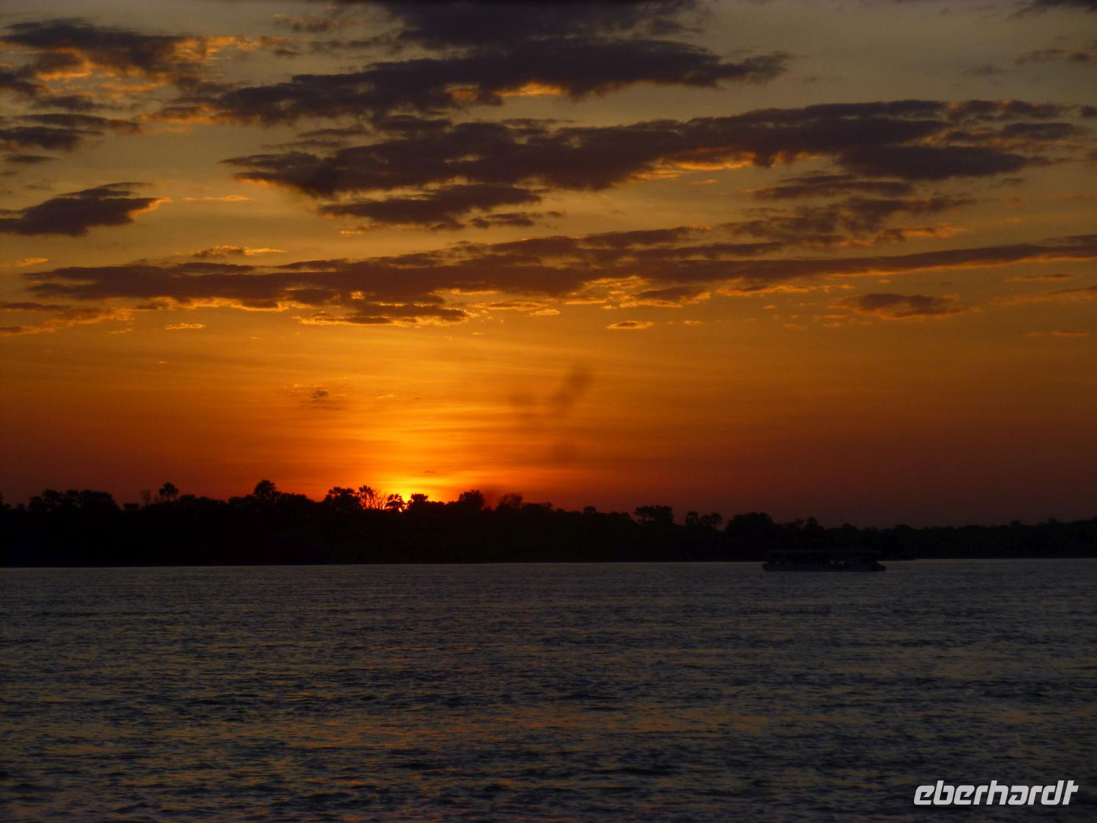 Vor uns lag der Höhepunkt unserer Reise - die Victoria Wasserfälle. Die Fahrt zur Grenze dauerte nicht lang. Nachdem alle Grenzformalitäten erledigt waren erreichten wir den Nationalpark Vic Falls. Der erste Blick über den Sambesi und alle waren erwartungsfroh. Die Wasserfälle sind die meistbesuchte Attraktion in Simbawe. Wir besorgten uns ein Regencape und liefen zum Livingsten-Denkmal. Der erste Blick über die Fälle lies uns erahnen das auf Grund des vielen Wassers es eine nasse Angelegenheit wird. Wir liefen entlang der Wasserfälle und wurden alle gehörig nass. An manchen Stellen konnte man nur erahnen mit welcher Wucht das Wasser die Fälle herunter stürzt. Es war wie im Regenwald, obwohl es nicht regnete. Wir wurden alle sehr nass. Anschließend besuchten wir einen kleinen Markt wo wir Holzschnitzereien kauften. Besonders angetan hatten uns die Big Five und die Elefanten. Eine schöne Erinnerung an Afrika. Wir erreichen unsere schöne Loge „ Asambesi", die direkt am Sambesi lag. Am Nachmittag fuhren wir mit dem Boot auf den Fluss heraus um noch einige Tiere zu beobachten. Verwöhnt vom Vortag sahen wir einige Krokodile und Hypos und ein besonders schöner Sonnenuntergang. Zum Abendessen wurden wir von einheimischen Musikern unterhalten.