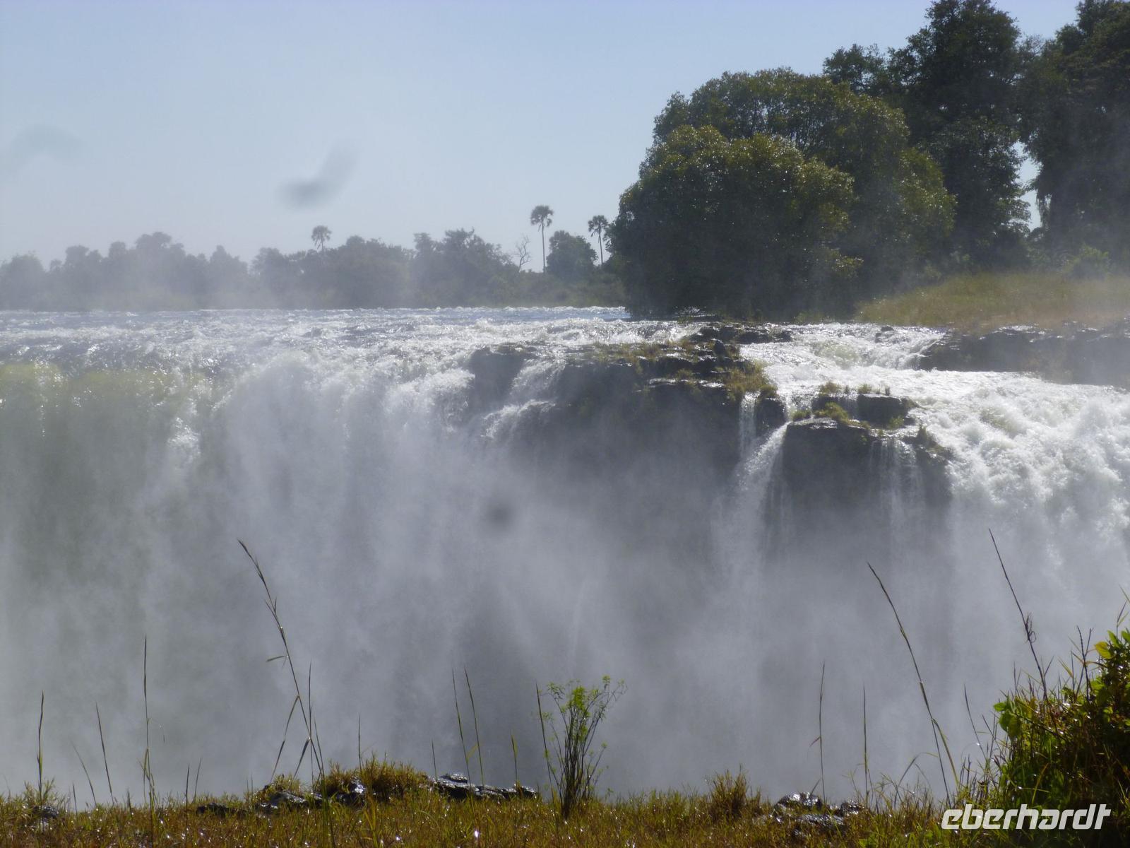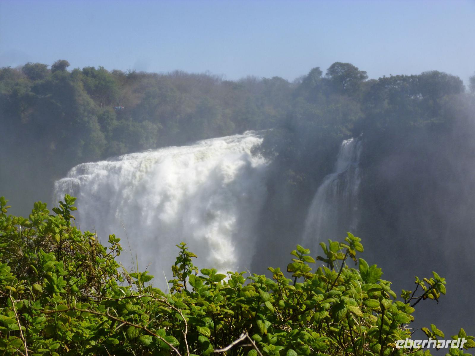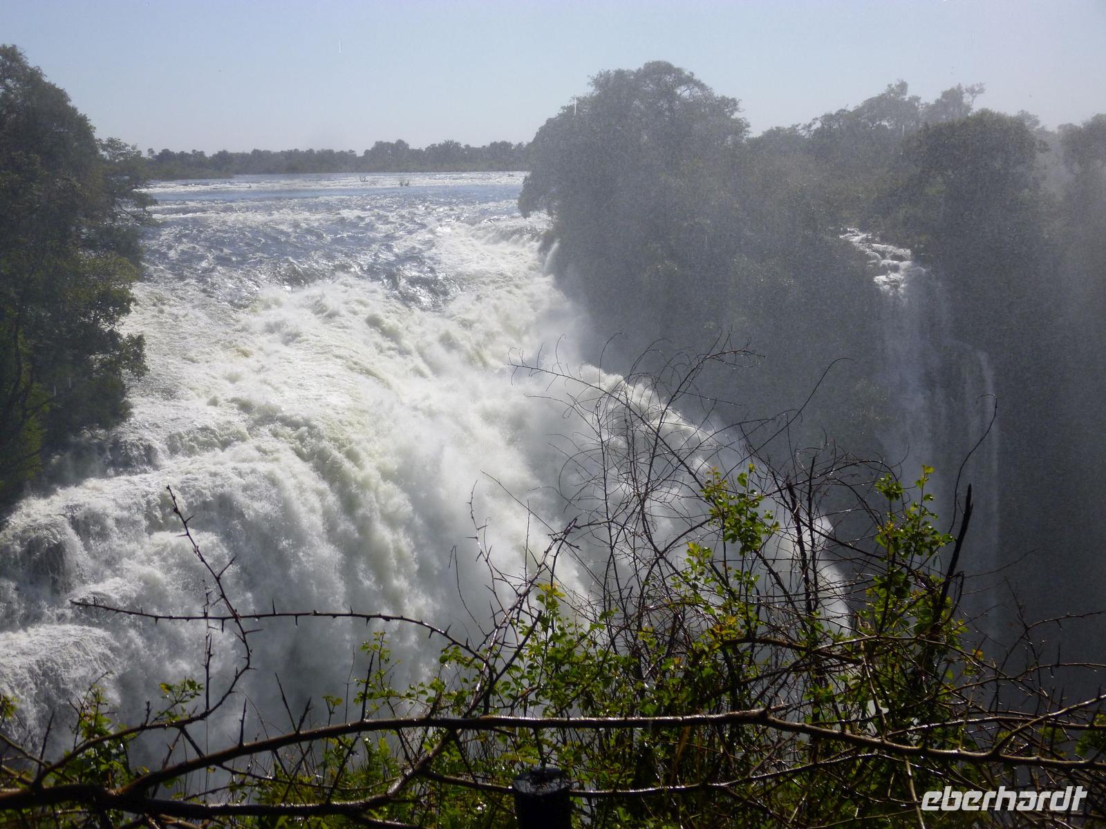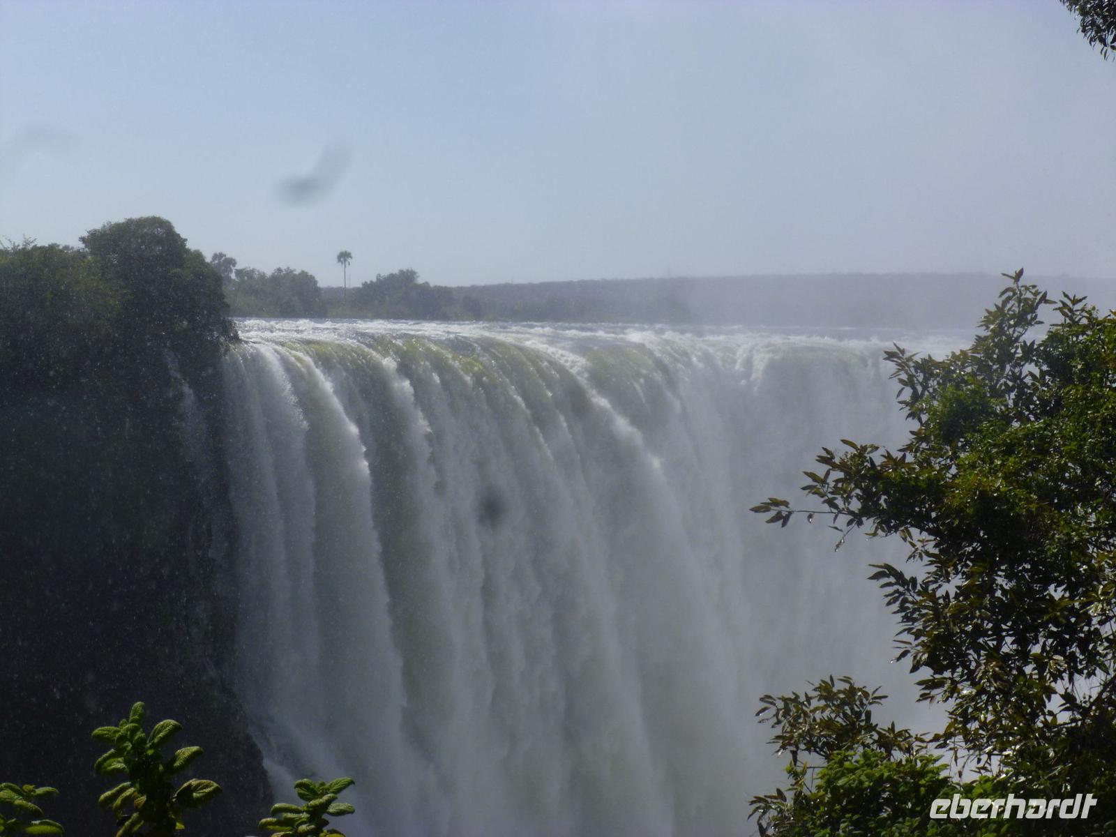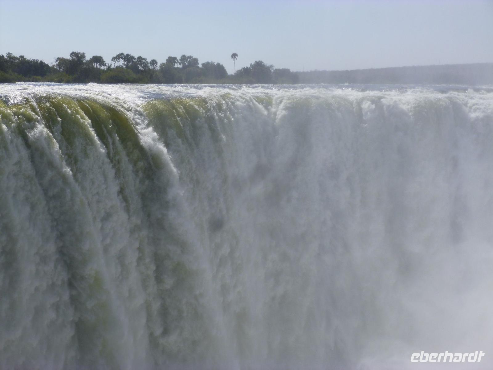 Vor uns lag der Höhepunkt unserer Reise - die Victoria Wasserfälle. Die Fahrt zur Grenze dauerte nicht lang. Nachdem alle Grenzformalitäten erledigt waren erreichten wir den Nationalpark Vic Falls. Der erste Blick über den Sambesi und alle waren erwartungsfroh. Die Wasserfälle sind die meistbesuchte Attraktion in Simbawe. Wir besorgten uns ein Regencape und liefen zum Livingsten-Denkmal. Der erste Blick über die Fälle lies uns erahnen das auf Grund des vielen Wassers es eine nasse Angelegenheit wird. Wir liefen entlang der Wasserfälle und wurden alle gehörig nass. An manchen Stellen konnte man nur erahnen mit welcher Wucht das Wasser die Fälle herunter stürzt. Es war wie im Regenwald, obwohl es nicht regnete. Wir wurden alle sehr nass. Anschließend besuchten wir einen kleinen Markt wo wir Holzschnitzereien kauften. Besonders angetan hatten uns die Big Five und die Elefanten. Eine schöne Erinnerung an Afrika. Wir erreichen unsere schöne Loge „ Asambesi", die direkt am Sambesi lag. Am Nachmittag fuhren wir mit dem Boot auf den Fluss heraus um noch einige Tiere zu beobachten. Verwöhnt vom Vortag sahen wir einige Krokodile und Hypos und ein besonders schöner Sonnenuntergang. Zum Abendessen wurden wir von einheimischen Musikern unterhalten.