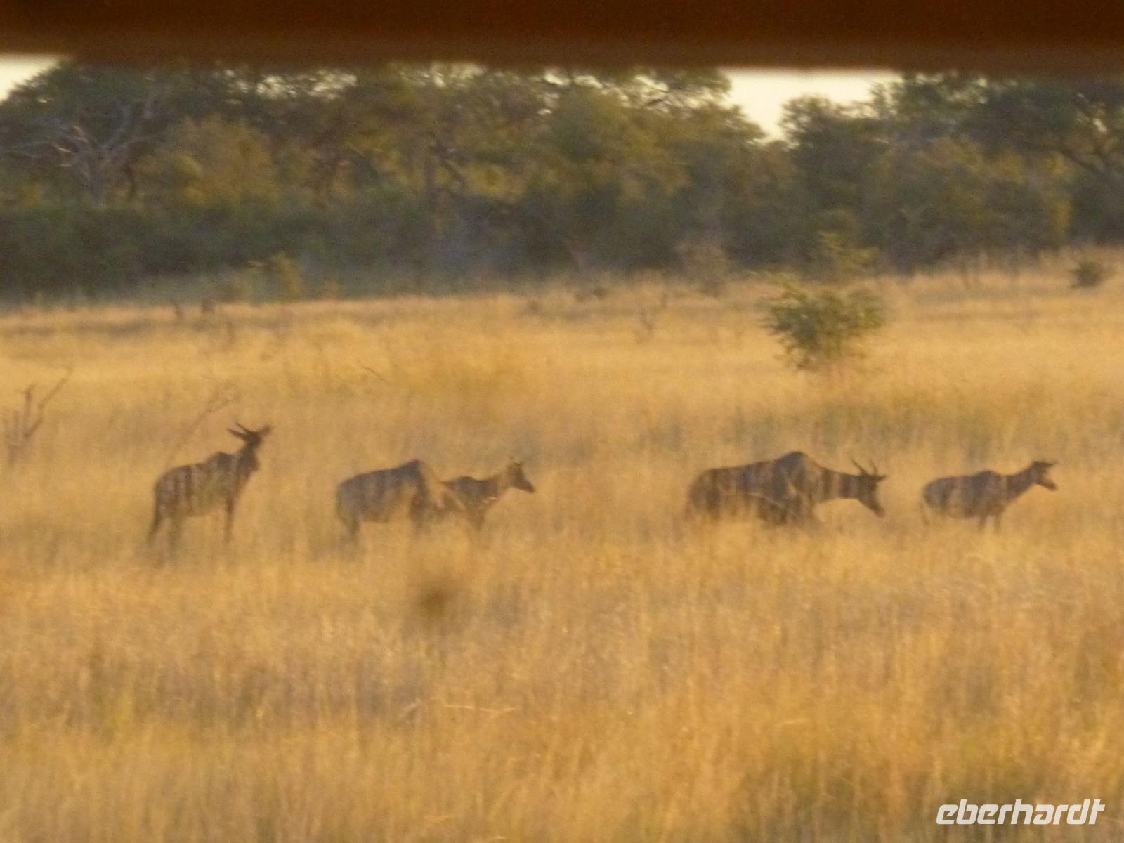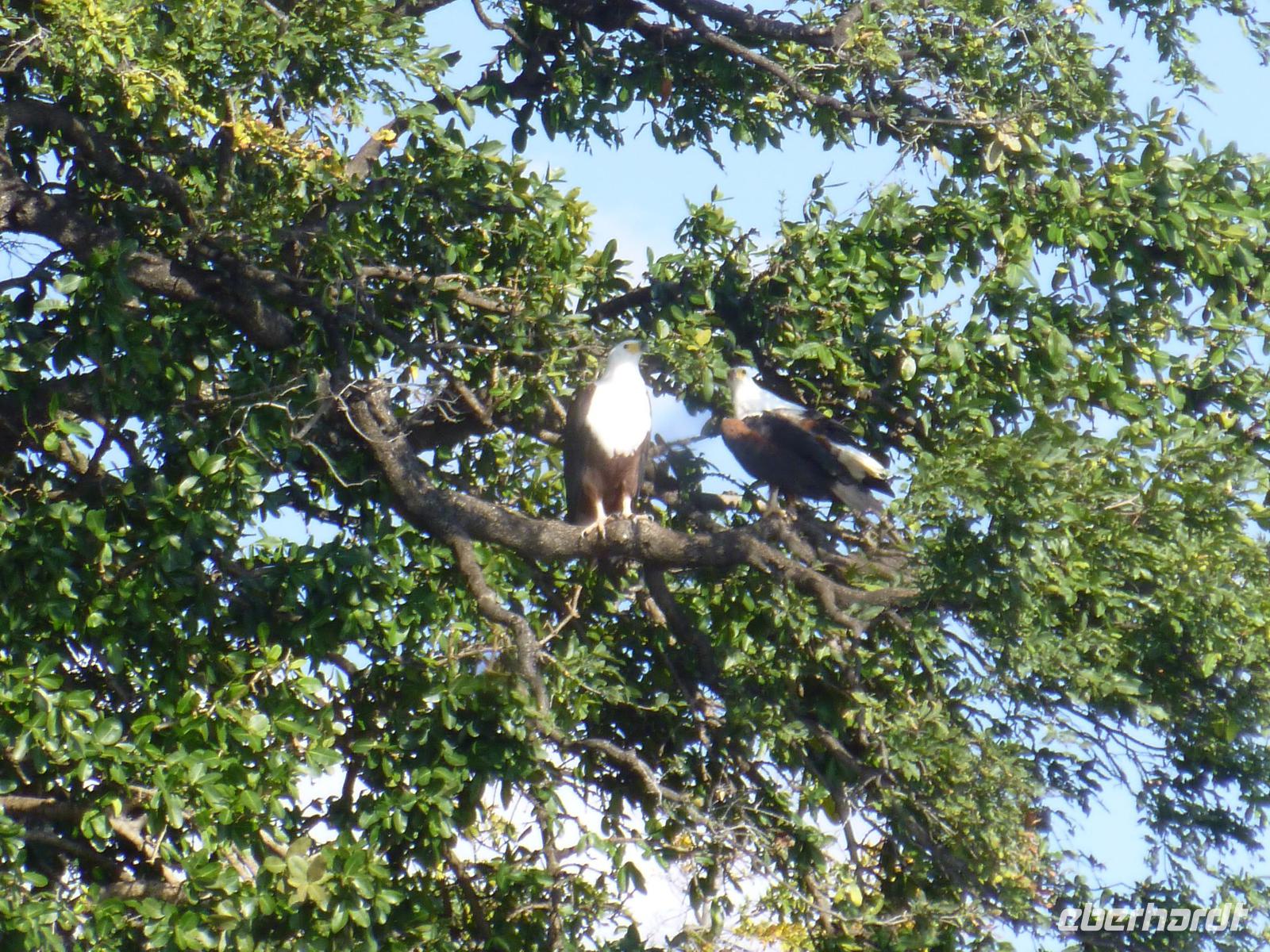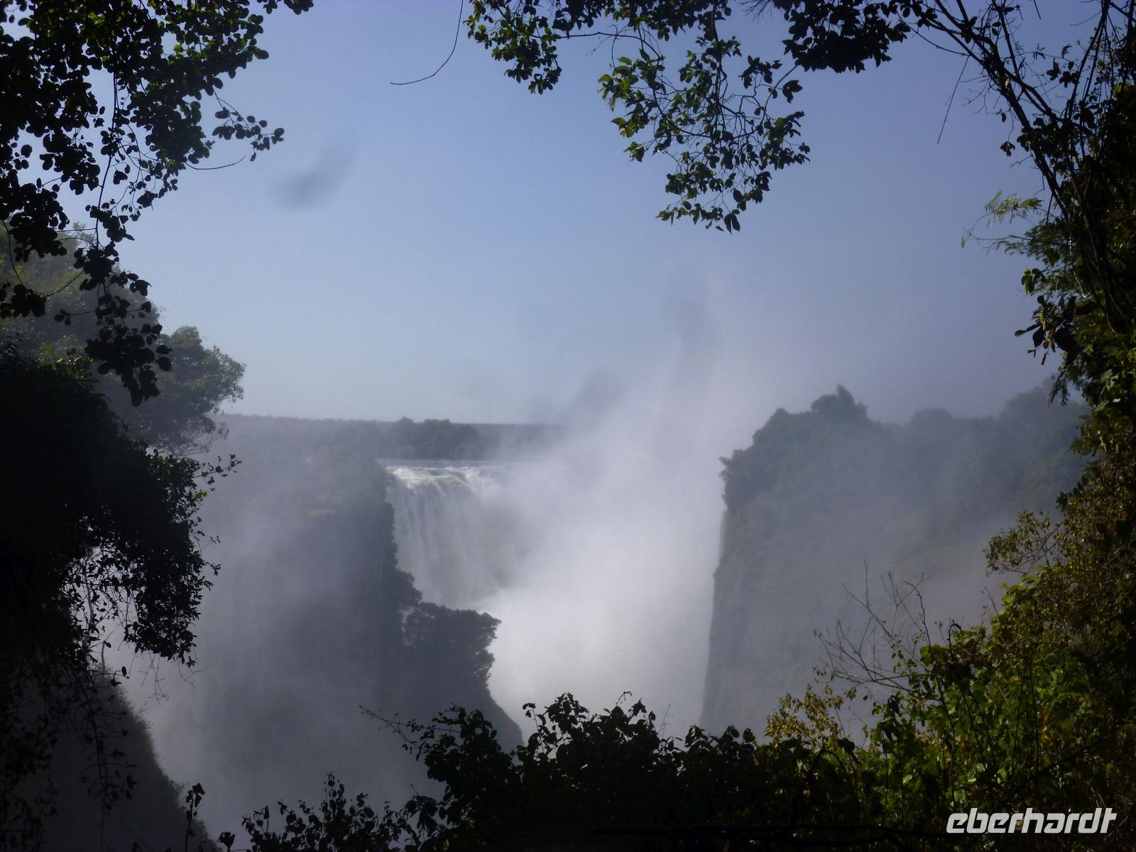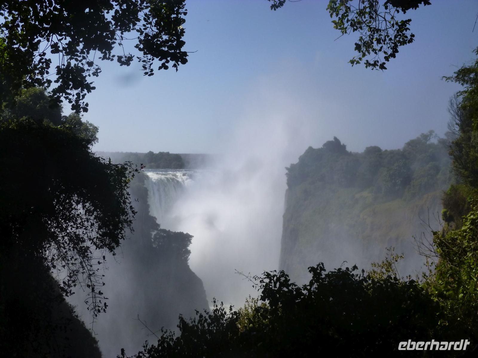 Vor uns lag der Höhepunkt unserer Reise - die Victoria Wasserfälle. Die Fahrt zur Grenze dauerte nicht lang. Nachdem alle Grenzformalitäten erledigt waren erreichten wir den Nationalpark Vic Falls. Der erste Blick über den Sambesi und alle waren erwartungsfroh. Die Wasserfälle sind die meistbesuchte Attraktion in Simbawe. Wir besorgten uns ein Regencape und liefen zum Livingsten-Denkmal. Der erste Blick über die Fälle lies uns erahnen das auf Grund des vielen Wassers es eine nasse Angelegenheit wird. Wir liefen entlang der Wasserfälle und wurden alle gehörig nass. An manchen Stellen konnte man nur erahnen mit welcher Wucht das Wasser die Fälle herunter stürzt. Es war wie im Regenwald, obwohl es nicht regnete. Wir wurden alle sehr nass. Anschließend besuchten wir einen kleinen Markt wo wir Holzschnitzereien kauften. Besonders angetan hatten uns die Big Five und die Elefanten. Eine schöne Erinnerung an Afrika. Wir erreichen unsere schöne Loge „ Asambesi", die direkt am Sambesi lag. Am Nachmittag fuhren wir mit dem Boot auf den Fluss heraus um noch einige Tiere zu beobachten. Verwöhnt vom Vortag sahen wir einige Krokodile und Hypos und ein besonders schöner Sonnenuntergang. Zum Abendessen wurden wir von einheimischen Musikern unterhalten.