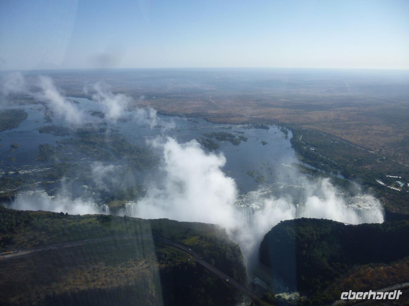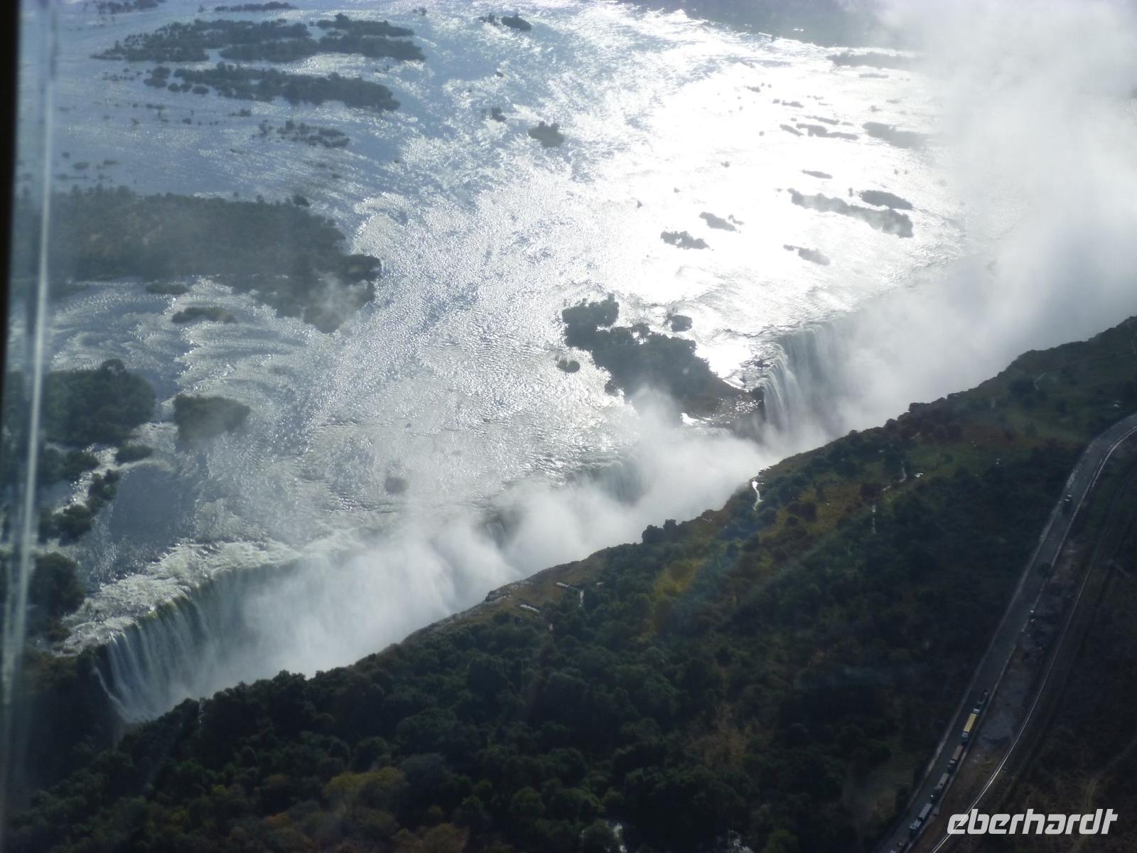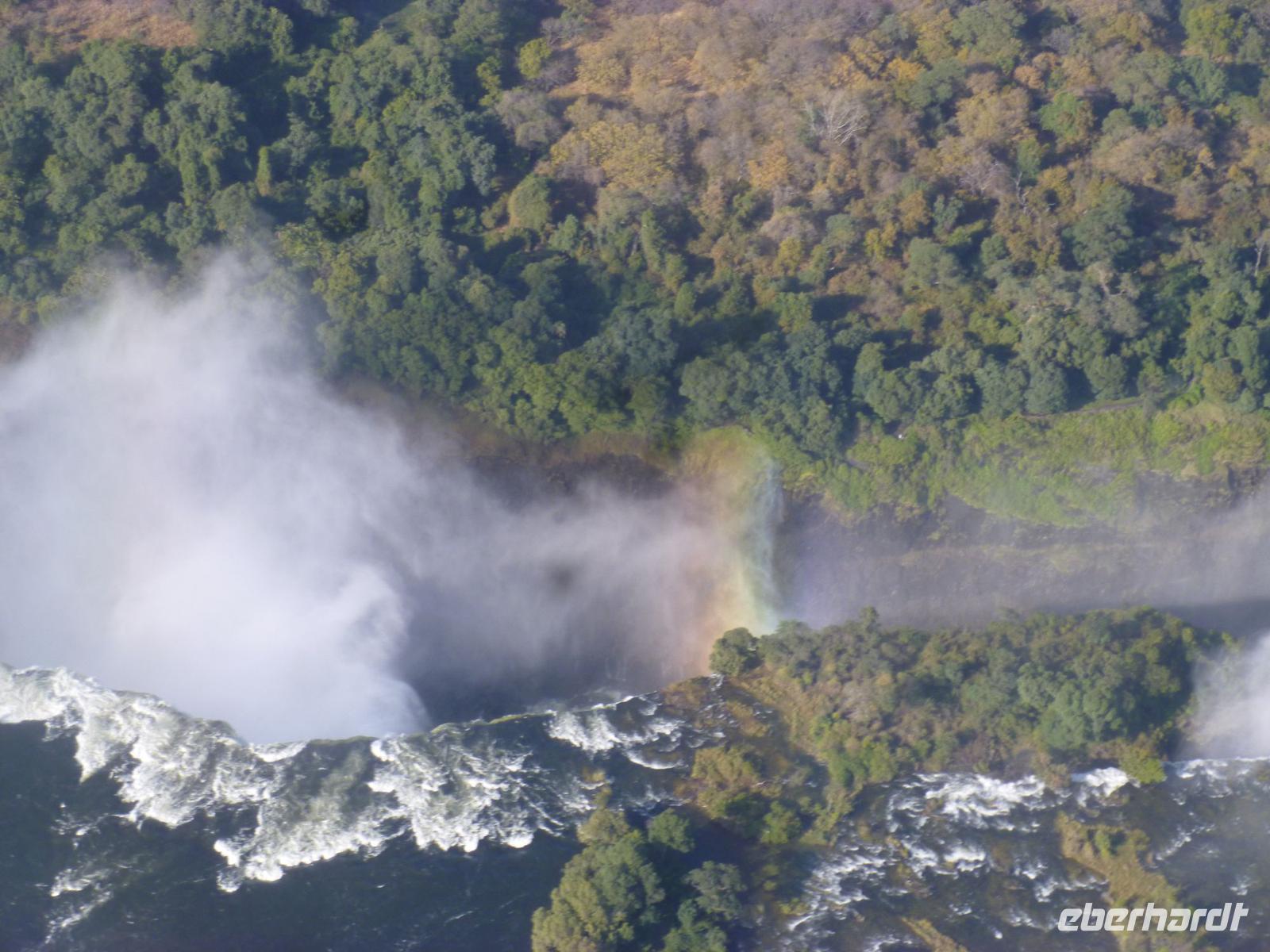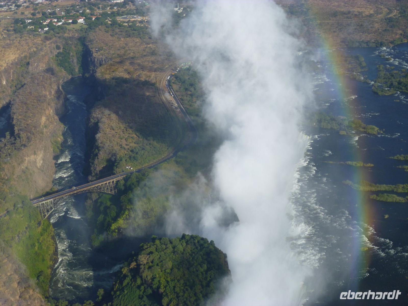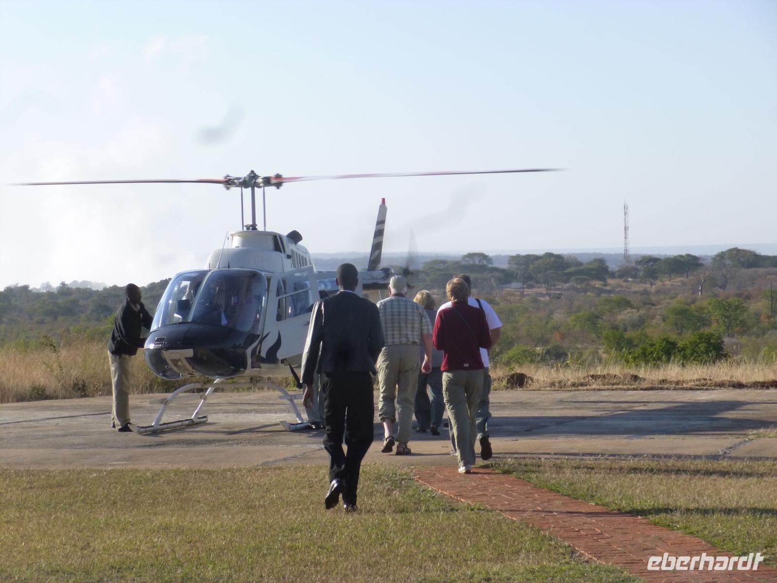 Uns erwartete noch ein schöner Abschluss unserer Reise. Das zeitiges aufstehen lohnte sich. Wir hatten einen Rundflug über die Victoria Fälle gebucht. Mit einem Auto der Fluggesellschaft wurden wir abgeholt. Es war wieder typisch Afrika die Maschine wurde erst noch vorbereitet. Dann ging es endlich los die ersten bestiegen den Helikopter. Uns erwartete ein Flug von 12 Minuten über die Fälle und den Nationalpark. Es war ein phantastisches Erlebnis die Fälle von oben zu betrachten. Schon von weiten sahen wir die Gischt aufsteigen. Das was wir am Vortag nur erahnen konnten war von oben sehr gut zu sehen. Die Wassermassen stürzten herab und verschwanden in einem Canyon. Ein Regenbogen hatte sich über die Victoria Fälle. Nun hieß es wirklich Abschied zu nehmen von Afrika. Nach einer kurzen Fahrt zum Flughafen verabschiedeten wir uns von unserem Busfahrer Jonas und unseren Reiseleiter Tom.