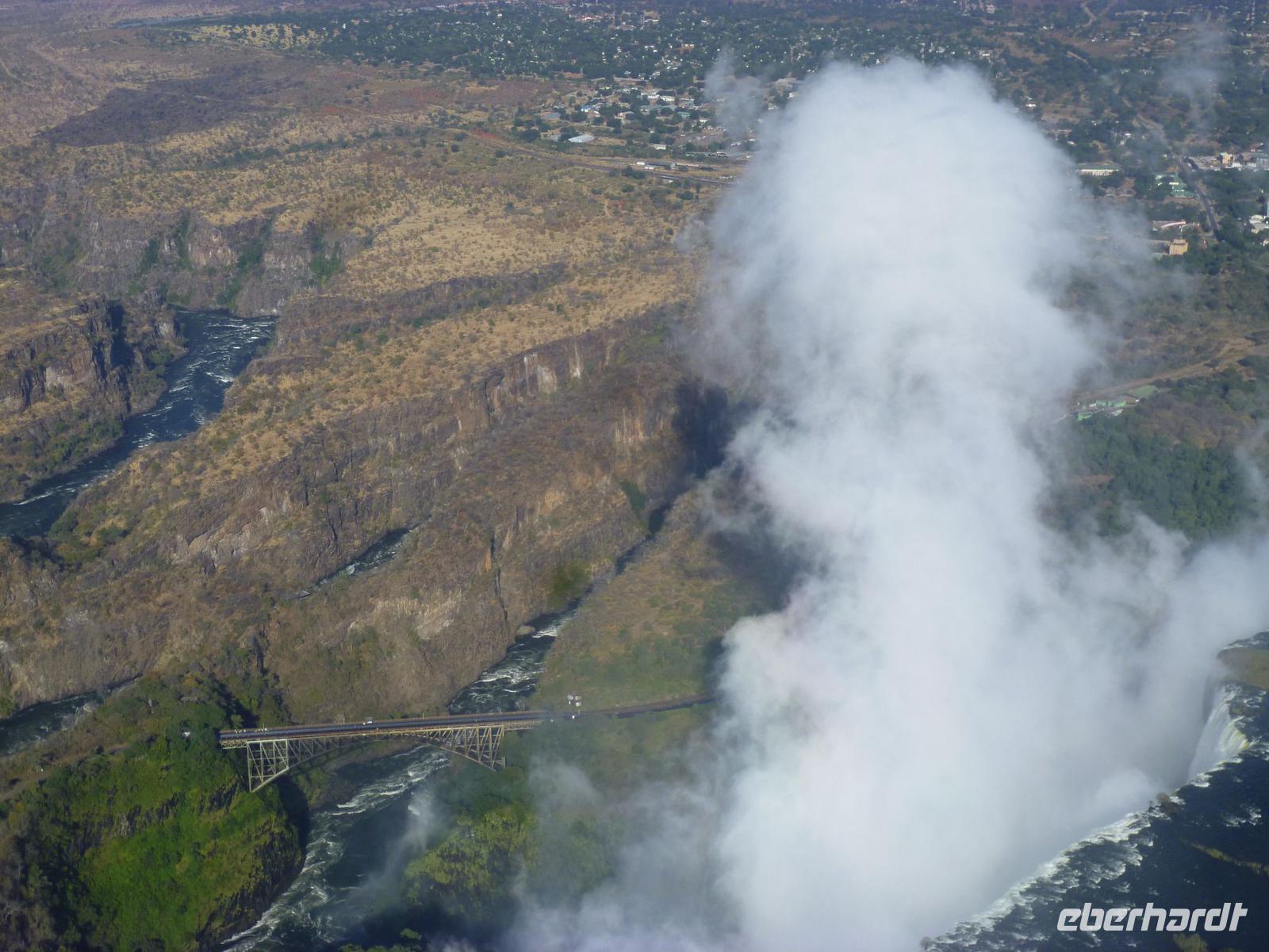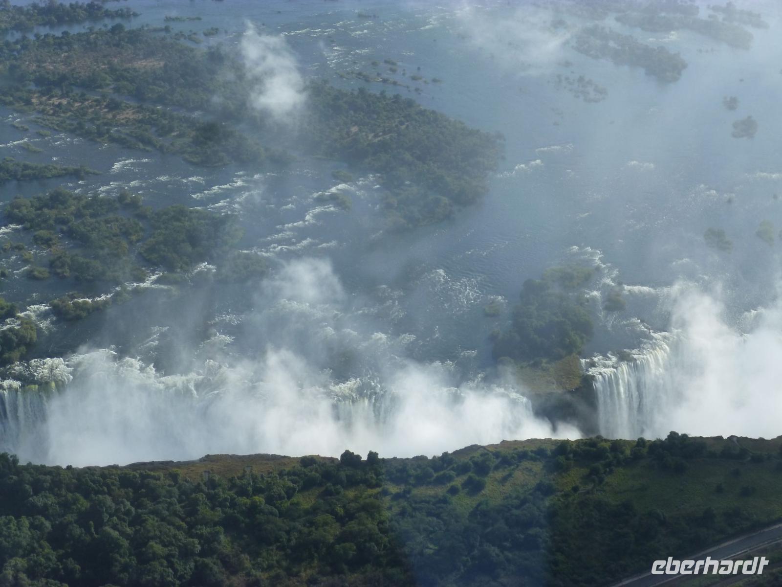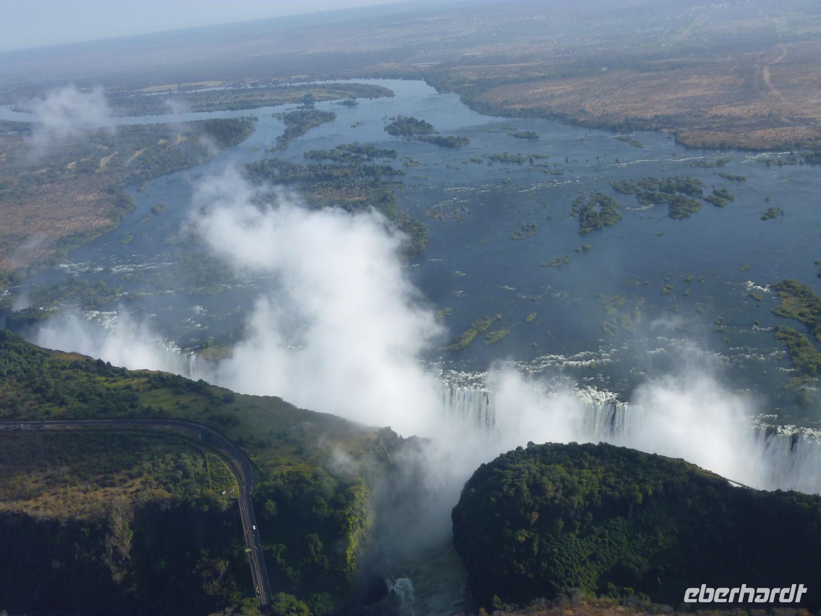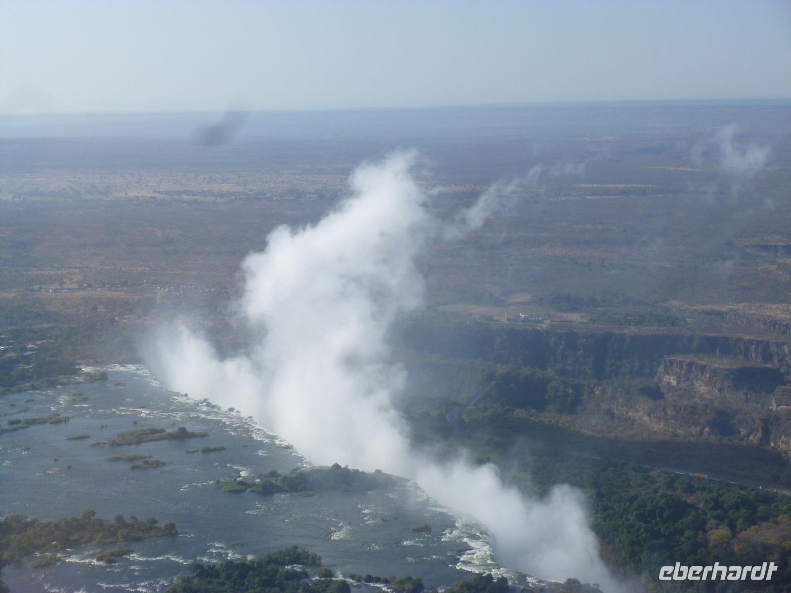 Uns erwartete noch ein schöner Abschluss unserer Reise. Das zeitiges aufstehen lohnte sich. Wir hatten einen Rundflug über die Victoria Fälle gebucht. Mit einem Auto der Fluggesellschaft wurden wir abgeholt. Es war wieder typisch Afrika die Maschine wurde erst noch vorbereitet. Dann ging es endlich los die ersten bestiegen den Helikopter. Uns erwartete ein Flug von 12 Minuten über die Fälle und den Nationalpark. Es war ein phantastisches Erlebnis die Fälle von oben zu betrachten. Schon von weiten sahen wir die Gischt aufsteigen. Das was wir am Vortag nur erahnen konnten war von oben sehr gut zu sehen. Die Wassermassen stürzten herab und verschwanden in einem Canyon. Ein Regenbogen hatte sich über die Victoria Fälle. Nun hieß es wirklich Abschied zu nehmen von Afrika. Nach einer kurzen Fahrt zum Flughafen verabschiedeten wir uns von unserem Busfahrer Jonas und unseren Reiseleiter Tom.