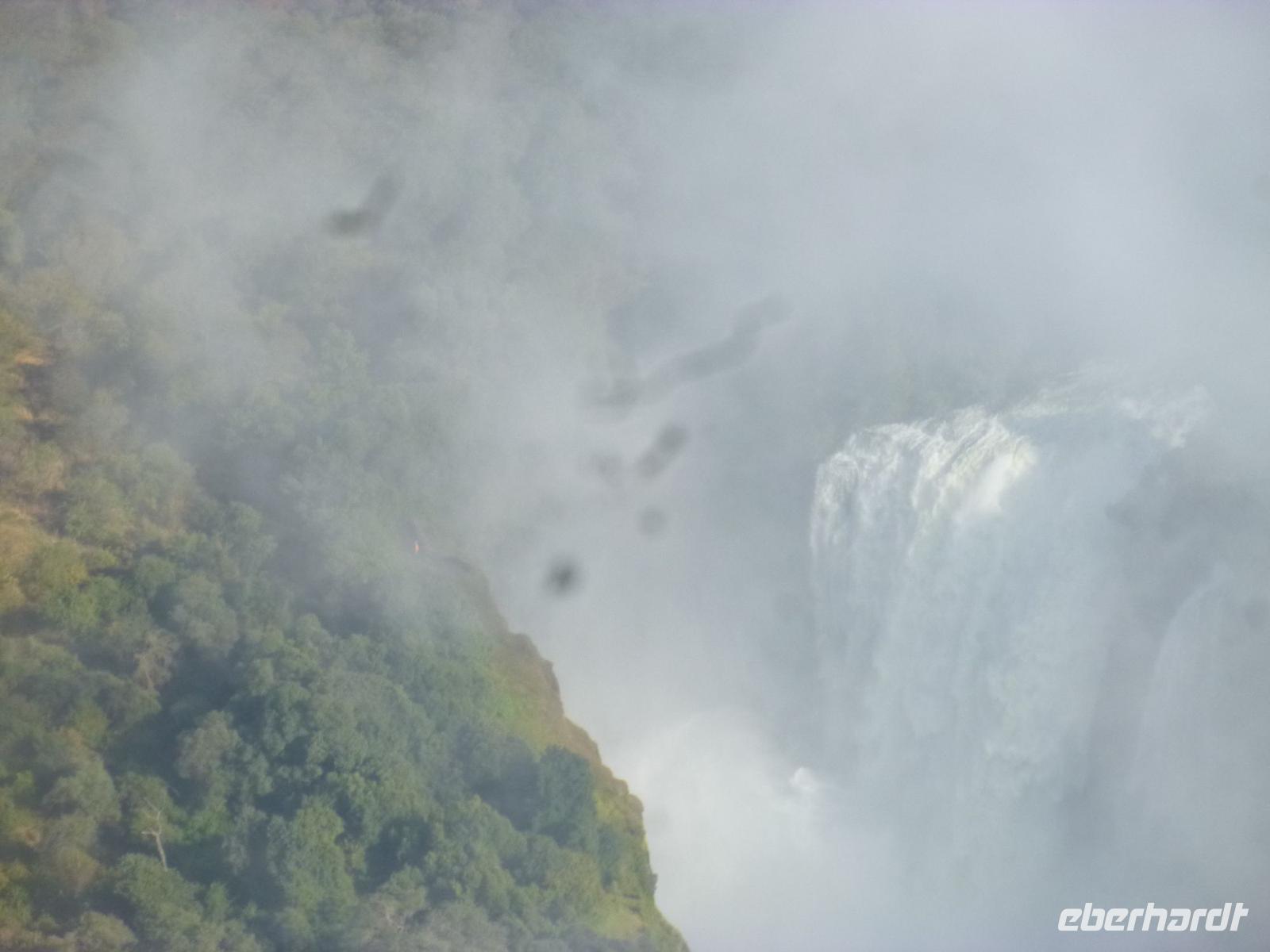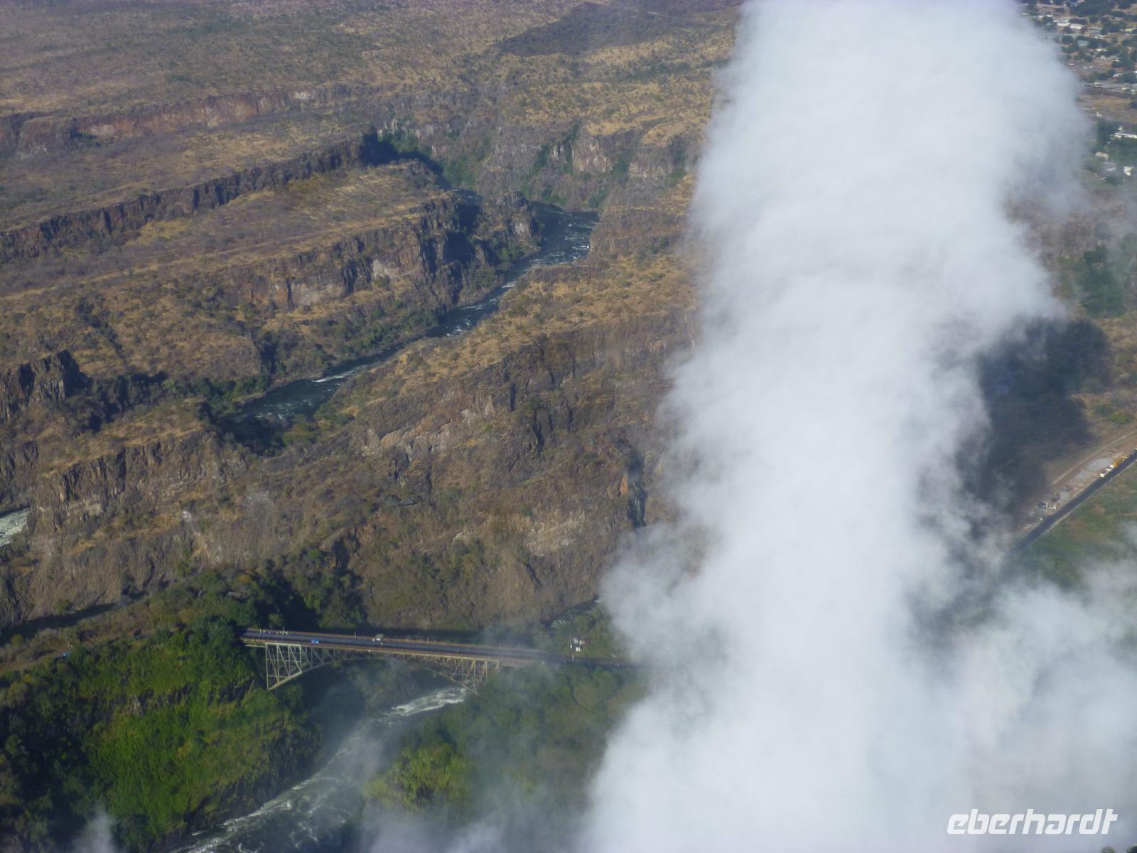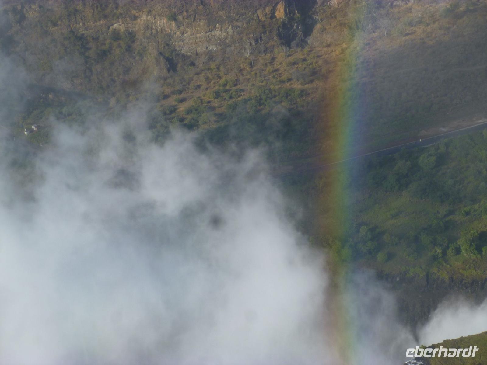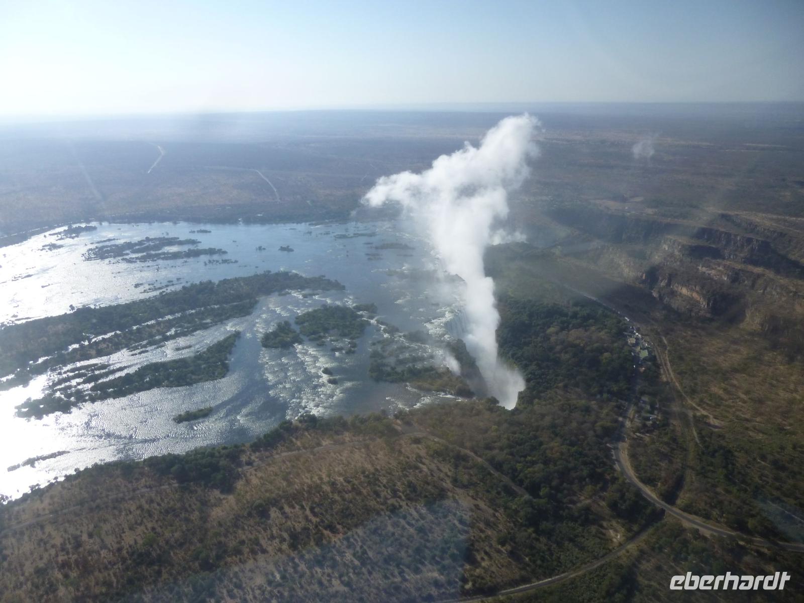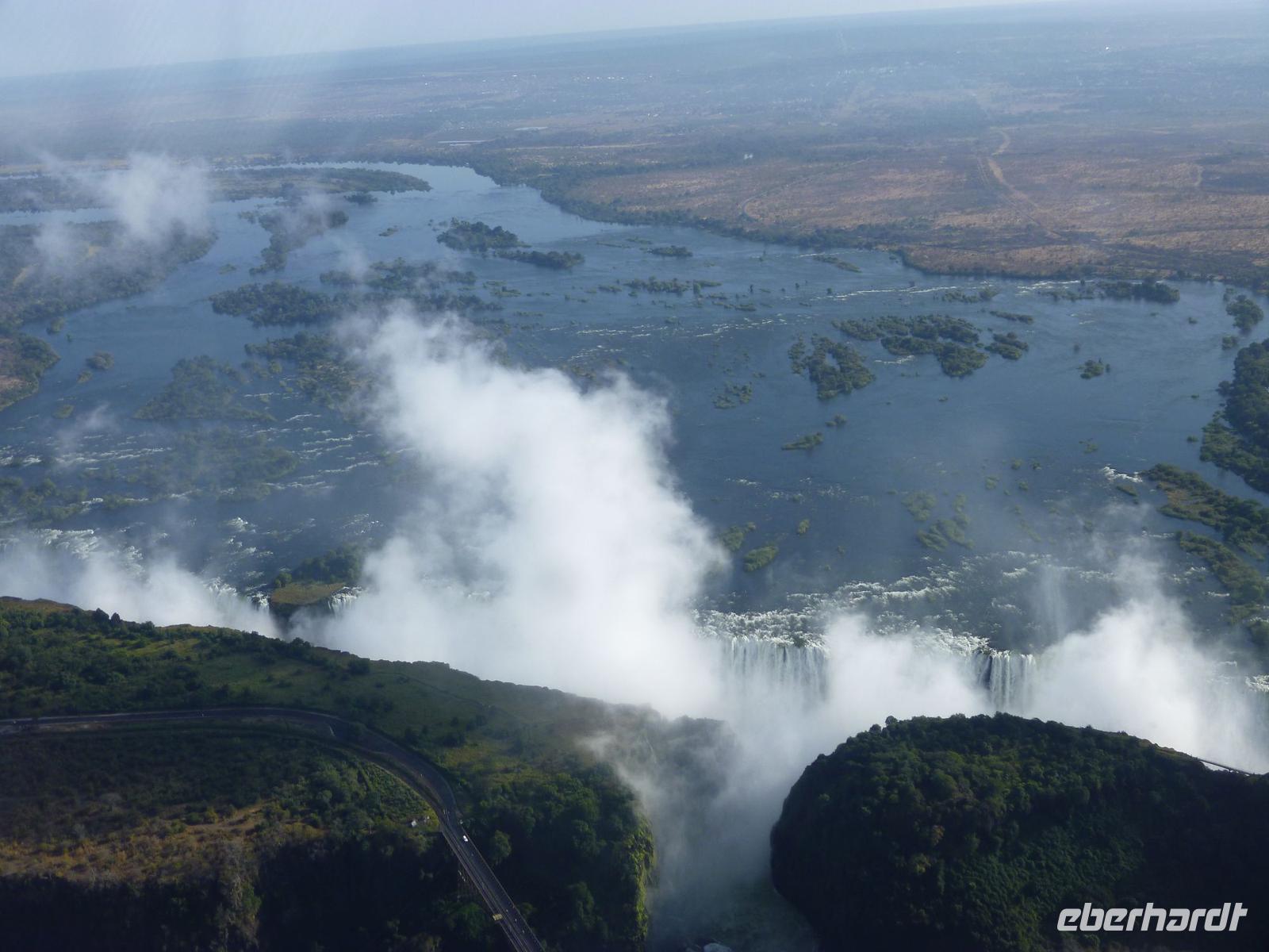 Uns erwartete noch ein schöner Abschluss unserer Reise. Das zeitiges aufstehen lohnte sich. Wir hatten einen Rundflug über die Victoria Fälle gebucht. Mit einem Auto der Fluggesellschaft wurden wir abgeholt. Es war wieder typisch Afrika die Maschine wurde erst noch vorbereitet. Dann ging es endlich los die ersten bestiegen den Helikopter. Uns erwartete ein Flug von 12 Minuten über die Fälle und den Nationalpark. Es war ein phantastisches Erlebnis die Fälle von oben zu betrachten. Schon von weiten sahen wir die Gischt aufsteigen. Das was wir am Vortag nur erahnen konnten war von oben sehr gut zu sehen. Die Wassermassen stürzten herab und verschwanden in einem Canyon. Ein Regenbogen hatte sich über die Victoria Fälle. Nun hieß es wirklich Abschied zu nehmen von Afrika. Nach einer kurzen Fahrt zum Flughafen verabschiedeten wir uns von unserem Busfahrer Jonas und unseren Reiseleiter Tom.