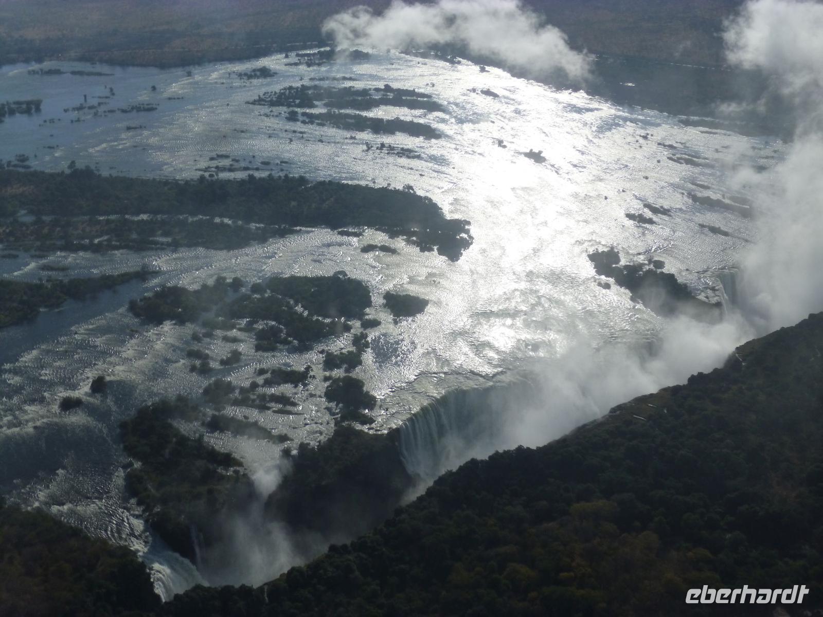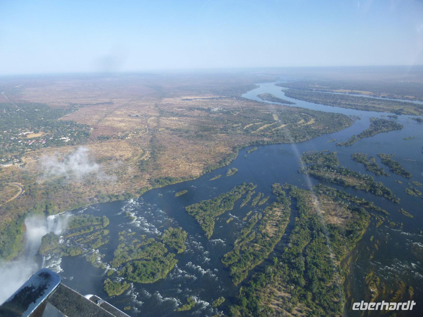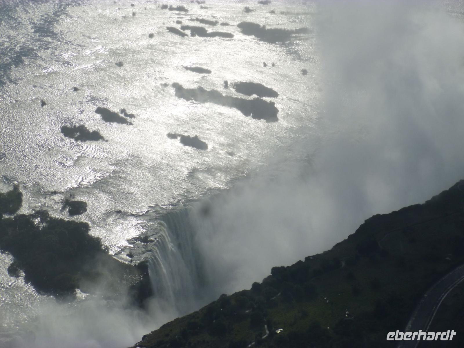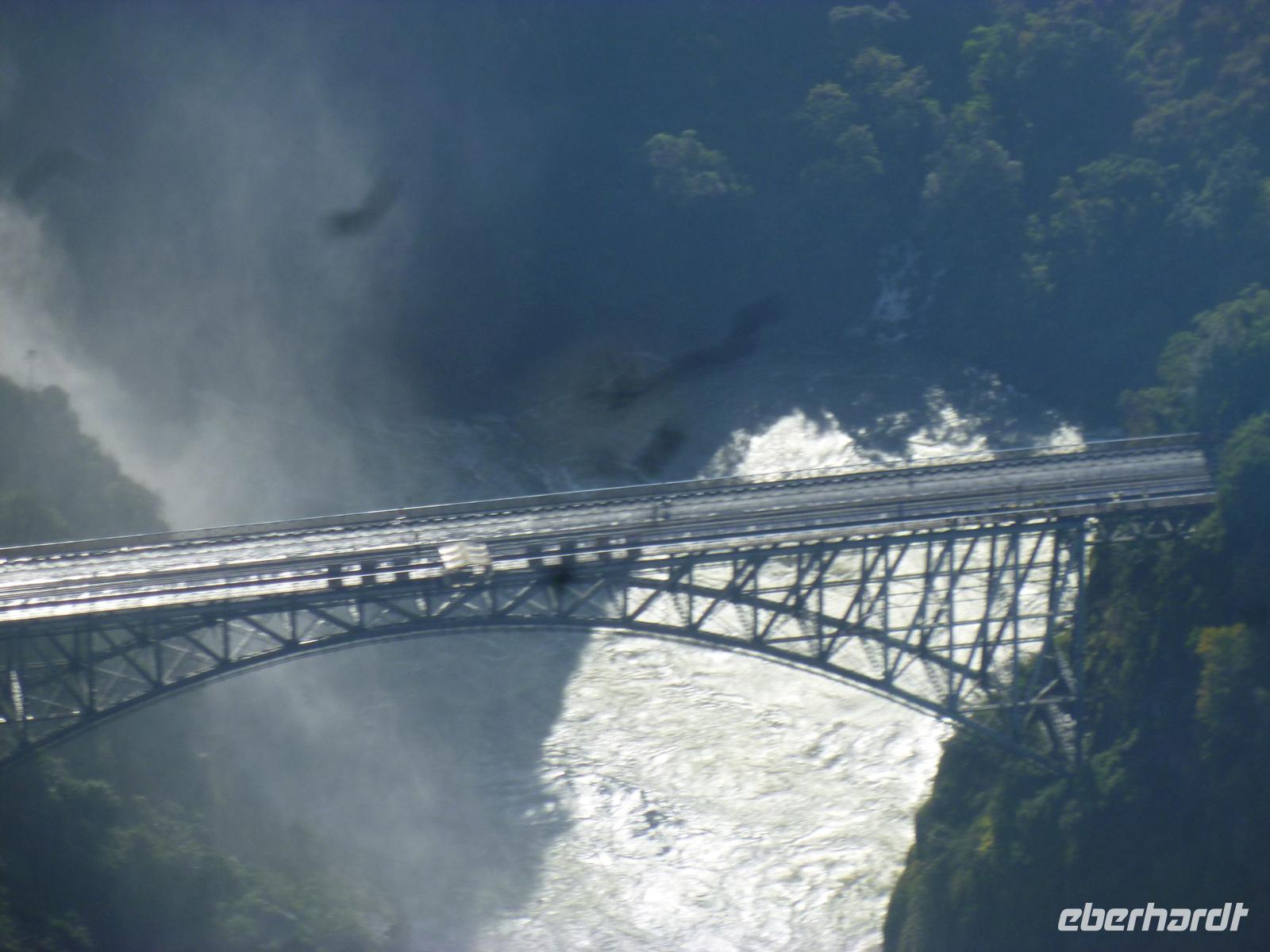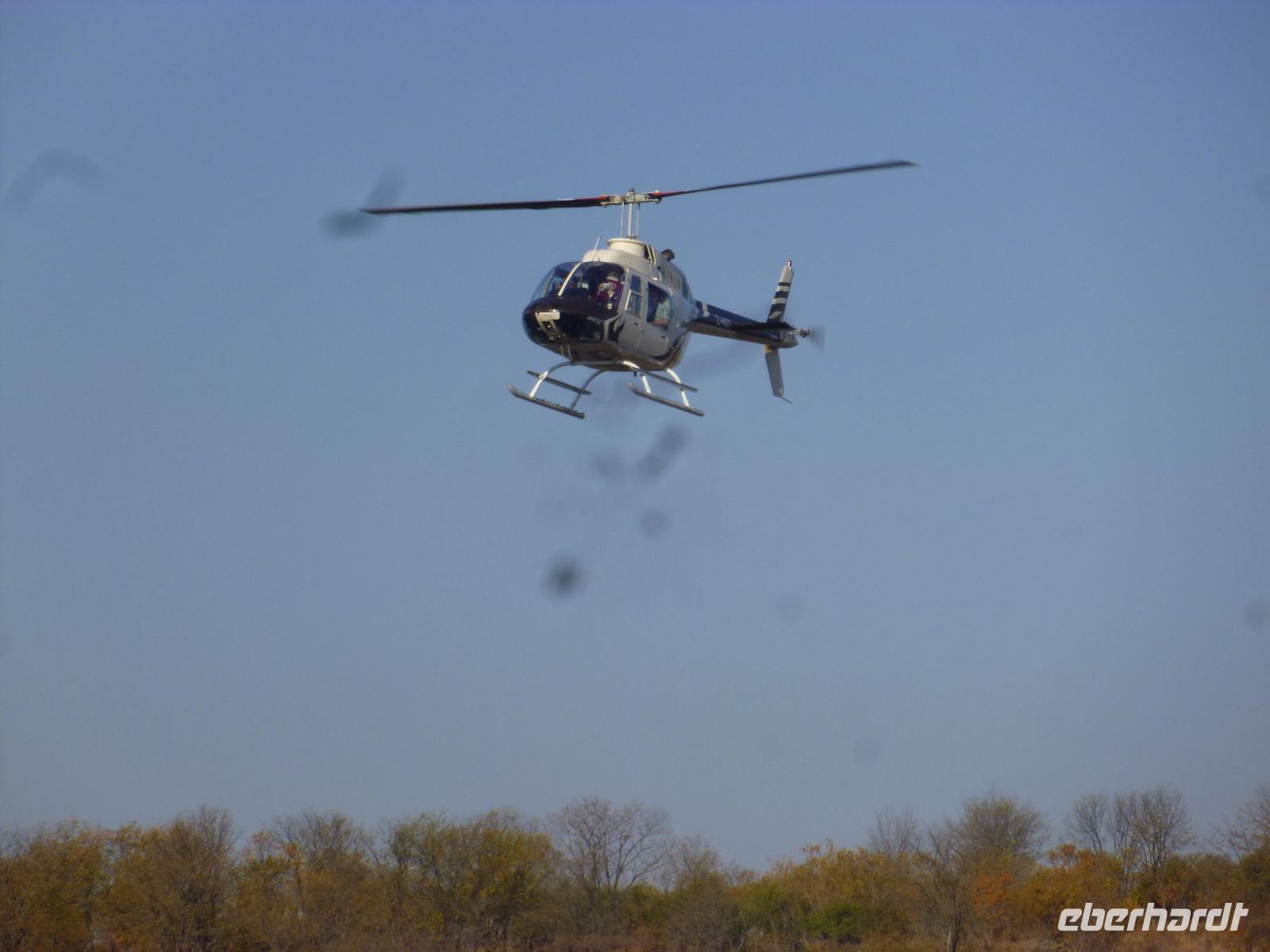 Uns erwartete noch ein schöner Abschluss unserer Reise. Das zeitiges aufstehen lohnte sich. Wir hatten einen Rundflug über die Victoria Fälle gebucht. Mit einem Auto der Fluggesellschaft wurden wir abgeholt. Es war wieder typisch Afrika die Maschine wurde erst noch vorbereitet. Dann ging es endlich los die ersten bestiegen den Helikopter. Uns erwartete ein Flug von 12 Minuten über die Fälle und den Nationalpark. Es war ein phantastisches Erlebnis die Fälle von oben zu betrachten. Schon von weiten sahen wir die Gischt aufsteigen. Das was wir am Vortag nur erahnen konnten war von oben sehr gut zu sehen. Die Wassermassen stürzten herab und verschwanden in einem Canyon. Ein Regenbogen hatte sich über die Victoria Fälle. Nun hieß es wirklich Abschied zu nehmen von Afrika. Nach einer kurzen Fahrt zum Flughafen verabschiedeten wir uns von unserem Busfahrer Jonas und unseren Reiseleiter Tom.