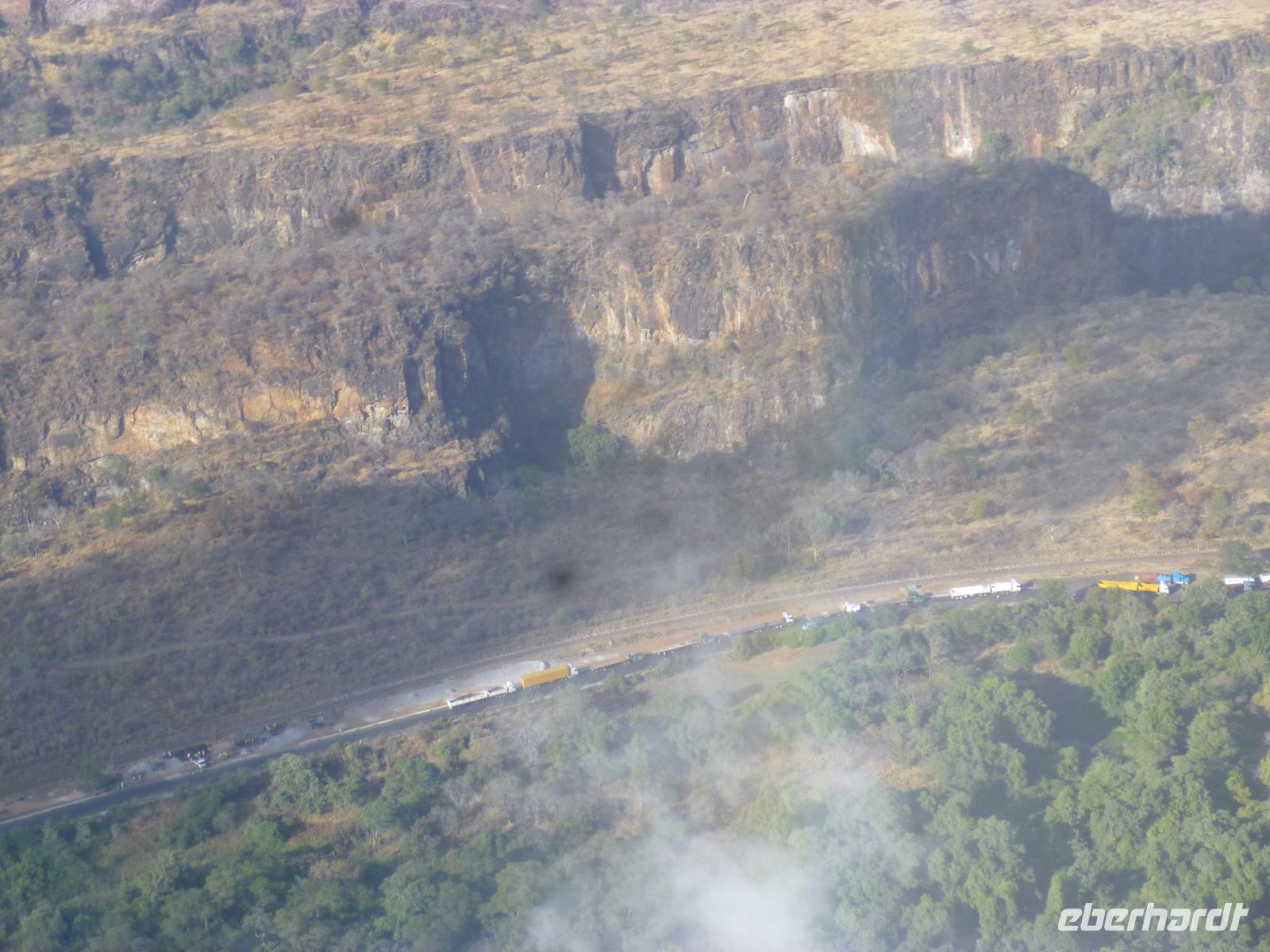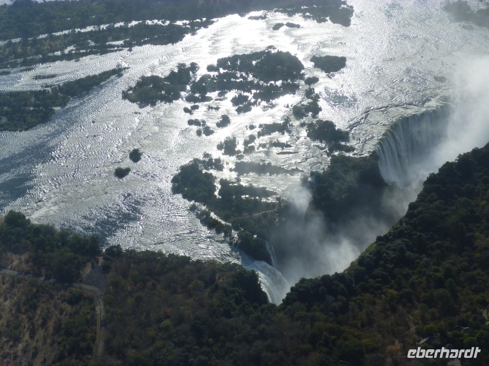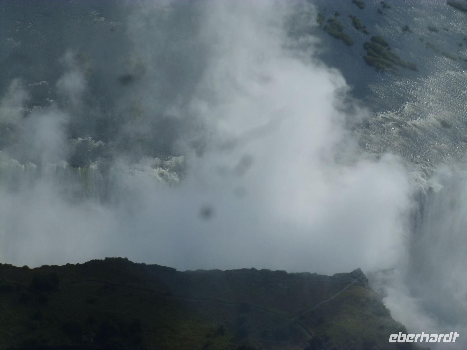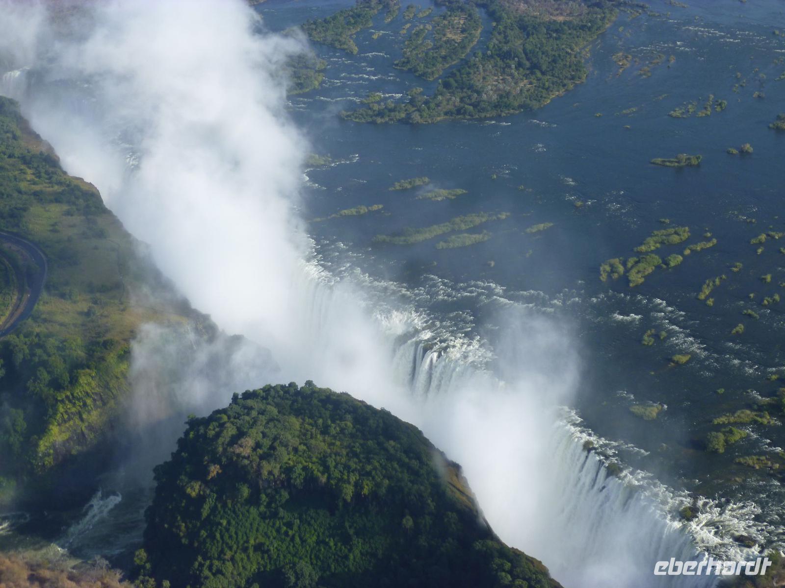 Uns erwartete noch ein schöner Abschluss unserer Reise. Das zeitiges aufstehen lohnte sich. Wir hatten einen Rundflug über die Victoria Fälle gebucht. Mit einem Auto der Fluggesellschaft wurden wir abgeholt. Es war wieder typisch Afrika die Maschine wurde erst noch vorbereitet. Dann ging es endlich los die ersten bestiegen den Helikopter. Uns erwartete ein Flug von 12 Minuten über die Fälle und den Nationalpark. Es war ein phantastisches Erlebnis die Fälle von oben zu betrachten. Schon von weiten sahen wir die Gischt aufsteigen. Das was wir am Vortag nur erahnen konnten war von oben sehr gut zu sehen. Die Wassermassen stürzten herab und verschwanden in einem Canyon. Ein Regenbogen hatte sich über die Victoria Fälle. Nun hieß es wirklich Abschied zu nehmen von Afrika. Nach einer kurzen Fahrt zum Flughafen verabschiedeten wir uns von unserem Busfahrer Jonas und unseren Reiseleiter Tom.