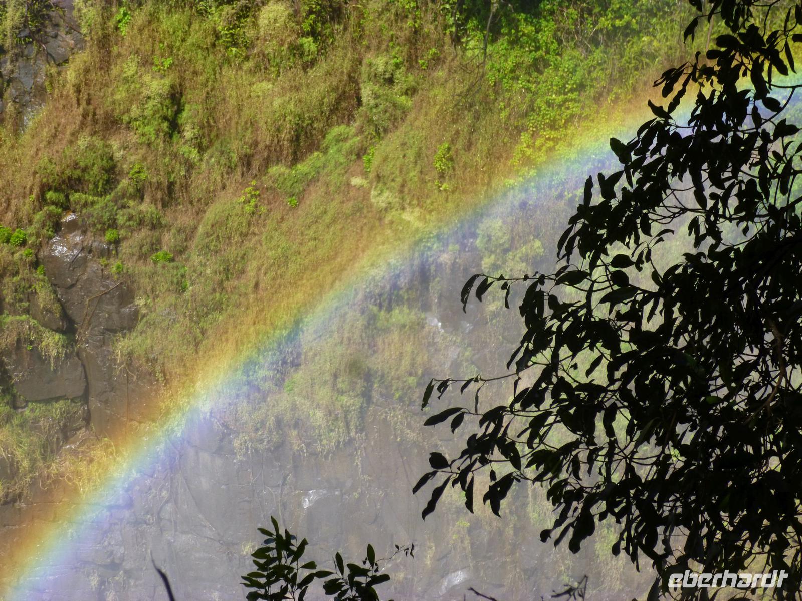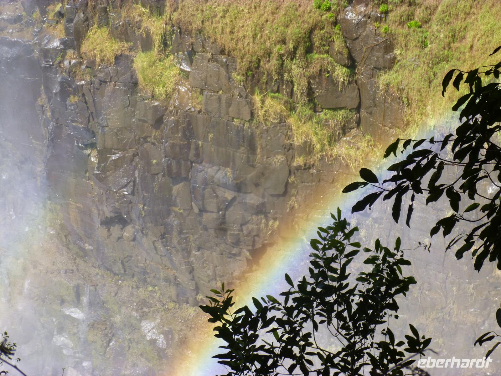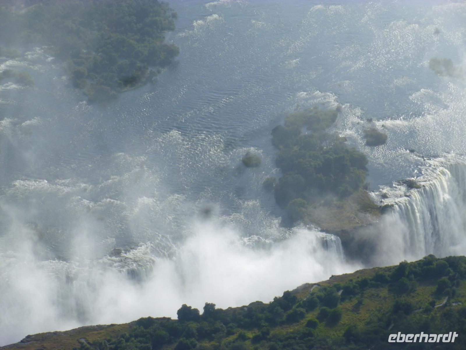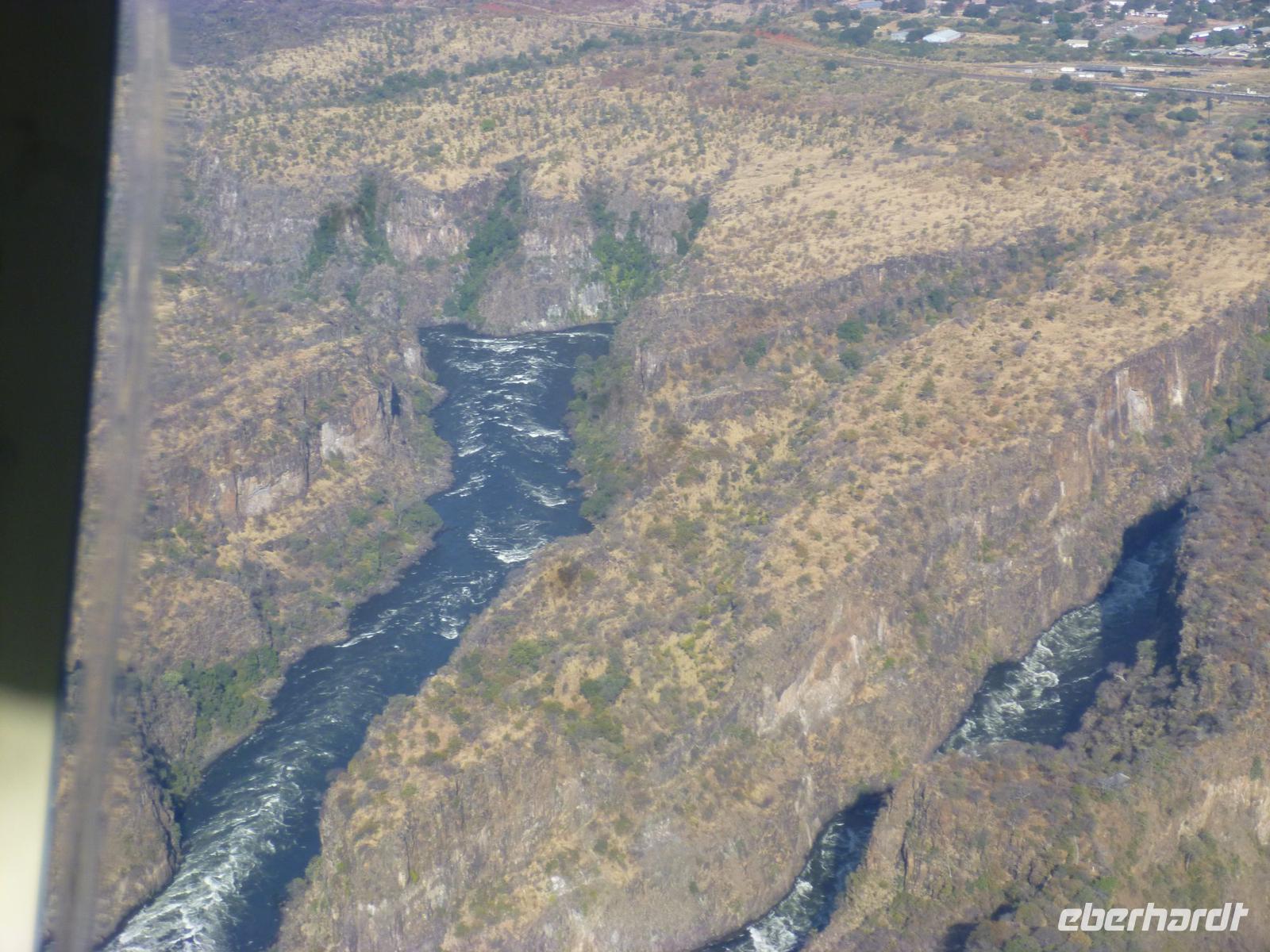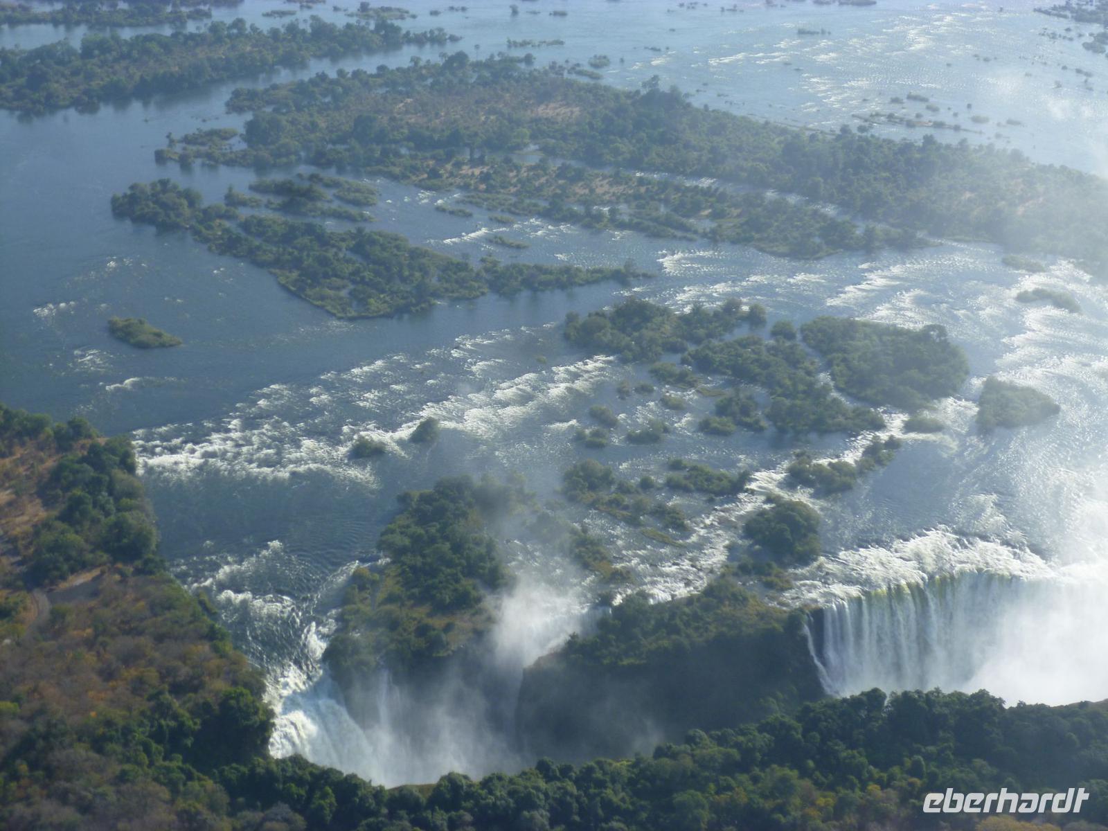 Uns erwartete noch ein schöner Abschluss unserer Reise. Das zeitiges aufstehen lohnte sich. Wir hatten einen Rundflug über die Victoria Fälle gebucht. Mit einem Auto der Fluggesellschaft wurden wir abgeholt. Es war wieder typisch Afrika die Maschine wurde erst noch vorbereitet. Dann ging es endlich los die ersten bestiegen den Helikopter. Uns erwartete ein Flug von 12 Minuten über die Fälle und den Nationalpark. Es war ein phantastisches Erlebnis die Fälle von oben zu betrachten. Schon von weiten sahen wir die Gischt aufsteigen. Das was wir am Vortag nur erahnen konnten war von oben sehr gut zu sehen. Die Wassermassen stürzten herab und verschwanden in einem Canyon. Ein Regenbogen hatte sich über die Victoria Fälle. Nun hieß es wirklich Abschied zu nehmen von Afrika. Nach einer kurzen Fahrt zum Flughafen verabschiedeten wir uns von unserem Busfahrer Jonas und unseren Reiseleiter Tom.