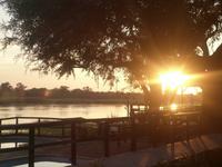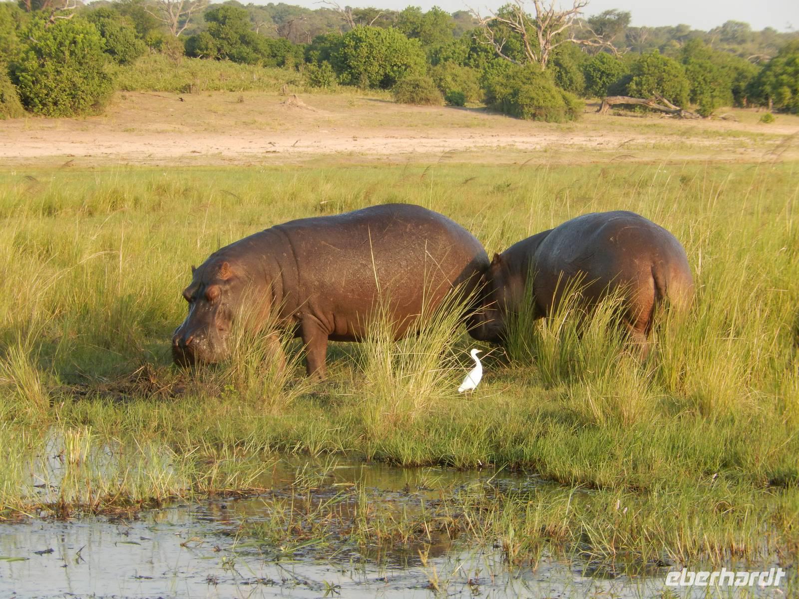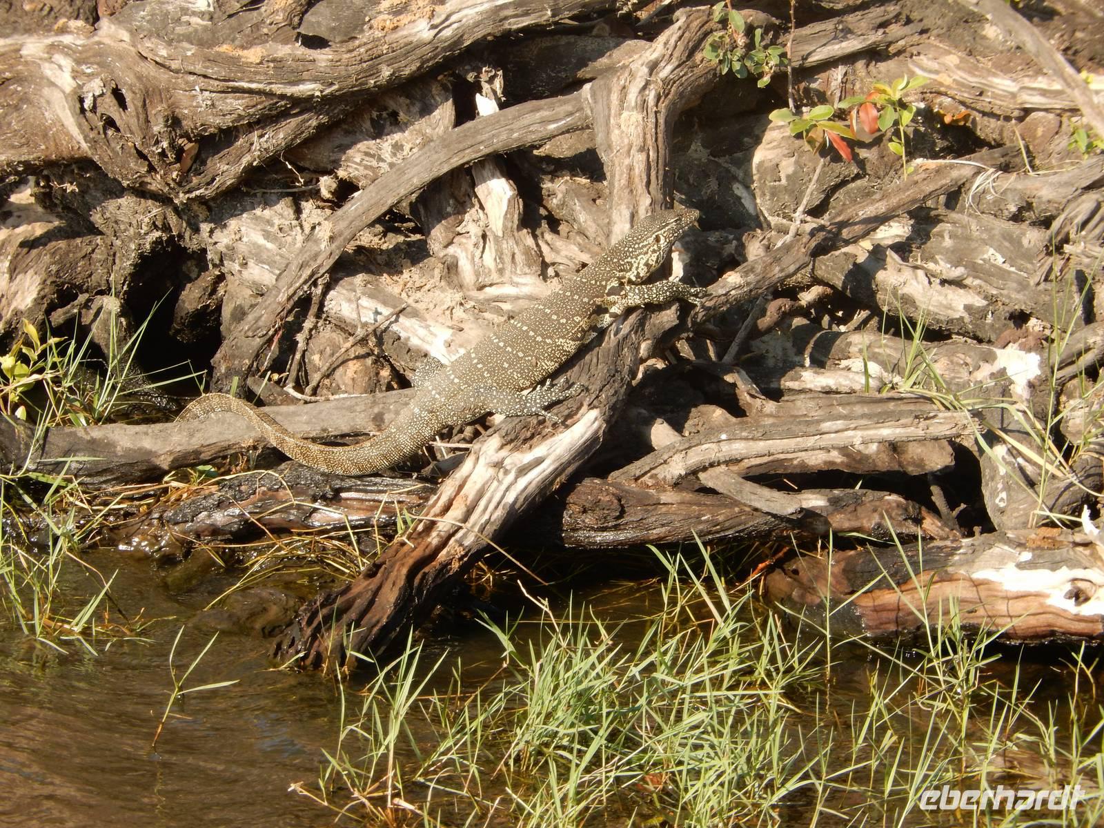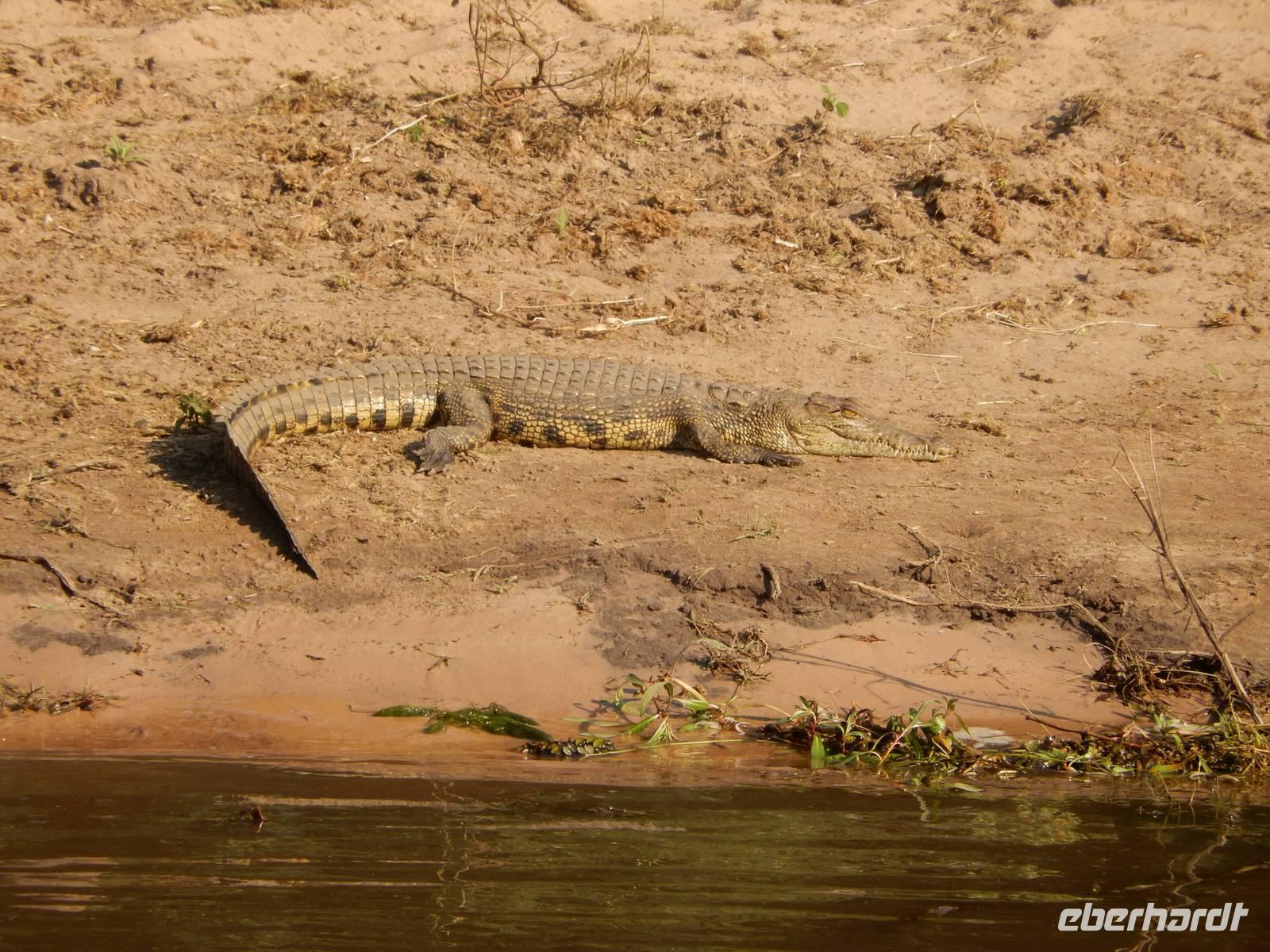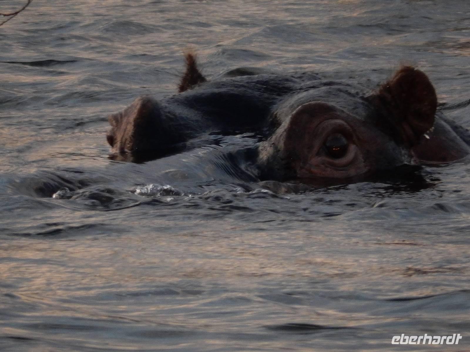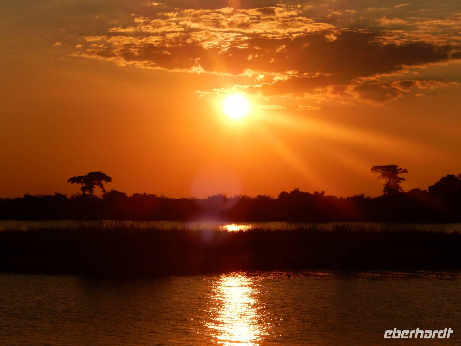 Auch der Nachmittag verspricht einiges. Wir treffen uns zur Bootssafari an der Lodge eigenen Anlegestelle. Per Ausflugsboot fahren wir entlang des Chobe und müssen auch bei diesem Ausflug zunächst am Eingang des Nationalparks angemeldet werden. Nur wenige Meter weiter liegt ein Waran am Ufer. Neben Elefantenherden im Wasser, beobachten wir auch eine Vielzahl an Hippos, Büffeln, Eisvögel, Reiher und ... Krokodile. Der Sonnenuntergang auf dem Rückweg zur Lodge ist traumhaft und macht den Tag zu einem unvergesslichen Erlebnis.