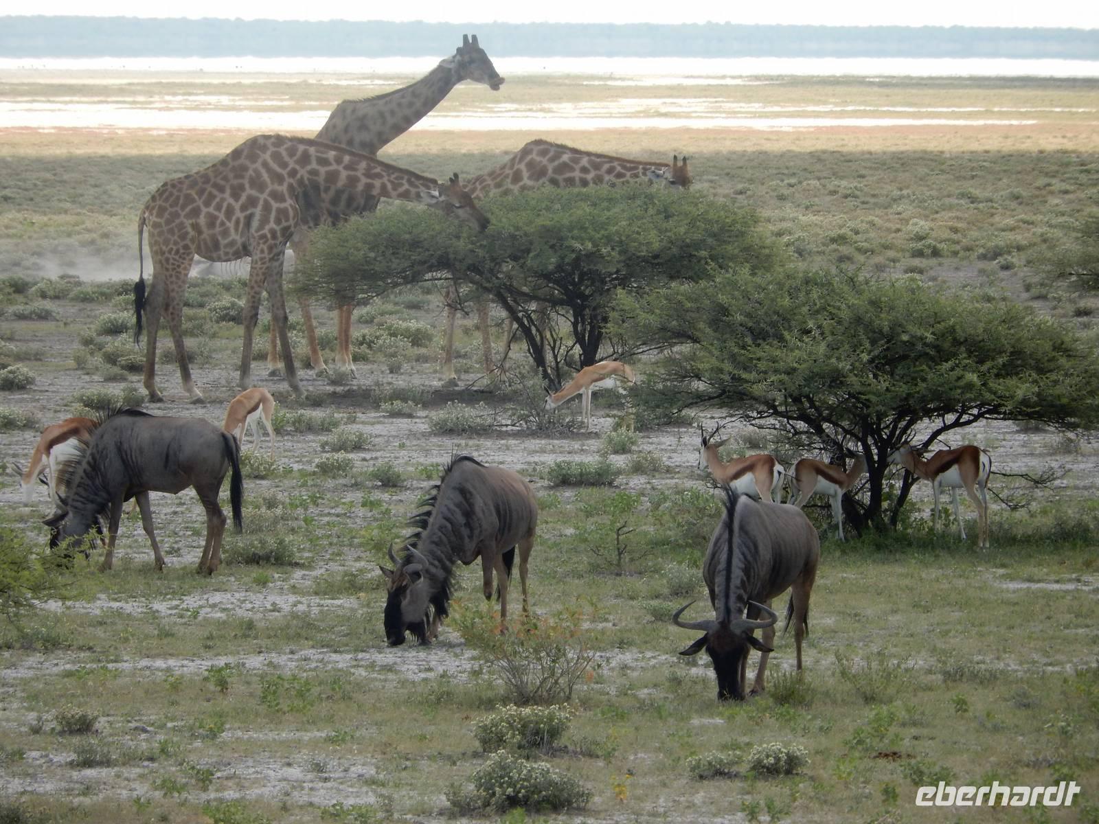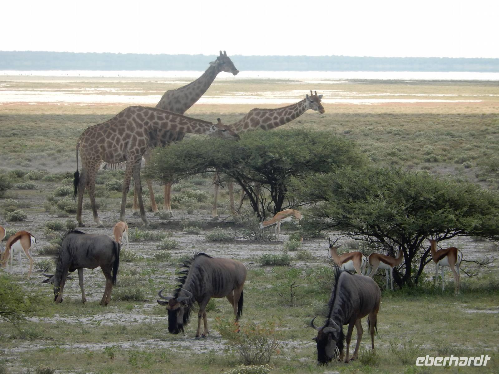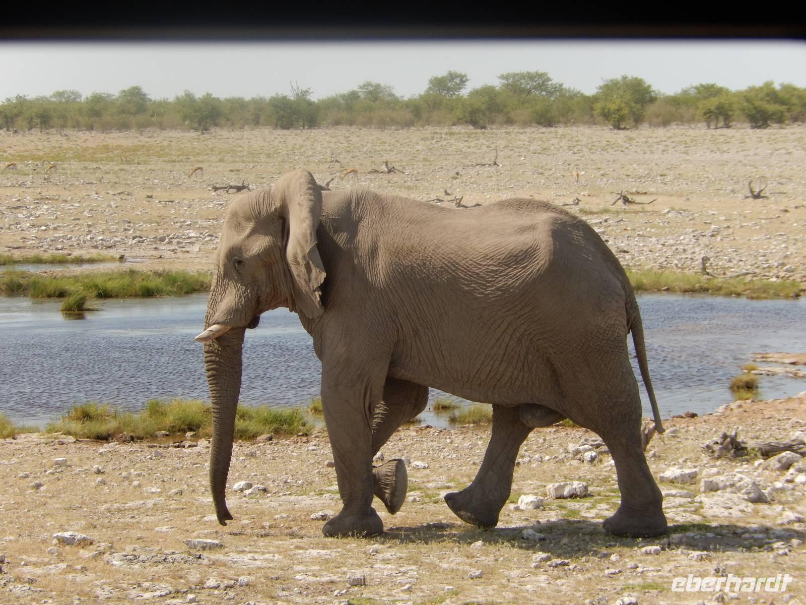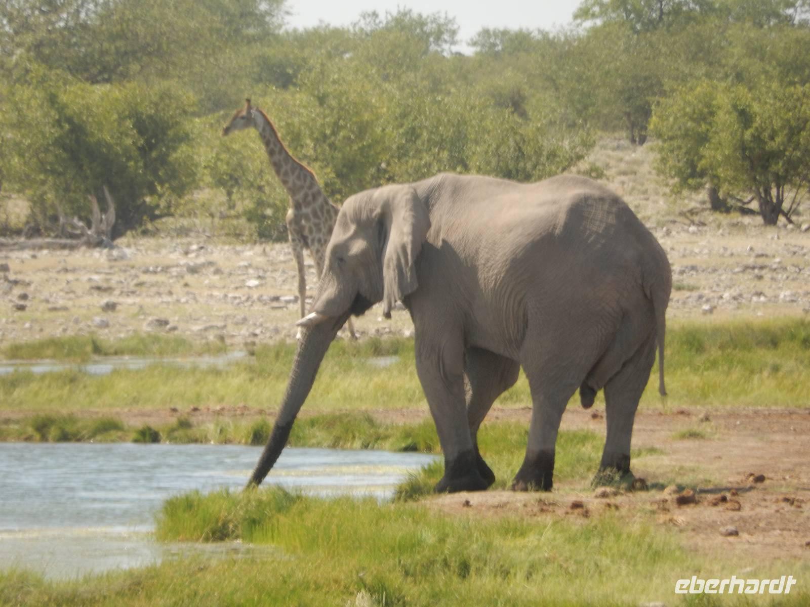 Das Tor des Camps öffnet zu Sonnenaufgang um 6:07 Uhr. Wir sind bereits abfahrtbereit für unsere Pirschfahrt und sehr gespannt, welche Tiere wir beobachten können. Nach nur wenigen Kilometern Fahrt entdecken wir bereits Giraffen und eine Herde von Springböcken. Wir biegen von der Hauptstraße auf Nebenwege ab, wodurch die Fahrt nun sehr „bewegt" wird. Auf unserer Pirschfahrt sehen wir jede Menge Zebras, Gnus, Impalas, Oryxe und Kudus, aber auch Gackeltrappen und Paradiesvögel sowie Rotkuhantilopen und Strauße. Mittagspause machen wir in Halali. Der Höhepunkt des Tages ist ein Wasserloch, welches von Springböcken, Gnus und Kudus umgeben ist, dem sich Giraffen nähern, als plötzlich in der Ferne ein Elefant auftaucht. Sadrag stellt den Motor ab, wir warten. Relativ zügig nähert sich der Elefant dem Wasserloch und passiert unseren Truck in circa 15 Metern Nähe. Die Tiere scheinen ihm Platz zu machen. Die Giraffen beobachten ihn, als er sich mit Schlamm abspritzt. Ein unbeschreibliches Erlebnis! Nach dieser Begegnung fahren wir zurück zum Camp. Der späte Nachmittag steht zur freien Verfügung und wird im Pool oder am Wasserloch verbracht. Letztendlich treffen wir uns alle am Wasserloch wieder und beobachten ein seltsames Verhalten der Giraffen. Sehr vorsichtig nähern sie sich, halten immer wieder minutenlang Ausschau, bevor sie sich weiterbewegen. Wittern sie eine Gefahr? Nach dem Abendessen erhalten wir die Antwort: ein Löwe zieht seine Runden und sucht nach seiner Beute. Doch die Giraffen sind bereits verschwunden. Glücklicherweise!