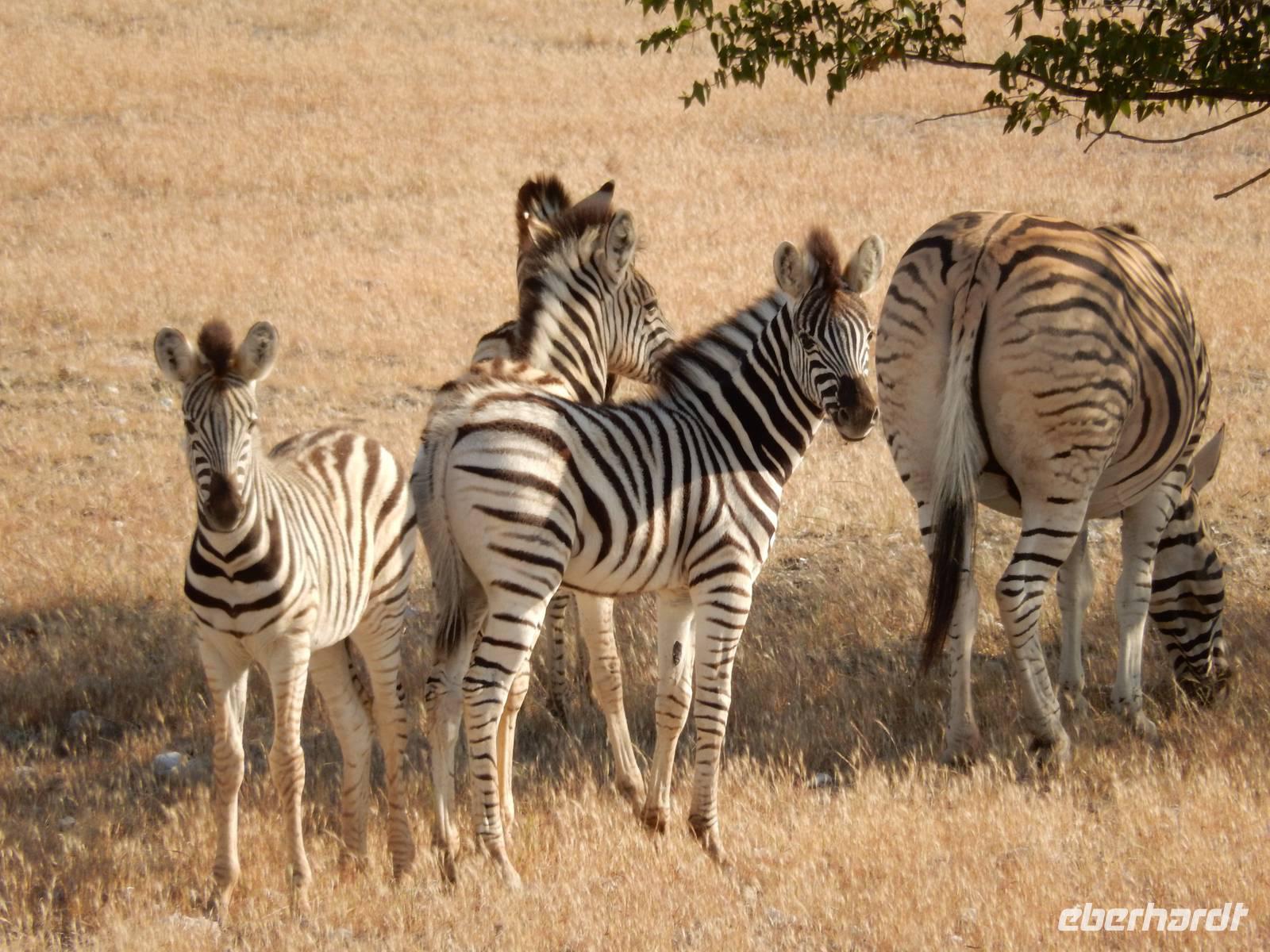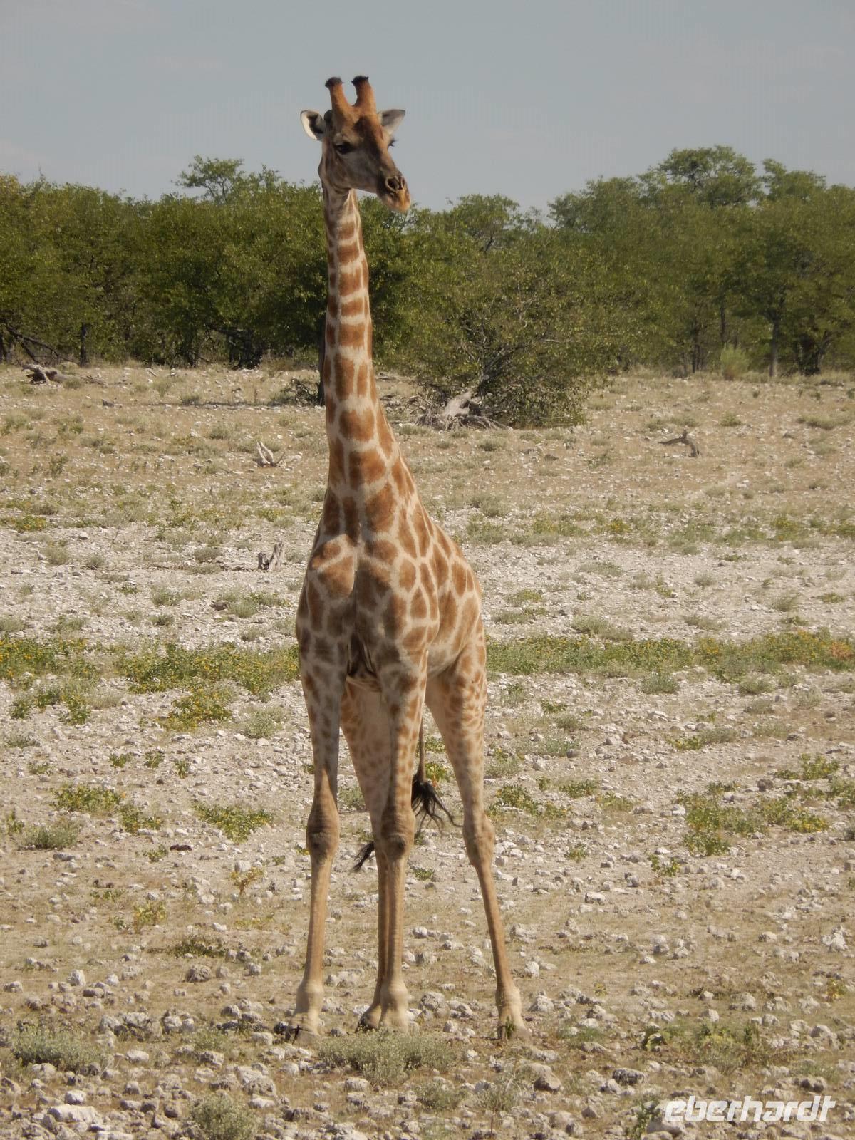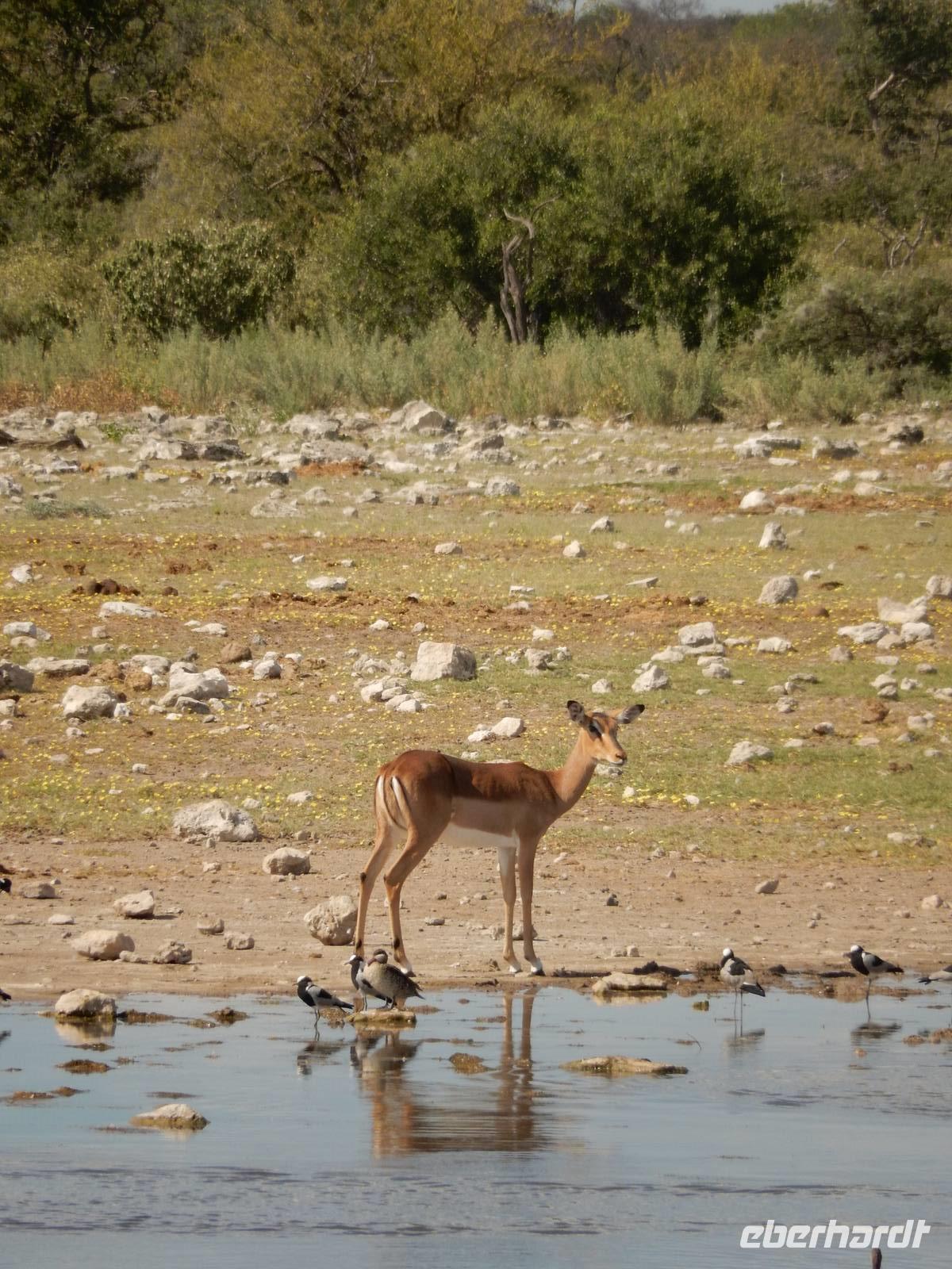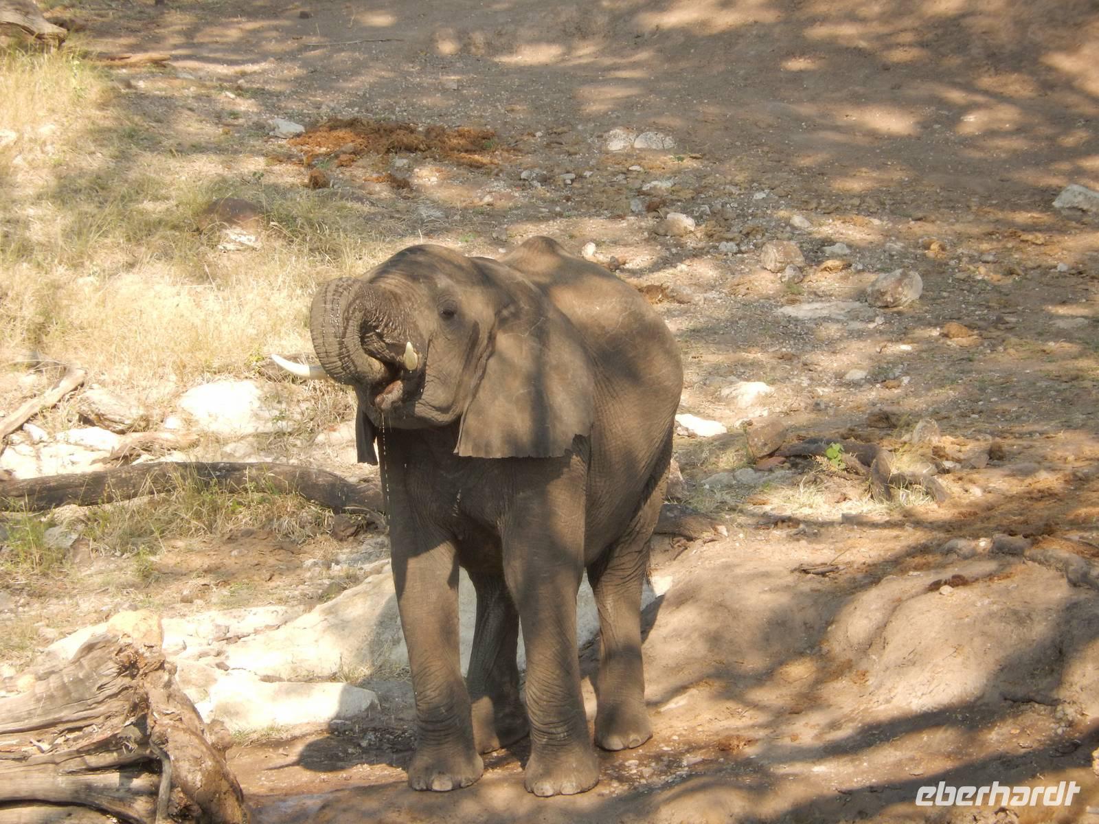 Das Tor des Camps öffnet zu Sonnenaufgang um 6:07 Uhr. Wir sind bereits abfahrtbereit für unsere Pirschfahrt und sehr gespannt, welche Tiere wir beobachten können. Nach nur wenigen Kilometern Fahrt entdecken wir bereits Giraffen und eine Herde von Springböcken. Wir biegen von der Hauptstraße auf Nebenwege ab, wodurch die Fahrt nun sehr „bewegt" wird. Auf unserer Pirschfahrt sehen wir jede Menge Zebras, Gnus, Impalas, Oryxe und Kudus, aber auch Gackeltrappen und Paradiesvögel sowie Rotkuhantilopen und Strauße. Mittagspause machen wir in Halali. Der Höhepunkt des Tages ist ein Wasserloch, welches von Springböcken, Gnus und Kudus umgeben ist, dem sich Giraffen nähern, als plötzlich in der Ferne ein Elefant auftaucht. Sadrag stellt den Motor ab, wir warten. Relativ zügig nähert sich der Elefant dem Wasserloch und passiert unseren Truck in circa 15 Metern Nähe. Die Tiere scheinen ihm Platz zu machen. Die Giraffen beobachten ihn, als er sich mit Schlamm abspritzt. Ein unbeschreibliches Erlebnis! Nach dieser Begegnung fahren wir zurück zum Camp. Der späte Nachmittag steht zur freien Verfügung und wird im Pool oder am Wasserloch verbracht. Letztendlich treffen wir uns alle am Wasserloch wieder und beobachten ein seltsames Verhalten der Giraffen. Sehr vorsichtig nähern sie sich, halten immer wieder minutenlang Ausschau, bevor sie sich weiterbewegen. Wittern sie eine Gefahr? Nach dem Abendessen erhalten wir die Antwort: ein Löwe zieht seine Runden und sucht nach seiner Beute. Doch die Giraffen sind bereits verschwunden. Glücklicherweise!