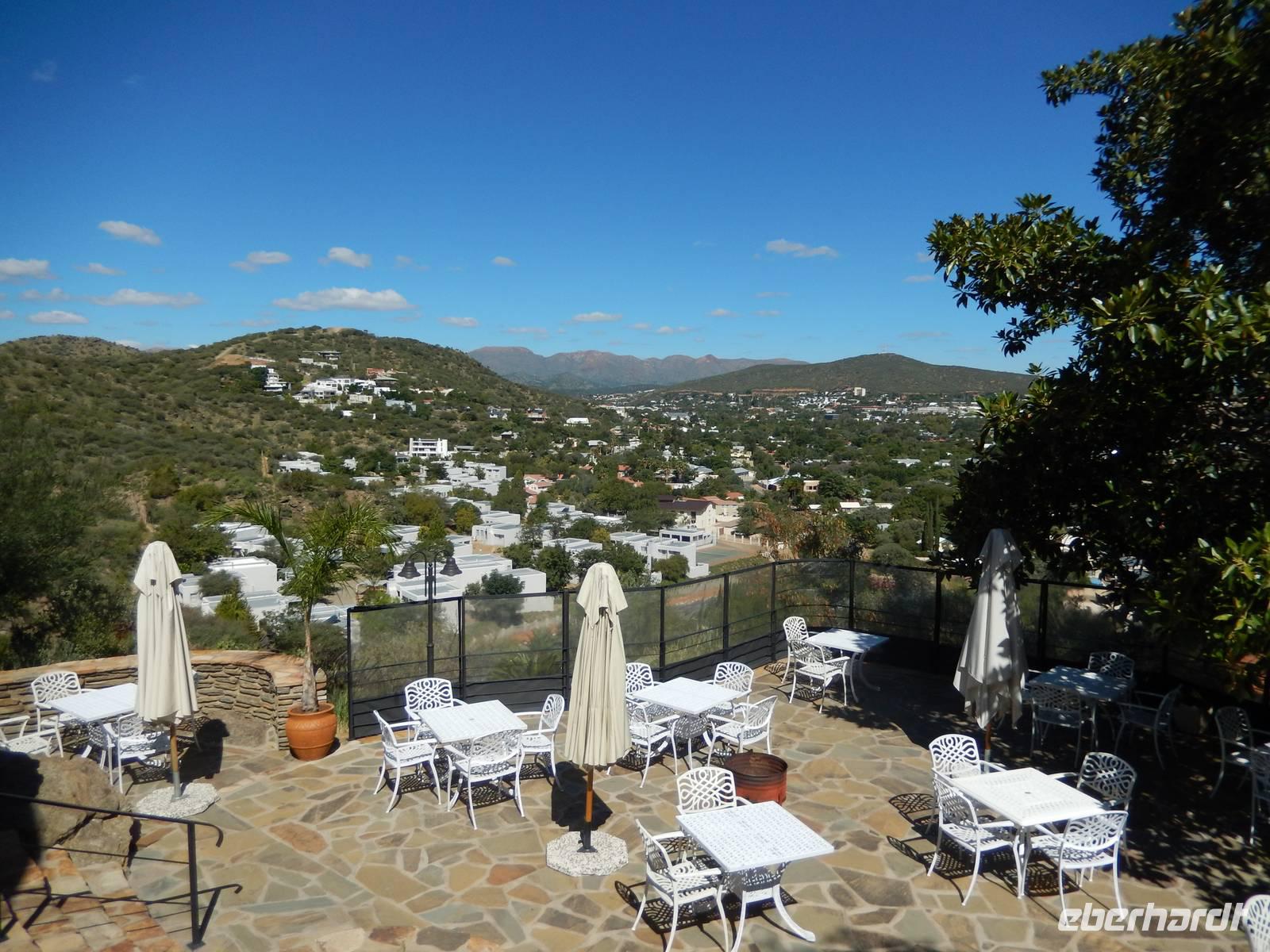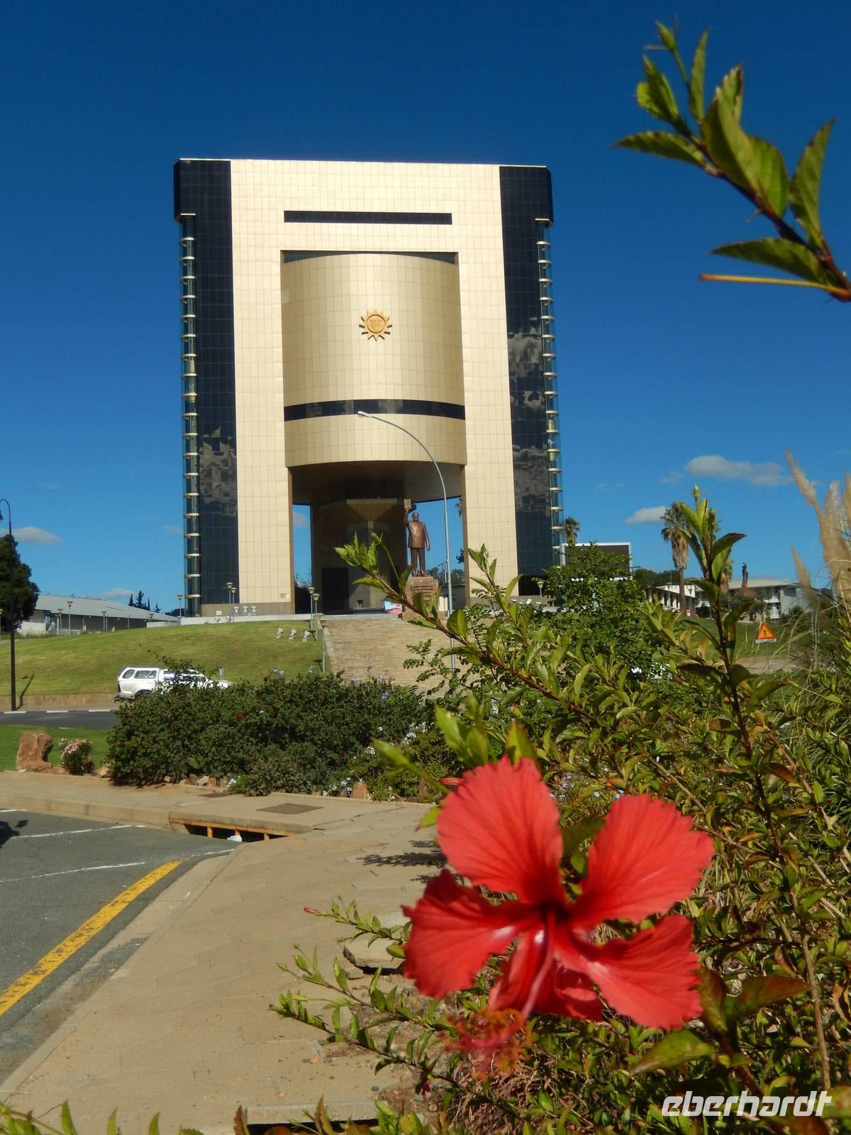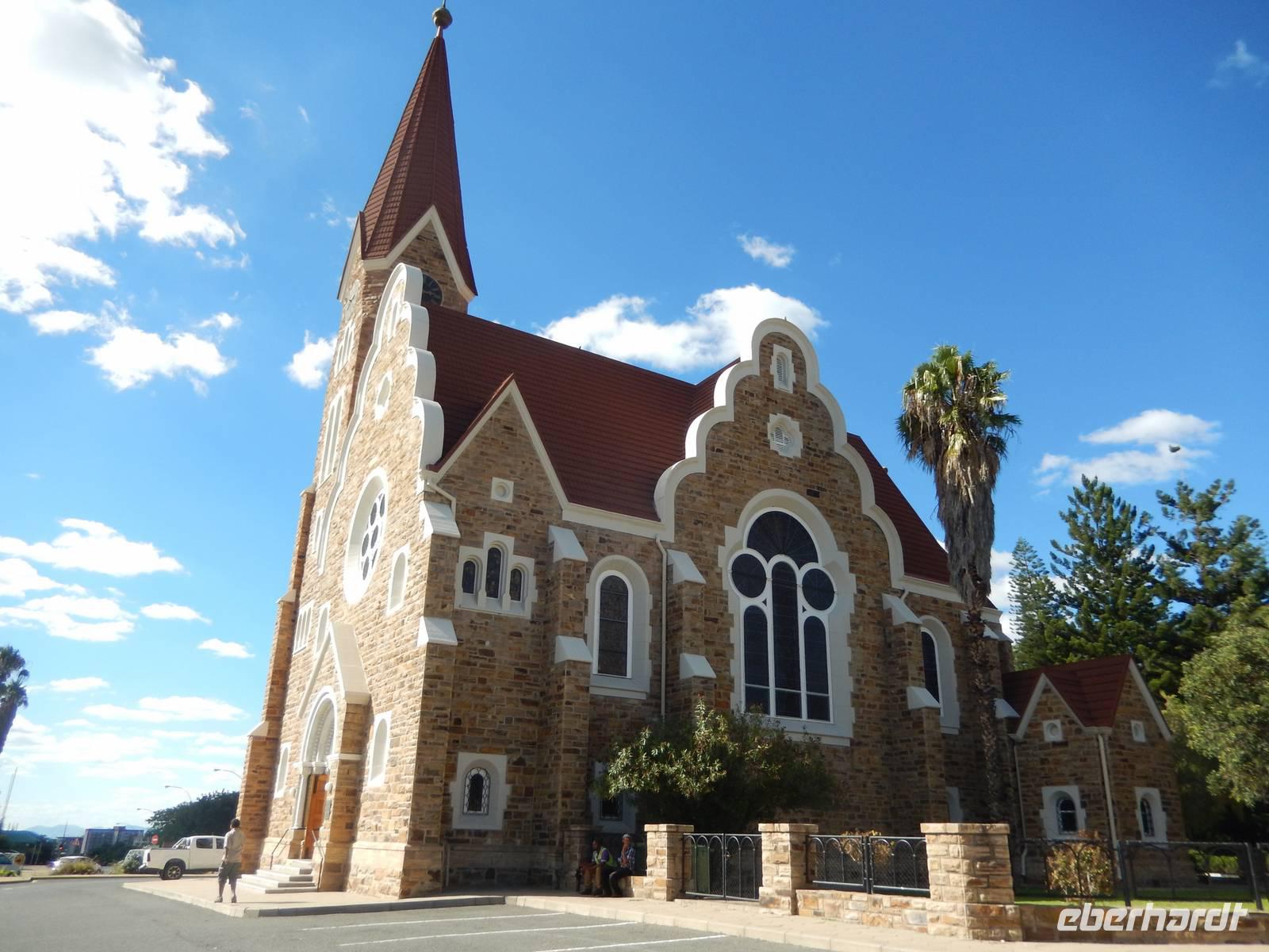 Nach einer kleinen Pause zeigt uns Lesley das 1650 Meter hoch gelegene Windhoek bei einer zweieinhalb stündigen Stadtrundfahrt. In der Christuskirche erzählt uns Marvin, der Aufseher in der Kirche, ein paar geschichtliche Details. Als Friedenskirche wurde sie erbaut und steht seit 100 Jahren mahnend, den schwer erkämpften Frieden zu bewahren. Wir laufen weiter zum Tintenpalast, dem ehemaligen Verwaltungszentrum von Deutsch-Südwest und heutigen Sitz der Nationalversammlung. Wer vor ein paar Jahren schon einmal in Windhoek war, vermisst den Südwester Reiter auf dem grünen Hügel, der gegen Nordosten ausgerichtet war. Er befindet sich nun im Innenhof der Alten Feste neben dem Unabhängigkeits-Gedenkmuseum, welches von den Einwohnern ihrem Aussehen nach als Kaffeemaschine bezeichnet wird. Wir fahren weiter zum Old Location Friedhof, dem damaligen zentrumsnahen Wohnviertel der schwarzen Arbeiter. Zwangsweise mussten sie ihr Viertel verlassen und an den Stadtrand ziehen, dem sie den Namen Katutura gaben, „der Ort an dem wir nicht bleiben wollen". Nachdem wir auch dieses Viertel besichtigt haben, fahren wir zurück zum Hotel. Wir nutzen die freien Minuten bis zum Abendessen, um das Gesehene zu verarbeiten.