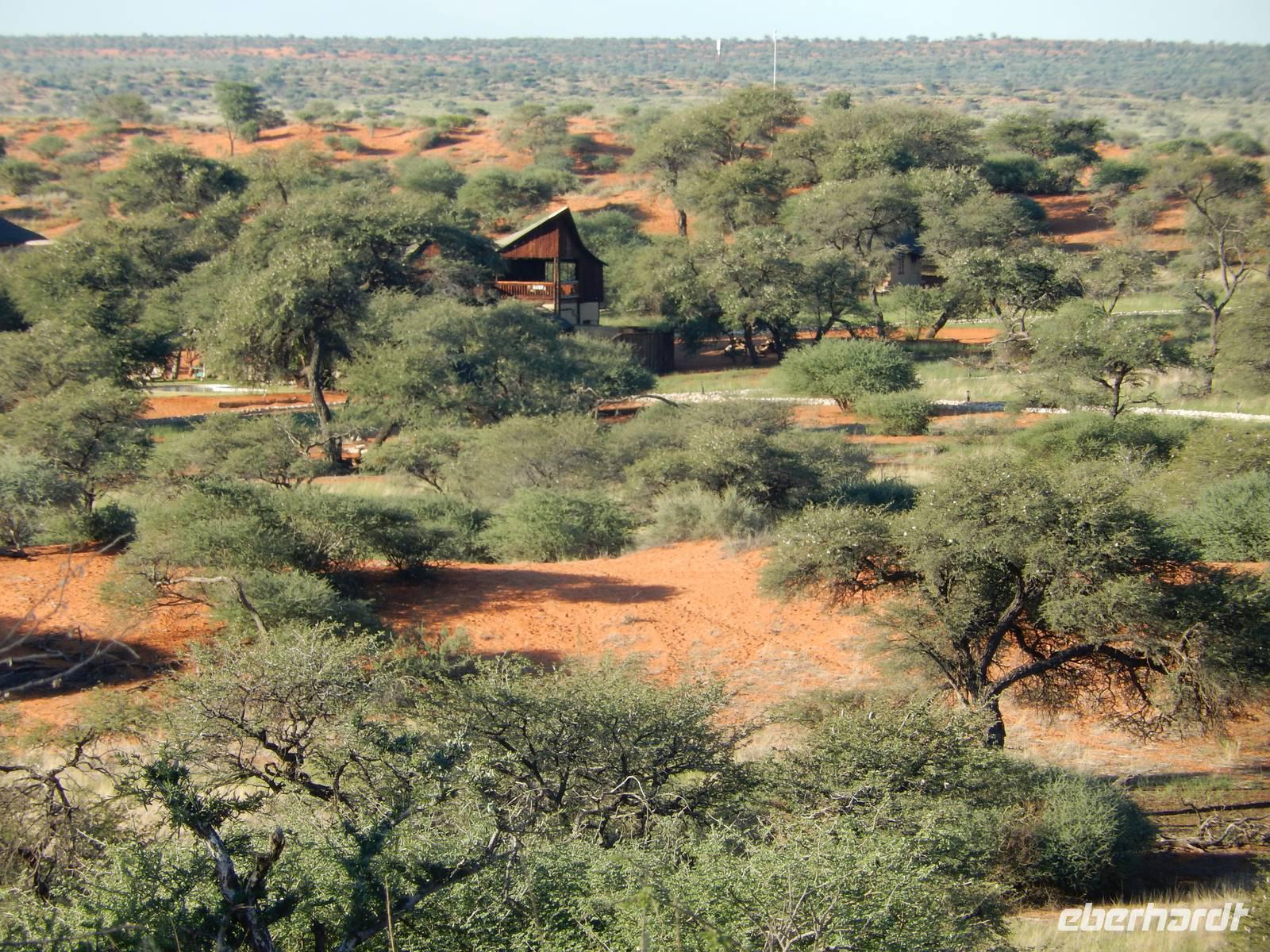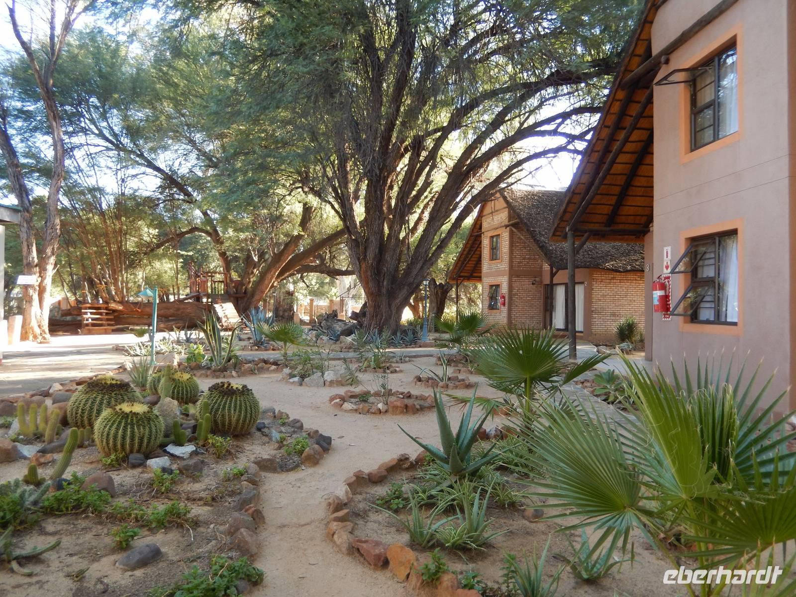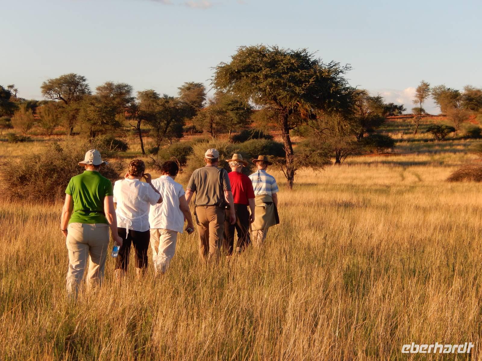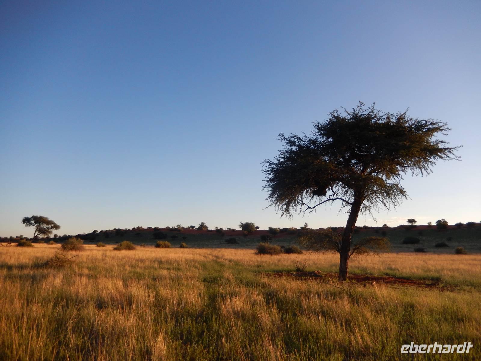 Nach einem reichhaltigen Frühstück brechen wir pünktlich um 9 Uhr auf und beginnen unsere Reise in Richtung Süden auf der B1, vorbei an Rehoboth, Kalkrand und unendlicher Weite. Während der Fahrt in unserem Nissan Truck erfahren wir von Lesley mehr über die Geschichte Namibias, Land und Leute. In Kalkrand unter einem „guten Baum" machen wir spontan ein Mini-Picknick. Alle packen mit an, sodass in wenigen Minuten Tisch und Stühle aufgebaut sind und ein leckerer Salat zubereitet ist. Nach weiteren 90 Minuten Fahrt erreichen wir am frühen Nachmittag unser Tagesziel, die Camelthorn Kalahari Lodge. Hier besteht die Möglichkeit sich einer ersten Pirschfahrt im Jeep anzuschließen oder auch zu Fuß auf eigene Faust das riesige Gelände, auf dem Springbock, Kudu, Oryx, eine Löwin sowie zahlreiche Vogelarten zu Hause sind, zu erkunden. Zum Abendessen finden sich alle wieder in der Lodge mit vielen neuen Eindrücken ein. Bevor es zu Bett geht, erklärt uns Lesley noch das ein oder andere Sternenbild und zeigt uns das südliche Himmelskreuz am afrikanischen Nachthimmel.