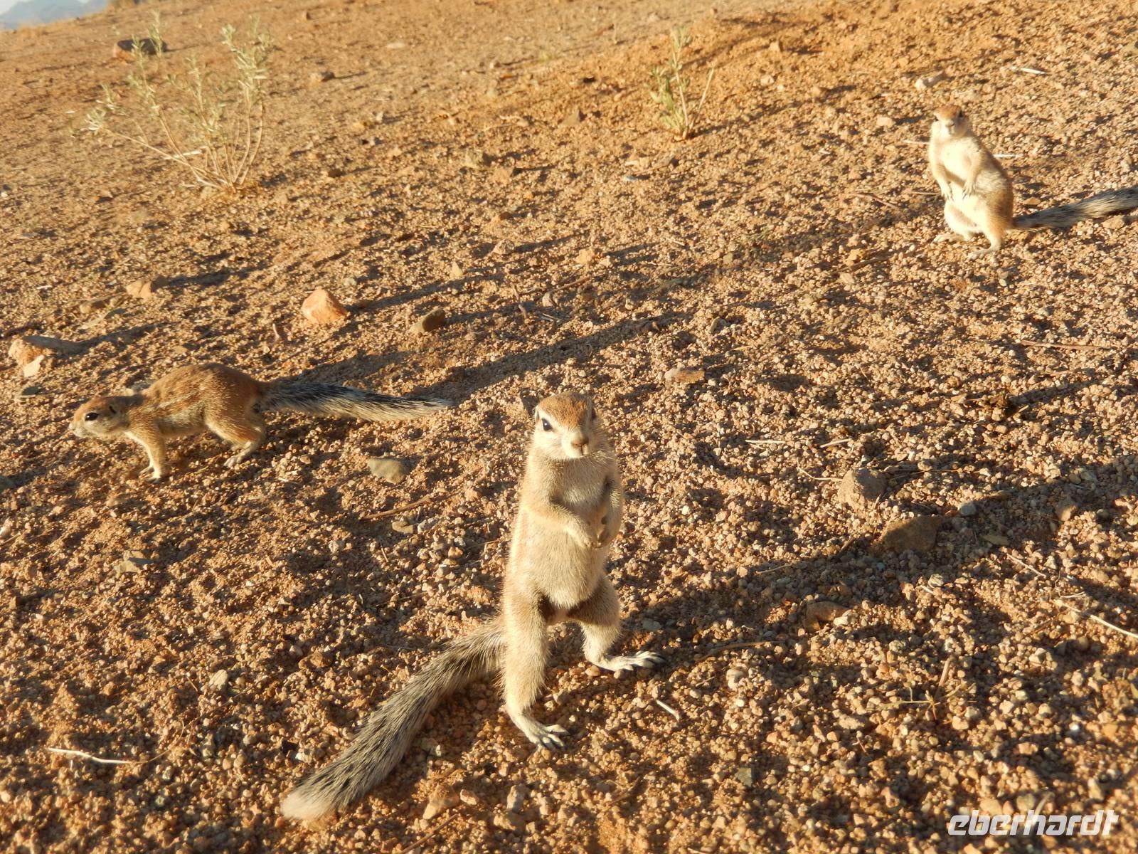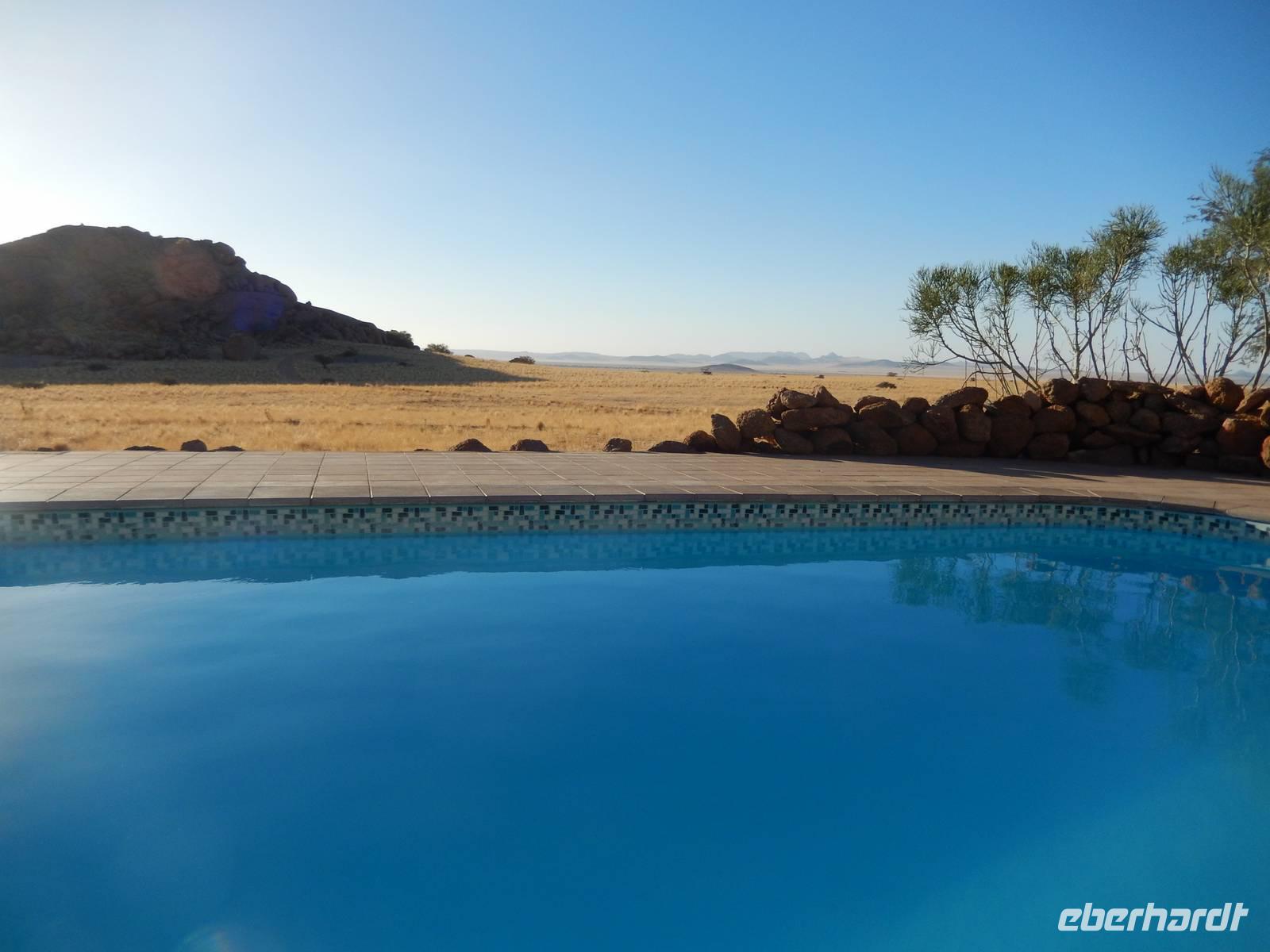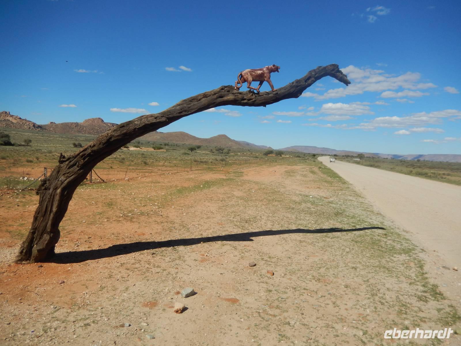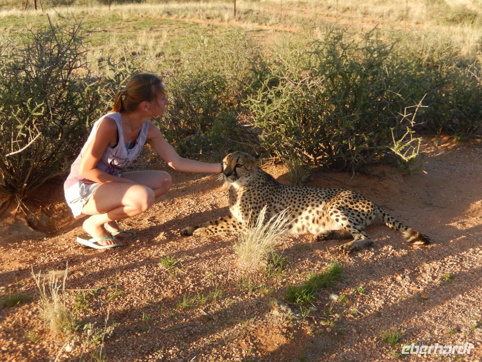 Heute haben wir einen großen Teil an Weg zurückzulegen. Von unserer Lodge aus fahren wir über Mariental und Maltahöhe Richtung Westen. In Mariental haben wir die Möglichkeit im SPAR ein paar Kleinigkeiten für unterwegs einzukaufen. Während der Fahrt bleibt genügend Zeit vieles Interessantes über Land und Leute zu erfahren, Fragen zu stellen und zu diskutieren. Immerhin ist unser Guide Lesley Einheimischer. Nachdem wir den Tsaris-Pass überquert haben, legen wir eine kurze Mittagspause unter einem schönen Akazienbaum ein. Bis hierhin haben wir bereits jede Menge Tiere gesehen: Strauße, Oryxe, Springböcke, Riesentrappe, Wasserböcke, einen Gnu und sogar Kamele. Nun sind es nur noch wenige Minuten bis zu unserem heutigen Tagesziel, der Hammerstein Lodge. Mit einem frischen Getränk werden wir empfangen. Nach einer individuellen Pause zum Erfrischen im Pool, Kaffee trinken oder Plaudern auf der Sonnenterrasse, treffen wir uns zur „Katzen-Tour". Claudia ist eine deutsche Volontär und bereits zum vierten Mal in Namibia, um während ihres Urlaubs ehrenamtlich zu helfen. Sie zeigt uns die wilden Haustiere der Lodge: die zwei Karakale Romeo und Julia, die Leopardin Lisa und die Geparden-Geschwister Wild und Oscar. Wer sich traut, darf die Geparden streicheln. Was für ein borstiges Fell! Um 18 Uhr treffen wir uns zum Abendessen. Am Buffet gibt es Lamm, Rindfleisch und Kudu. Eine kleine Show-Einlage von den Kellnern und Köchen rundet den Abend ab.
