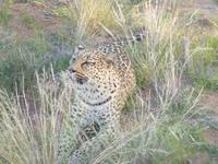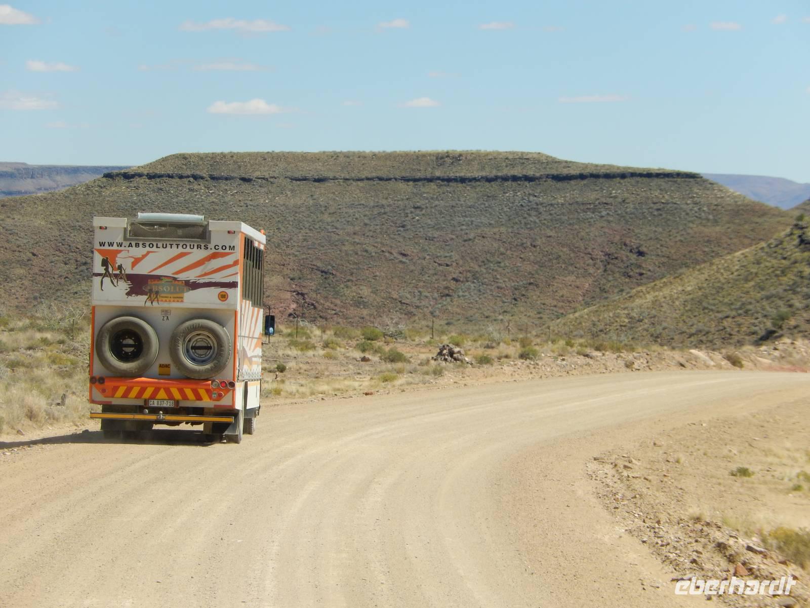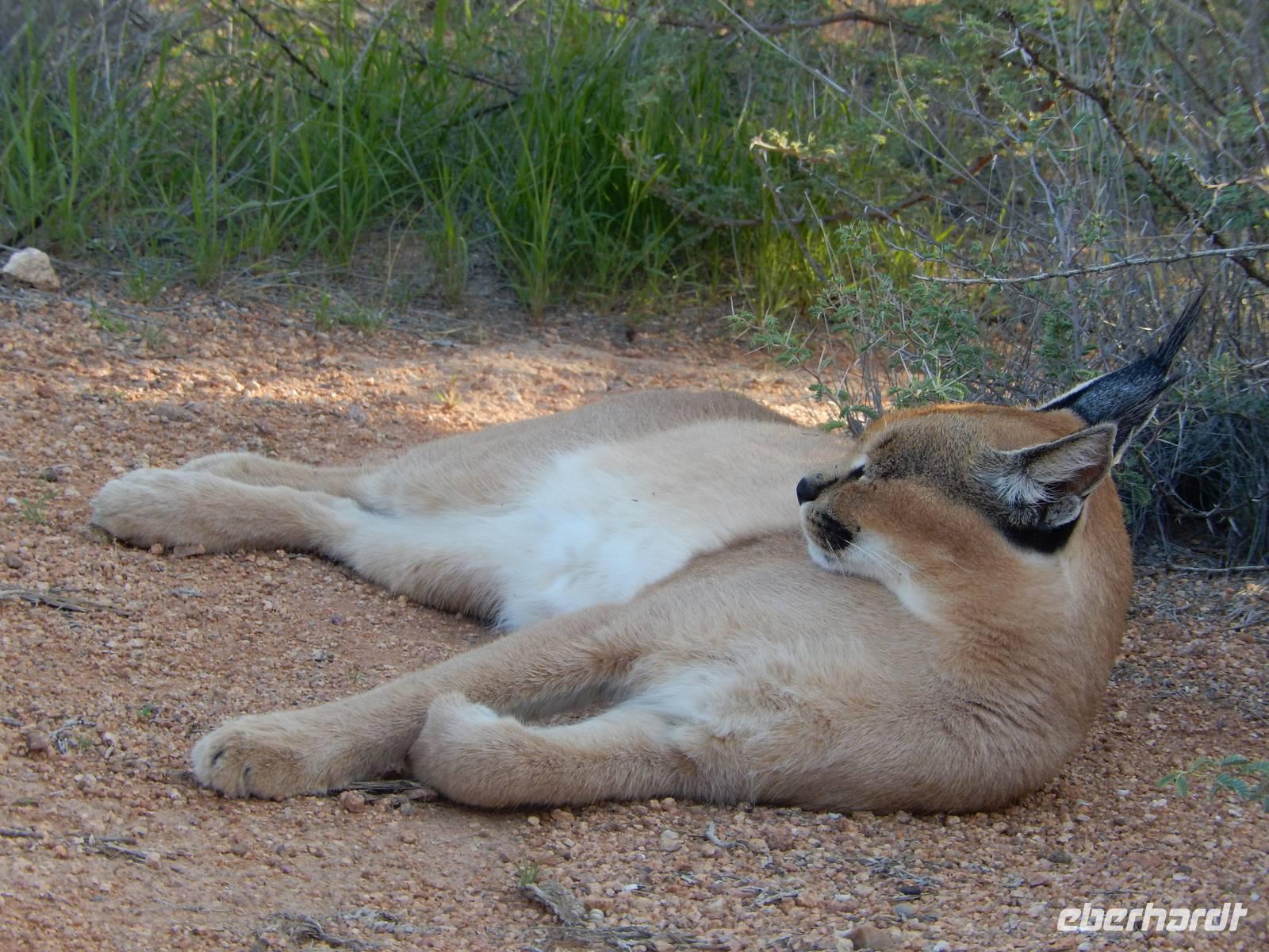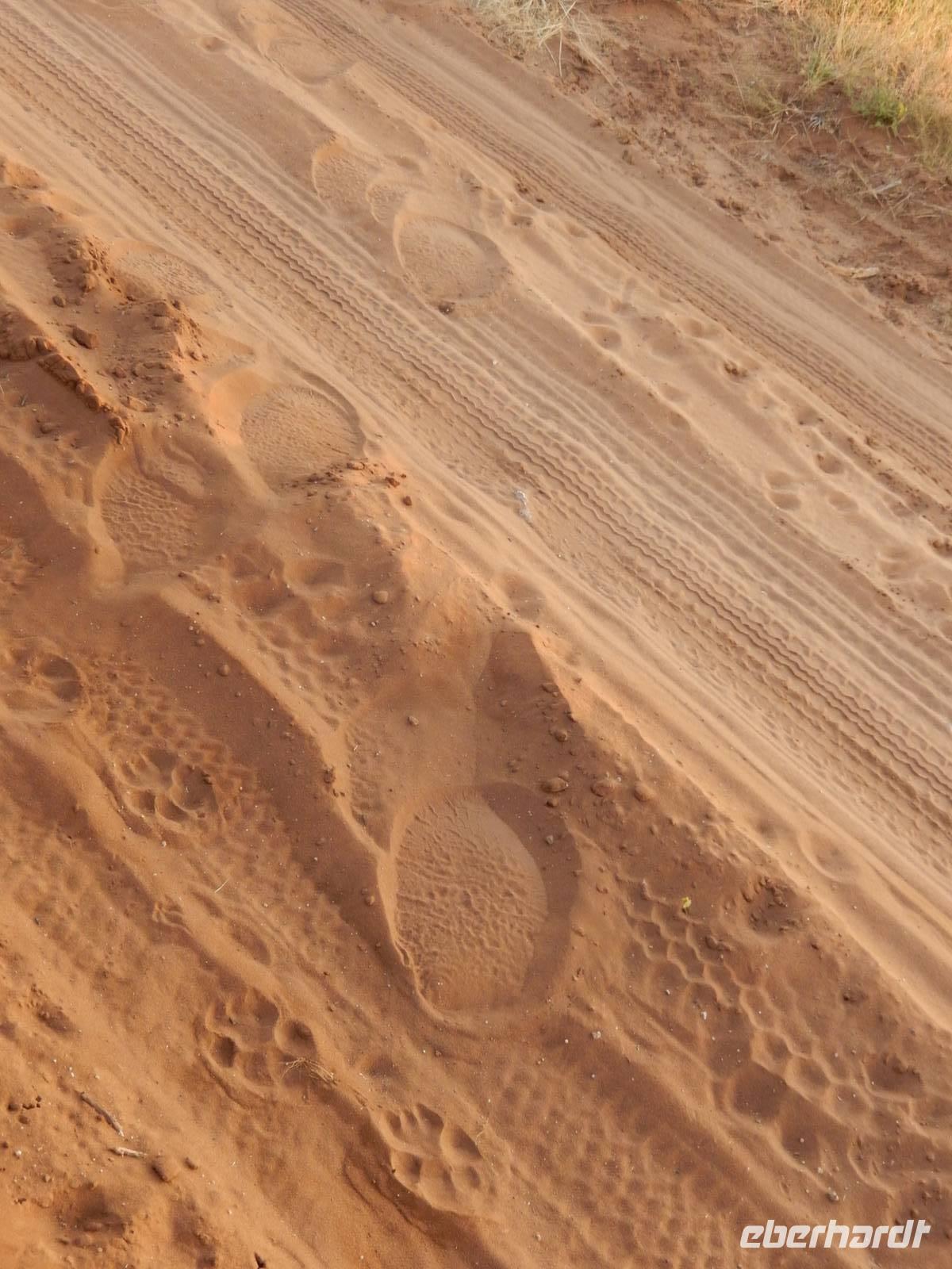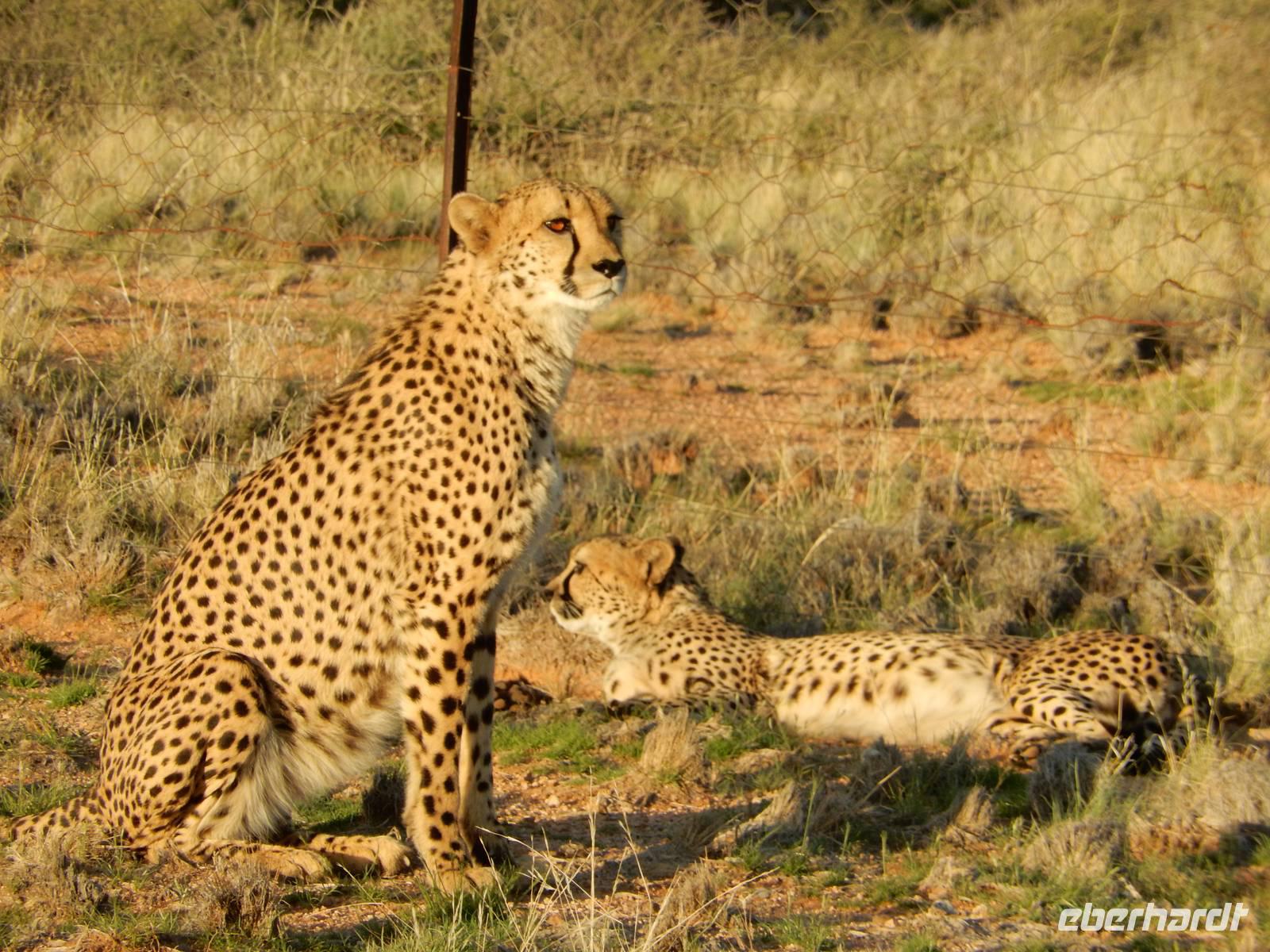 Heute haben wir einen großen Teil an Weg zurückzulegen. Von unserer Lodge aus fahren wir über Mariental und Maltahöhe Richtung Westen. In Mariental haben wir die Möglichkeit im SPAR ein paar Kleinigkeiten für unterwegs einzukaufen. Während der Fahrt bleibt genügend Zeit vieles Interessantes über Land und Leute zu erfahren, Fragen zu stellen und zu diskutieren. Immerhin ist unser Guide Lesley Einheimischer. Nachdem wir den Tsaris-Pass überquert haben, legen wir eine kurze Mittagspause unter einem schönen Akazienbaum ein. Bis hierhin haben wir bereits jede Menge Tiere gesehen: Strauße, Oryxe, Springböcke, Riesentrappe, Wasserböcke, einen Gnu und sogar Kamele. Nun sind es nur noch wenige Minuten bis zu unserem heutigen Tagesziel, der Hammerstein Lodge. Mit einem frischen Getränk werden wir empfangen. Nach einer individuellen Pause zum Erfrischen im Pool, Kaffee trinken oder Plaudern auf der Sonnenterrasse, treffen wir uns zur „Katzen-Tour". Claudia ist eine deutsche Volontär und bereits zum vierten Mal in Namibia, um während ihres Urlaubs ehrenamtlich zu helfen. Sie zeigt uns die wilden Haustiere der Lodge: die zwei Karakale Romeo und Julia, die Leopardin Lisa und die Geparden-Geschwister Wild und Oscar. Wer sich traut, darf die Geparden streicheln. Was für ein borstiges Fell! Um 18 Uhr treffen wir uns zum Abendessen. Am Buffet gibt es Lamm, Rindfleisch und Kudu. Eine kleine Show-Einlage von den Kellnern und Köchen rundet den Abend ab.