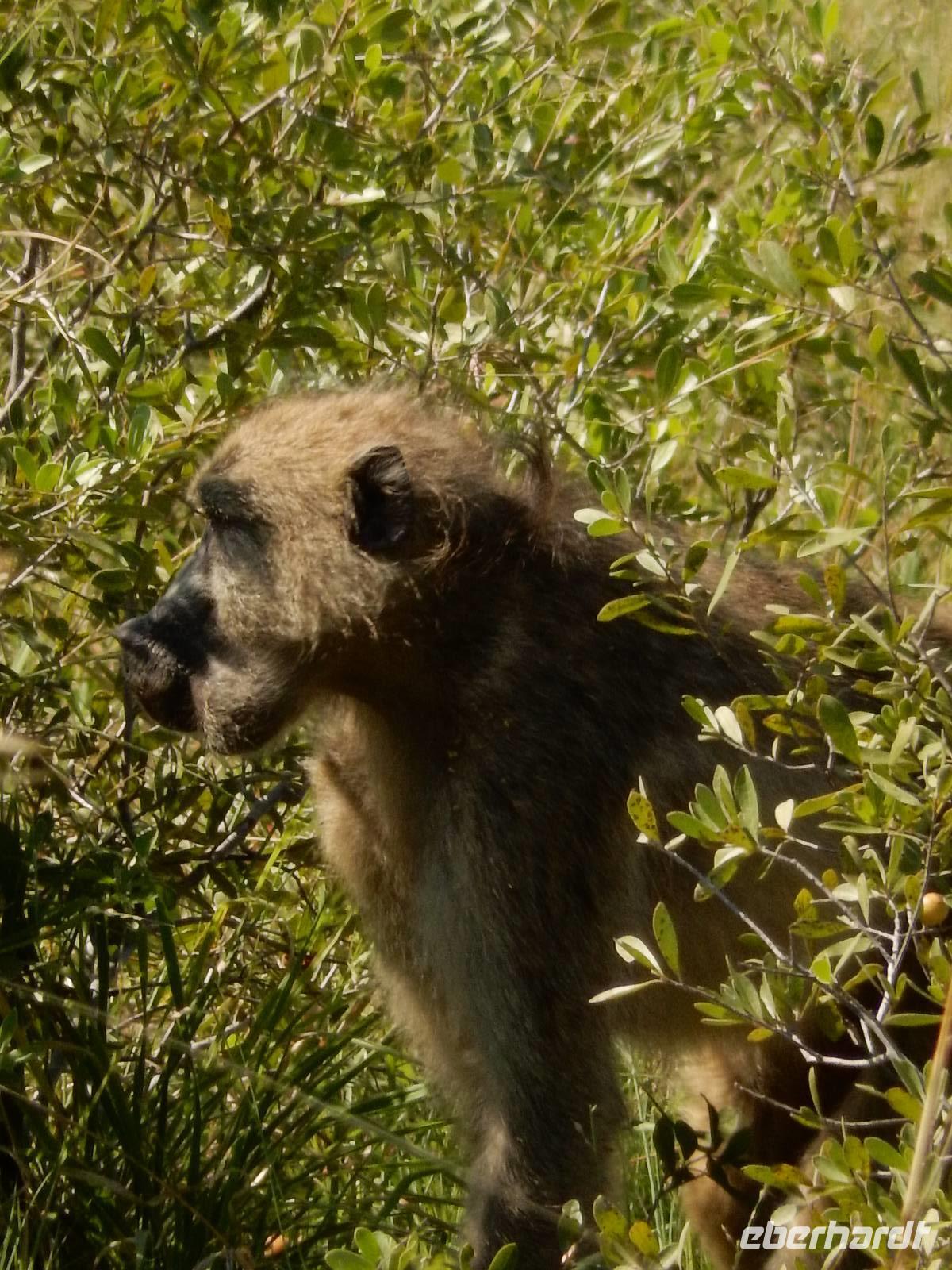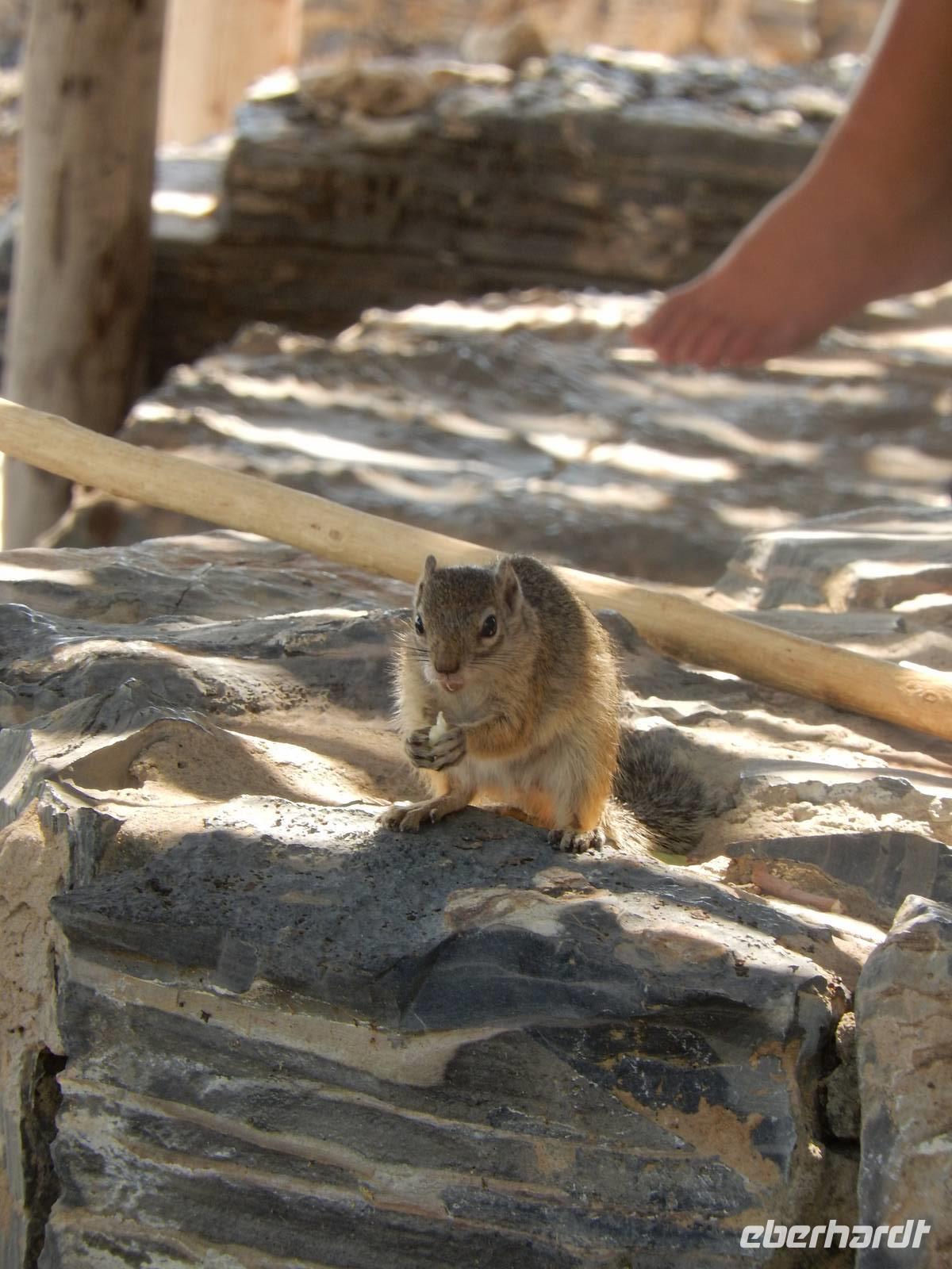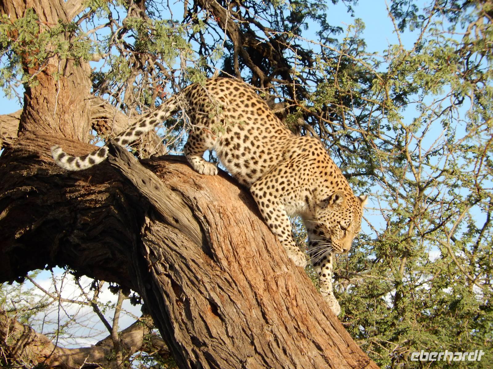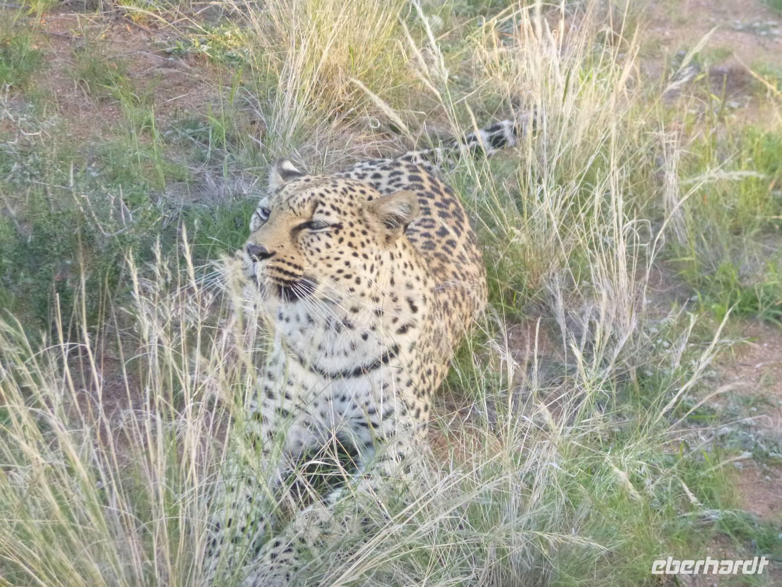 Heute haben wir einen großen Teil an Weg zurückzulegen. Von unserer Lodge aus fahren wir über Mariental und Maltahöhe Richtung Westen. In Mariental haben wir die Möglichkeit im SPAR ein paar Kleinigkeiten für unterwegs einzukaufen. Während der Fahrt bleibt genügend Zeit vieles Interessantes über Land und Leute zu erfahren, Fragen zu stellen und zu diskutieren. Immerhin ist unser Guide Lesley Einheimischer. Nachdem wir den Tsaris-Pass überquert haben, legen wir eine kurze Mittagspause unter einem schönen Akazienbaum ein. Bis hierhin haben wir bereits jede Menge Tiere gesehen: Strauße, Oryxe, Springböcke, Riesentrappe, Wasserböcke, einen Gnu und sogar Kamele. Nun sind es nur noch wenige Minuten bis zu unserem heutigen Tagesziel, der Hammerstein Lodge. Mit einem frischen Getränk werden wir empfangen. Nach einer individuellen Pause zum Erfrischen im Pool, Kaffee trinken oder Plaudern auf der Sonnenterrasse, treffen wir uns zur „Katzen-Tour". Claudia ist eine deutsche Volontär und bereits zum vierten Mal in Namibia, um während ihres Urlaubs ehrenamtlich zu helfen. Sie zeigt uns die wilden Haustiere der Lodge: die zwei Karakale Romeo und Julia, die Leopardin Lisa und die Geparden-Geschwister Wild und Oscar. Wer sich traut, darf die Geparden streicheln. Was für ein borstiges Fell! Um 18 Uhr treffen wir uns zum Abendessen. Am Buffet gibt es Lamm, Rindfleisch und Kudu. Eine kleine Show-Einlage von den Kellnern und Köchen rundet den Abend ab.