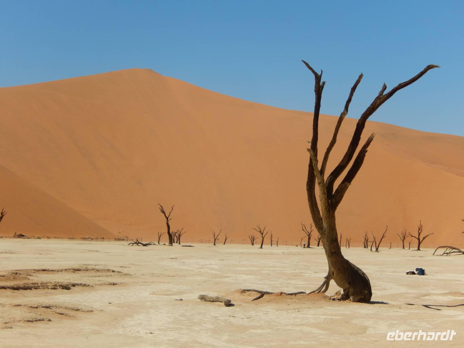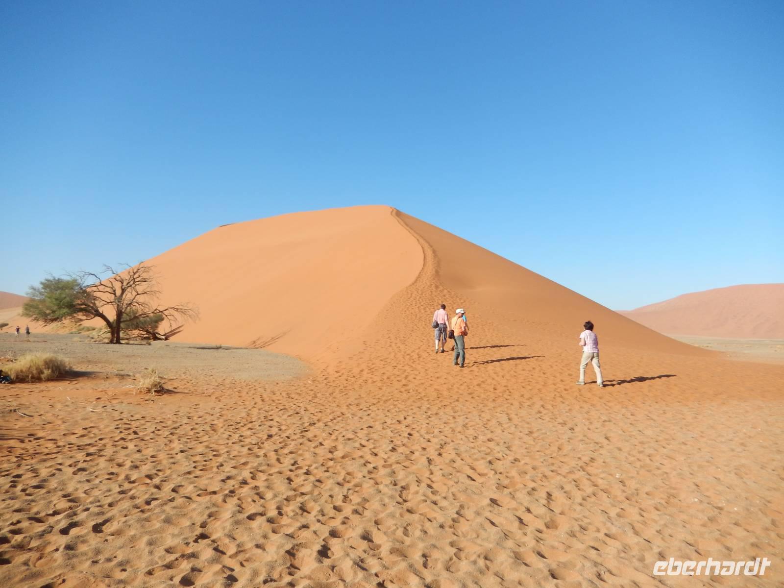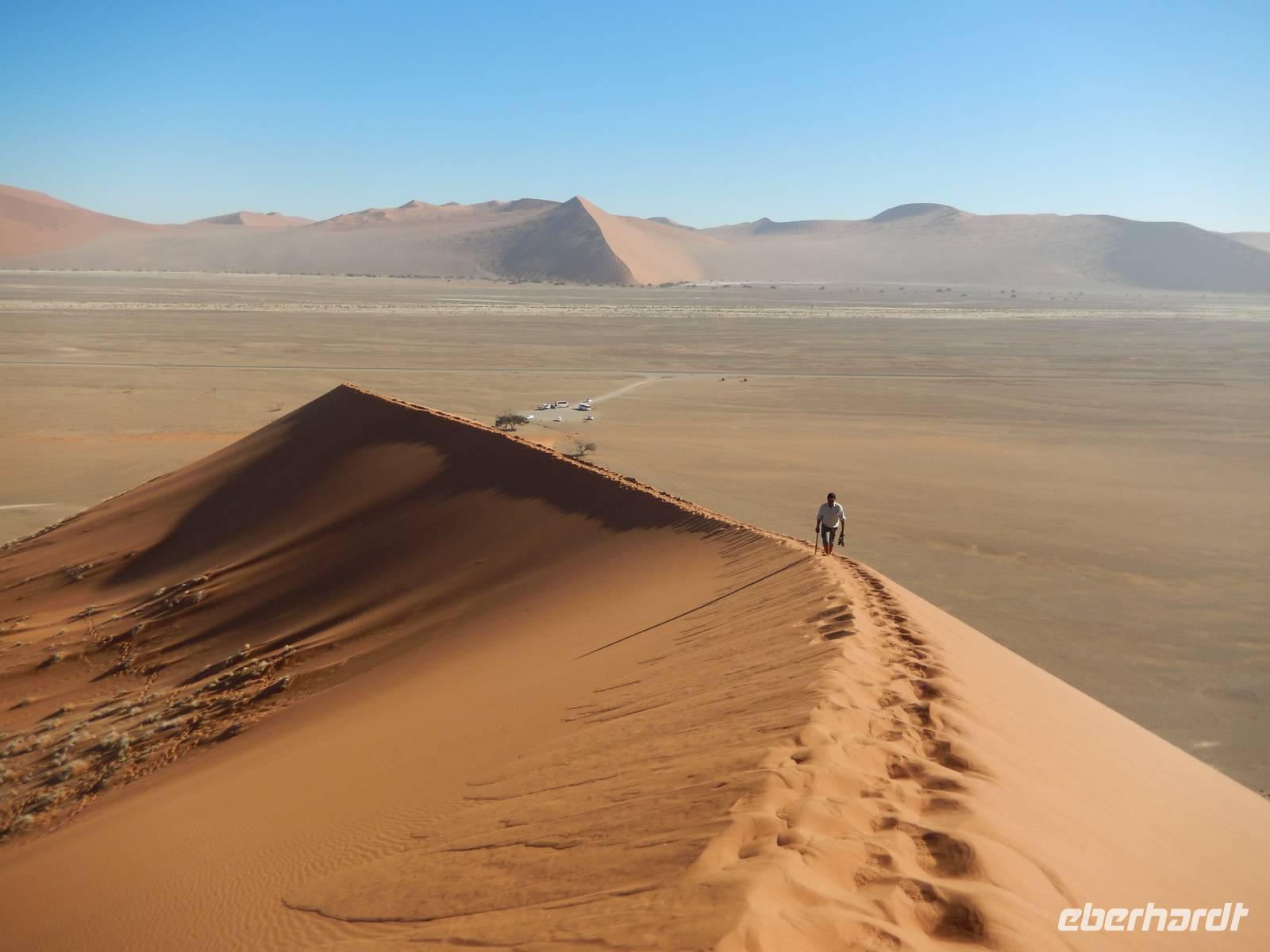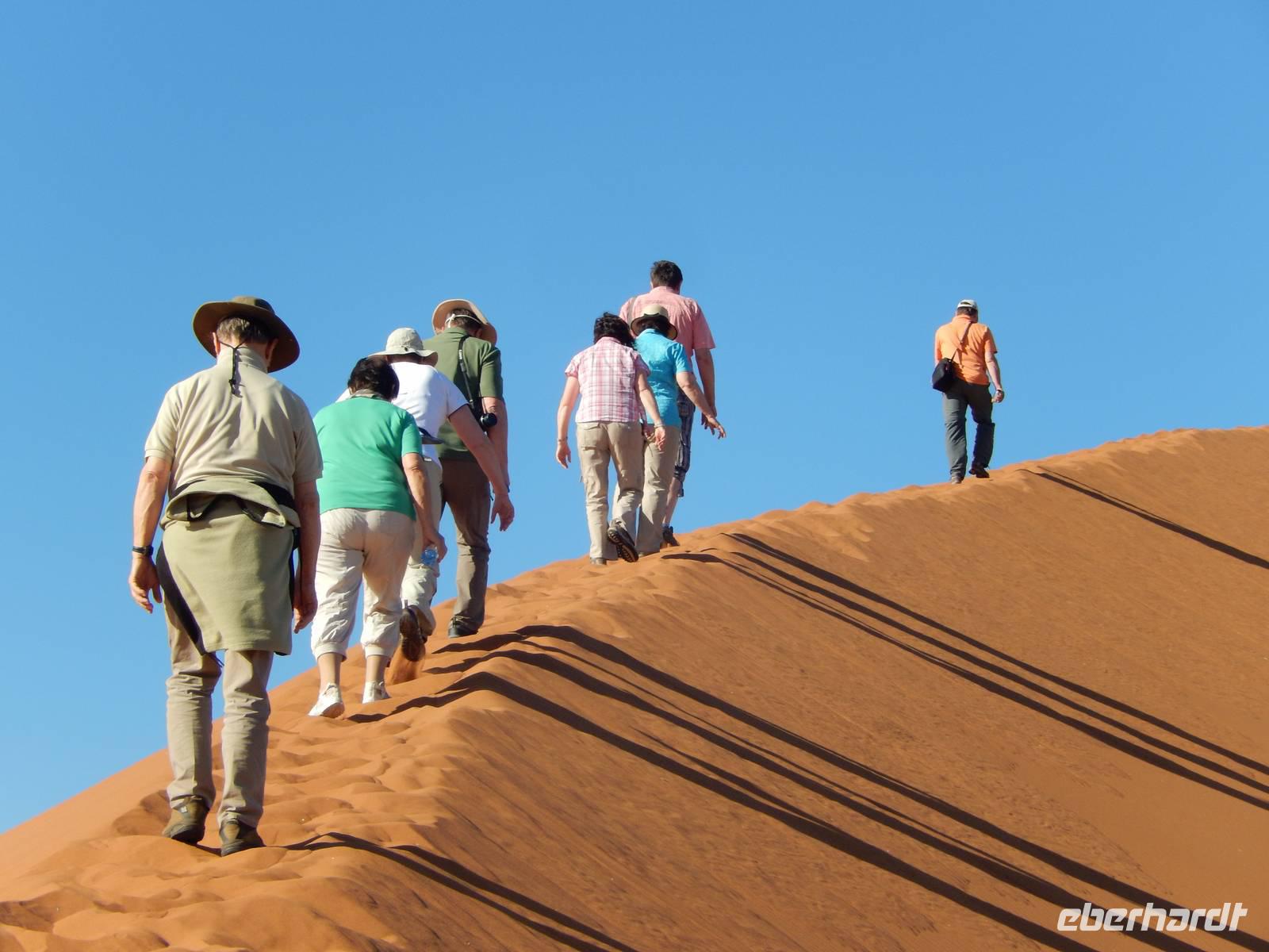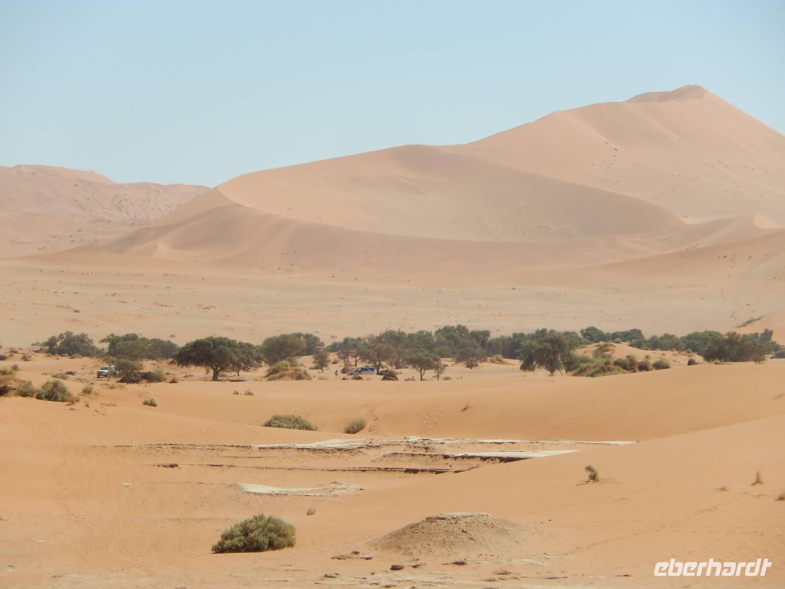 Um 5.15 Uhr, noch vor Sonnenaufgang, brechen wir heute Richtung Namib auf, denn zum Sonnenaufgang wollen wir bereits am Tor zum Namib-Naukluft-Park sein. Von hier sind es nur noch 45 Kilometer bis zur bekannten Düne 45, wo wir unsere Frühstückspakete auspacken und uns vor der Dünen-Besteigung stärken. Wir genießen die ersten wärmenden Sonnenstrahlen an diesem Tag und erklimmen hochmotiviert, immer auf dem Kamm entlang, die rund 170 Meter hohe Düne. Nach unten geht es dann flotten Schrittes. Die Luft hat sich nun schon sehr erwärmt und wir beeilen uns mit der Weiterfahrt, um noch vor der großen Hitze im Dead Vlei anzukommen. Wir fahren bis Kilometer 60, bevor wir von unserem Truck auf 4x4 Pickups umsteigen. Durch Tiefsand werden wir von den Jeeps rasant zum Ausgangspunkt für unseren kleinen Fußmarsch zum Dead Vlei gebracht. Die ausgetrocknete Pfanne mit den uralten Kameldornbäumen fasziniert uns. Hier entstehen so einige schöne Fotomotive. Im Hintergrund steht „Big Daddy", die mit ungefähr 350 Metern höchste Düne der Namib. Zurück per Jeep-Shuttle und weiter im Truck fahren wir zum Camp am Eingangstor, wo wir unsere Mittagspause einlegen. Heute gibt es Kartoffelsalat mit Fisch à la Lesley. Allen schmeckt es richtig gut. Gestärkt können wir nun in den Sesriem-Canyon hinabsteigen, welcher sich nur wenige Meter von unserem „Rastplatz" entfernt befindet. Diese Lanschaftsattraktion ist „Sechs Ochsenriemen", „ses rieme", tief oder besser gesagt 30 Meter tief und 3 Kilometer lang. Im Schatten der Felswände wandern wir ein Stück, bevor wir unsere Fahrt zur Namib Naukluft Lodge fortsetzen. An diesem Abend wird typisch afrikanisch gegrillt, ein sogenanntes Braai. Ein tolles Ambiente und schöner Tagesausklang.