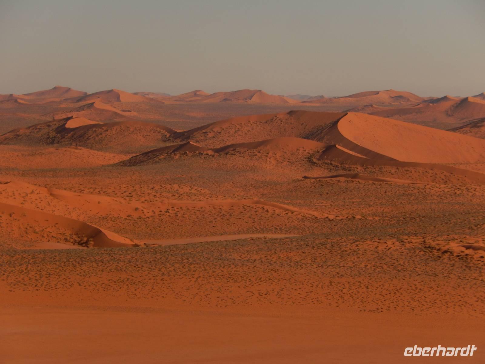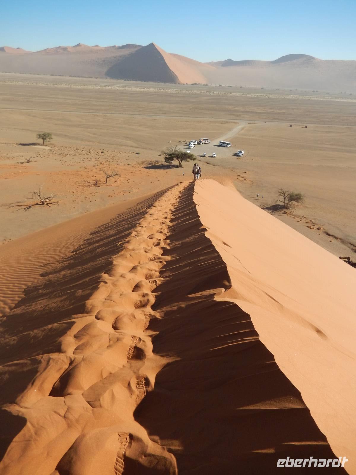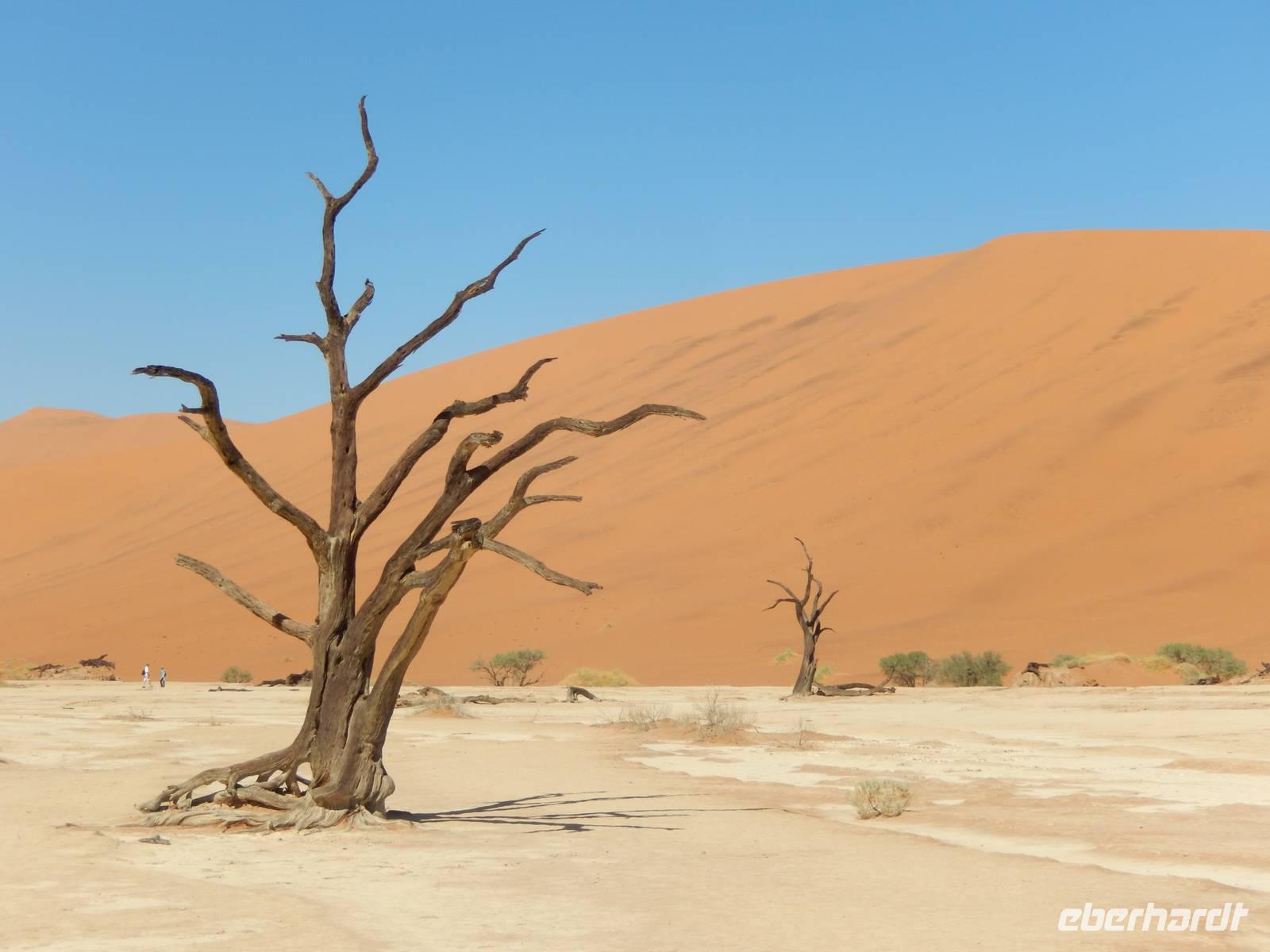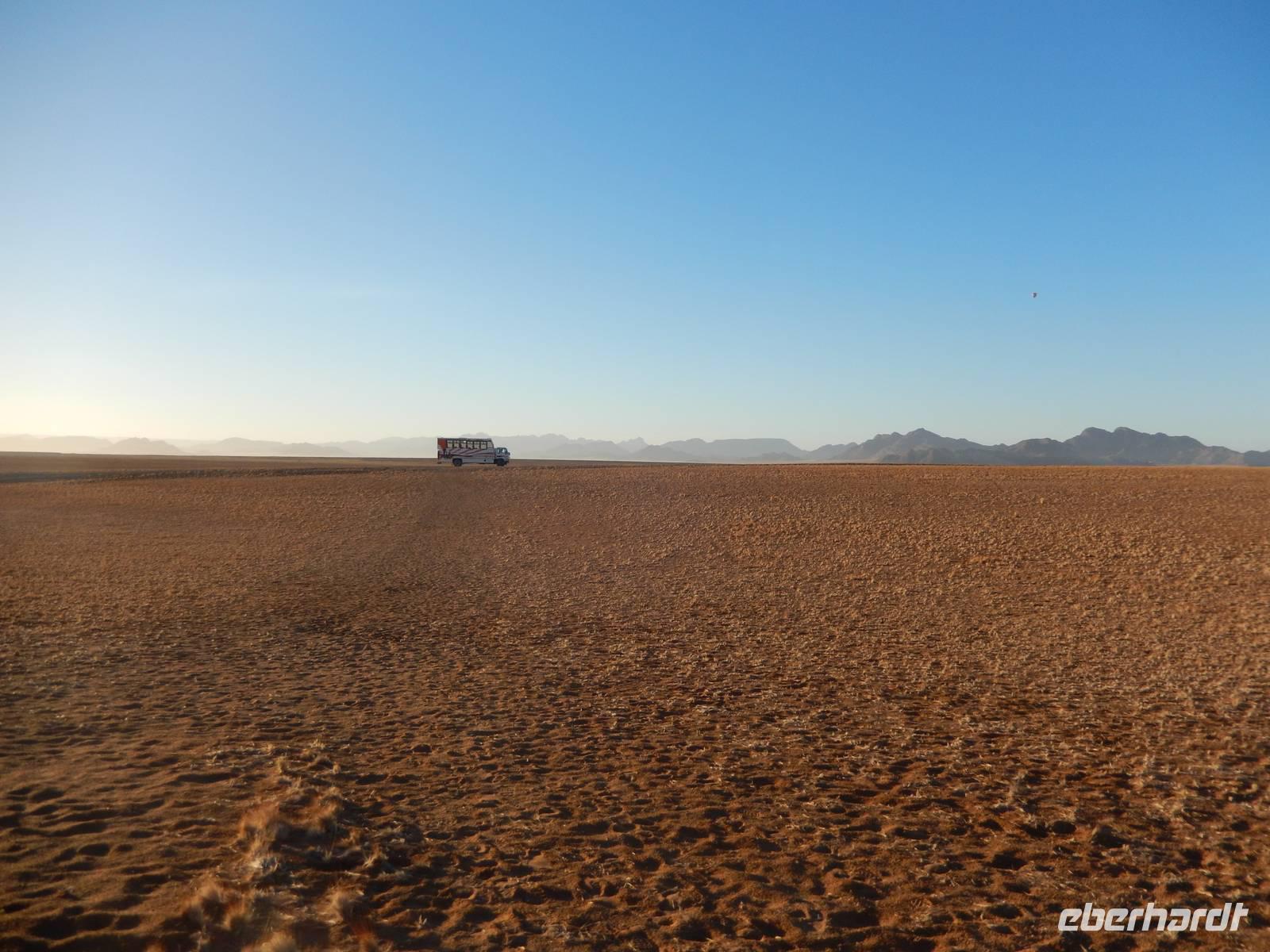 Um 5.15 Uhr, noch vor Sonnenaufgang, brechen wir heute Richtung Namib auf, denn zum Sonnenaufgang wollen wir bereits am Tor zum Namib-Naukluft-Park sein. Von hier sind es nur noch 45 Kilometer bis zur bekannten Düne 45, wo wir unsere Frühstückspakete auspacken und uns vor der Dünen-Besteigung stärken. Wir genießen die ersten wärmenden Sonnenstrahlen an diesem Tag und erklimmen hochmotiviert, immer auf dem Kamm entlang, die rund 170 Meter hohe Düne. Nach unten geht es dann flotten Schrittes. Die Luft hat sich nun schon sehr erwärmt und wir beeilen uns mit der Weiterfahrt, um noch vor der großen Hitze im Dead Vlei anzukommen. Wir fahren bis Kilometer 60, bevor wir von unserem Truck auf 4x4 Pickups umsteigen. Durch Tiefsand werden wir von den Jeeps rasant zum Ausgangspunkt für unseren kleinen Fußmarsch zum Dead Vlei gebracht. Die ausgetrocknete Pfanne mit den uralten Kameldornbäumen fasziniert uns. Hier entstehen so einige schöne Fotomotive. Im Hintergrund steht „Big Daddy", die mit ungefähr 350 Metern höchste Düne der Namib. Zurück per Jeep-Shuttle und weiter im Truck fahren wir zum Camp am Eingangstor, wo wir unsere Mittagspause einlegen. Heute gibt es Kartoffelsalat mit Fisch à la Lesley. Allen schmeckt es richtig gut. Gestärkt können wir nun in den Sesriem-Canyon hinabsteigen, welcher sich nur wenige Meter von unserem „Rastplatz" entfernt befindet. Diese Lanschaftsattraktion ist „Sechs Ochsenriemen", „ses rieme", tief oder besser gesagt 30 Meter tief und 3 Kilometer lang. Im Schatten der Felswände wandern wir ein Stück, bevor wir unsere Fahrt zur Namib Naukluft Lodge fortsetzen. An diesem Abend wird typisch afrikanisch gegrillt, ein sogenanntes Braai. Ein tolles Ambiente und schöner Tagesausklang.