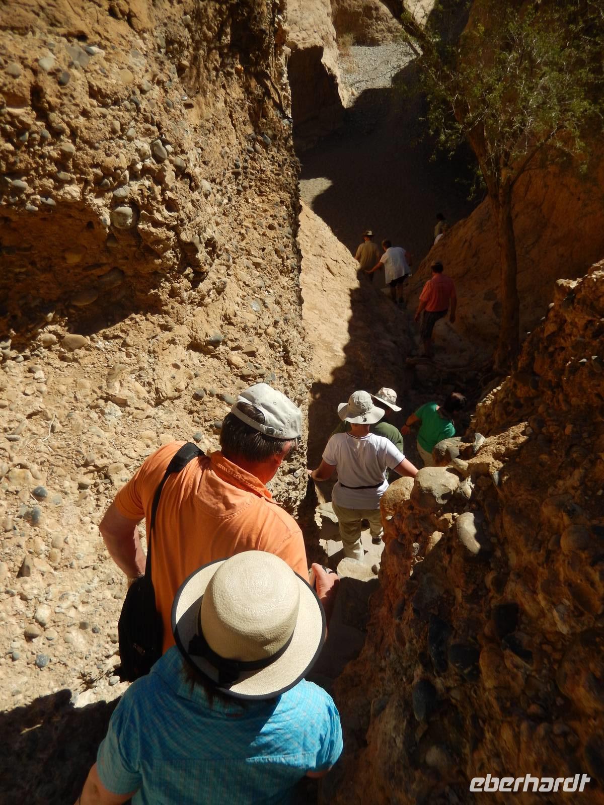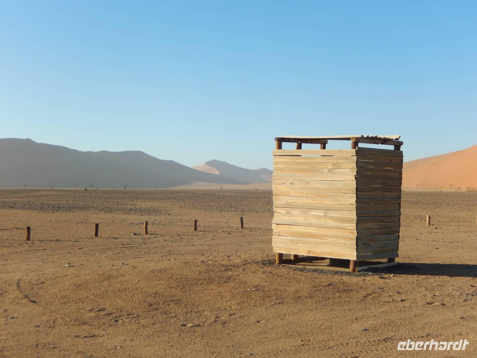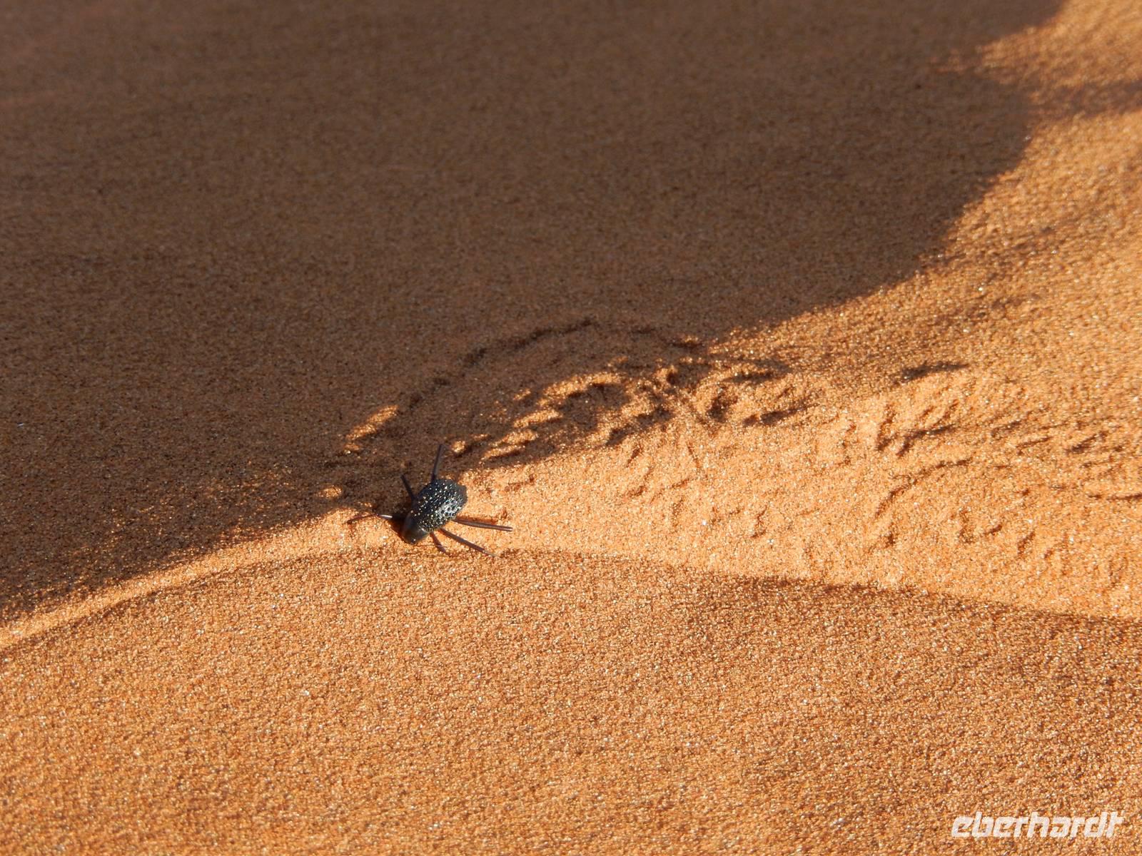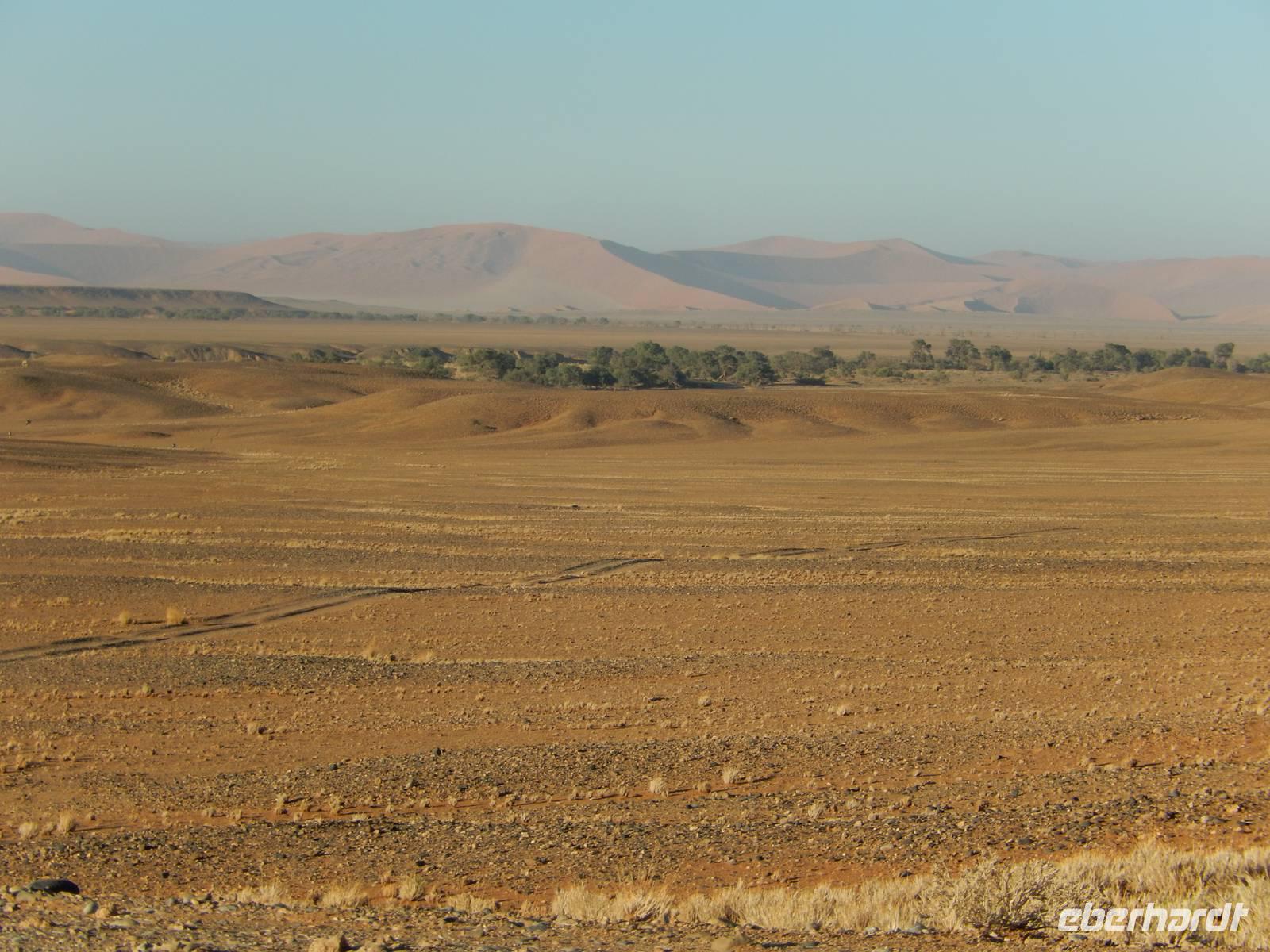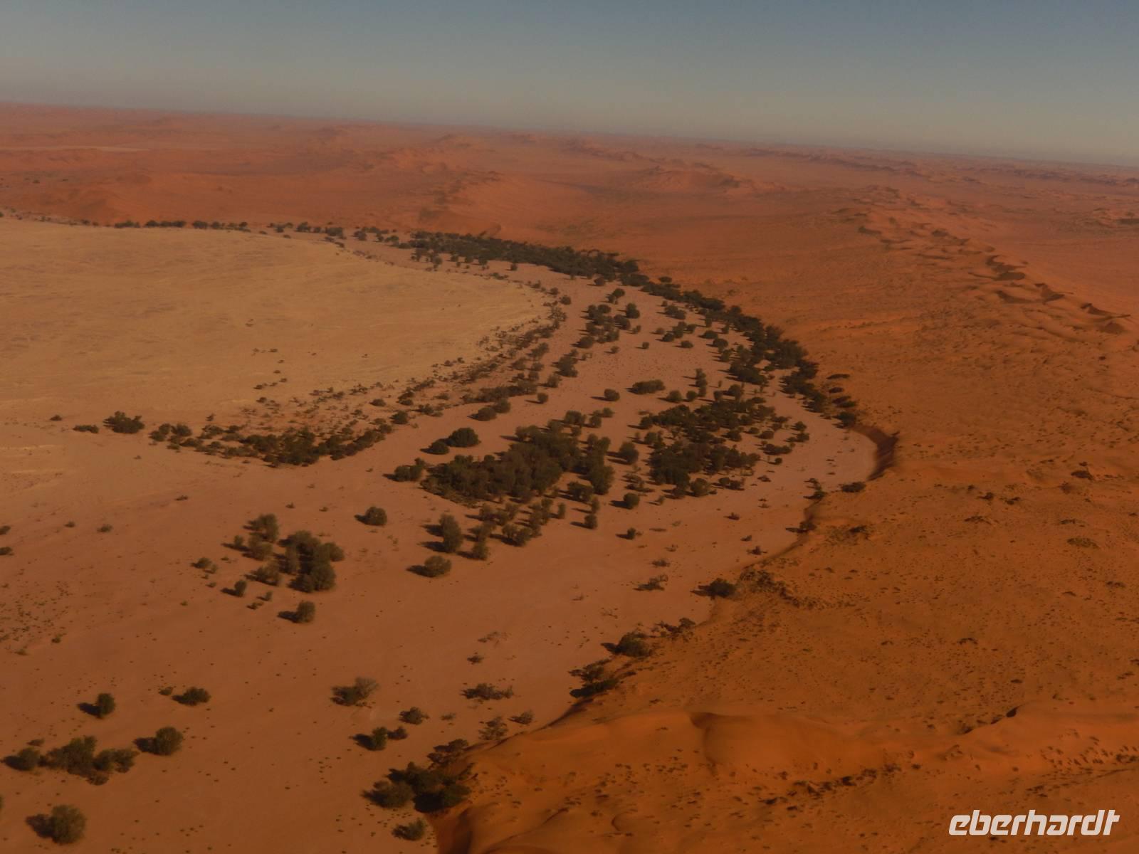 Um 5.15 Uhr, noch vor Sonnenaufgang, brechen wir heute Richtung Namib auf, denn zum Sonnenaufgang wollen wir bereits am Tor zum Namib-Naukluft-Park sein. Von hier sind es nur noch 45 Kilometer bis zur bekannten Düne 45, wo wir unsere Frühstückspakete auspacken und uns vor der Dünen-Besteigung stärken. Wir genießen die ersten wärmenden Sonnenstrahlen an diesem Tag und erklimmen hochmotiviert, immer auf dem Kamm entlang, die rund 170 Meter hohe Düne. Nach unten geht es dann flotten Schrittes. Die Luft hat sich nun schon sehr erwärmt und wir beeilen uns mit der Weiterfahrt, um noch vor der großen Hitze im Dead Vlei anzukommen. Wir fahren bis Kilometer 60, bevor wir von unserem Truck auf 4x4 Pickups umsteigen. Durch Tiefsand werden wir von den Jeeps rasant zum Ausgangspunkt für unseren kleinen Fußmarsch zum Dead Vlei gebracht. Die ausgetrocknete Pfanne mit den uralten Kameldornbäumen fasziniert uns. Hier entstehen so einige schöne Fotomotive. Im Hintergrund steht „Big Daddy", die mit ungefähr 350 Metern höchste Düne der Namib. Zurück per Jeep-Shuttle und weiter im Truck fahren wir zum Camp am Eingangstor, wo wir unsere Mittagspause einlegen. Heute gibt es Kartoffelsalat mit Fisch à la Lesley. Allen schmeckt es richtig gut. Gestärkt können wir nun in den Sesriem-Canyon hinabsteigen, welcher sich nur wenige Meter von unserem „Rastplatz" entfernt befindet. Diese Lanschaftsattraktion ist „Sechs Ochsenriemen", „ses rieme", tief oder besser gesagt 30 Meter tief und 3 Kilometer lang. Im Schatten der Felswände wandern wir ein Stück, bevor wir unsere Fahrt zur Namib Naukluft Lodge fortsetzen. An diesem Abend wird typisch afrikanisch gegrillt, ein sogenanntes Braai. Ein tolles Ambiente und schöner Tagesausklang.