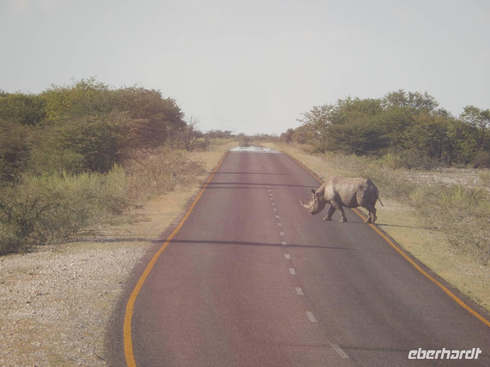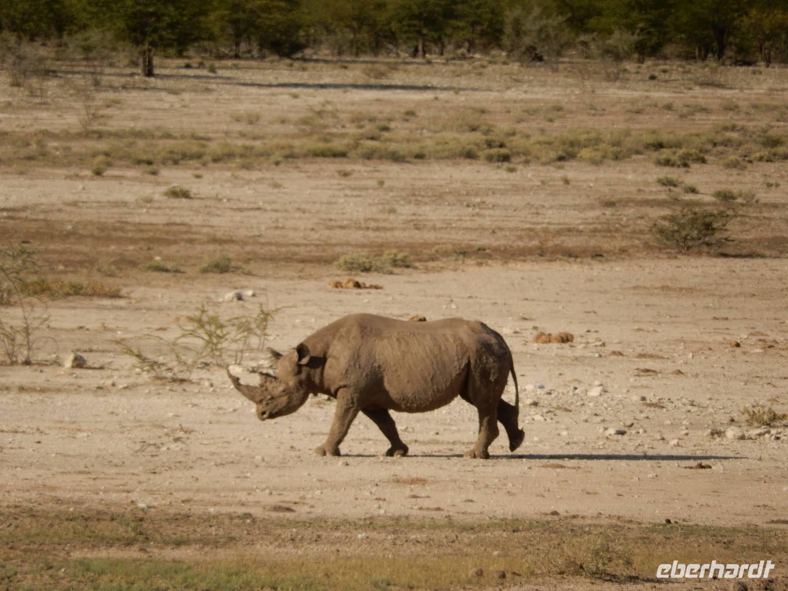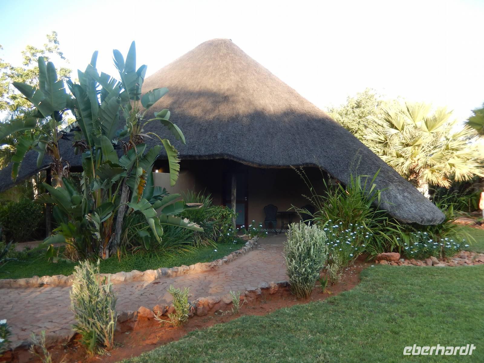 Auch an diesem Morgen brechen wir zeitig auf. Nach einer kurzen Starthilfe sind wir den Tieren wieder auf der Spur. Das erste Stück gleicht dem Vortag, bevor wir neues Terrain erkunden. Am Aussichtspunkt haben wir einen herrlichen Blick über die unendlich erscheinende 4731 km² große Etosha-Pfanne. Ein Foto und einmal Salz geleckt, schon geht es weiter. Was uns nun erwartet, ahnt noch keiner. „Leeus" schreit Lesley. Sadrag stellt den Truck in Beobachtungsposition und nun sehen wir sie: drei Löwinnen und ein Löwe. Etwas versteckt hinter Gestrüpp liegen sie unter einem Baum im Schatten. Sicherlich wittern sie die Giraffe und die Springböcke ganz in der Nähe, doch zum Aufstehen sind sie zu träge. Nach einer Weile setzen wir unsere Pirschfahrt fort. Lesley hat hinter uns einen Elefanten entdeckt. Sofort kehren wir um und sind zur richtigen Zeit unmittelbar neben dem Elefanten, als dieser die Straße überquert. Ein Ereignis jagt das nächste. Einem nahe gelegenen Wasserloch nähert sich ein Nashorn, mittlerweile haben wir übrigens 15 beobachten können. Nachdem es seinen Durst gestillt hat, nimmt es ein Bad und lässt sich überhaupt nicht von unserer Anwesenheit stören. Auf den letzten Kilometern bevor wir Etosha mit vielen unvergesslichen Eindrücken verlassen, beobachten wir einen Elefanten direkt am Straßenrand beim Verzehr einiger grüner Zweige. Nach einer reichlichen Stunde stehen wir vor dem Eingangstor der !Uris Safari Lodge. Doch noch haben wir unser Ziel nicht erreicht, denn weitere 14,5 Kilometer trennen uns vom Hauptgebäude, den Chalets und dem kühlen Bier. Zwischen Hauptgang und Nachtisch stellt sich uns der Lodge-Manager Freddy vor. Er gehört dem Stamm der Damara an. Er beherrscht deren Sprache mit den 5 Klicks, die er uns erklärt und schließlich in ein paar Sätzen präsentiert. Das Nachsprechen fällt uns allerdings sehr schwer.