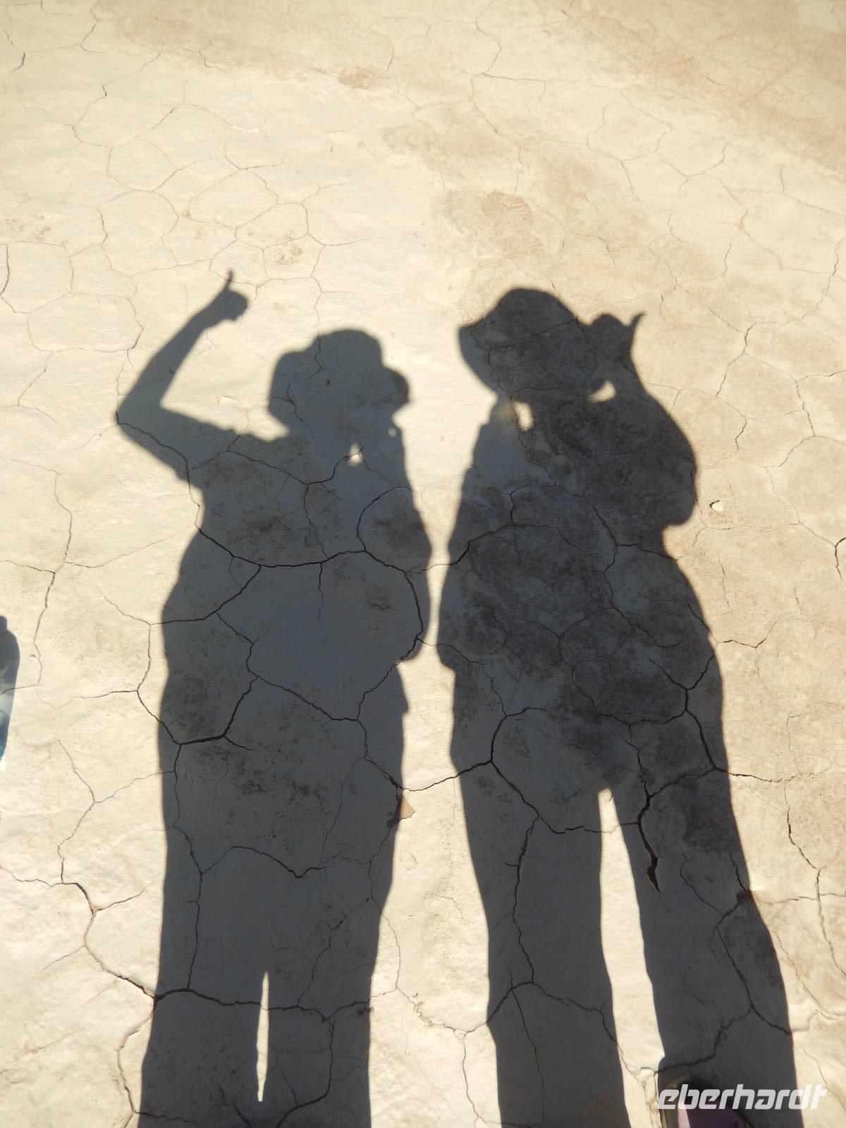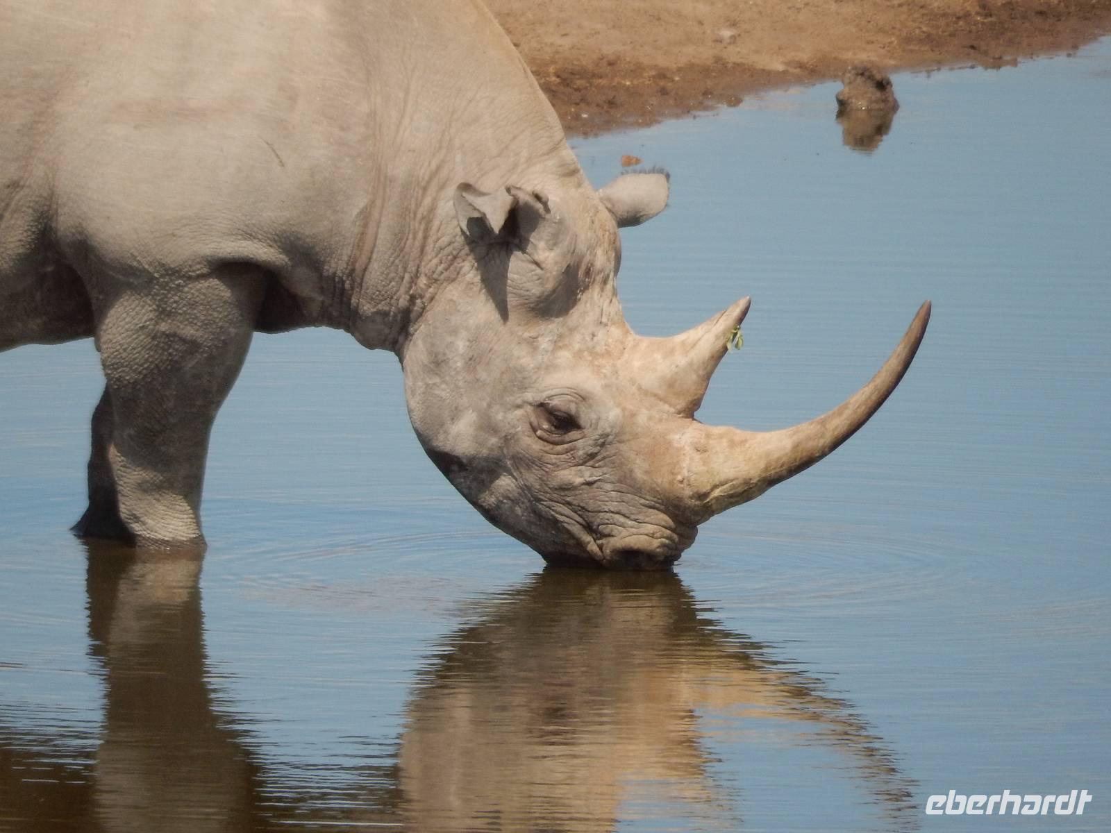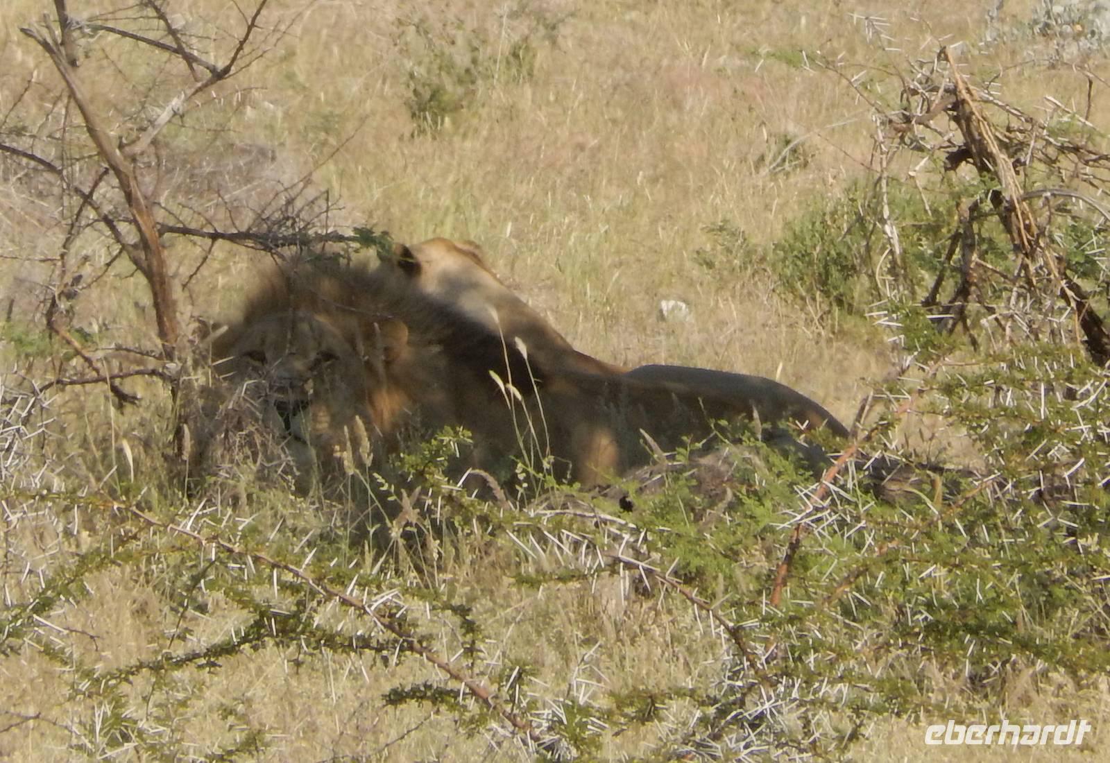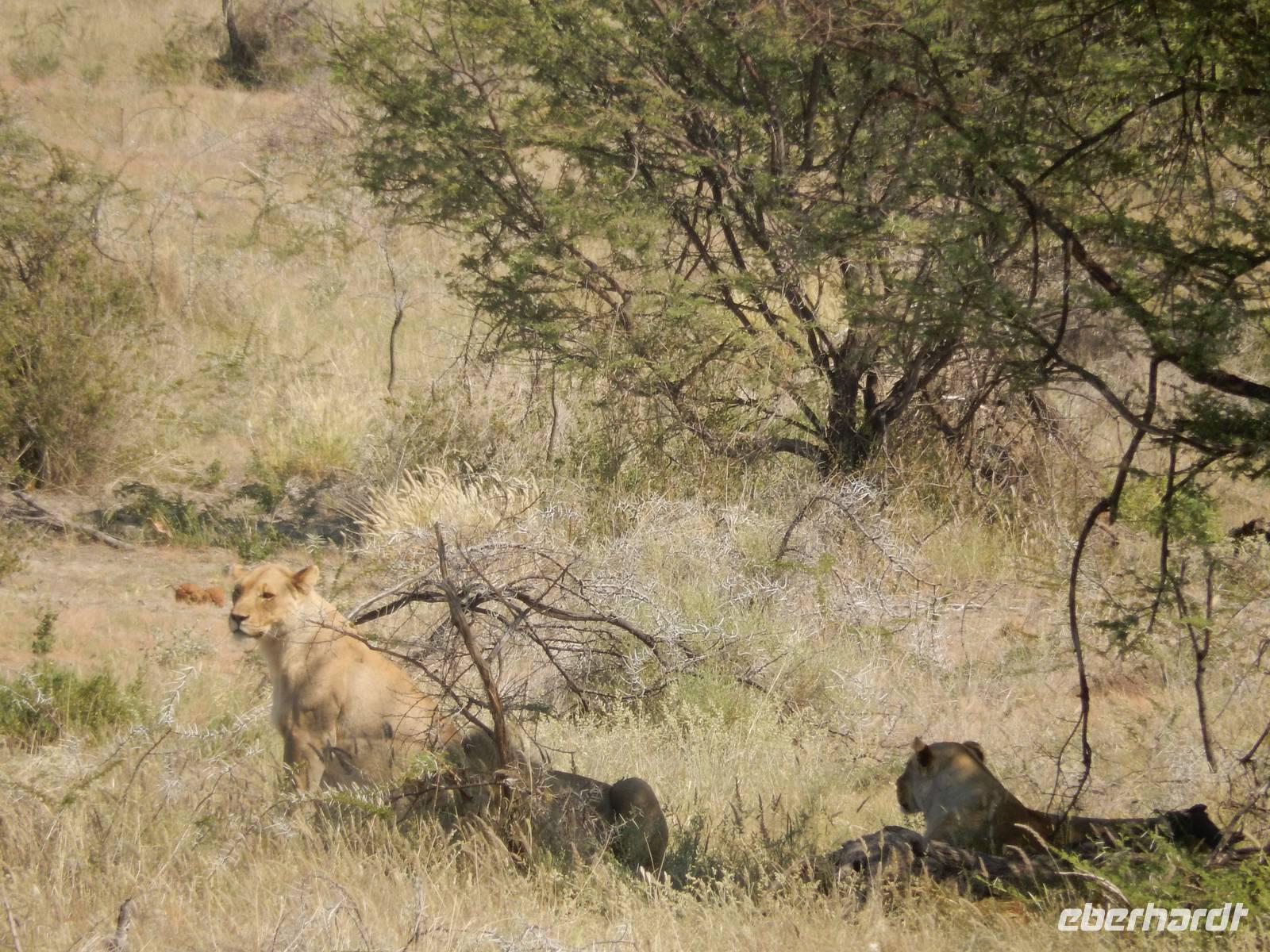 Auch an diesem Morgen brechen wir zeitig auf. Nach einer kurzen Starthilfe sind wir den Tieren wieder auf der Spur. Das erste Stück gleicht dem Vortag, bevor wir neues Terrain erkunden. Am Aussichtspunkt haben wir einen herrlichen Blick über die unendlich erscheinende 4731 km² große Etosha-Pfanne. Ein Foto und einmal Salz geleckt, schon geht es weiter. Was uns nun erwartet, ahnt noch keiner. „Leeus" schreit Lesley. Sadrag stellt den Truck in Beobachtungsposition und nun sehen wir sie: drei Löwinnen und ein Löwe. Etwas versteckt hinter Gestrüpp liegen sie unter einem Baum im Schatten. Sicherlich wittern sie die Giraffe und die Springböcke ganz in der Nähe, doch zum Aufstehen sind sie zu träge. Nach einer Weile setzen wir unsere Pirschfahrt fort. Lesley hat hinter uns einen Elefanten entdeckt. Sofort kehren wir um und sind zur richtigen Zeit unmittelbar neben dem Elefanten, als dieser die Straße überquert. Ein Ereignis jagt das nächste. Einem nahe gelegenen Wasserloch nähert sich ein Nashorn, mittlerweile haben wir übrigens 15 beobachten können. Nachdem es seinen Durst gestillt hat, nimmt es ein Bad und lässt sich überhaupt nicht von unserer Anwesenheit stören. Auf den letzten Kilometern bevor wir Etosha mit vielen unvergesslichen Eindrücken verlassen, beobachten wir einen Elefanten direkt am Straßenrand beim Verzehr einiger grüner Zweige. Nach einer reichlichen Stunde stehen wir vor dem Eingangstor der !Uris Safari Lodge. Doch noch haben wir unser Ziel nicht erreicht, denn weitere 14,5 Kilometer trennen uns vom Hauptgebäude, den Chalets und dem kühlen Bier. Zwischen Hauptgang und Nachtisch stellt sich uns der Lodge-Manager Freddy vor. Er gehört dem Stamm der Damara an. Er beherrscht deren Sprache mit den 5 Klicks, die er uns erklärt und schließlich in ein paar Sätzen präsentiert. Das Nachsprechen fällt uns allerdings sehr schwer.