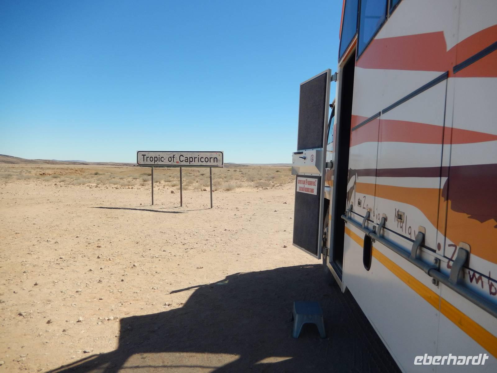 Auf unserem Weg nach Swakopmund, der wohl deutschesten Stadt Namibias, stoppen wir in Solitaire. Am Eingang dieser kleinen Ortschaft mit derzeit 92 Einwohnern, begrüßen uns Autowracks, die fast künstlerisch zusammengestellt wirken. Sehr bekannt ist der Apfelkuchen in Solitaire, der natürlich verkostet werden muss. Noch vor dem Gaub-Pass überqueren wir den Wendekreis des Steinbocks, den südlichen Wendekreis oder auch bezeichnet als Tropic of Capricorn, wo wir einen Fotostopp einlegen. Die Überschreitung wird mit Amarula und einer Urkunde bestätigt. Nach dem Kuiseb-Pass sehen wir von weitem eine der Höhlen der zwei Geologen Henno Martin und Hermann Korn, die sich gegen Ende des 2. Weltkrieges aus Furcht vor der drohenden Internierung als „feindliche Ausländer" hier in der Namib mehr als zwei Jahre versteckt hielten. Nach minutenlanger trostloser Landschaft erreichen wir die Küstenstadt Walvis Bay mit dem größten Seehafen Namibias. Die Dünen der Namib reichen hier bis an die Stadtgrenze, sodass Ostwinde den feinen Wüstensand bis in die Häuser wehen. In Swakopmund angekommen, sehen wir auf einer kurzen Orientierungsfahrt die wichtigsten Sehenswürdigkeiten, die wir nach dem Check-In im Hotel Europahof und einer kurzen Pause noch einmal ausführlich zu Fuß entdecken. Die vielen Informationen und Eindrücke machen durstig und so rücken wir im Brauhaus zum Verarbeiten des Gesehenen ein, bevor wir unser Abendessen in Kücki's Pub zu uns nehmen.
