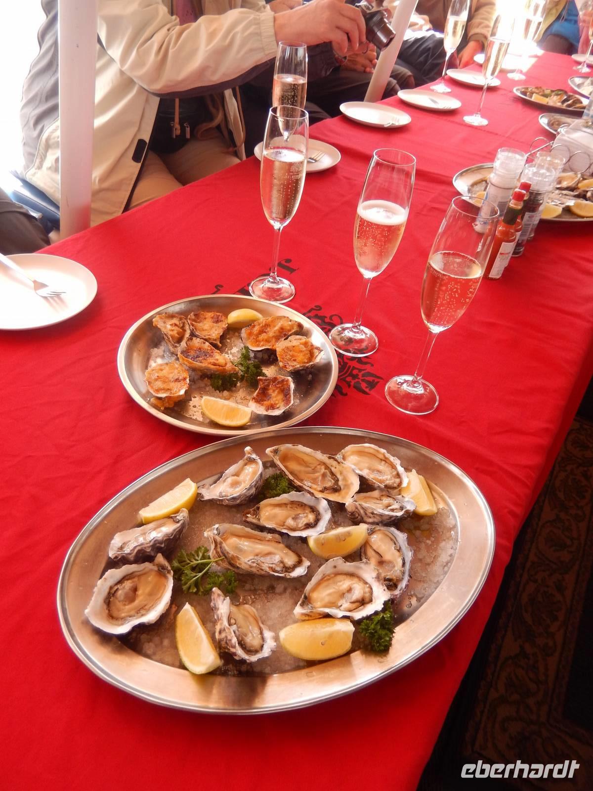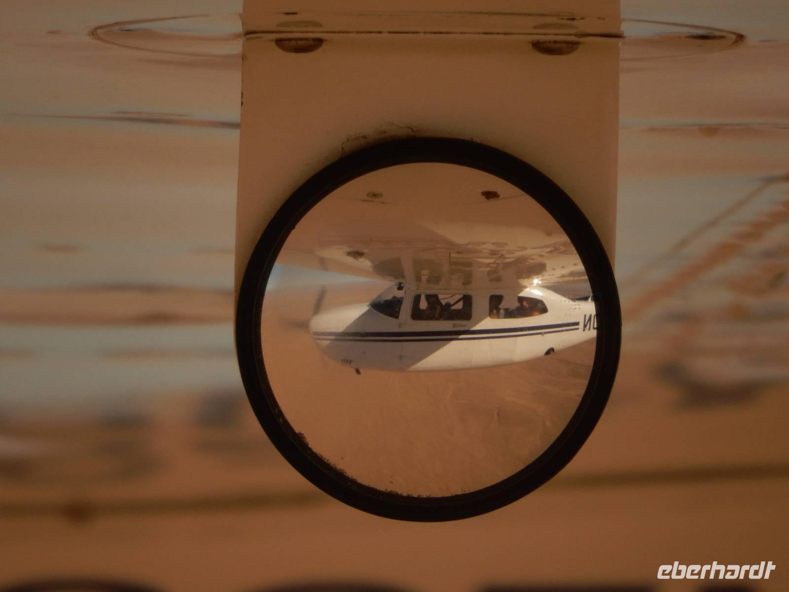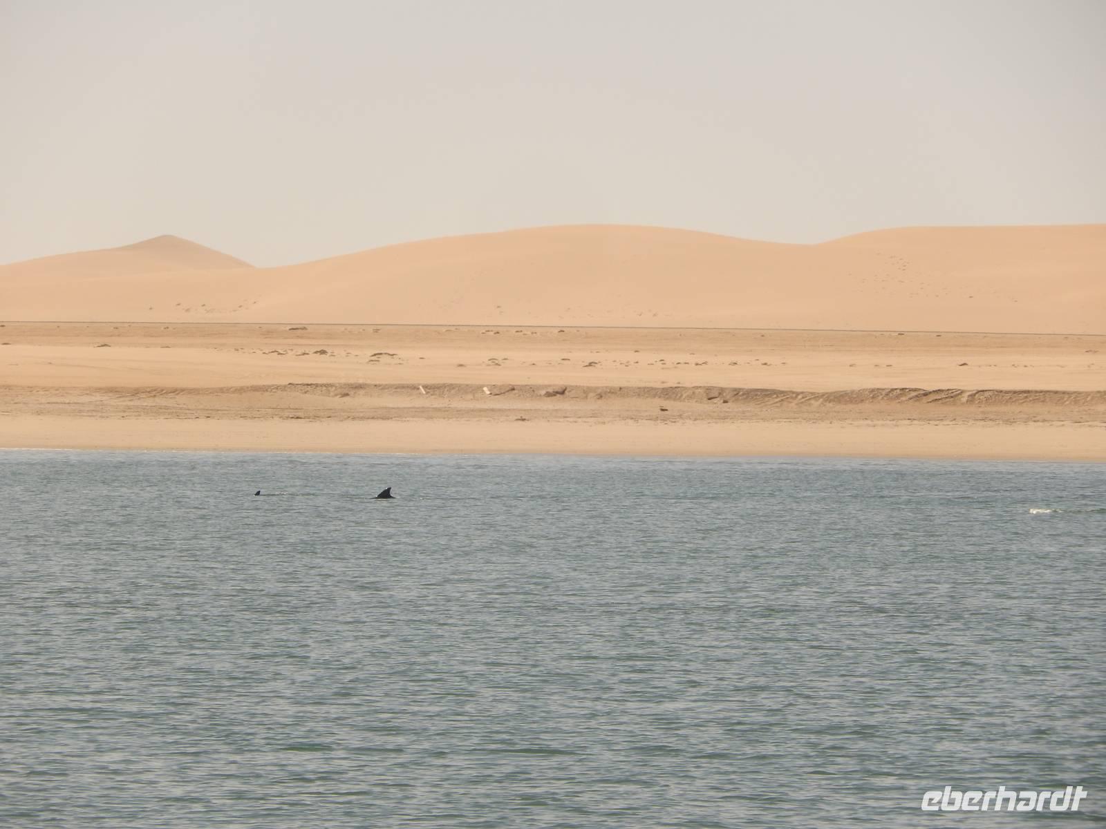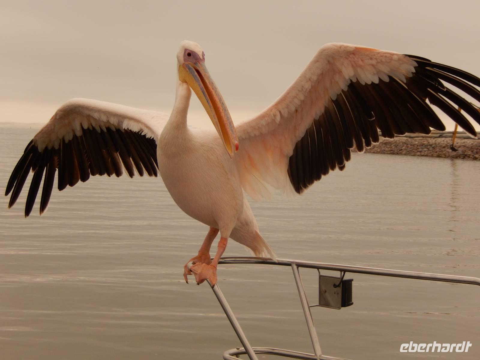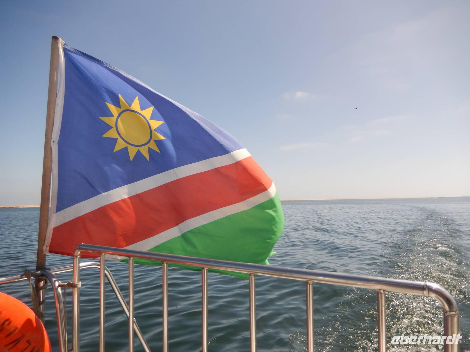 An diesem Vormittag erleben wir Namibia vom Wasser aus. Vom Hafen in Walvis Bay aus fahren wir mit einem Katamaran hinaus auf den atlantischen Ozean. Zu Gast an Bord sind Robbe und Pelikan. Ein lustiges Schauspiel. Sandra unterhält uns prächtig mit interessanten Informationen und ihren schlagfertigen Kommentaren. Auch kulinarisch lassen wir es uns gut gehen. Neben Kaffee, Bier, Sekt und/oder Sherry sowie kleinen Schnittchen, Kalamaris, und anderen Fischhappen gibt es namibische Austern, für „Anfänger" und für „Fortgeschrittene". Wir sehen an diesem Vormittag jede Menge Pelikane, Kormorane und Flamingos, mehrere Robbenkolonien, einen Mondfisch und sogar Delfine in der Ferne. Ein herrlicher und vor allem lustiger Vormittag! Der Nachmittag steht uns zur freien Verfügung. Während ein Teil der Gruppe bummeln geht, Postkarten schreibt oder sich einfach nur entspannt, entschließt sich der andere Teil zu einem zweieinhalbstündigen Rundflug über die Namib, den Kuiseb-Rivier, Sossusvlei und den Küstenstreifen. Vor allem hier bekommen wir einen Hauch von Ahnung über die Weite des Landes. Im Restaurant auf der Jetty, der beliebten Seebrücke von Swakopmund, stoßen wir mit einem Glas Sekt an und lassen den Tag mit einem fischigen Abendessen ausklingen.