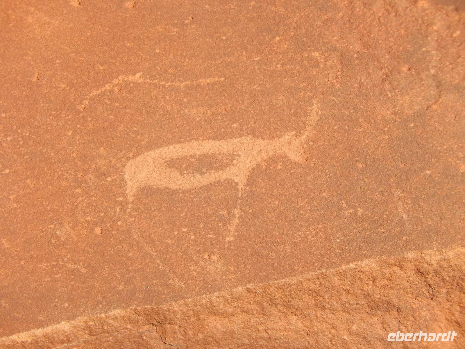 Am Morgen reisen wir weiter Richtung Norden. Doch nur wenige Kilometer nach dem Ortsausgang von Omaruru haben wir eine Autopanne. Es wird geprüft, ob vor Ort der Schaden behoben werden kann. Leider geht es nicht so schnell, sodass wir voerst zur Lodge zurückgebracht werden. Während Lesley und Sadrag sich um den Truck kümmern, bummeln wir durch Omaruru und können gleich noch ein paar Erledigungen machen. Wir begegnen zahlreichen Herero-Frauen mit ihren viktorianischen Trachten und der an Rinderhörner erinnernden typischen Kopfbedeckung. Mit einer dreistündigen Verzögerung können wir unsere Reise fortsetzen. Ein Unglück kommt selten allein. Nur zwei Stunden später platzt ein Reifen. Während unsere zwei tatkräftigen Männer den Reifen wechseln, machen wir Mittagspause im Schatten eines Mopani-Baums. Es gibt Nudelsalat mit Thunfisch, Oliven und Erbsen. Obwohl wir Zeitverzug haben, können wir unser Programm wie geplant durchführen: Willkommen in Twyfelfontein. Auf einem 45minütigen Rundgang werden uns die berühmten Felsgravuren, die vor 2000-6000 Jahren entstanden, gezeigt. Man erkennt die Darstellungen recht gut: Giraffen, Löwen, Elefanten, Oryxe, Fußabdrücke diverser Tiere und Wasserquellen. Sehr beeindruckend. Nach Sonnenuntergang erreichen wir die Damara Mopane Lodge für diese Nacht in der Nähe von Khorixas, wo ein kühles Bier auf uns wartet.