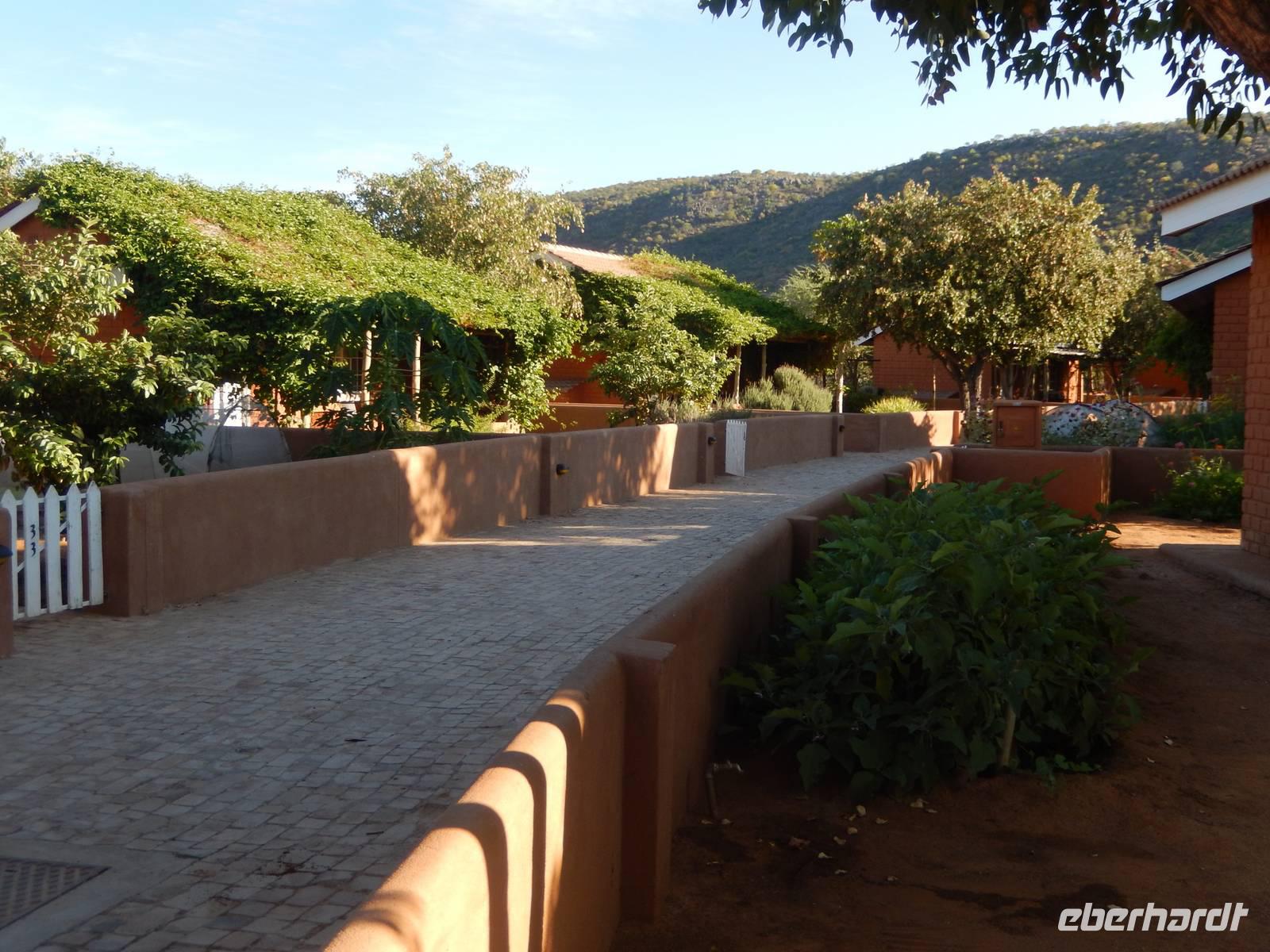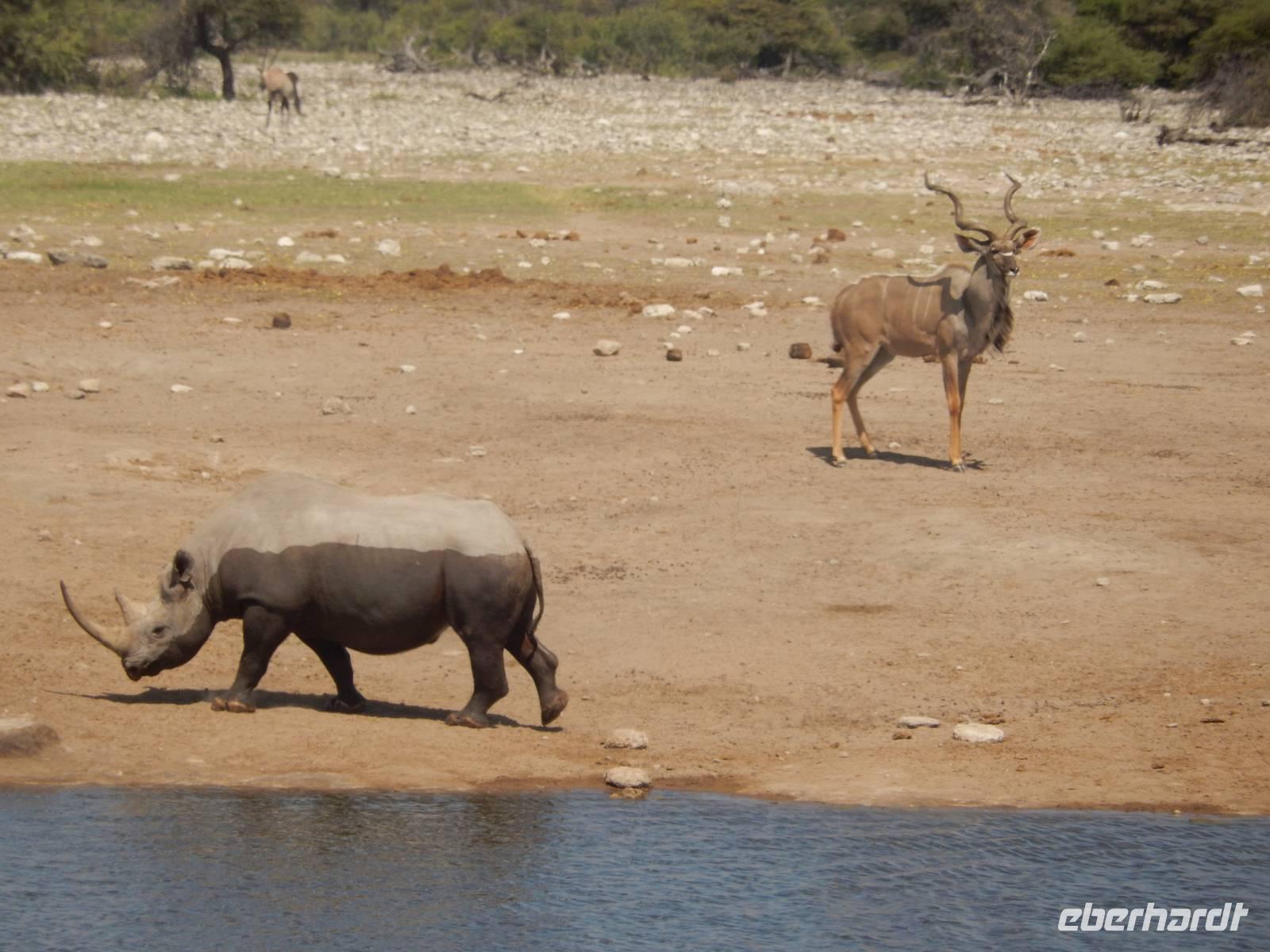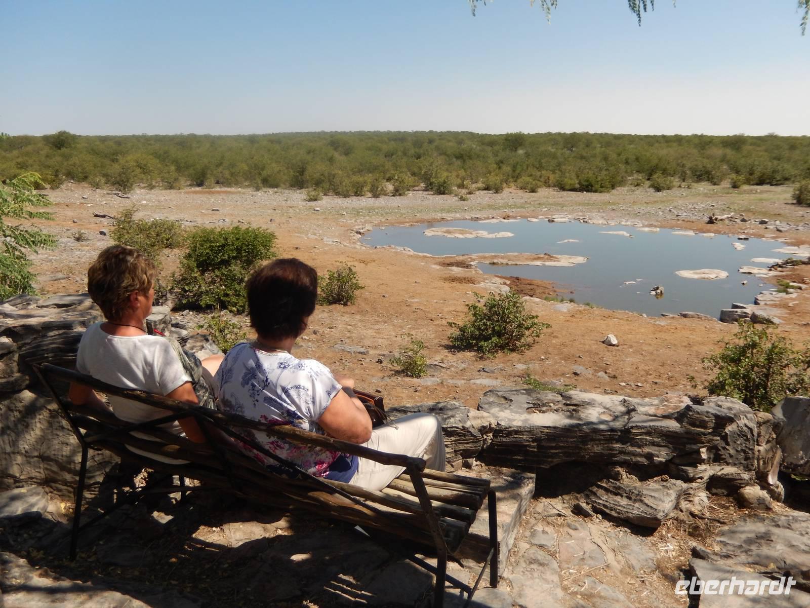 Da wir am gestrigen Abend erst im Dunkeln die Lodge erreichten, bemerken wir erst heute Morgen unsere reich mit Gemüse und Blumen bepflanzten Vorgärten. Möhren, Salat, Rüben, Papaya und Co. werden hier selbst angebaut und für die Gäste frisch zubereitet. In aller Ruhe können wir das Gelände für uns genießen, da wir erst etwas später weiterziehen und die anderen Gäste bereits abgereist sind. Dann heißt es auch für uns Abschied nehmen und weiter geht's auf der Teerstraße nach Outjo, der letzte Ort vor dem noch ca. 100 Kilometer entfernten Etosha Nationalpark. Nachdem wir hier noch ein paar Souvenirs, Snacks und Getränke gekauft und unsere Mittagspause im grünen schattigen Hinterhof des „Farm House" genossen haben, heißt unser Ziel Okaukuejo Restcamp, eins der fünf Resorts mitten im Nationalpark. Von Sonnenaufgang bis -untergang dürfen die Camps für Erkundungsfahrten verlassen werden. Heute Abend verlassen wir das Resorts aber nicht mehr, was auch nicht nötig ist, um Tiere zu beobachten. Denn am Resort eigenen Wasserloch stillen die Tiere ihren Durst und lassen sich von uns in sicherer Entfernung nicht stören. Da heute auch unser „Reise-Bergfest" ist, genießen wir das Spektakel zu Sonnenuntergang mit Amarula und anderen Leckereien. Giraffen, Spitzmaulnashörner und Schakale beobachten wir vor dem Abendessen und auch nach dem Essen lassen wir es uns nicht nehmen, dem Wasserloch noch einmal einen Besuch abzustatten und erleben Nashörner mit ihren Kindern. Faszinierend!