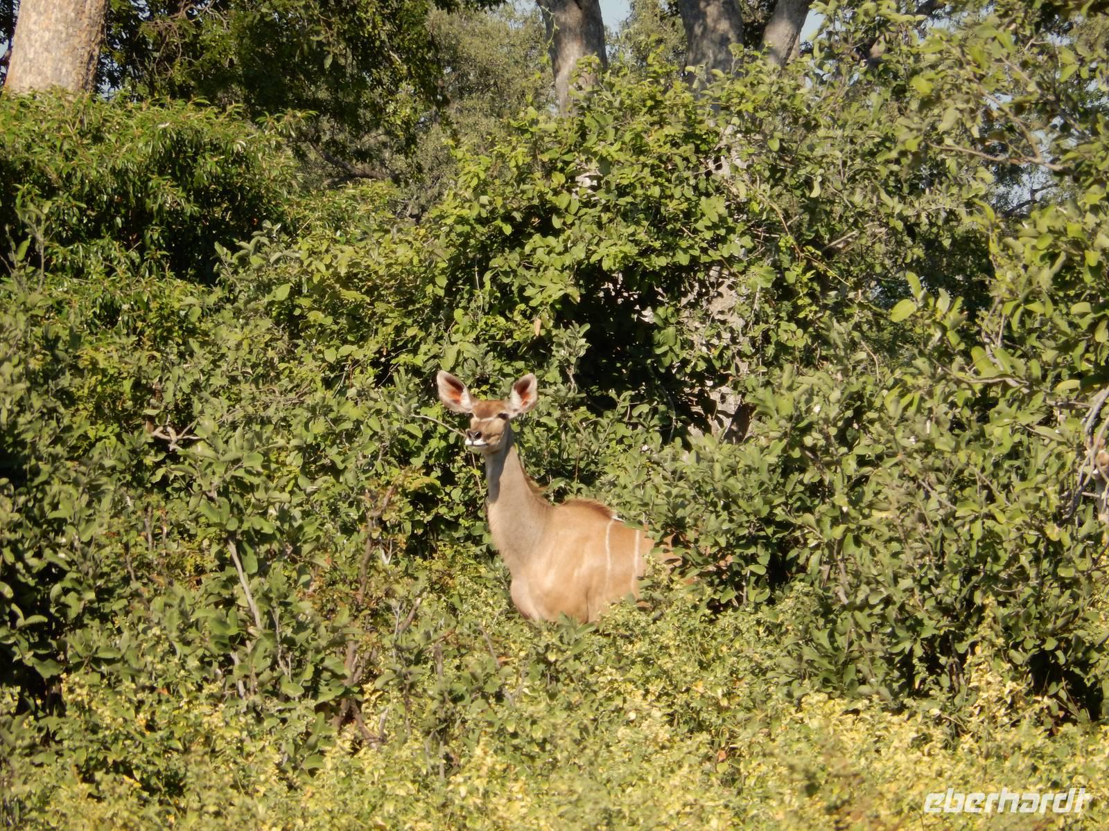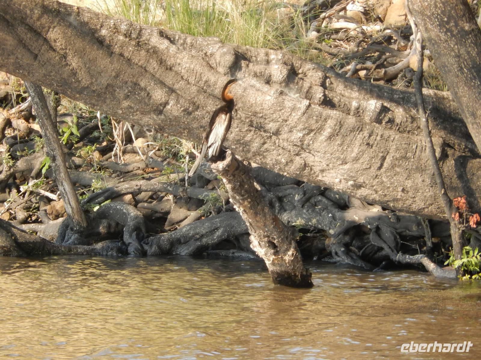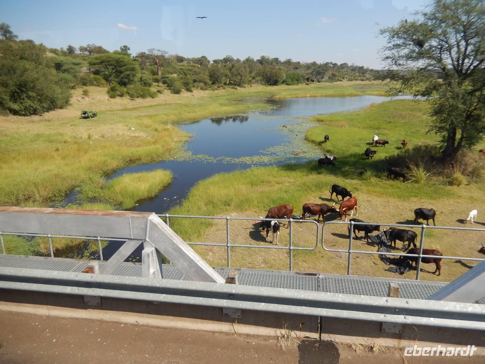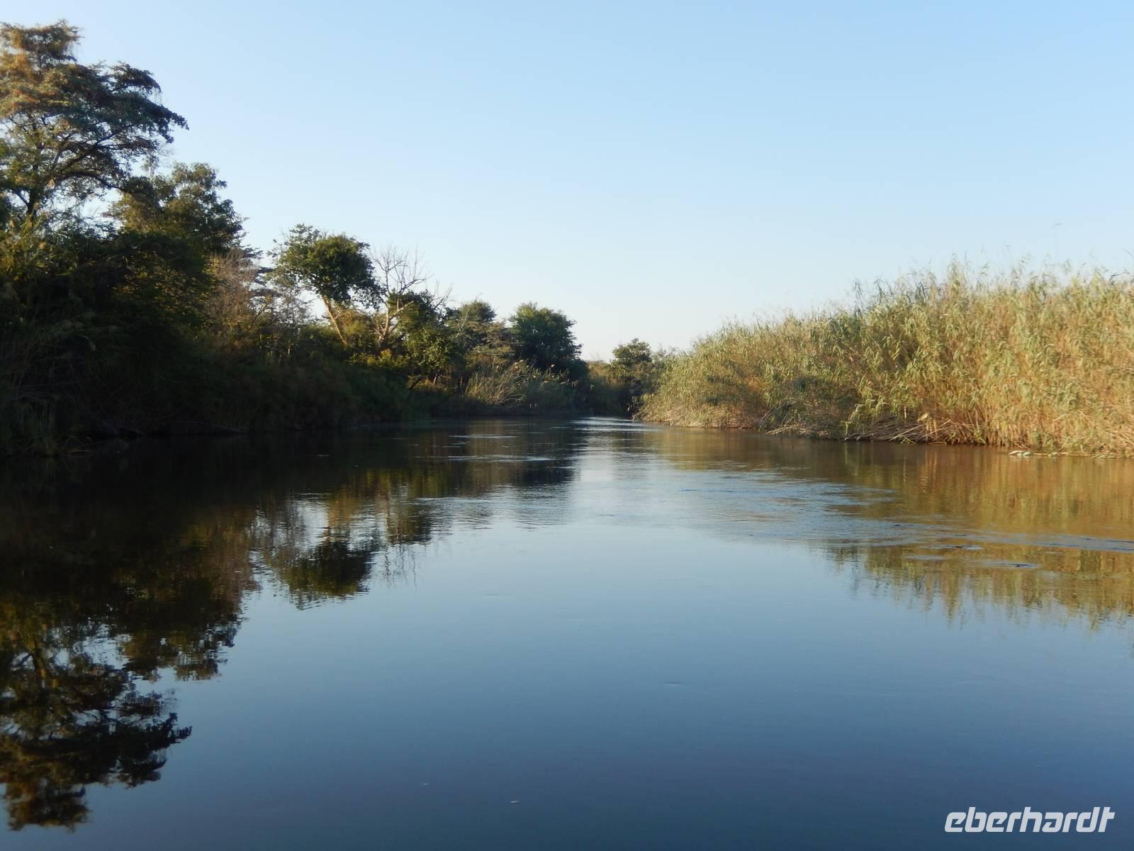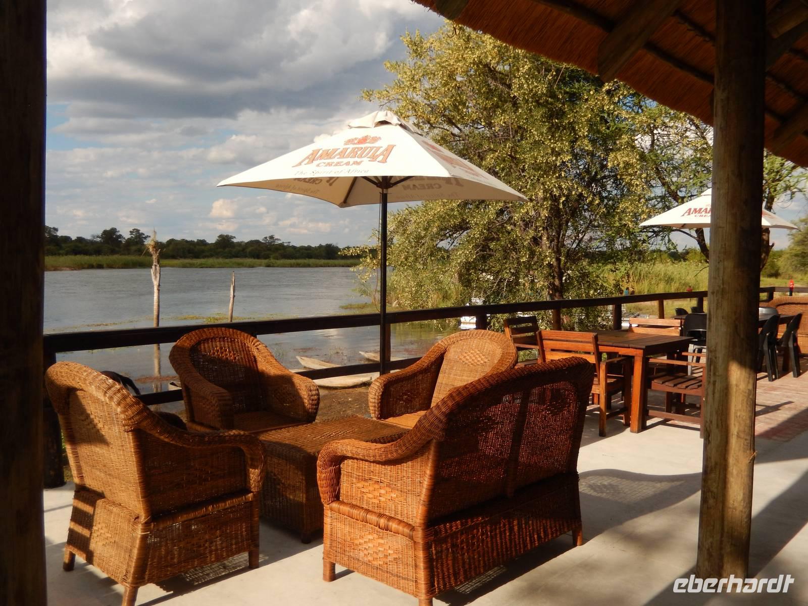 Obwohl wir Namibia noch nicht verlassen, werden vor Fahrtantritt die Uhren eine Stunde vorgestellt. Der Caprivi-Streifen, der letztes Jahr in die drei Regionen West-Kavango, Ost-Kavango und Sambesi-Region umbenannt wurde, beteiligt sich nicht am Wechsel von Winter- und Sommerzeit. Viele San-Wohnsiedlungen reihen sich in Abständen auf dem 430 Kilometer langen Landstrich aneinander. Es gibt nur eine Straße und die führt immer geradeaus. Dennoch erlauben wir uns, zwei an einem Rastplatz verweilenden Radfahrer (!) zu fragen, ob dies der Weg nach Windhoek wäre. Hilfsbereit erklären sie, dass wir seit circa 200 Kilometern in die falsche Richtung fahren und holen ihre Landkarte heraus. Natürlich wissen wir, wo Windhoek liegt und klären den Spaß auf. Als Wiedergutmachung laden wir die beiden Schweizer, die, wie sich herausstellt, mit dem Fahrrad um die Welt fahren, zum Mittag ein. Nach dieser sehr interessanten Bekanntschaft setzen wir unsere Fahrt fort. Minutenlang kommt uns kein Fahrzeug entgegen, auch Tiere sehen wir keine. Doch mit Musik und Lesleys Informationen vergeht die Fahrtzeit recht schnell. Schließlich biegen wir in Kongola rechts von der Hauptstraße ab und nähern uns unserer Lodge für die nächsten zwei Nächte. Die Anfahrt ist sehr holprig, Schlaglöcher bringen den Wagen in riskante Schieflagen. Doch heil erreichen wir die Lodge Namushasha, welche wunderschön am Kwando-Fluss gelegen ist.