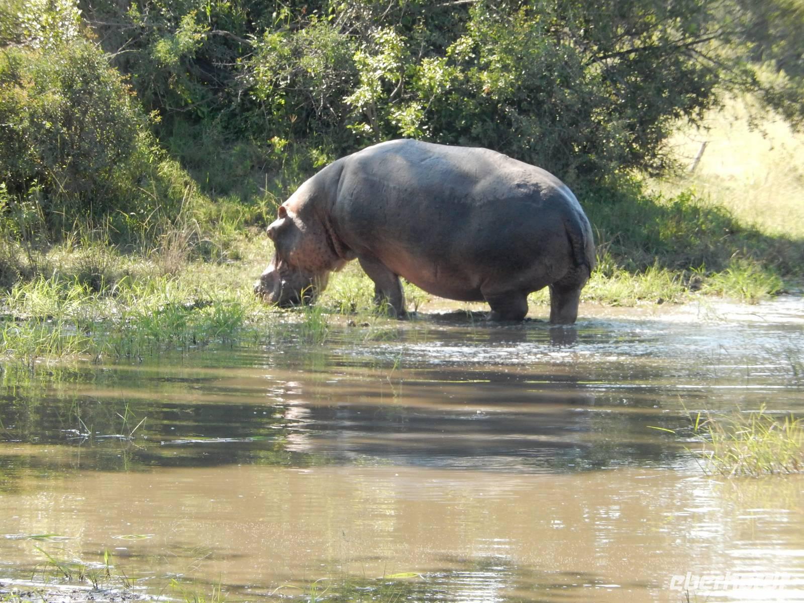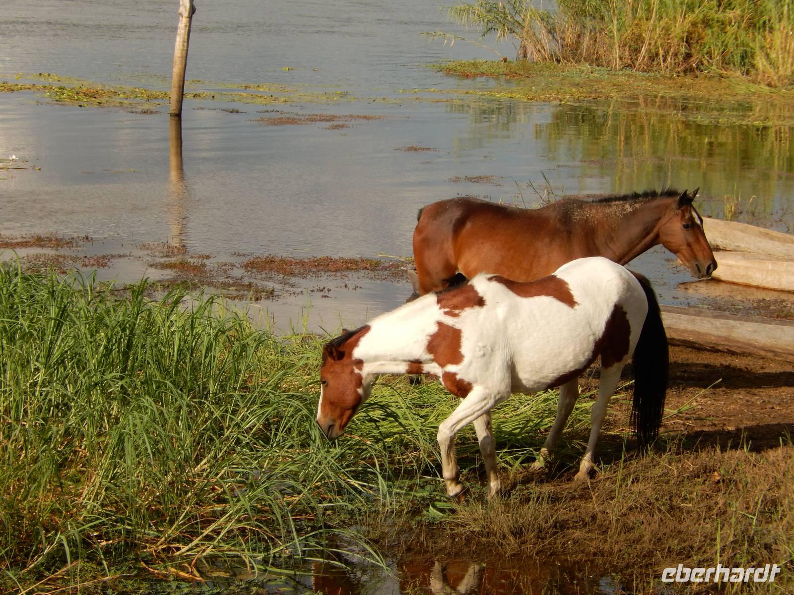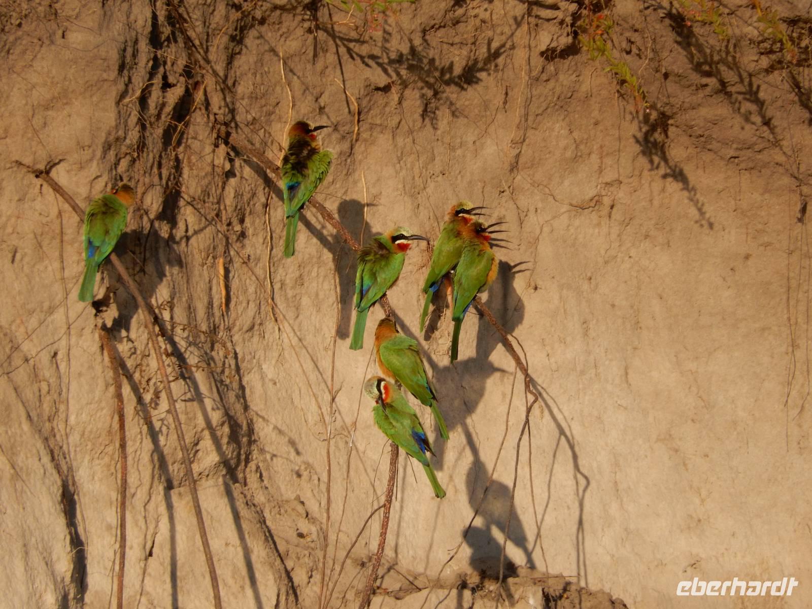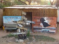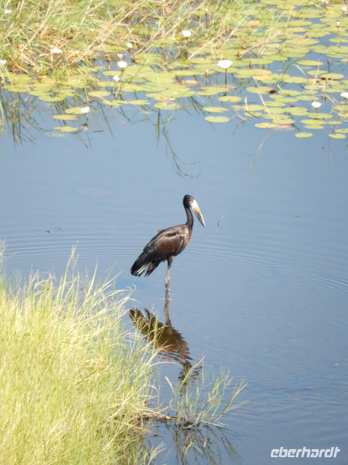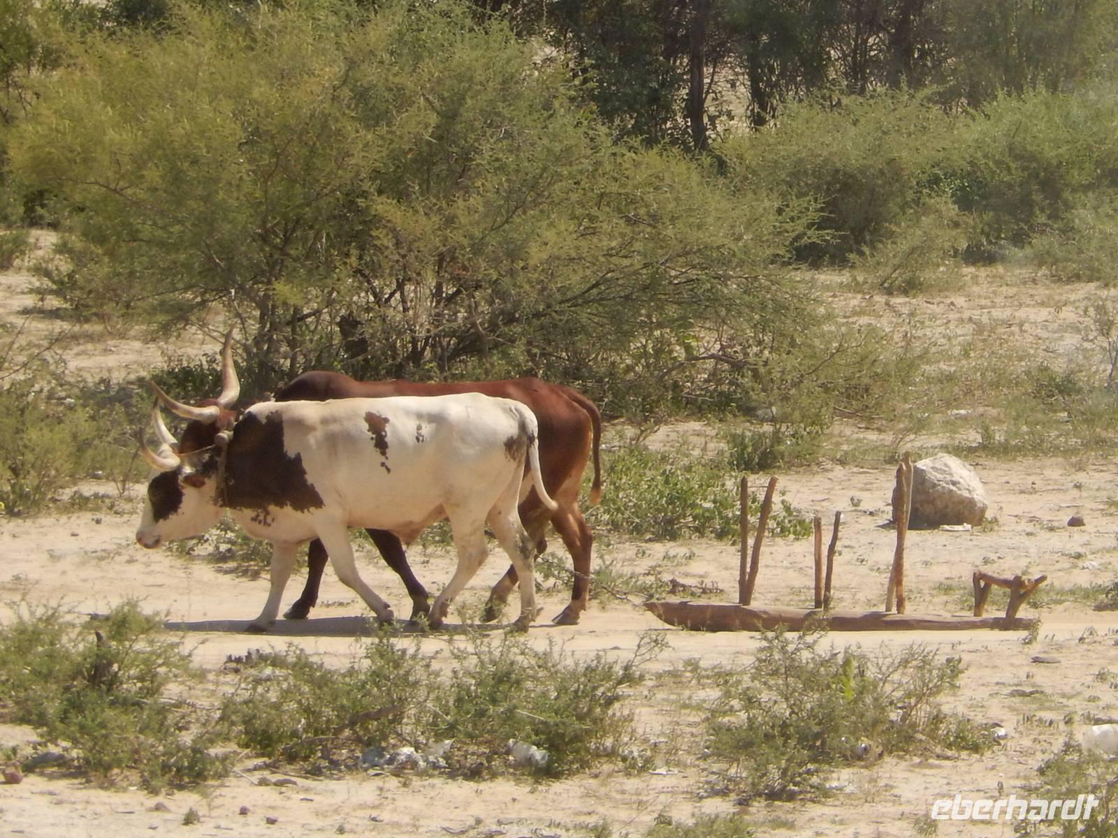 Obwohl wir Namibia noch nicht verlassen, werden vor Fahrtantritt die Uhren eine Stunde vorgestellt. Der Caprivi-Streifen, der letztes Jahr in die drei Regionen West-Kavango, Ost-Kavango und Sambesi-Region umbenannt wurde, beteiligt sich nicht am Wechsel von Winter- und Sommerzeit. Viele San-Wohnsiedlungen reihen sich in Abständen auf dem 430 Kilometer langen Landstrich aneinander. Es gibt nur eine Straße und die führt immer geradeaus. Dennoch erlauben wir uns, zwei an einem Rastplatz verweilenden Radfahrer (!) zu fragen, ob dies der Weg nach Windhoek wäre. Hilfsbereit erklären sie, dass wir seit circa 200 Kilometern in die falsche Richtung fahren und holen ihre Landkarte heraus. Natürlich wissen wir, wo Windhoek liegt und klären den Spaß auf. Als Wiedergutmachung laden wir die beiden Schweizer, die, wie sich herausstellt, mit dem Fahrrad um die Welt fahren, zum Mittag ein. Nach dieser sehr interessanten Bekanntschaft setzen wir unsere Fahrt fort. Minutenlang kommt uns kein Fahrzeug entgegen, auch Tiere sehen wir keine. Doch mit Musik und Lesleys Informationen vergeht die Fahrtzeit recht schnell. Schließlich biegen wir in Kongola rechts von der Hauptstraße ab und nähern uns unserer Lodge für die nächsten zwei Nächte. Die Anfahrt ist sehr holprig, Schlaglöcher bringen den Wagen in riskante Schieflagen. Doch heil erreichen wir die Lodge Namushasha, welche wunderschön am Kwando-Fluss gelegen ist.