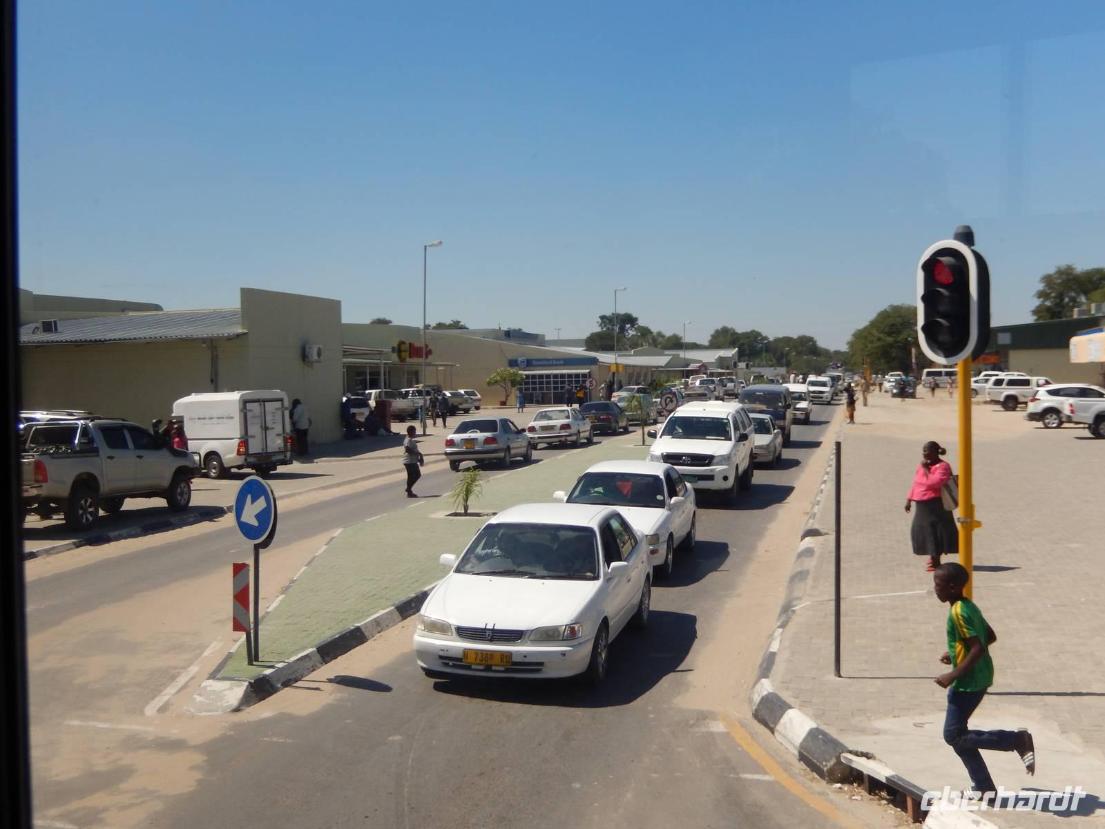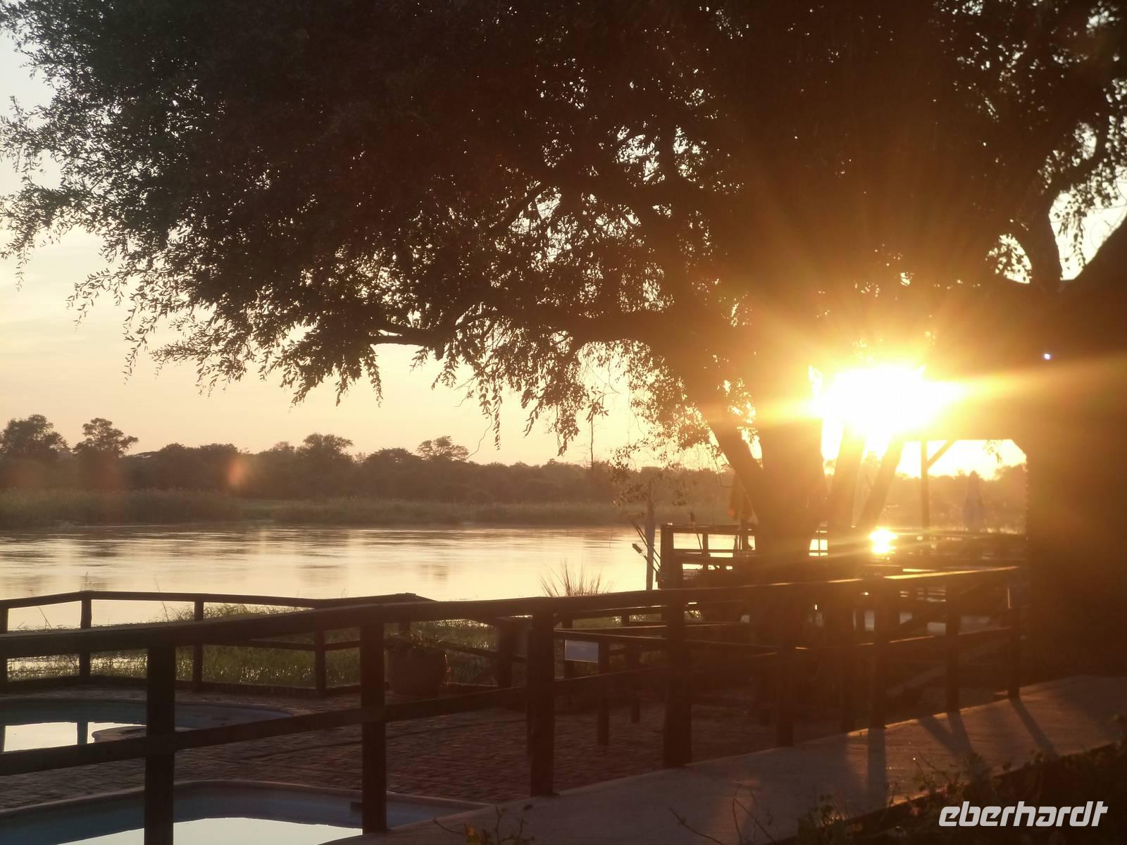Wir sind auf dem Weg in Richtung Caprivi-Streifen. Bevor wir unsere Tagesetappe beginnen, wird in Tsumeb getankt. Wir nutzen die Zeit, um die Hauptstraße einmal hin und wieder zurück zu laufen. Tsumeb heißt aus der Sprache der San übersetzt „ein Loch im sandigen Boden", was sich auf die reichen Kupfervorkommen der Minenstadt bezieht. Sogar den Bergarbeitergruß „Glück auf!" finden wir an verschiedenen Stellen wieder. Aus der Stadt hinaus Richtung Rundu fahren wir vorbei an den Wohnsiedlungen der San. Lesley erklärt uns deren Kultur und Lebensweise, spricht über den Alltag und ihre Probleme. Die Landschaft wird nun dicht bewachsener, „Buschwaldgebiet" wird daher dieser Teil Namibias auch genannt. Mit Musik und regelmäßigen Pausen fahren wir entlang des Grenzflusses Okavango, als sich wieder eine Straßenkontrolle ankündigt. Wir werden angehalten und müssen unsere Pässe zeigen. Auch das Foto der am Straßenrand sitzenden San aus dem Bus heraus, muss vor den Augen der Polizisten gelöscht werden. Dann dürfen wir weiterfahren. Die nächste Straßenkontrolle dürfen wir ohne weiteres passieren, halten jedoch für unsere Mittagspause. Die Polizisten räumen daraufhin das Feld. Von den Kindern der nahegelegenen Wohnsiedlung werden wir schüchtern beobachtet. Nachdem wir gegessen haben, bringt Lesley ihnen ein paar belegte Brote. Als wir abfahren, eilen sie herbei und schauen, ob wir etwas hinterlassen haben. Wir nähern uns Rundu, der zweitgrößten Stadt Namibias. Nur kurz streifen wir die Stadt, bevor wir die Kaisosi River Lodge erreichen. Unsere Chalets befinden sich direkt am Fluss Okavango. Der hauseigene Bootsanleger ist Ausgangspunkt für eine fakultative Ausfahrt zum Sonnenuntergang. Zum Abendessen wird der Grill angeheizt und Steinbock, Hühnchen, Würstchen und Knobi-Brot gebrutzelt. Wieder einmal ein leckeres Essen mit herrlichem Ambiente und Blick auf's Wasser.