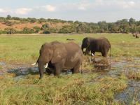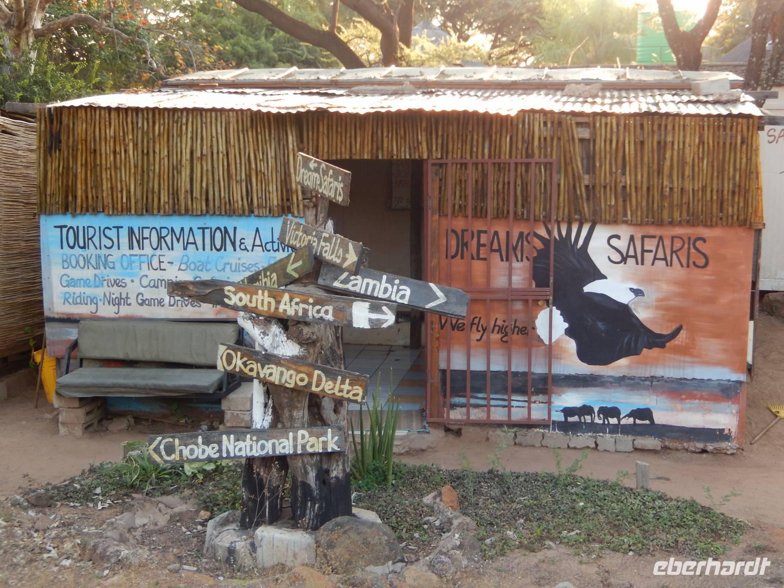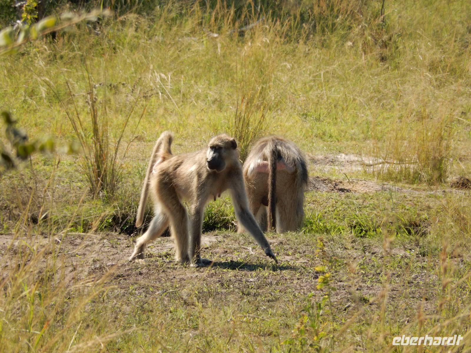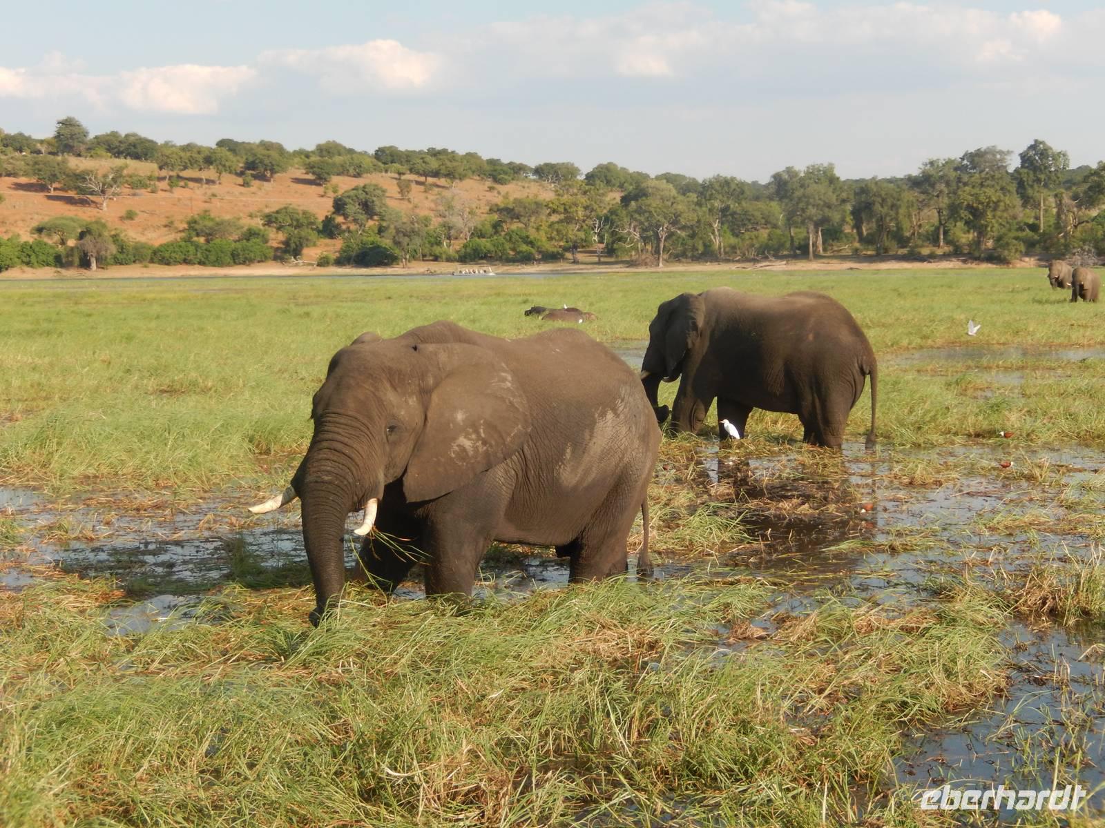 Heute dürfen wir ausschlafen. Es sind die letzten Stunden in Namiba. Nach einer spektakulären „aus-dem-Bad"-Befreiungsaktion am Morgen, können wir die Weiterreise gemeinsam antreten. In Katima Mulilu, was übersetzt heißt „Lösch das Feuer", haben wir die Möglichkeit im Supermarkt ein paar Kleinigkeiten für die Mittagspause einzukaufen, während Lesley und Sadrag die Papiere für die Einreise nach Botswana besorgen. Da es keine öffentlichen Toiletten gibt, werden uns hilfsbereit, wie die Namibier sind, die Mitarbeiter-Toiletten des Supermarktes angeboten, die wir dankend annehmen. Nachdem wir auch unsere letzten Postkarten los geworden sind, können wir uns auf den Weg zum 60 Kilometer entfernten Grenzübergang machen. Formular ausfüllen, Reisepass zeigen, Stempeln lassen und dann können wir über die Grenze gehen, was wir wahrsten Sinne des Wortes tun. Auf den drei Kilometern Niemandsland zwischen Namibia und Botswana machen wir Mittagspause und beobachten eine Herde Elefanten. Nach Botswana einreisen dürfen wir erst, nachdem wir alle aus unserem Truck ausgestiegen sind und mit unseren Schuhen sowie einem zweiten Paar Schuhe durch Desinfektionsmittel gelaufen sind. Auch der Truck muss durch diese Lauge fahren. Dann dürfen wir wieder einsteigen und die weiteren Formalitäten nur wenige Meter entfernt erledigen. Gleich nach der Grenze beginnt der Chobe Nationalpark. Bereits auf der Durchreise nach Kasane sehen wir Hornraben, Giraffen mit Kind und einen Elefanten unmittelbar neben der Straße. Am Eingang zur Chobe Safari Lodge werden wir mit wie überall mit einem Getränk herzlich willkommen geheißen. Eine knappe Stunde später treffen wir uns zu einem kleinen Bummel zum Zentrum der Stadt im Vierländereck von Botswana, Namibia, Sambia und Simbabwe. Warzenschweine und Paviane laufen hier auf der Straße frei umher. Die Sonne scheint noch heißer zu brennen. Da wir nur einen kleinen Mittagssnack genossen haben, freuen wir uns nach unserer Rückkunft über ein riesiges Buffet am Abend. Wir kosten hier und da von Hühnchen, Lamm und Impala. Ein Genuss!