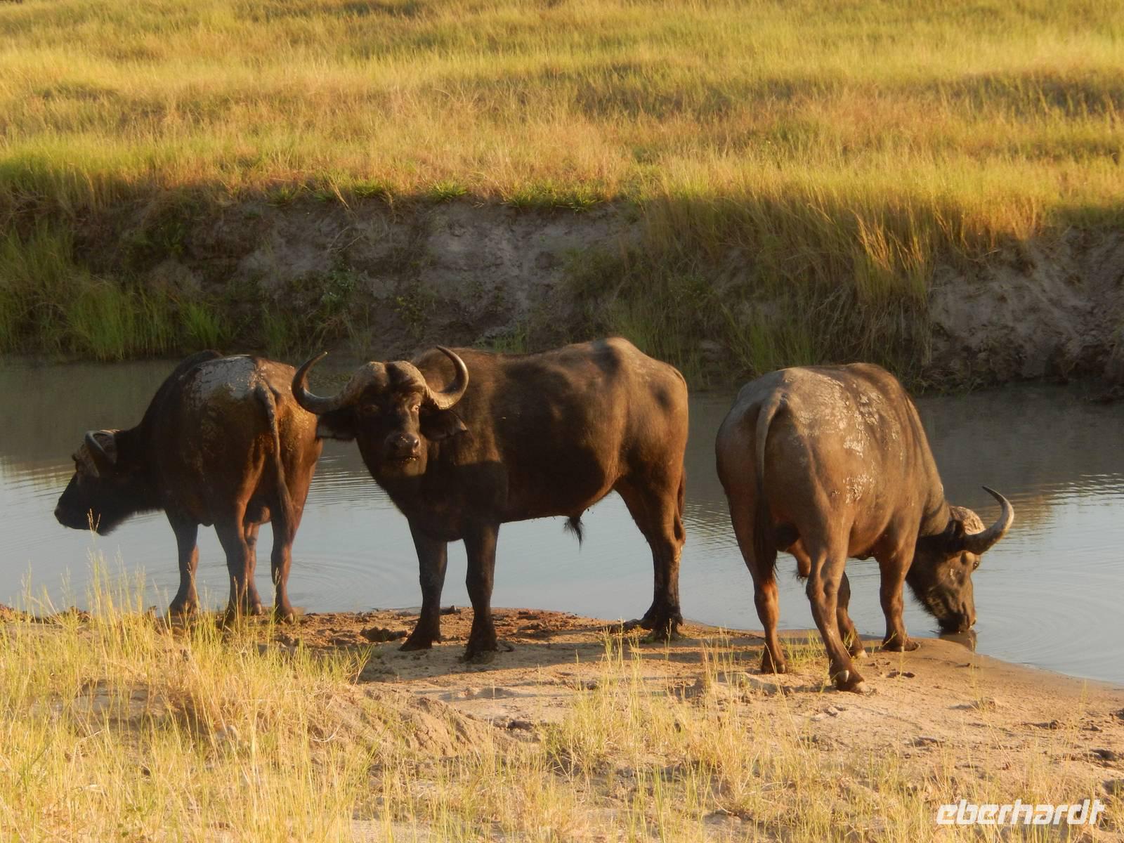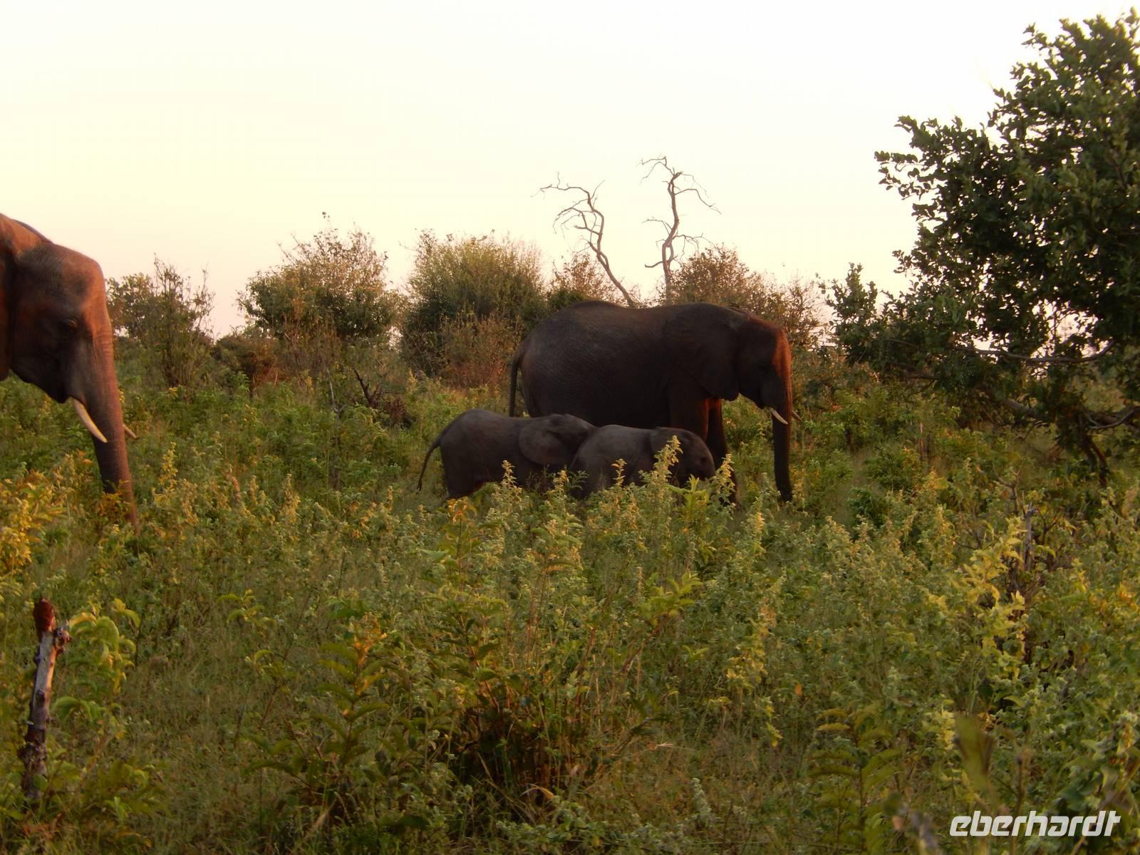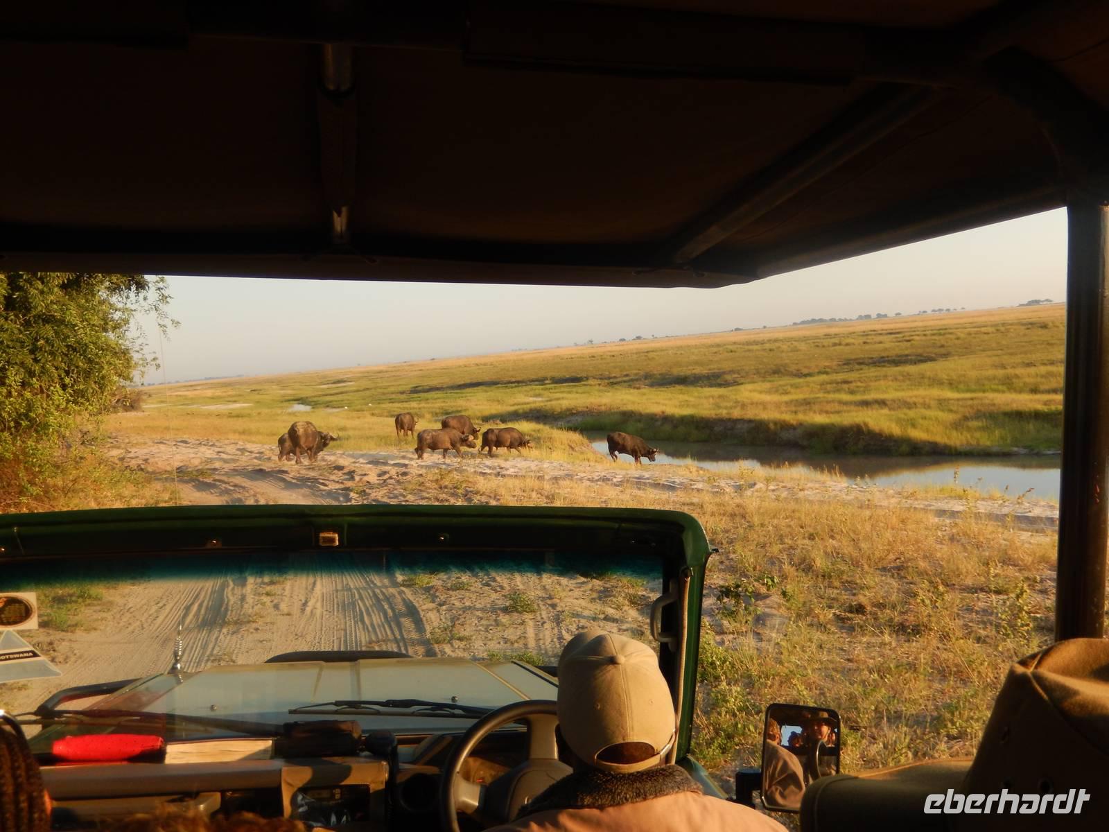 Noch vor Sonnenaufgang starten wir zu einer Jeep-Safari durch den Chobe Nationalpark. Nachdem wir gestern bei Ankunft am Nachmittag recht geschwitzt haben, lässt uns der kalte Fahrtwind trotz der ausgeteilten Decken nun frieren. Schließlich ist Winter auf der Südhalbkugel. Nachdem wir am Eingang zum Nationalpark angemeldet sind, biegen wir auf die Schotterpiste ab. Rasant fährt uns unser lokaler Guide Wenda durch den morgendlichen Nationalpark. Die Sonne geht gerade erst auf, als wir die ersten Geier und Komorane auf den Bäumen erspähen. An diesem Morgen können wir unsere Big Five vervollständigen. Viele Büffel begegnen uns während der Pirsch. Des Weiteren begegnen uns Giraffen, Impalas, Paviane, Perlhühner und große Elefantenherden. Neben den ersten Sonnenstrahlen wärmt uns zwischendurch zusätzlich eine Tasse heißer Kaffee oder Tee. Dann setzen wir unsere Pirsch fort. Ein Funk ertönt. Es wurde etwas gesichtet. Schnellen Wegs fahren wir zur angegebenen Stelle. Doch wir sind zu spät. Leider sehen wir keine Löwen. Eine andere Begegnung lässt uns diese Enttäuschung aber vergessen. Vor uns hat ein anderer Jeep gehalten. Ein Elefant befindet sich unmittelbar neben dem Auto und setzt seinen Weg in unsere Richtung fort. Alle sind mucksmäuschenstill als er zum Greifen nah unser Auto seelenruhig passiert. Was für ein Moment!