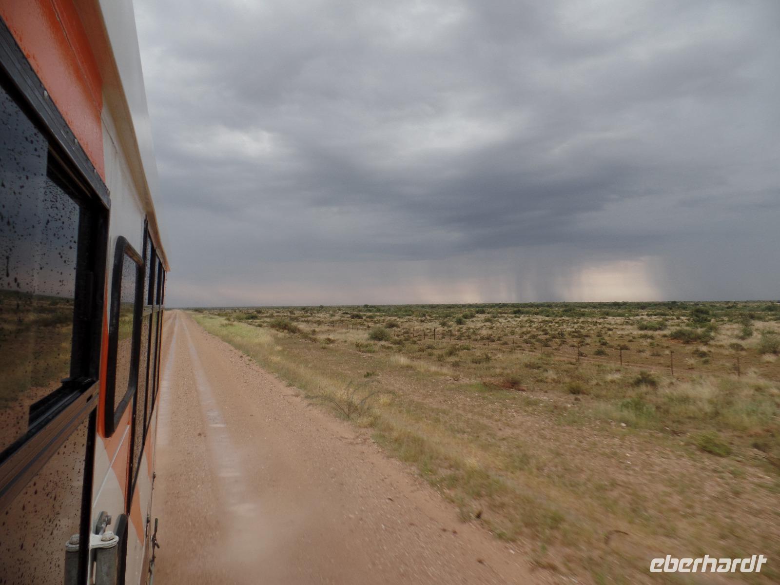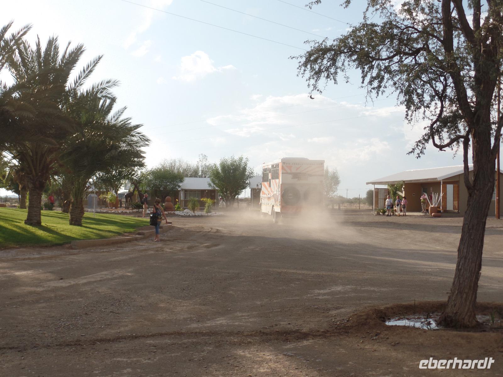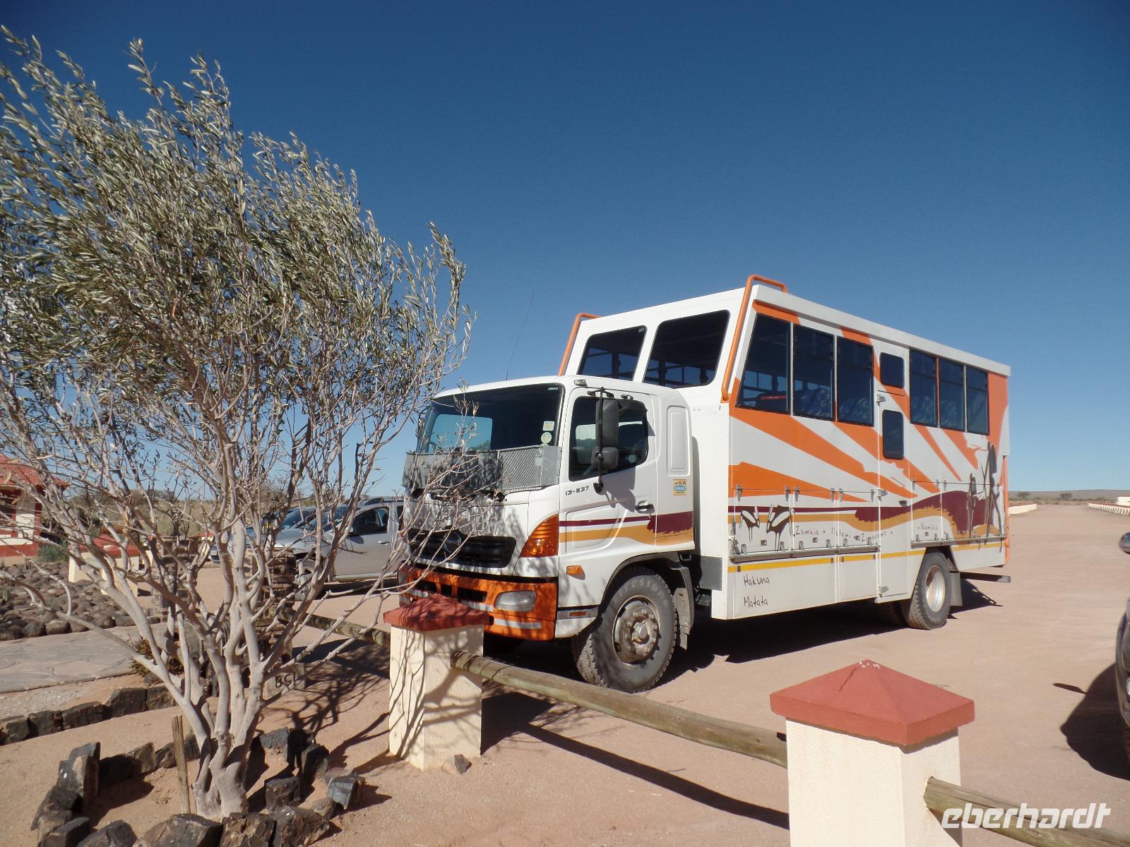 Aus allen Richtungen kamen wir auf den Münchner Flughafen geflogen. Pünktlich zum Boarding trafen wir uns am Gate und flogen über Nacht Richtung Afrika, stiegen in Johannesburg um und landeten gegen Mittag in Windhoek. Wir wurden herzlich von unserem Dreamteam Bianca und Murray am Flughafen begrüßt. Als wir unser Gefährt für die nächsten zwei Wochen sahen, waren alle aus dem Häuschen. Ein wirklich großer, bunter LKW-Jeep mit wirklich auffälligem Zebra-Muster sollte uns sicher durch die abwechslungsreiche Landschaft in Namibia fahren. Unser erstes Ziel war unsere Lodge in der Nähe von Mariental. Unterwegs erzählte uns Bianca Wissenswertes über Land und Leute, gab uns erste Tipps zu unserem Reiseablauf und die ersten Tiere wurden auch schon von uns entdeckt. In der Lapa Lange Lodge bezogen wir unsere Zimmer, entspannten ein wenig und staunten nicht schlecht, als zwei Nashörner zur Wasserstelle der Lodge kamen. Doch das war nicht die einzige (tierische) Überraschung. Es fing an zu regnen! Mitten in Afrika erlebten wir einen Regenguss, mit dem wir wahrlich nicht gerechnet hatten. Aber der Gepard der Lodge war das i-Tüpfelchen des Tages. Wir waren alle verblüfft, dass diese Großkatze einfach so durch die Lodge lief und auch einfach nur gestreichelt werden wollte. Nach dem ersten namibischen Abendessen fielen wir alle müde in die Betten. Schließlich hatten wir für den ersten Tag schon viel gesehen.