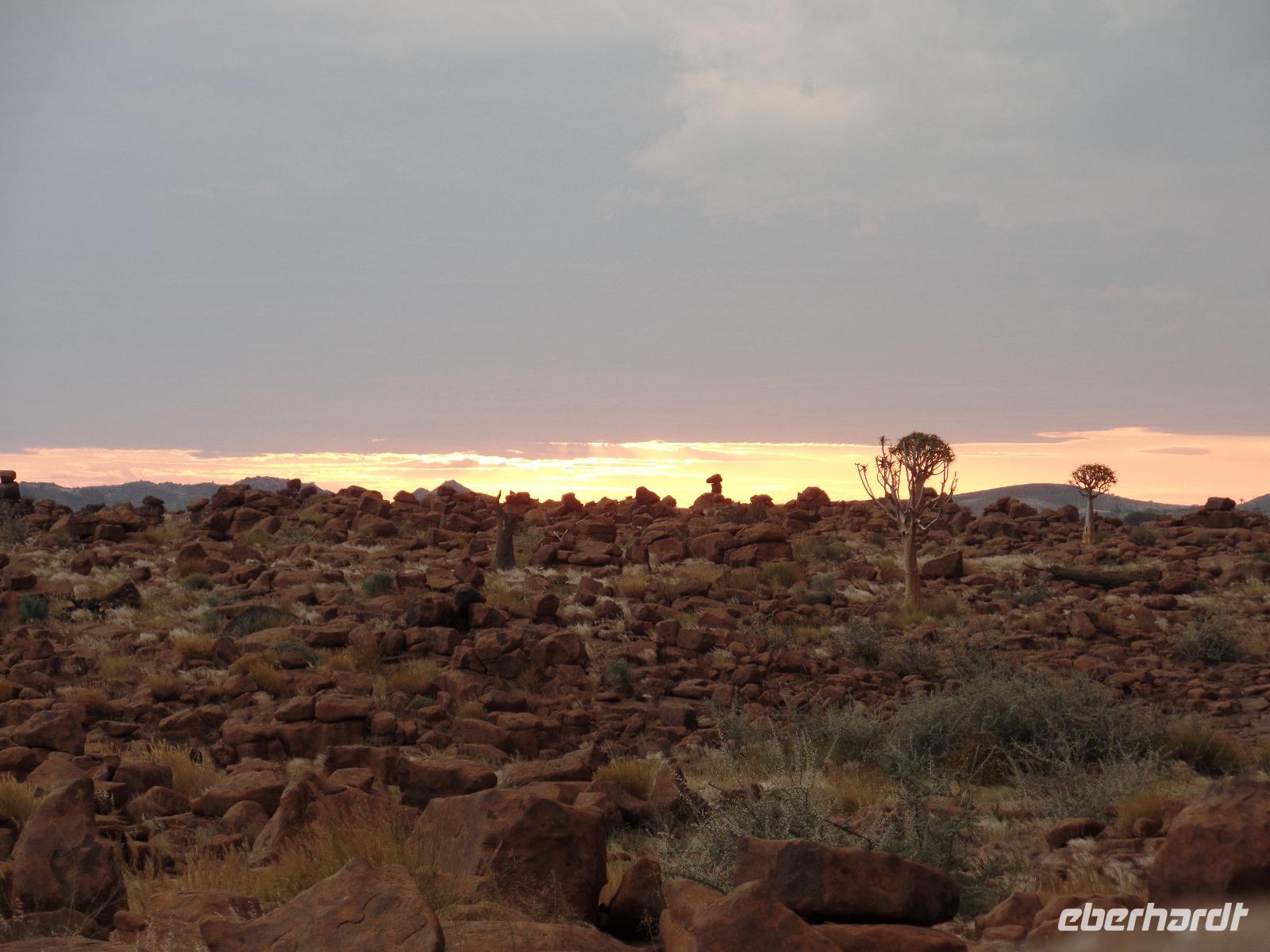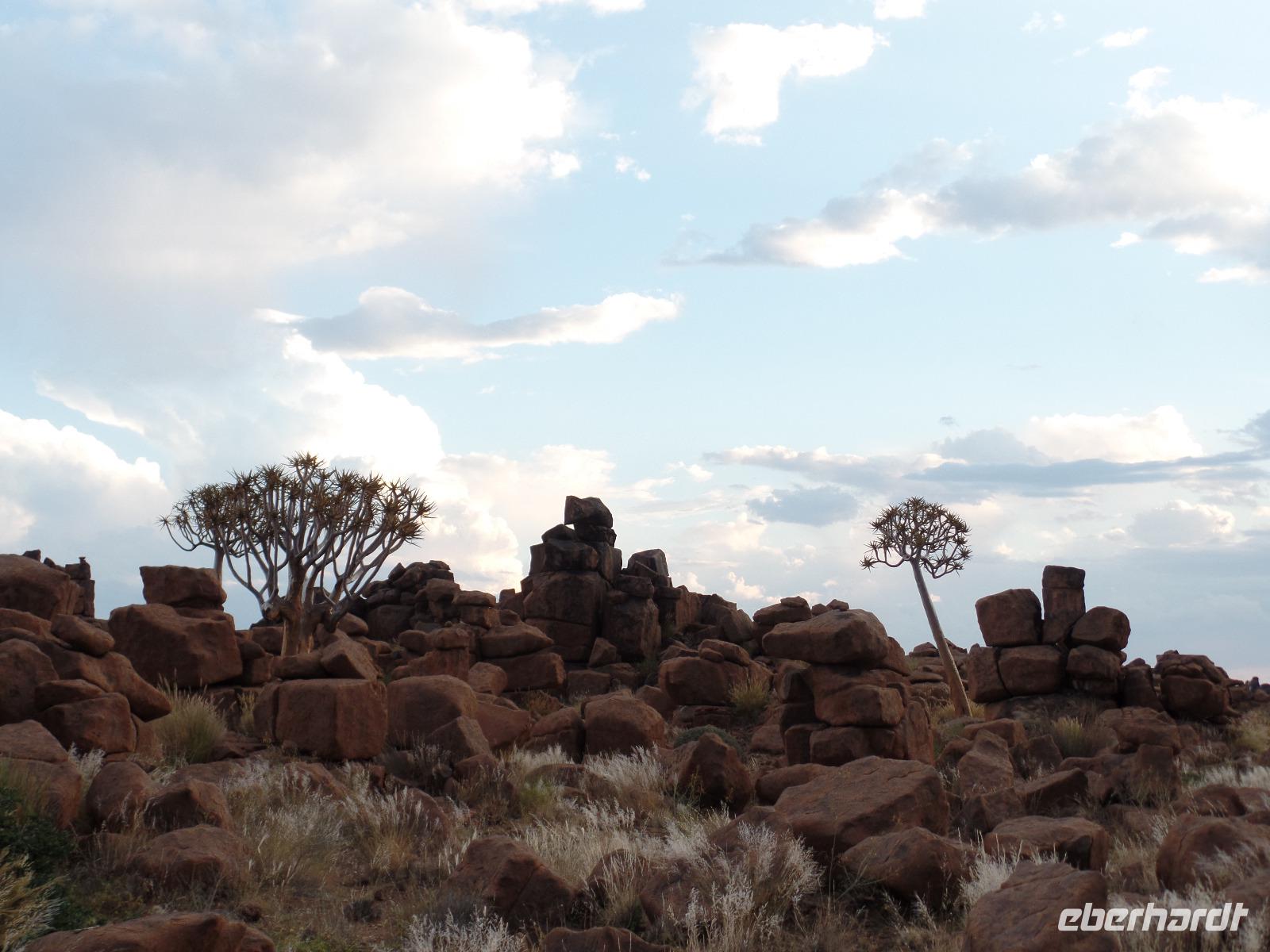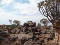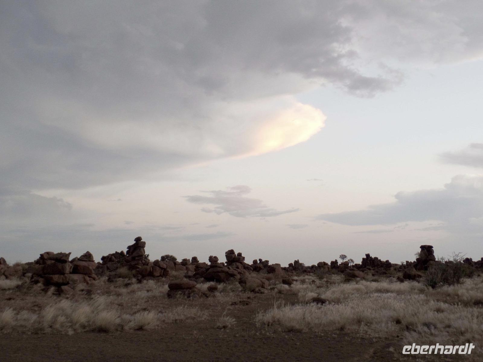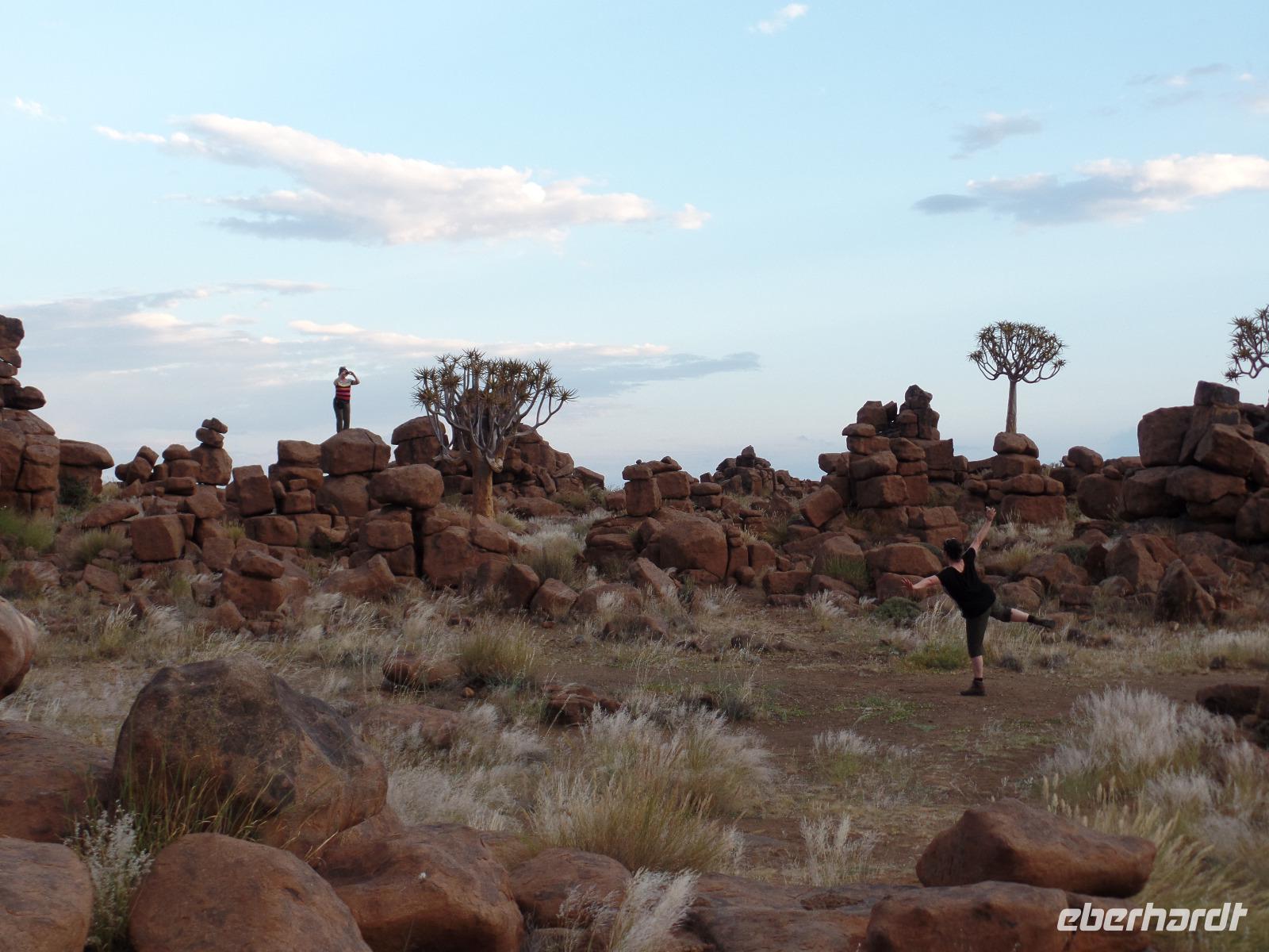 In der Nacht fing der Regen wieder an, welcher am Morgen noch immer anhielt. Bis auf unsere Reisegruppe freuten sich alle darüber, schließlich hatte es monatelang nicht geregnet. Wir kannten Regen nur zu gut. Während wir im Zebra-Jeep nach Keetmanshoop fuhren, wurde das Wetter wieder zunehmend besser. Wir bewunderten die vorbeiziehenden Landschaften und sahen hier und da ein paar Springböcke und Oryxe. Selbst eine Cobra "bedrohte" unseren Bus auf der Straße und die ersten Strauße kreuzten unseren Weg. Zur Mittagszeit kamen wir in der Nähe von Keetmannshoop am Quiver Tree Forest an und legten eine Picknick-Pause ein. Der Köcherbaumwald ist nationales Denkmal und die Bäume selbst, die eher eine Art Aloe-Pflanze sind, bis zu 300 Jahre alt. Während wir die besonderen Aloegewächse bewunderten entdeckten wir in den umliegenden Gesteinsformationen kleine Klippschliefer, auch Klippdachse genannt. Nach unserem Pichnick und einer Stippvisite in der Missionarsstadt Keetmanshoop, fuhren wir zur Lodge und hatten ein wenig Zeit. Anschließend trafen wir uns um uns den Spielplatz der Giganten anzuschauen. Unsere Fahrt wurde durch einen Hinweis von Musrray unterbrochen. Er hatte eine Puffnatter gesehen. Leider war sie schon tot aber interessant war es trotzdem. Beim Giant´s Playground angekommen, ging die Sonne schon langsam unter und die unzähligen Felsen wurden in warme Rot- und Orangetöne getaucht. Wir genossen den Sonnenuntergang so lang wie es ging, denn weiter östlich sah man am Horizont dicke Gewitterwolken auf uns zukommen. Wir hatten es gerade so in die Lodge geschafft, da kam auch schon die geballte Kraft des Unwetters auf uns niedergeregnet. Die ganz Lodge war überflutet und wir amüsierten uns, weil wir doch, bis auf zwei Wenige unserer Reisegruppe, die Regenjacken und Regenschirme zu Hause gelassen hatten. Immer wieder lachten wir über Biancas Satz: "Namibia ist ein trockenes Land", genossen unser Abendessen und ließen noch bis in die Nacht den Tag Revue passieren.