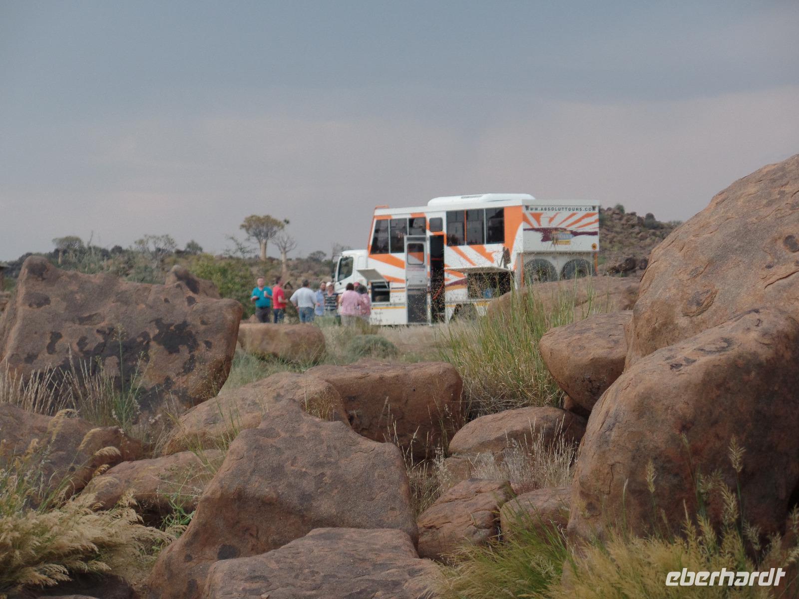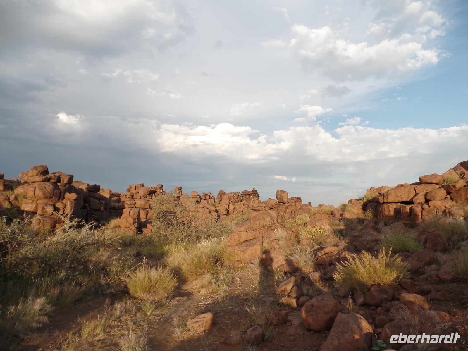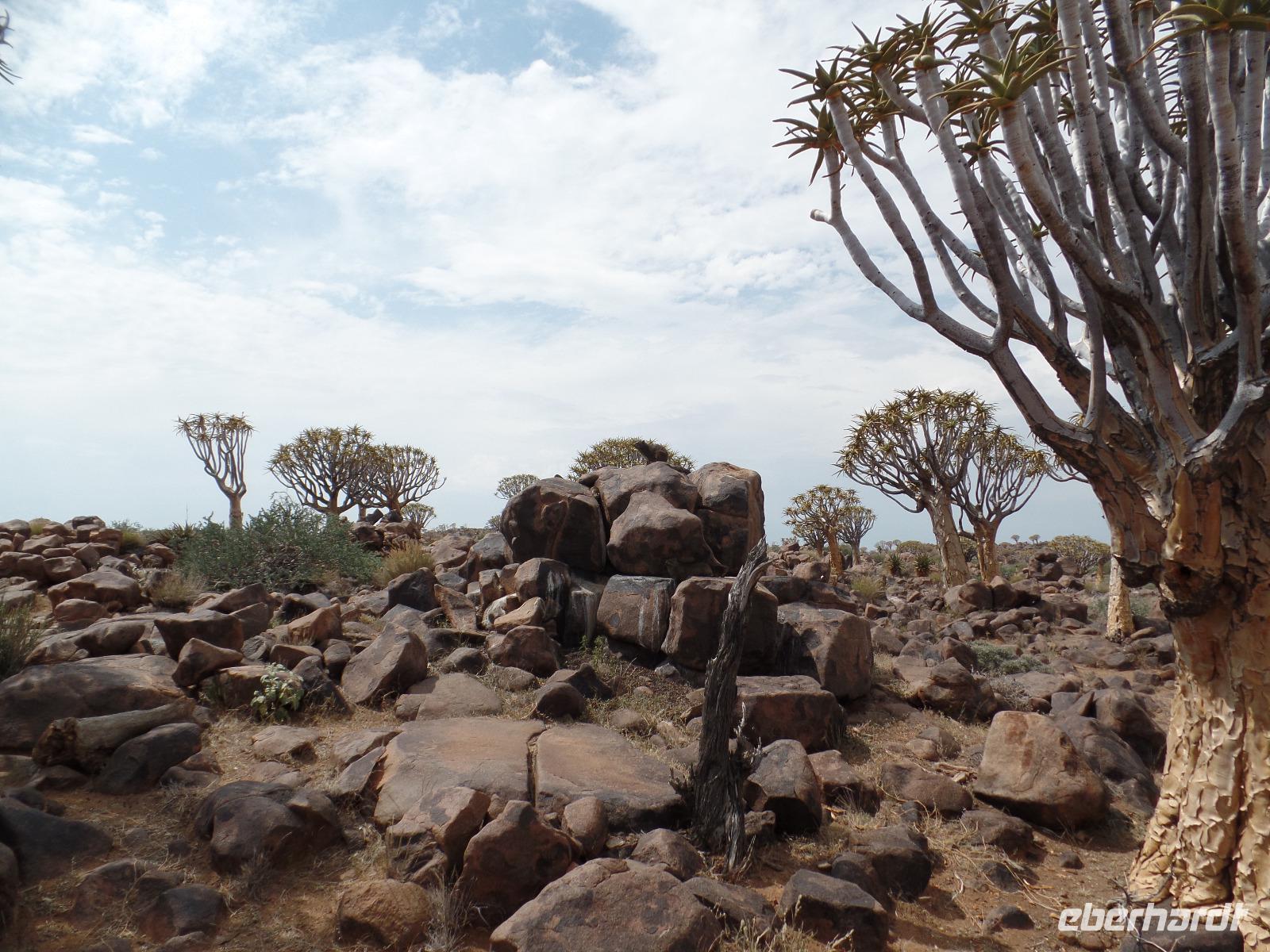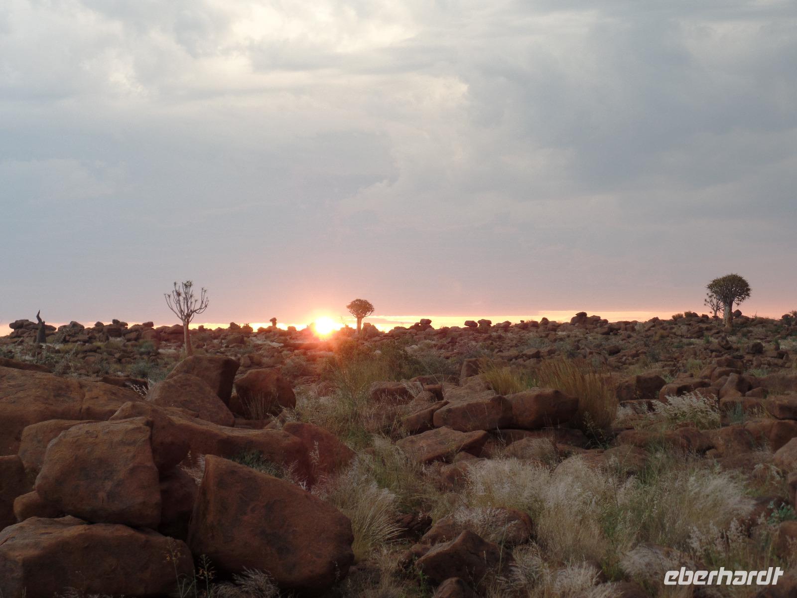 In der Nacht fing der Regen wieder an, welcher am Morgen noch immer anhielt. Bis auf unsere Reisegruppe freuten sich alle darüber, schließlich hatte es monatelang nicht geregnet. Wir kannten Regen nur zu gut. Während wir im Zebra-Jeep nach Keetmanshoop fuhren, wurde das Wetter wieder zunehmend besser. Wir bewunderten die vorbeiziehenden Landschaften und sahen hier und da ein paar Springböcke und Oryxe. Selbst eine Cobra "bedrohte" unseren Bus auf der Straße und die ersten Strauße kreuzten unseren Weg. Zur Mittagszeit kamen wir in der Nähe von Keetmannshoop am Quiver Tree Forest an und legten eine Picknick-Pause ein. Der Köcherbaumwald ist nationales Denkmal und die Bäume selbst, die eher eine Art Aloe-Pflanze sind, bis zu 300 Jahre alt. Während wir die besonderen Aloegewächse bewunderten entdeckten wir in den umliegenden Gesteinsformationen kleine Klippschliefer, auch Klippdachse genannt. Nach unserem Pichnick und einer Stippvisite in der Missionarsstadt Keetmanshoop, fuhren wir zur Lodge und hatten ein wenig Zeit. Anschließend trafen wir uns um uns den Spielplatz der Giganten anzuschauen. Unsere Fahrt wurde durch einen Hinweis von Musrray unterbrochen. Er hatte eine Puffnatter gesehen. Leider war sie schon tot aber interessant war es trotzdem. Beim Giant´s Playground angekommen, ging die Sonne schon langsam unter und die unzähligen Felsen wurden in warme Rot- und Orangetöne getaucht. Wir genossen den Sonnenuntergang so lang wie es ging, denn weiter östlich sah man am Horizont dicke Gewitterwolken auf uns zukommen. Wir hatten es gerade so in die Lodge geschafft, da kam auch schon die geballte Kraft des Unwetters auf uns niedergeregnet. Die ganz Lodge war überflutet und wir amüsierten uns, weil wir doch, bis auf zwei Wenige unserer Reisegruppe, die Regenjacken und Regenschirme zu Hause gelassen hatten. Immer wieder lachten wir über Biancas Satz: "Namibia ist ein trockenes Land", genossen unser Abendessen und ließen noch bis in die Nacht den Tag Revue passieren.