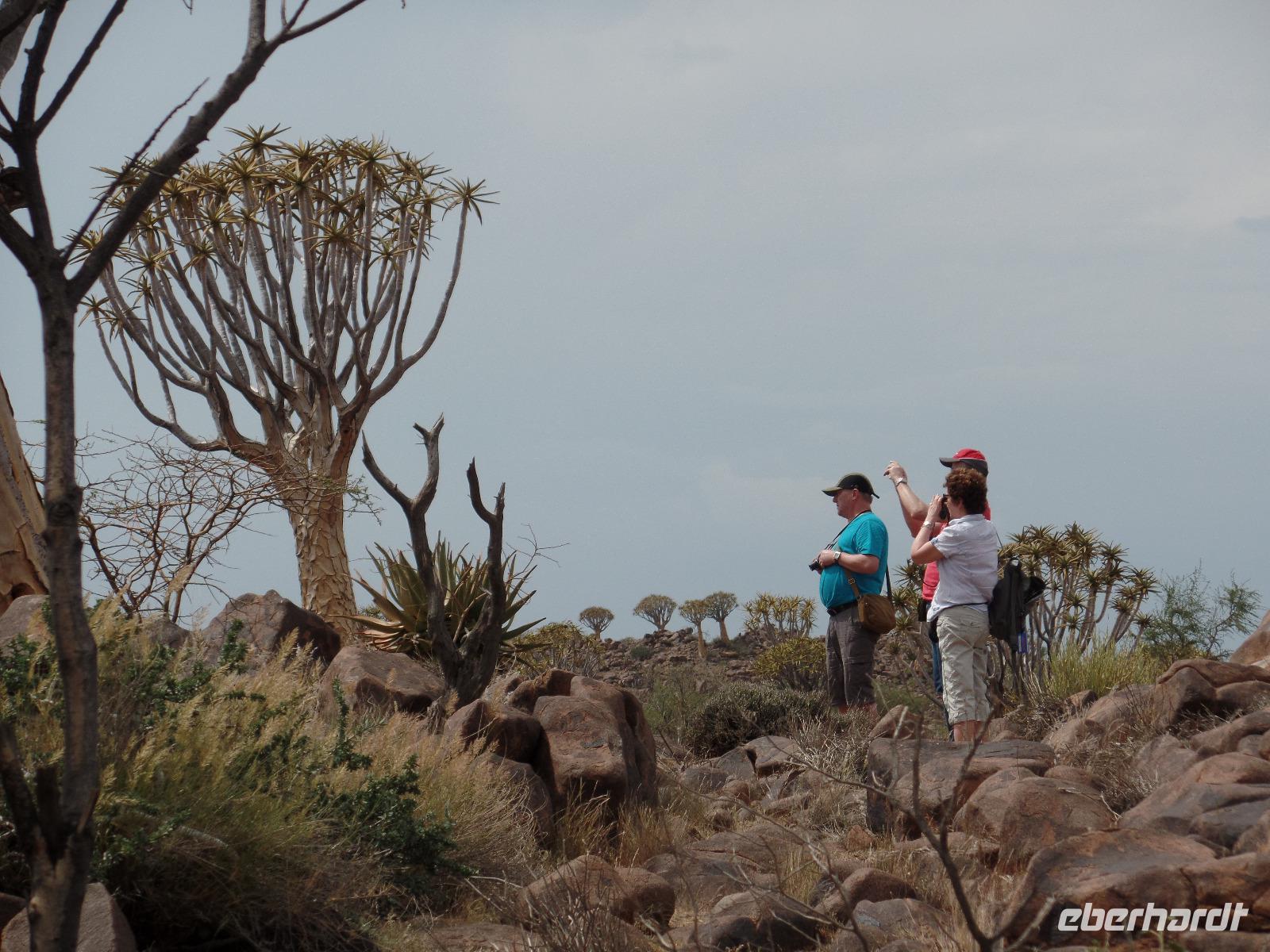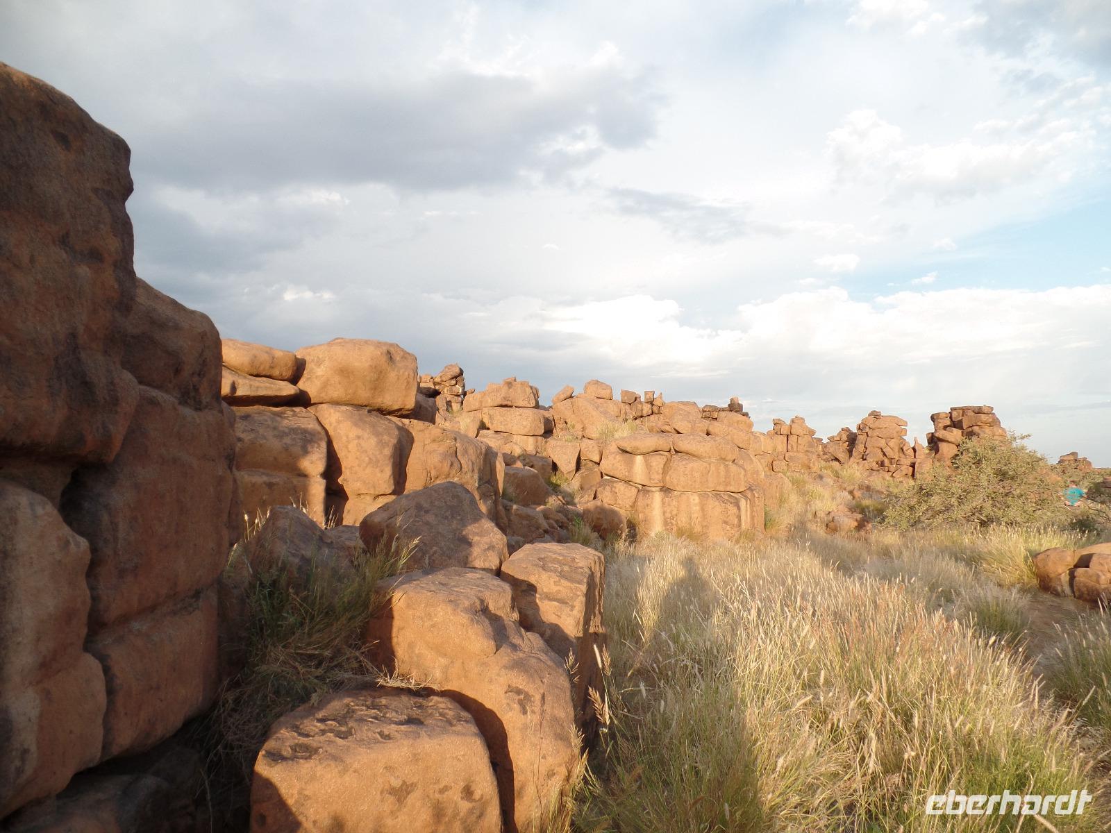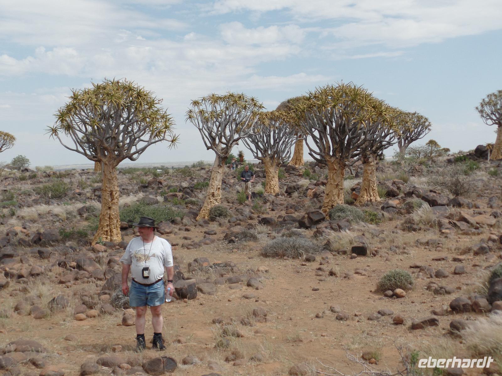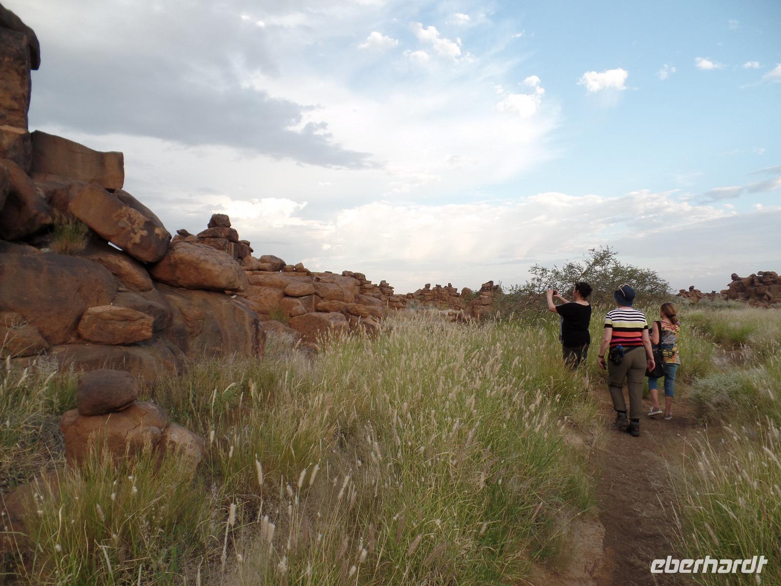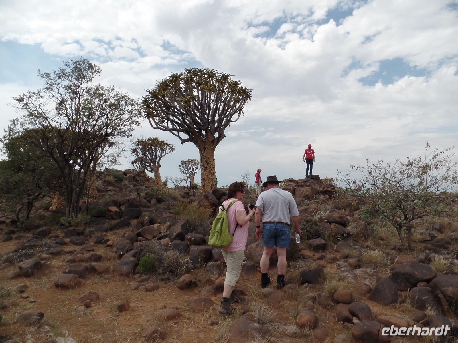 In der Nacht fing der Regen wieder an, welcher am Morgen noch immer anhielt. Bis auf unsere Reisegruppe freuten sich alle darüber, schließlich hatte es monatelang nicht geregnet. Wir kannten Regen nur zu gut. Während wir im Zebra-Jeep nach Keetmanshoop fuhren, wurde das Wetter wieder zunehmend besser. Wir bewunderten die vorbeiziehenden Landschaften und sahen hier und da ein paar Springböcke und Oryxe. Selbst eine Cobra "bedrohte" unseren Bus auf der Straße und die ersten Strauße kreuzten unseren Weg. Zur Mittagszeit kamen wir in der Nähe von Keetmannshoop am Quiver Tree Forest an und legten eine Picknick-Pause ein. Der Köcherbaumwald ist nationales Denkmal und die Bäume selbst, die eher eine Art Aloe-Pflanze sind, bis zu 300 Jahre alt. Während wir die besonderen Aloegewächse bewunderten entdeckten wir in den umliegenden Gesteinsformationen kleine Klippschliefer, auch Klippdachse genannt. Nach unserem Pichnick und einer Stippvisite in der Missionarsstadt Keetmanshoop, fuhren wir zur Lodge und hatten ein wenig Zeit. Anschließend trafen wir uns um uns den Spielplatz der Giganten anzuschauen. Unsere Fahrt wurde durch einen Hinweis von Musrray unterbrochen. Er hatte eine Puffnatter gesehen. Leider war sie schon tot aber interessant war es trotzdem. Beim Giant´s Playground angekommen, ging die Sonne schon langsam unter und die unzähligen Felsen wurden in warme Rot- und Orangetöne getaucht. Wir genossen den Sonnenuntergang so lang wie es ging, denn weiter östlich sah man am Horizont dicke Gewitterwolken auf uns zukommen. Wir hatten es gerade so in die Lodge geschafft, da kam auch schon die geballte Kraft des Unwetters auf uns niedergeregnet. Die ganz Lodge war überflutet und wir amüsierten uns, weil wir doch, bis auf zwei Wenige unserer Reisegruppe, die Regenjacken und Regenschirme zu Hause gelassen hatten. Immer wieder lachten wir über Biancas Satz: "Namibia ist ein trockenes Land", genossen unser Abendessen und ließen noch bis in die Nacht den Tag Revue passieren.