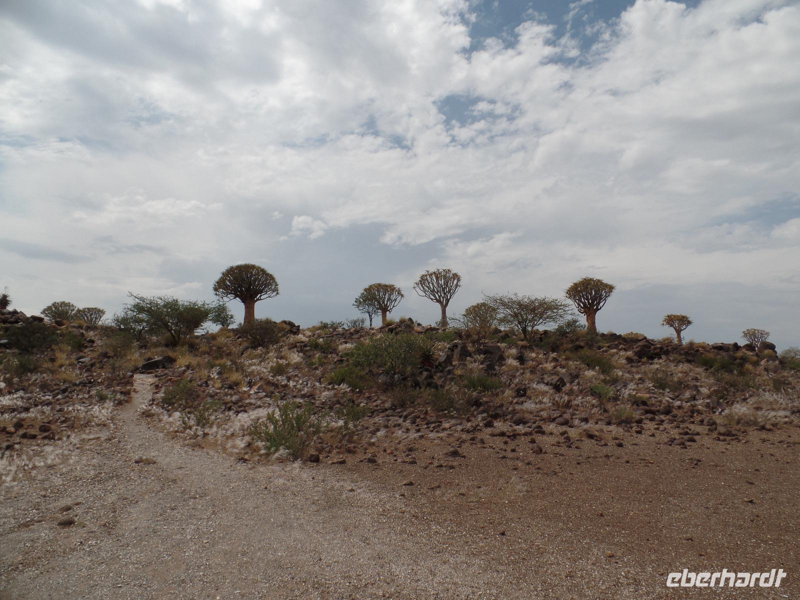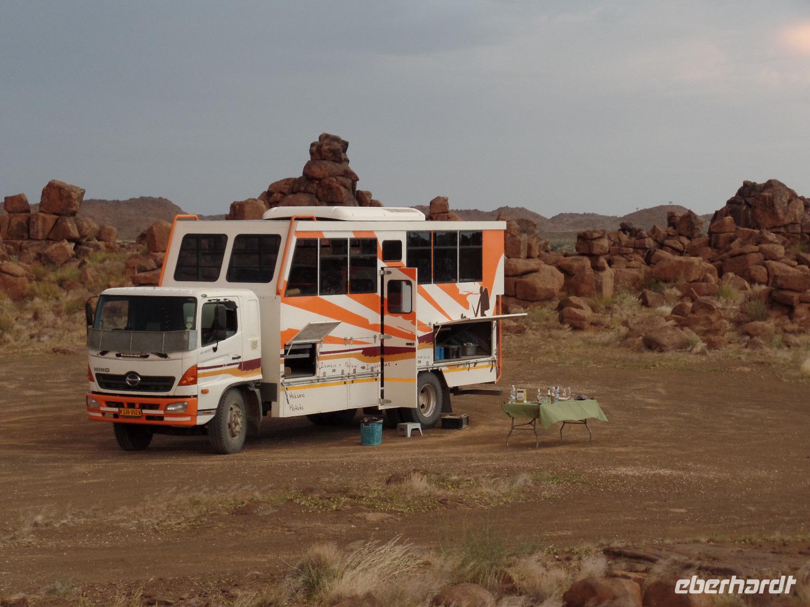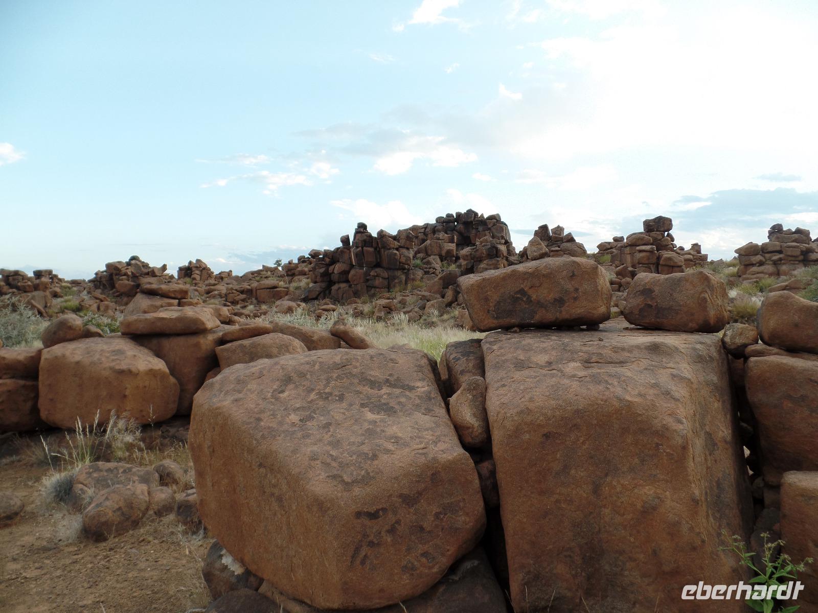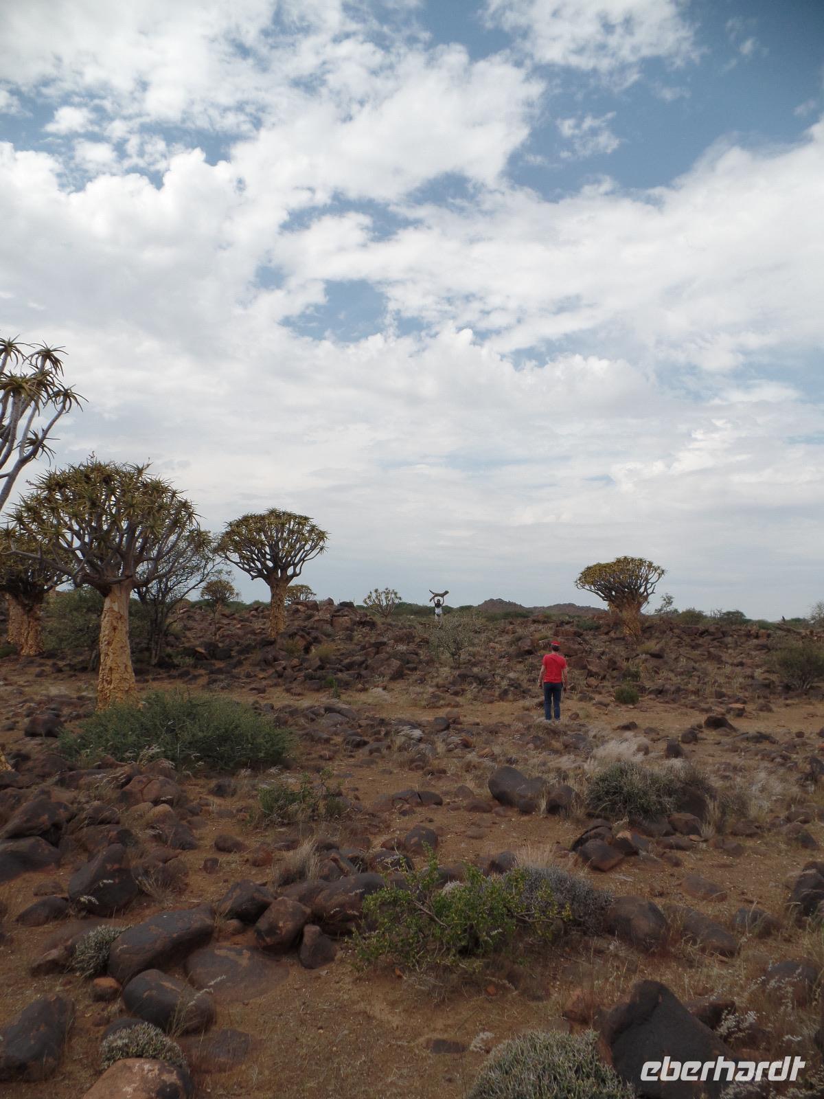 In der Nacht fing der Regen wieder an, welcher am Morgen noch immer anhielt. Bis auf unsere Reisegruppe freuten sich alle darüber, schließlich hatte es monatelang nicht geregnet. Wir kannten Regen nur zu gut. Während wir im Zebra-Jeep nach Keetmanshoop fuhren, wurde das Wetter wieder zunehmend besser. Wir bewunderten die vorbeiziehenden Landschaften und sahen hier und da ein paar Springböcke und Oryxe. Selbst eine Cobra "bedrohte" unseren Bus auf der Straße und die ersten Strauße kreuzten unseren Weg. Zur Mittagszeit kamen wir in der Nähe von Keetmannshoop am Quiver Tree Forest an und legten eine Picknick-Pause ein. Der Köcherbaumwald ist nationales Denkmal und die Bäume selbst, die eher eine Art Aloe-Pflanze sind, bis zu 300 Jahre alt. Während wir die besonderen Aloegewächse bewunderten entdeckten wir in den umliegenden Gesteinsformationen kleine Klippschliefer, auch Klippdachse genannt. Nach unserem Pichnick und einer Stippvisite in der Missionarsstadt Keetmanshoop, fuhren wir zur Lodge und hatten ein wenig Zeit. Anschließend trafen wir uns um uns den Spielplatz der Giganten anzuschauen. Unsere Fahrt wurde durch einen Hinweis von Musrray unterbrochen. Er hatte eine Puffnatter gesehen. Leider war sie schon tot aber interessant war es trotzdem. Beim Giant´s Playground angekommen, ging die Sonne schon langsam unter und die unzähligen Felsen wurden in warme Rot- und Orangetöne getaucht. Wir genossen den Sonnenuntergang so lang wie es ging, denn weiter östlich sah man am Horizont dicke Gewitterwolken auf uns zukommen. Wir hatten es gerade so in die Lodge geschafft, da kam auch schon die geballte Kraft des Unwetters auf uns niedergeregnet. Die ganz Lodge war überflutet und wir amüsierten uns, weil wir doch, bis auf zwei Wenige unserer Reisegruppe, die Regenjacken und Regenschirme zu Hause gelassen hatten. Immer wieder lachten wir über Biancas Satz: "Namibia ist ein trockenes Land", genossen unser Abendessen und ließen noch bis in die Nacht den Tag Revue passieren.