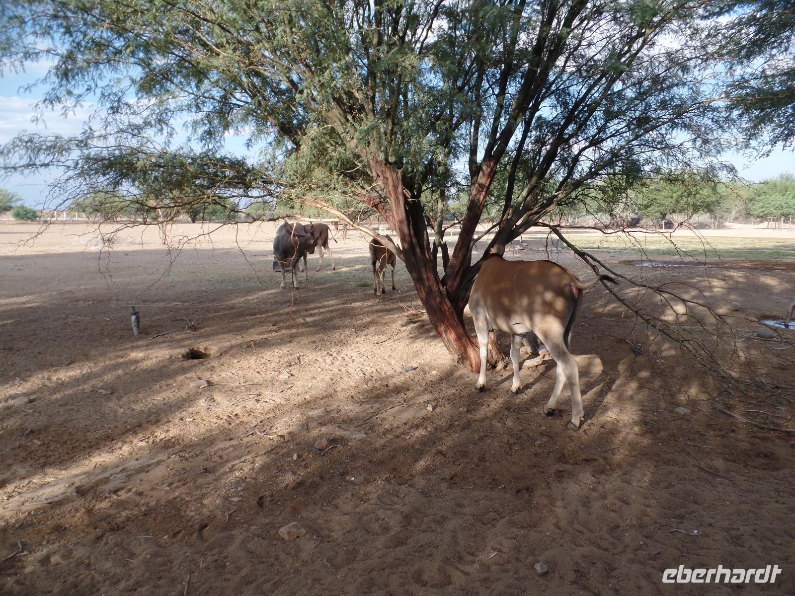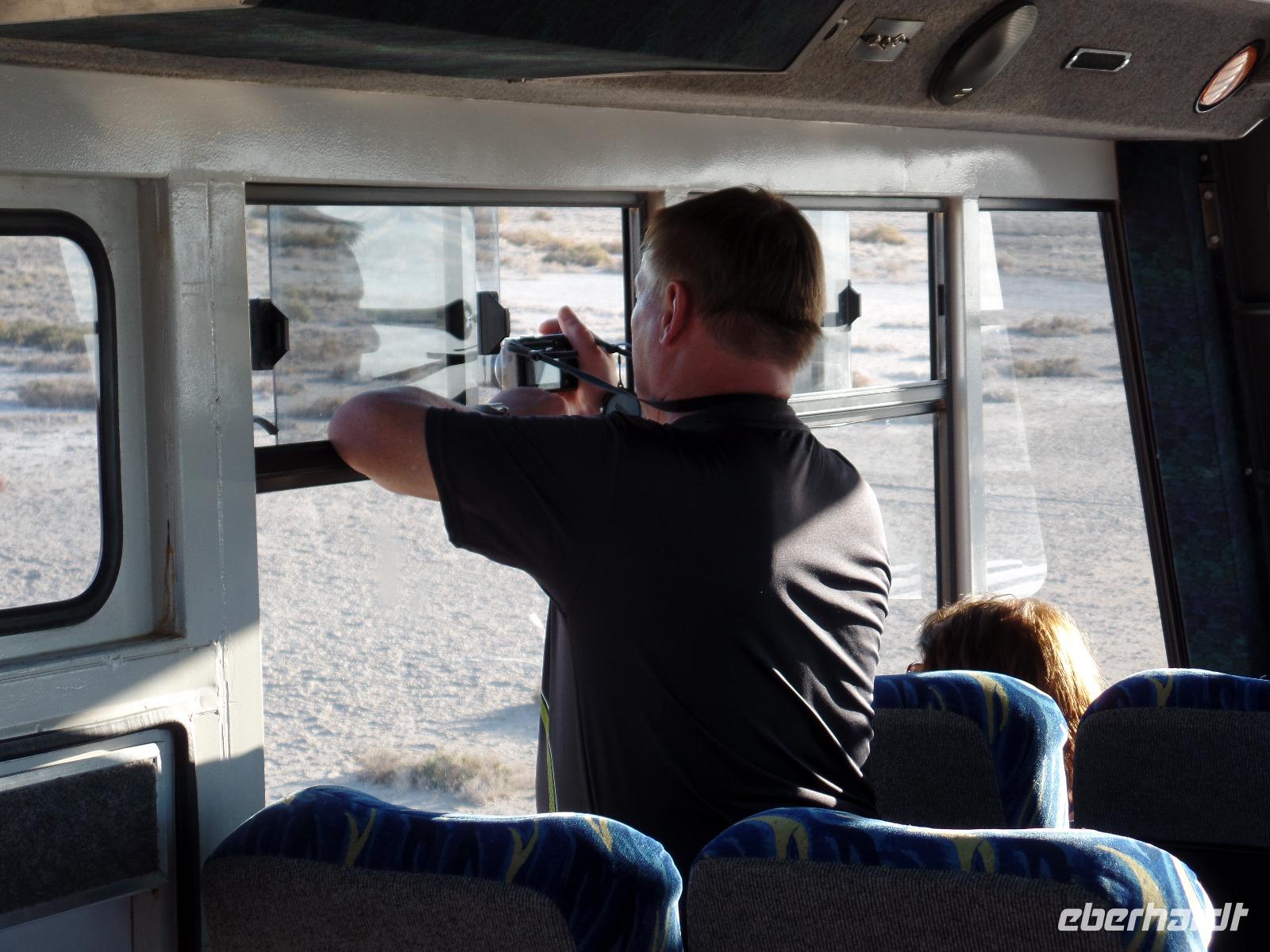 Nach einem guten Frühstück fuhren wir weiter in den Norden Namibias. Kurz vor dem Etosha-Nationalpark gab es noch eine kleine Sensation, als eine Gruppe Warzenschweine über die Straße blitzte. Aufgeregt schauten wir nach weiteren Tieren Ausschau. Die bekamen wir dann auch im Nationalpark zu Gesicht. Ein Wasserloch war unsere erste Anlaufstelle. Zebras, Oryxe und ein Schakal bekamen unsere Aufmerksamkeit. In der Ferne erspähten wir eine Giraffe, die sich langsam aus dem Gebüsch näherte. Auf der weiteren Fahrt durch den besonderen Nationalpark entdeckten wir sogar zwei im Schatten dösende Löwen, denen es völlig egal zu sein schien, dass mehrere Fahrzeuge vor ihnen hielten und sie neugierig beäugten. Ein weißes Nashorn war ganz in der Ferne zu sehen und wir waren alle aus dem Häuschen, als wir etwas Kleines hinterherlaufen sahen. Vergnügt vom Gesehenen fuhren wir in unsere Lodge und entspannten bis zum Abend am Pool, auf den Verandas der Bungalows oder an der Bar. Nach dem Abendessen saßen wir noch in gemütlicher Runde zusammen und erzählten über bereits erlebtes.