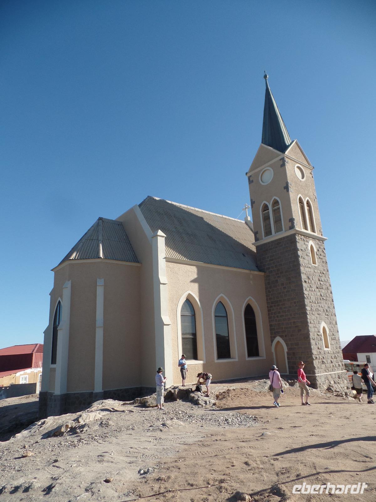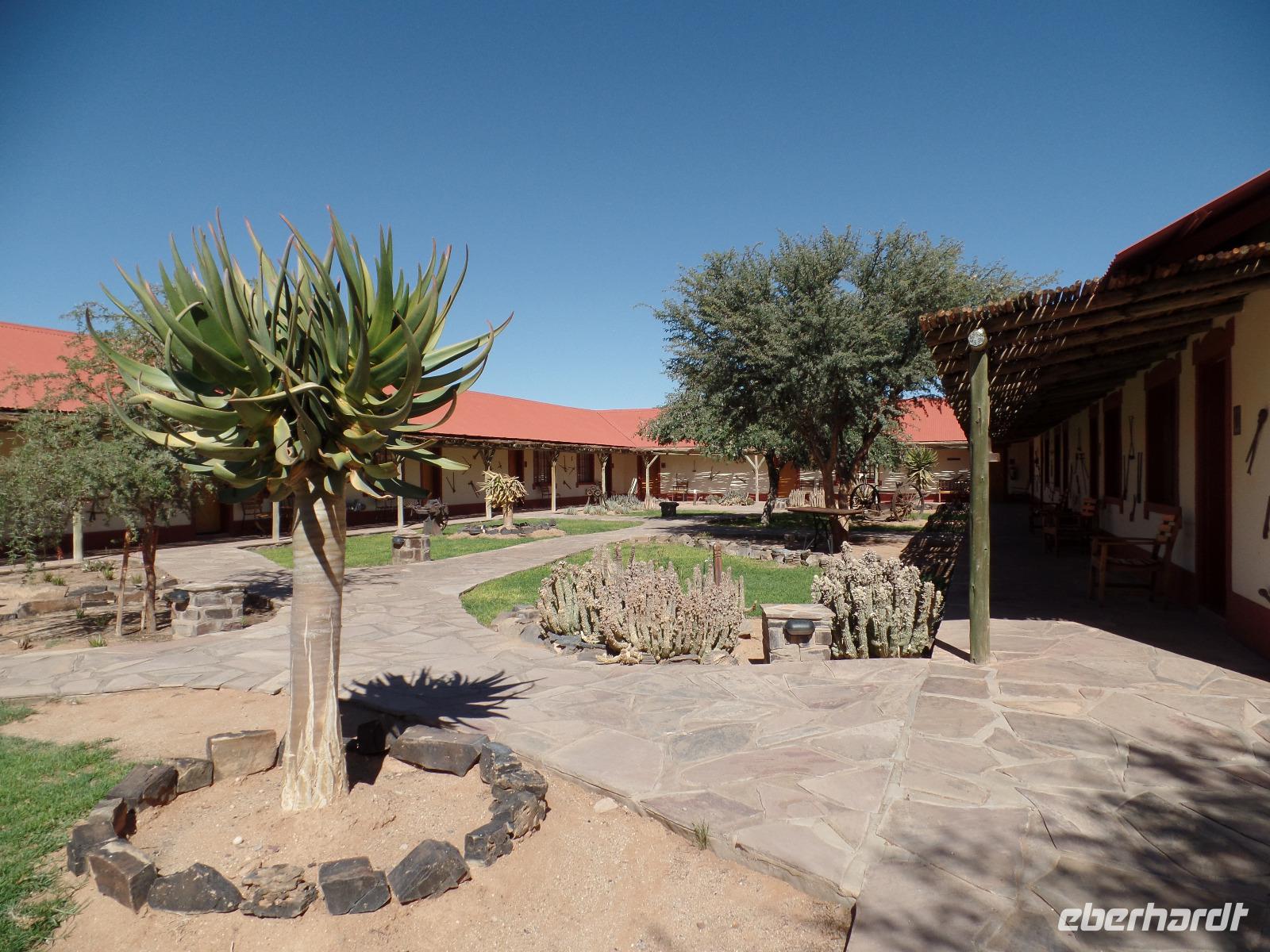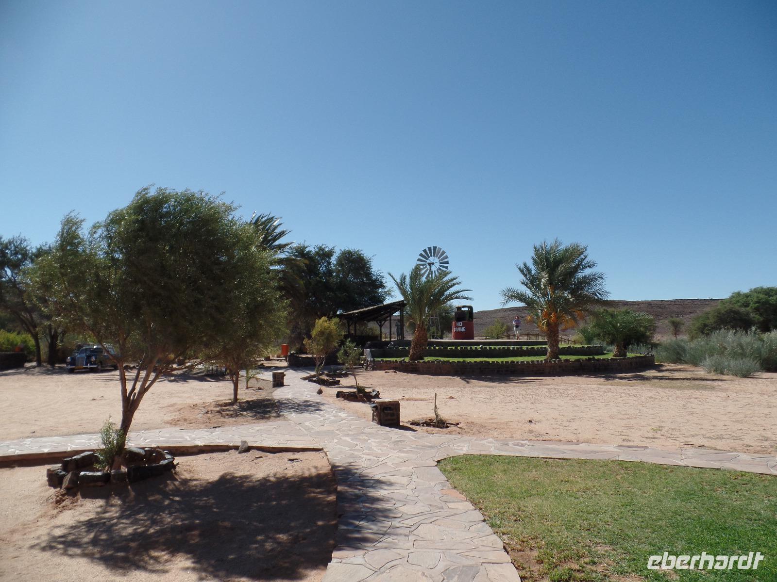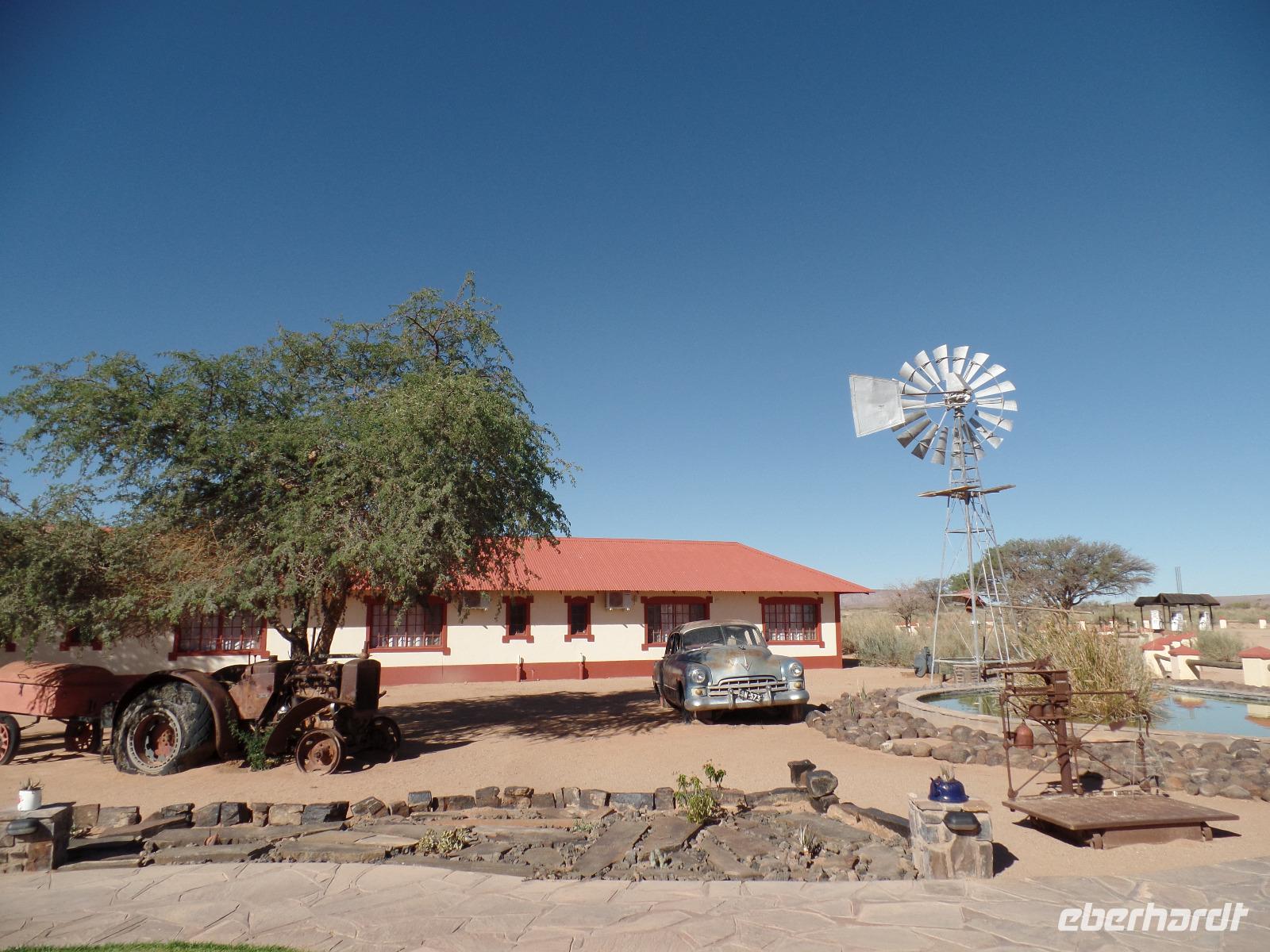 Am Morgen statteten wir der Felsenkirche in Lüderitz bei einem Spaziergang in der Stadt einen Besuch ab. Die kleine verträumte Stadt erinnerte uns mit ihren Fachwerkhäusern an das Erzgebirge. Selbst den Bergarbeitergruß „Glück auf" konnte man an einem Haus entdecken. Nachdem wir unseren reparierten Reifen abgeholt hatten konnten wir weiter nach Kolmanskop am Rande des Diamentensperrgebietes der Namib fahren. Während der Besichtigung stapften wir durch den tiefen Sand in der Geisterstadt und konnten uns durch anschauliche Wohnbeispiele in die Zeit des Diamantenfiebers zurückversetzen. Die Sonne wurde langsam heißer und so setzten wir unsere Reise in Richtung Landesinneren fort. Wir fuhren wieder durch endlose Weiten, sahen hier und da ein Oryx umherlaufen, fuhren an einem kunstvoll anmutenden Wasserrad vorbei, entdeckten bei einer Pause ein leider verendetes Zebra und kamen schließlich im kleinen Helmeringhausen an. Am Ortseingang konnte man schon den Ortsausgang sehen, dennoch war es allen bekannt, die das Buch „Hummel Dumm" gelesen hatten. Im üppig bewachsenen Garten einer Lodge konnten wir der Hitze in einer kleinen Mittagspause entgehen und fuhren anschließend weiter zur Dabis-Farm. Farmer Jörg empfing uns sehr herzlich und man hatte beim Kaffeetrinken das Gefühl, bei Freunden angekommen zu sein. Stolz erzählte er von seiner Familie und seiner Farm, welche er uns anschließend mit nicht weniger Freude bei einer Rundfahrt mit dem Jeep zeigte. Endlich sahen wir auch einige Kudus in der Ferne, seine eigens gezüchtete Schafherde durfte natürlich auch nicht fehlen. In der Dämmerung kamen wir wieder beim Farmhaus an, schnell den Staub und Sand des Tages abgeduscht, wartete schon das leckere Abendessen aus ökologischem Schafsfleisch, Salat und Auflauf auf uns. Spannende Geschichten rund um das Farmleben rundeten diesen Tag ab und wir gingen geschafft in unsere Bungalows schlafen.