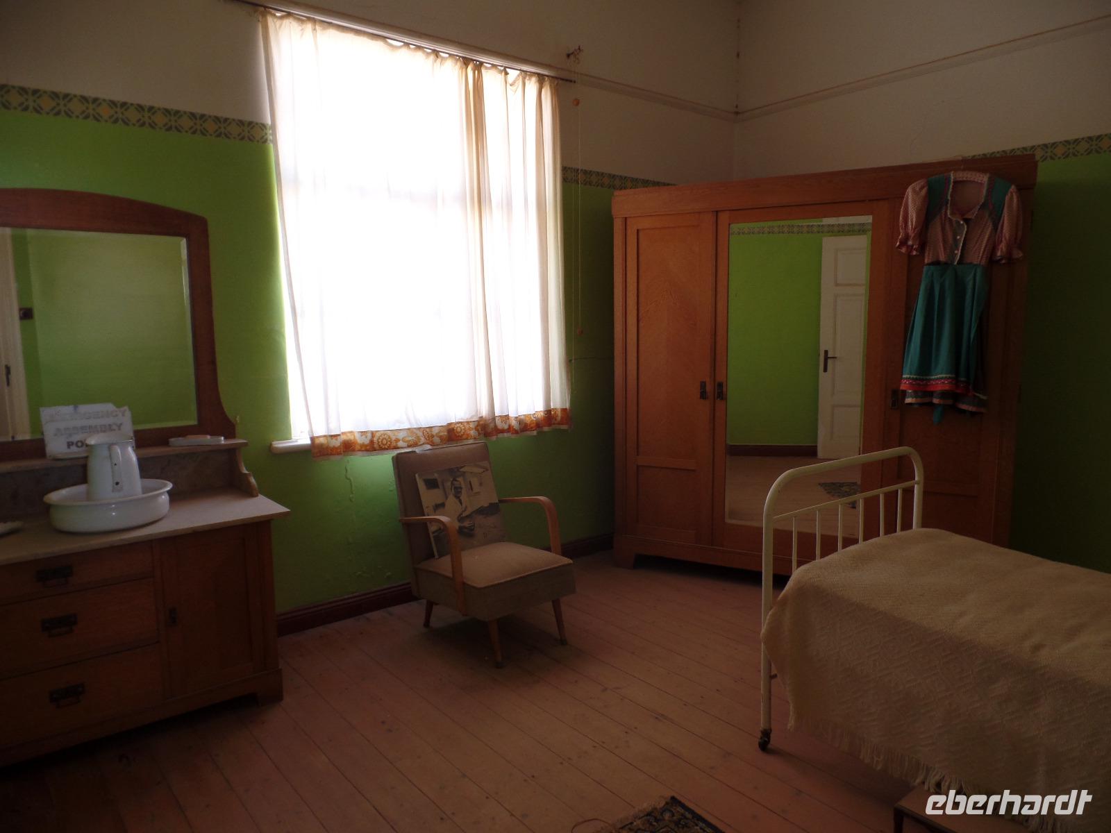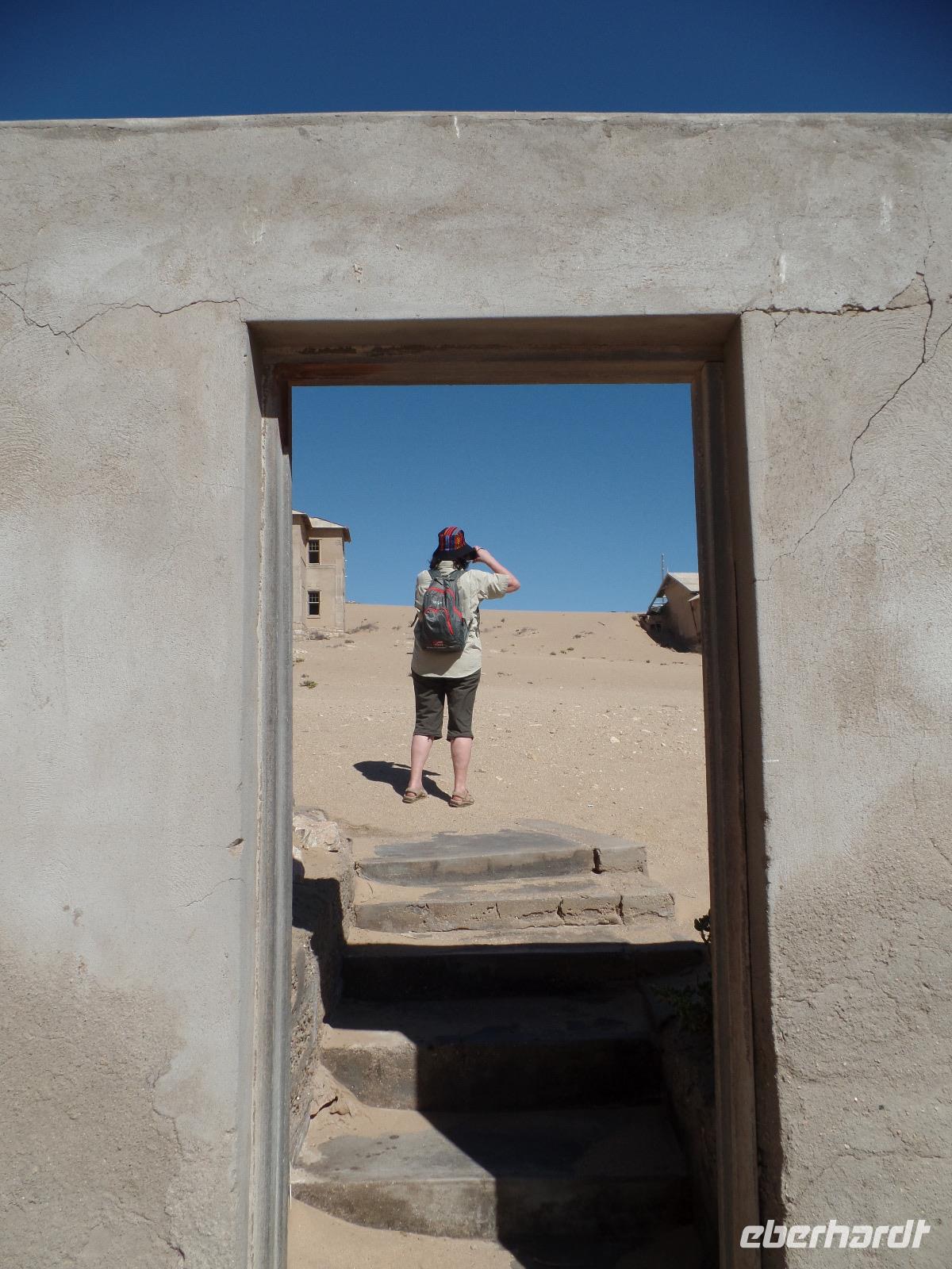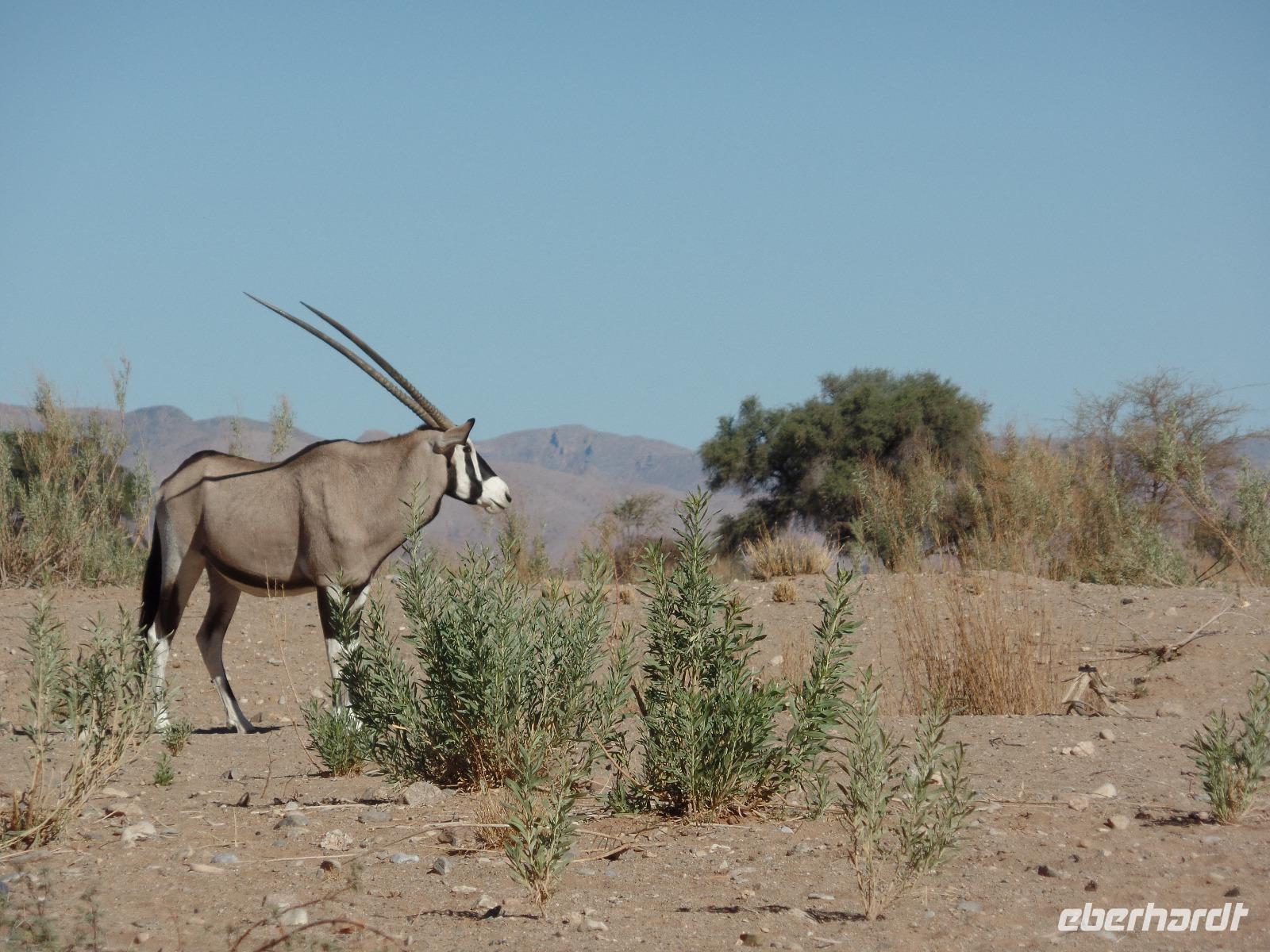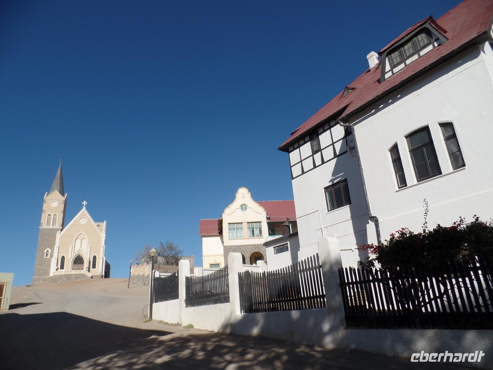 Am Morgen statteten wir der Felsenkirche in Lüderitz bei einem Spaziergang in der Stadt einen Besuch ab. Die kleine verträumte Stadt erinnerte uns mit ihren Fachwerkhäusern an das Erzgebirge. Selbst den Bergarbeitergruß „Glück auf" konnte man an einem Haus entdecken. Nachdem wir unseren reparierten Reifen abgeholt hatten konnten wir weiter nach Kolmanskop am Rande des Diamentensperrgebietes der Namib fahren. Während der Besichtigung stapften wir durch den tiefen Sand in der Geisterstadt und konnten uns durch anschauliche Wohnbeispiele in die Zeit des Diamantenfiebers zurückversetzen. Die Sonne wurde langsam heißer und so setzten wir unsere Reise in Richtung Landesinneren fort. Wir fuhren wieder durch endlose Weiten, sahen hier und da ein Oryx umherlaufen, fuhren an einem kunstvoll anmutenden Wasserrad vorbei, entdeckten bei einer Pause ein leider verendetes Zebra und kamen schließlich im kleinen Helmeringhausen an. Am Ortseingang konnte man schon den Ortsausgang sehen, dennoch war es allen bekannt, die das Buch „Hummel Dumm" gelesen hatten. Im üppig bewachsenen Garten einer Lodge konnten wir der Hitze in einer kleinen Mittagspause entgehen und fuhren anschließend weiter zur Dabis-Farm. Farmer Jörg empfing uns sehr herzlich und man hatte beim Kaffeetrinken das Gefühl, bei Freunden angekommen zu sein. Stolz erzählte er von seiner Familie und seiner Farm, welche er uns anschließend mit nicht weniger Freude bei einer Rundfahrt mit dem Jeep zeigte. Endlich sahen wir auch einige Kudus in der Ferne, seine eigens gezüchtete Schafherde durfte natürlich auch nicht fehlen. In der Dämmerung kamen wir wieder beim Farmhaus an, schnell den Staub und Sand des Tages abgeduscht, wartete schon das leckere Abendessen aus ökologischem Schafsfleisch, Salat und Auflauf auf uns. Spannende Geschichten rund um das Farmleben rundeten diesen Tag ab und wir gingen geschafft in unsere Bungalows schlafen.