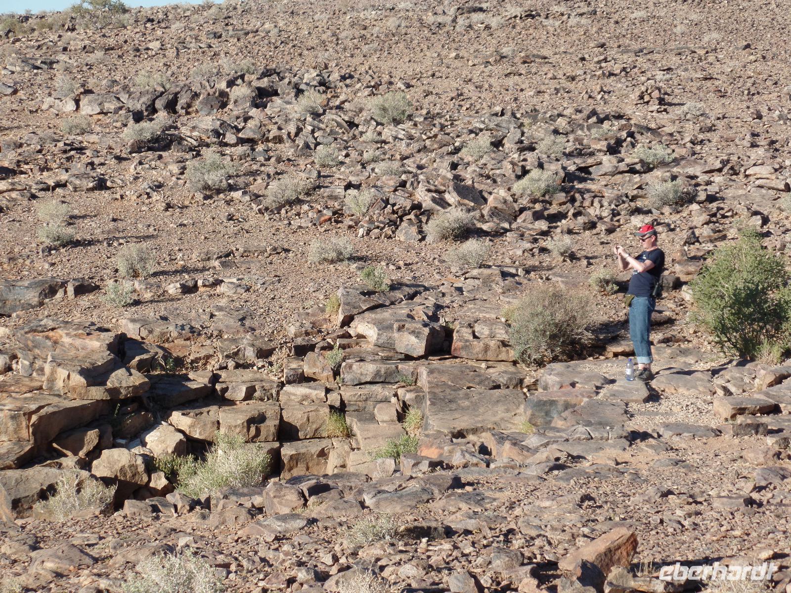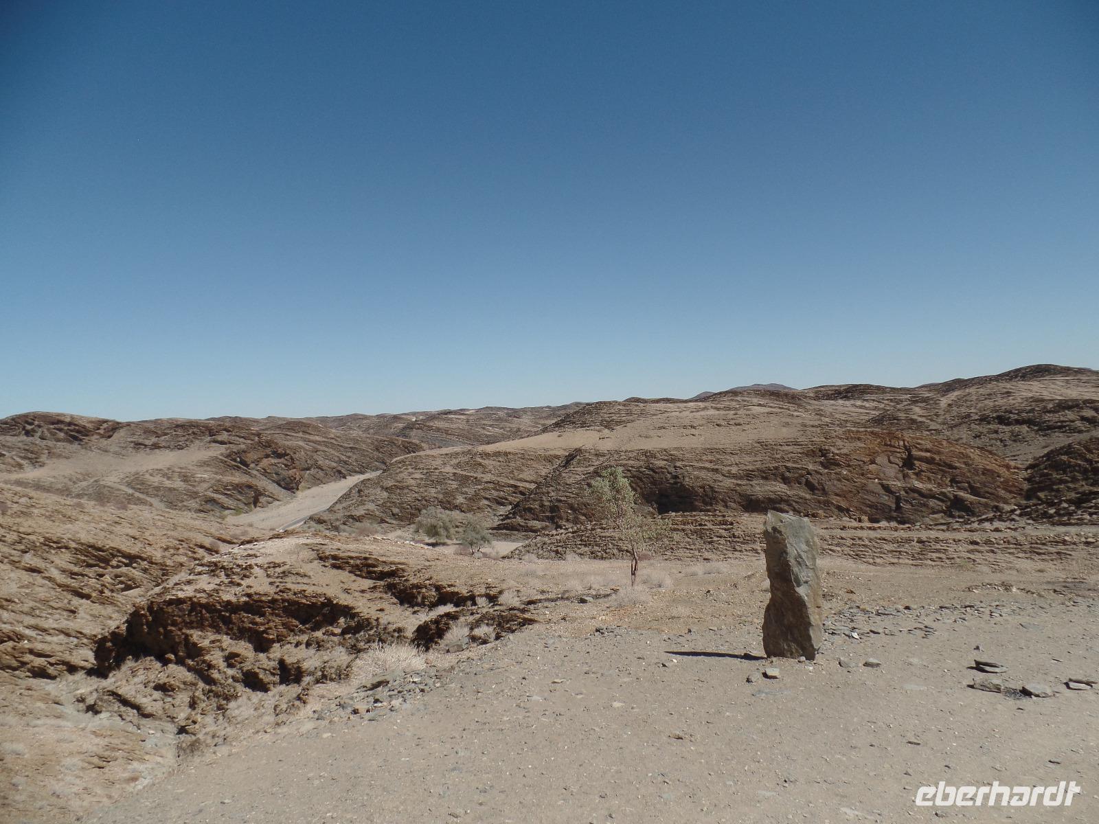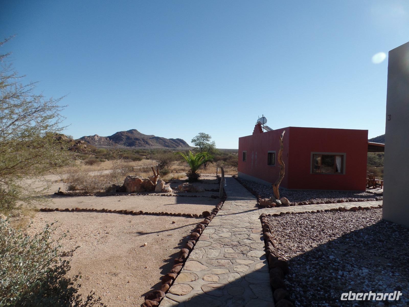 Wir verabschiedeten uns von Swakopmund und entfernten uns wieder von der Küste Richtung Erongo Berge im Damaraland. Da die Gegend reich an Halbedelsteinen ist, konnte man den Eingang anhand der Händler und des in der Ferne aus der Erde ragende majestätische Erongo-Massiv erkennen. Wir stöberten an den Ständen und der Ein oder Andere nahm sich einen Stein als Souvenir mit nach Hause. An der Spitzkoppe, auch „Matterhorn Namibias" genannt, unternahmen wir eine kleine Wanderung zum Rock Arch, wo wir im Schatten ein leckeres Picknick genossen. Am Nachmittag erreichten wir die Hohenstein Lodge, die zwischen Brandberg und Spitzkoppe am Fuß des höchsten Berges im Erongo Massiv lag. Bianca und Murray boten an mit ihnen ein kleines Stück zu wandern und die Gegend zu erkunden. Ein aktiver Teil der Gruppe nahm das Angebot gerne an. Die restliche Reisegruppe genoss die Annehmlichkeiten der Lodge mit einem guten Kaffee oder dem Sprung ins kühle Nass des Pools. Kurz vor dem schönen Sonnenuntergang trafen wir uns alle wieder zusammen und stießen auf das bisher Erlebte mit gekühltem Amarula an. Die Wandergruppe zeigte stolz gesammelte Stachelschwein-Stachel und Murray erzählte, dass er recht frische Puma-Spuren gefunden hatte. So ganz geheuer war es uns dann doch nicht in der Dämmerung etwas zu weit entfernt der Lodge zu stehen. Wir gingen rasch zurück und trafen uns alle zum gemeinsamen Abendessen an einer wundervoll gedeckten Tafel. Im Anschluss konnten wir einen kleinen Einblick in den erschwerlichen Abbau der Halbedelsteine schauen. Gemeinsam genossen wir die laue Nacht auf der Terrasse und im Dunkel der Nacht erkannte man kleine helle Lichter in der Bergwand des Hohenstein. Es waren die Lagerfeuer der vorher im Film erwähnten Bergleute.