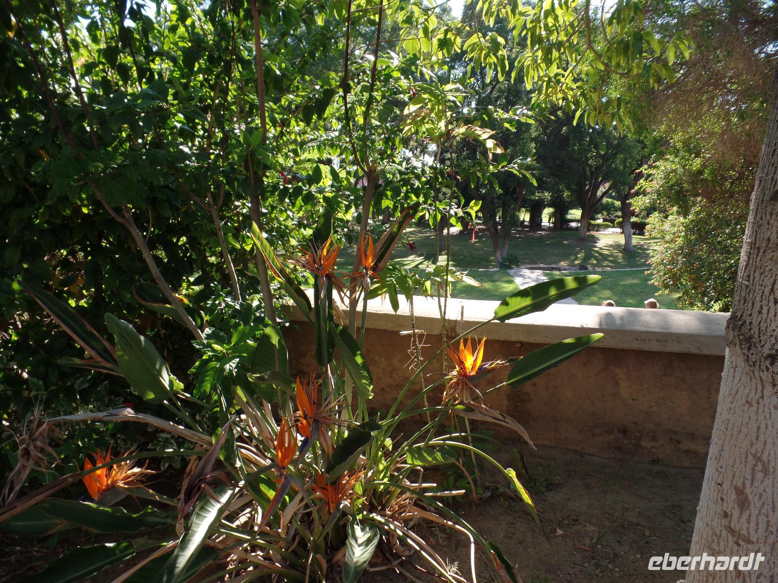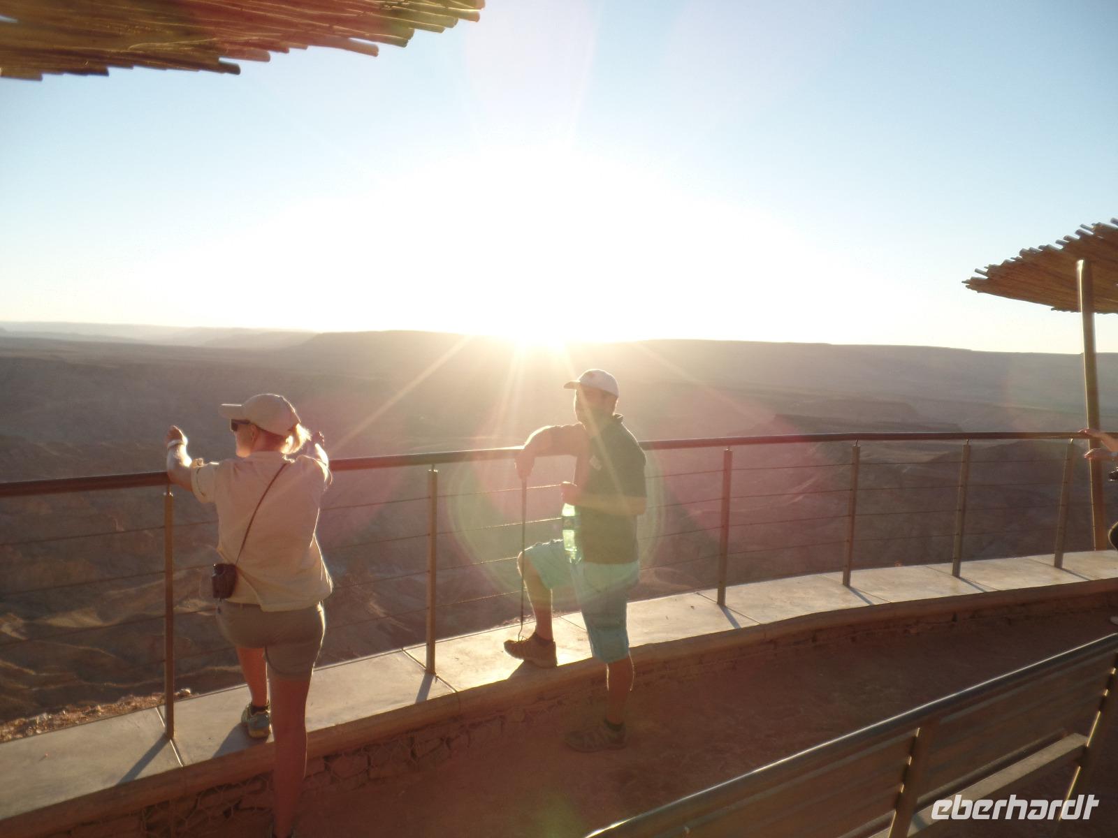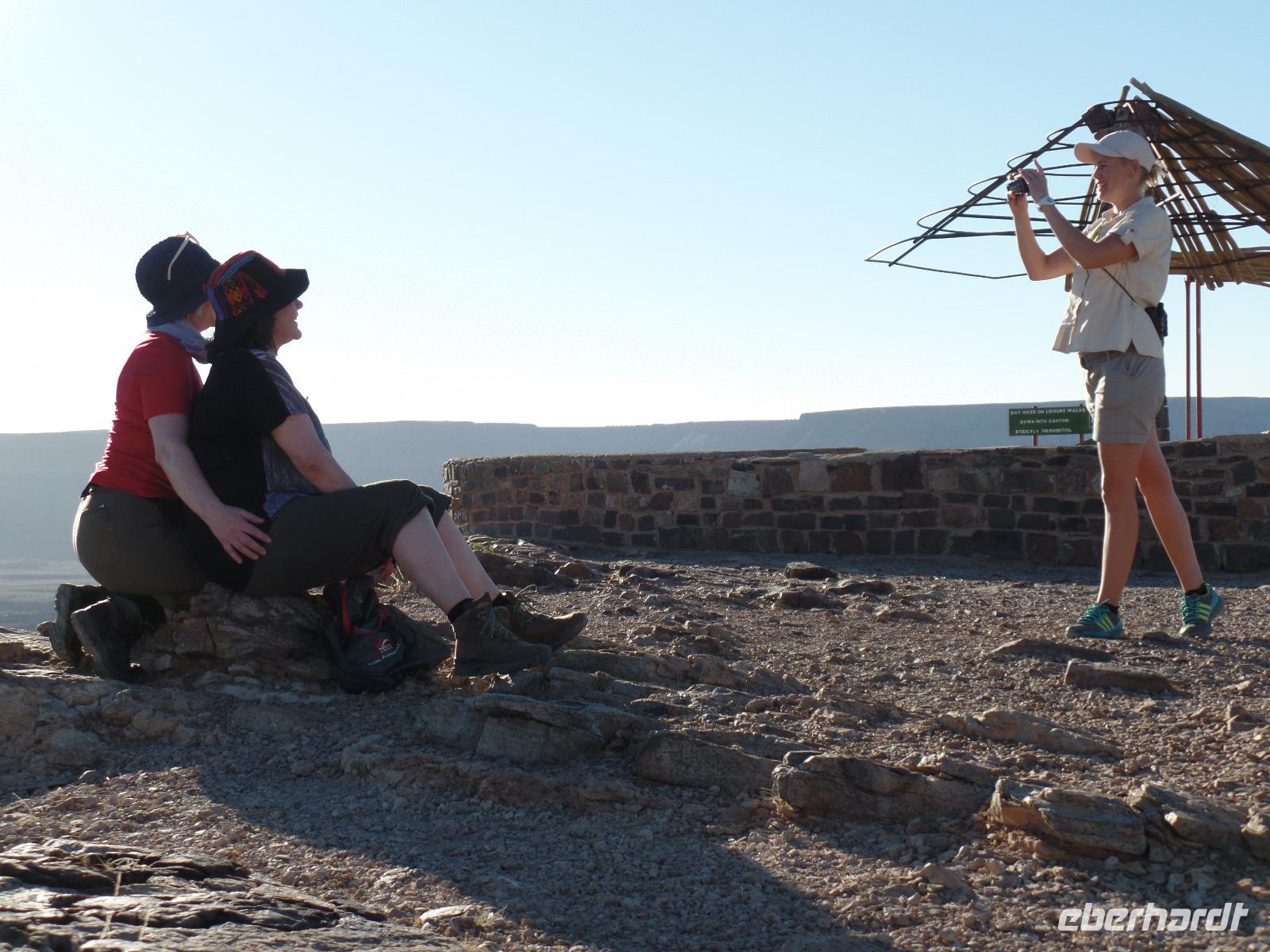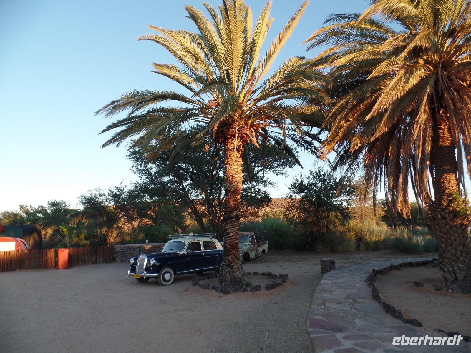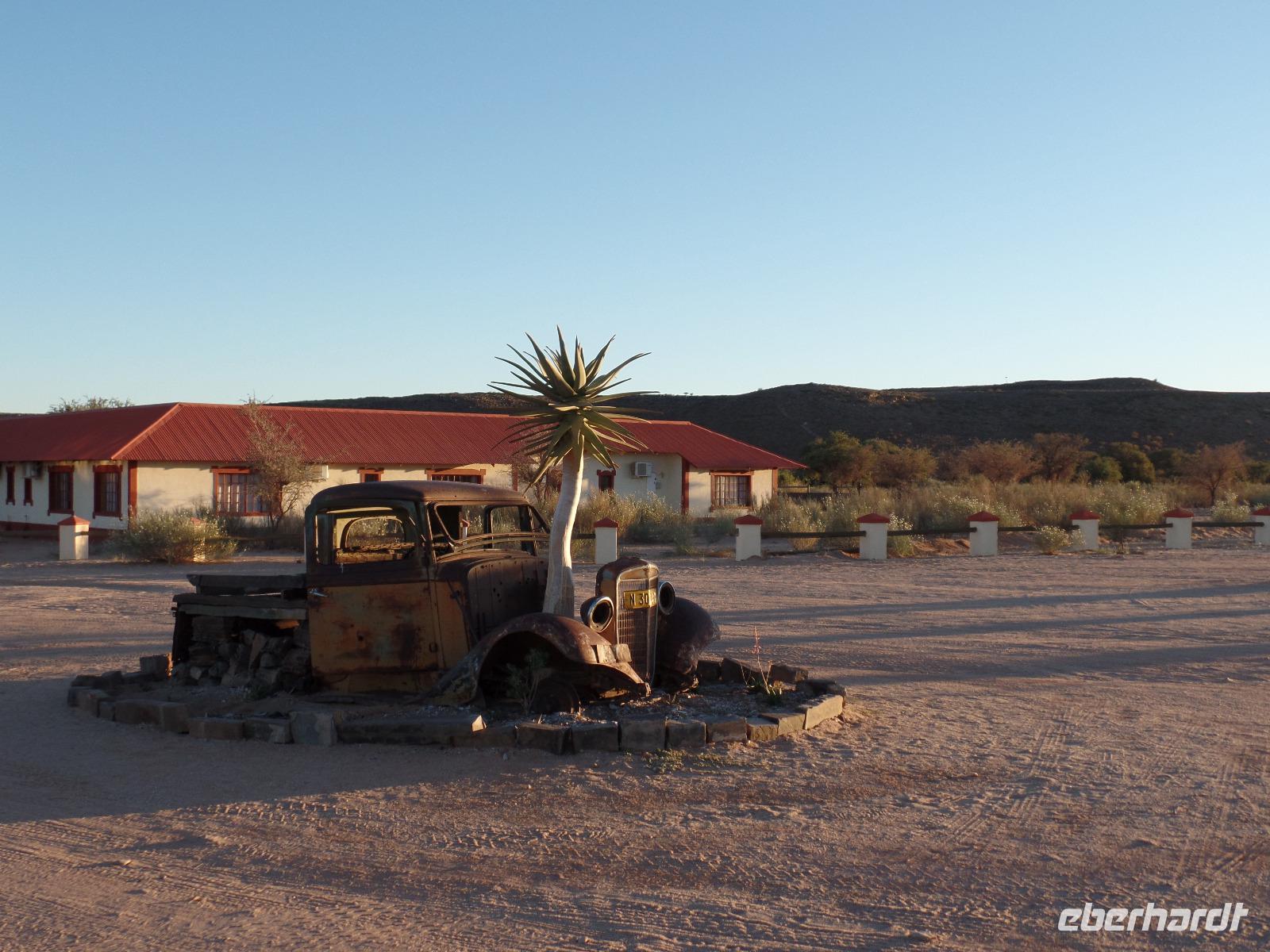 Der heutige Tag fing etwas anders an, als es geplant war. Einer unserer Reisegäste hatte Schmezen im Rücken und die hieß es zu beseitigen. Schließlich hatten wir noch einige Kilometer auf nicht ganz befestigten Straßen vor uns. Während des Arztbesuches vertrieb sich die restliche Reisegruppe die Zeit in einem Shoppingcenter in Keetmanshoop und gegen Mittag konnten wir unsere Fahrt in Richtung Süden fortsetzen. Während der Fahrt genossen wir die Landschaft, die sich immer wieder veränderte. Wir fuhren vorbei am Naute-Staudamm und einem Anbaugebiet für Tafeltrauben und auch Datteln. Bianca erzählte uns, mit welchen Tricks der Anbau schließlich gelingt und die Ernte auch sehr erfolgreich exportiert wird. Die Landschaft veränderte sich immer mehr in eine Wüste, wir sahen wieder Oryxe und Strauße und auch dazu konnte uns Bianca die Fahrtzeit mit ihren Ausführungen etwas verkürzen. Oldtimer und Palmen begrüßten uns im Canyon Roadhouse. Unsere Lodge wirkte inmitten der Wüste wie eine kleine Oase, deren Erfrischung und leckeren Snacks wir dankend annahmen. Am Nachmittag brachte uns unser Dreamteam zum ersten Höhepunkt der Reise. Wir fuhren zum zweitgrößten Canyon der Welt - dem Fish River Canyon. Bei einer willkommenen kleinen Wanderung entlang des Canyons konnten wir das beeindrucktende Panorama kaum fassen. Ein paar Bergzebras in der Ferne rundeten den Ausflug ab. Den Abend verbrachten wir wieder in geselliger Runde bei sehr gutem Essen und einer kleinen Beobachtung des wunderschönen Sternenhimmels.