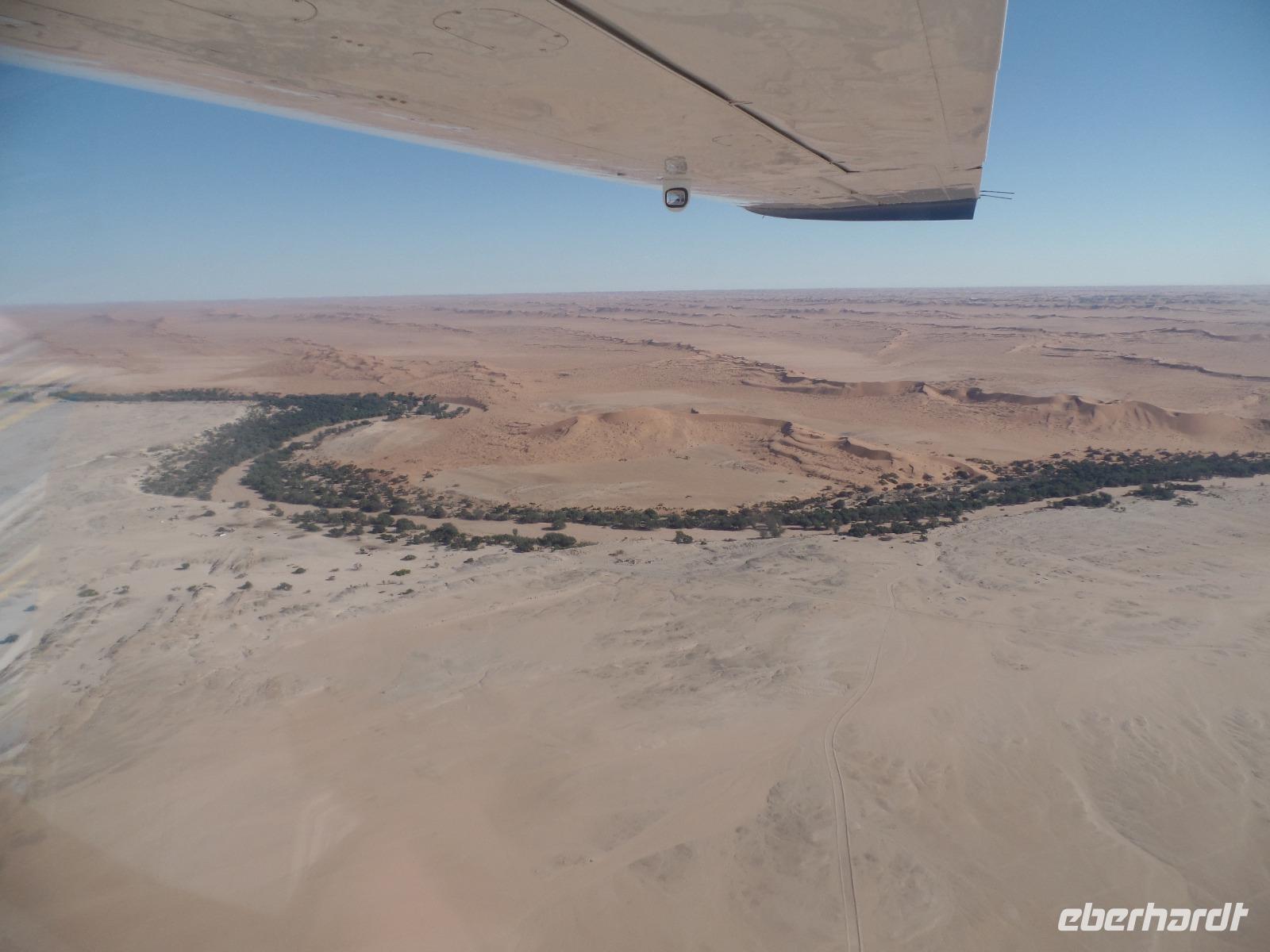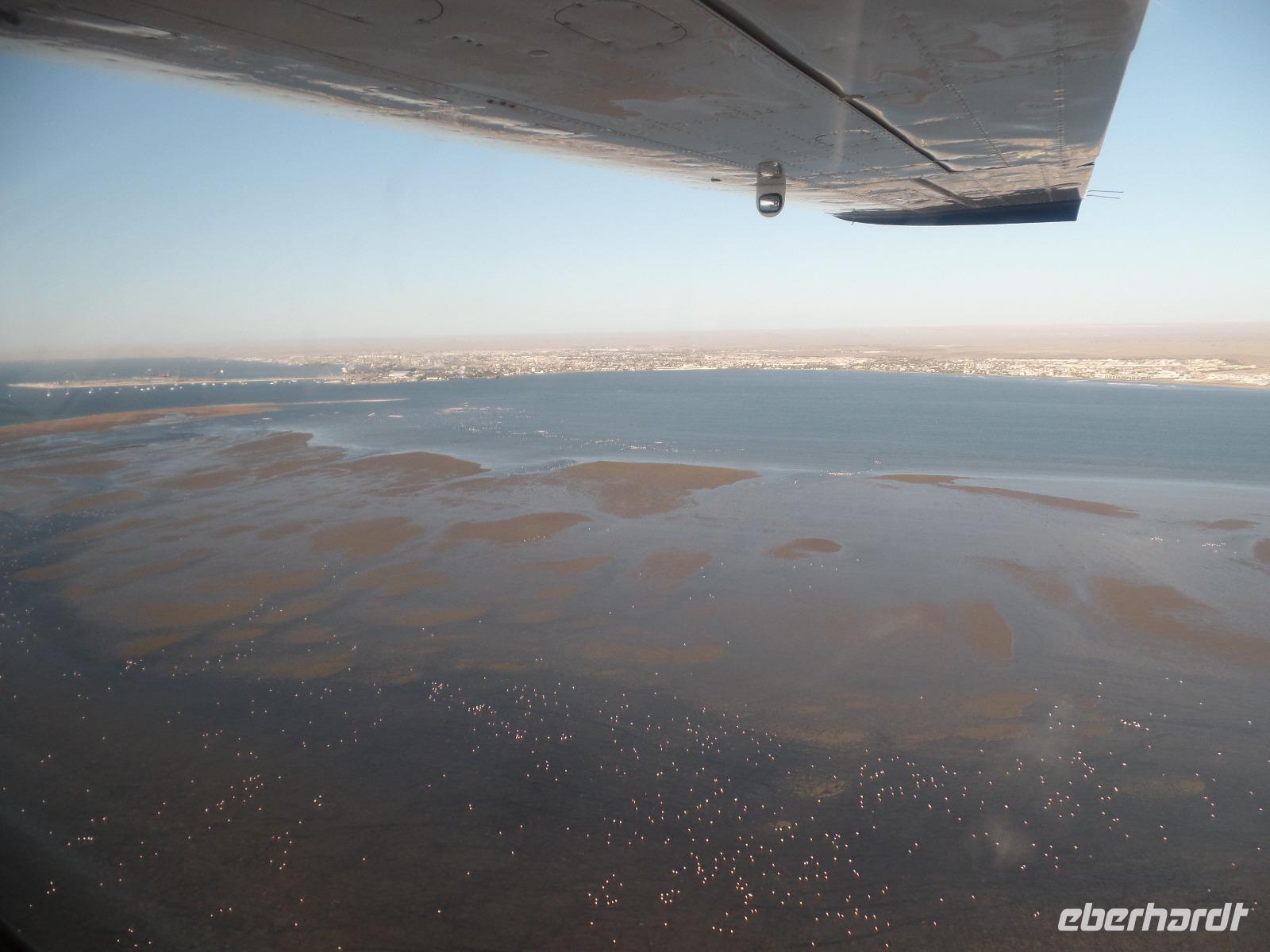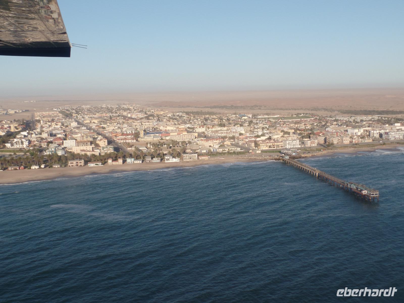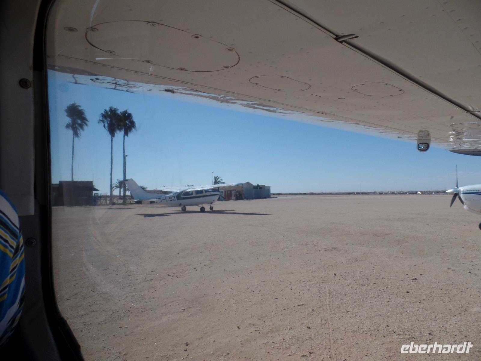 Wir hielten in der Nähe eine Robbenkolonie und bekamen neben frischen Austern allerlei Leckereien, die das Meer so bietet. Der Sekt setzte dem ganzen das bekannte i-Tüpfelchen auf. Wir genossen das Essen und die restliche Fahrt in vollen Zügen. Zurück in Swakopmund wartete das nächste Abenteuer schon auf uns. Wir nahmen an einem Rundflug mit zwei kleinen Propellermaschinen über die Wüste Namibias teil. Der Rundflug startete in Swakopmund, über den Kuiseb Canyon zur Düne 45 im Sossusvlei weiter über das Diamentensperrgebiet zur Conception Bay und endete wieder an der Walvis Bay in Swakopmund. Über zwei Stunden atemberaubende Aussichten und bekannte fantastische Landschaften, die wir vorher schon mit dem Bus besichtigt hatten, machten uns sprachlos. Den Abend verbrachten wir wieder in geselliger Runde in einem der ansässigen Restaurants.