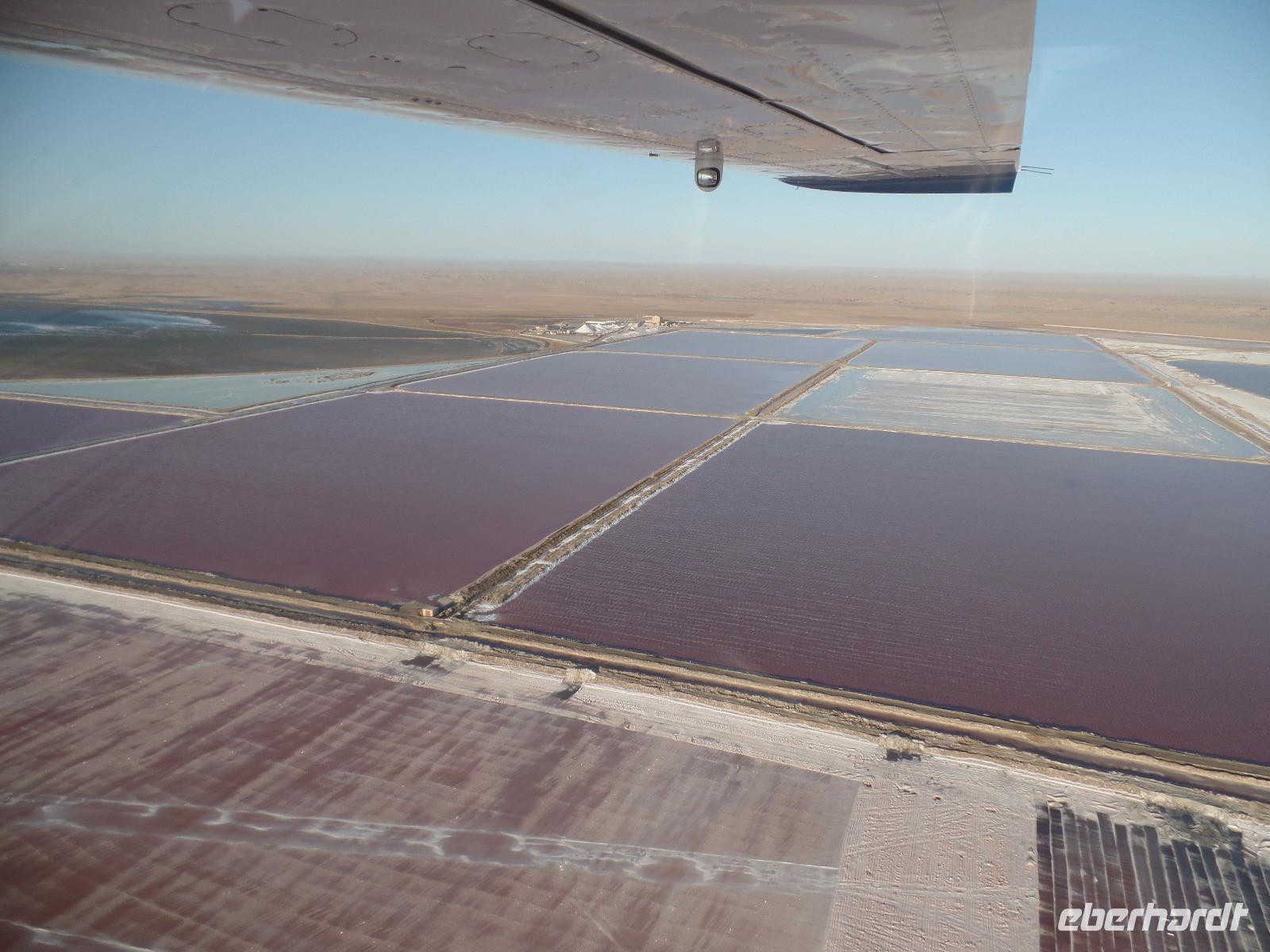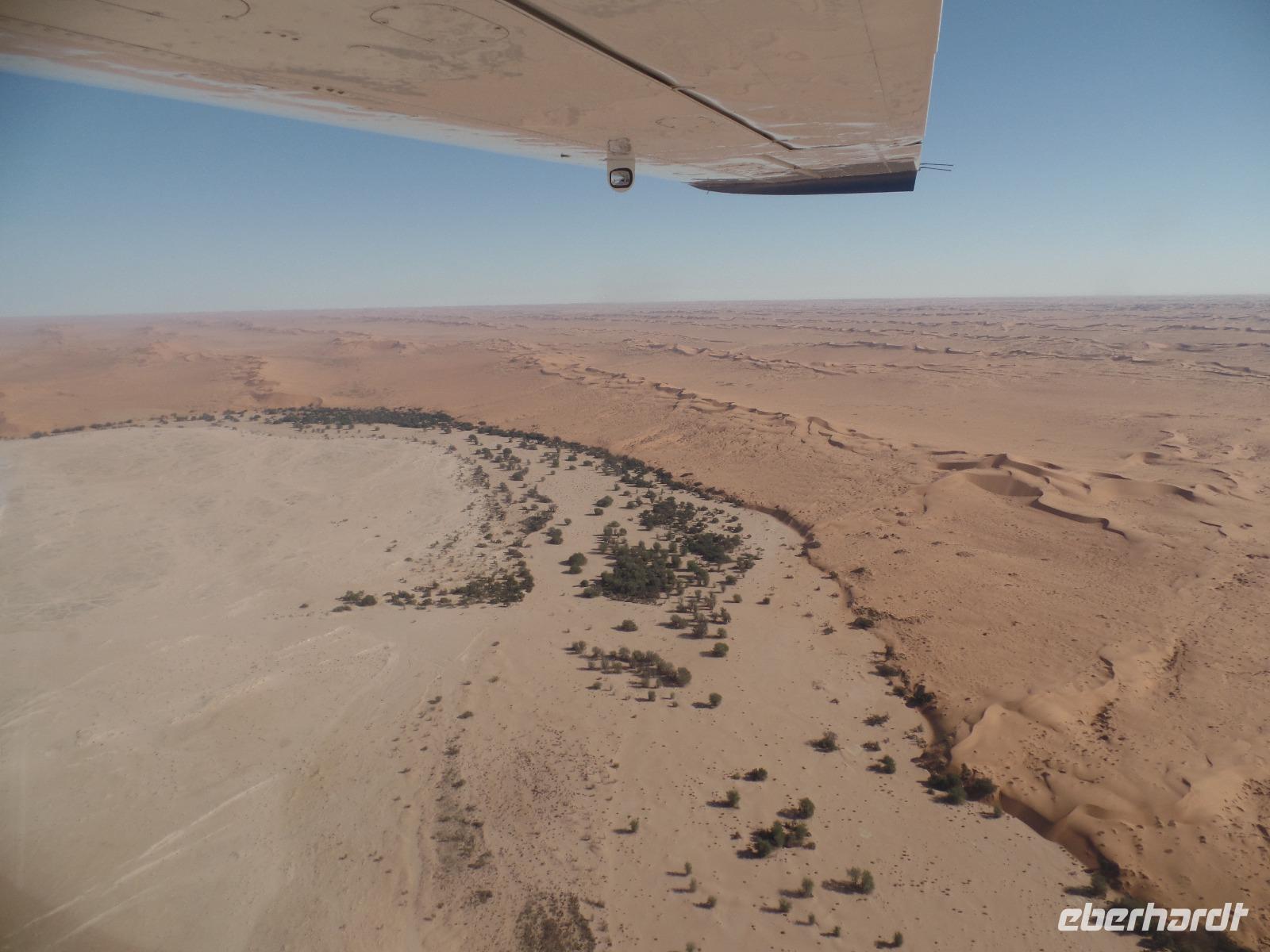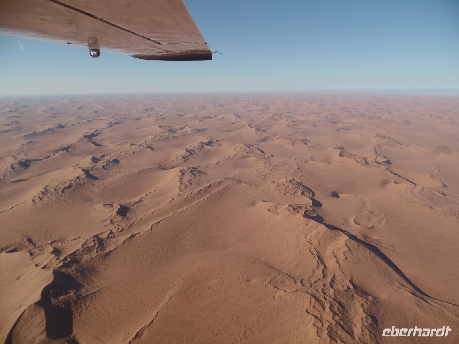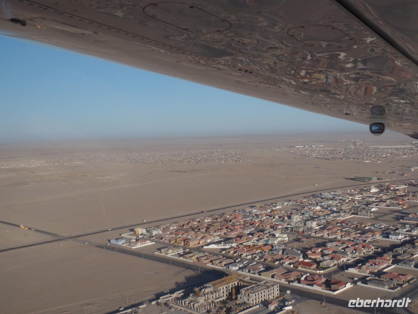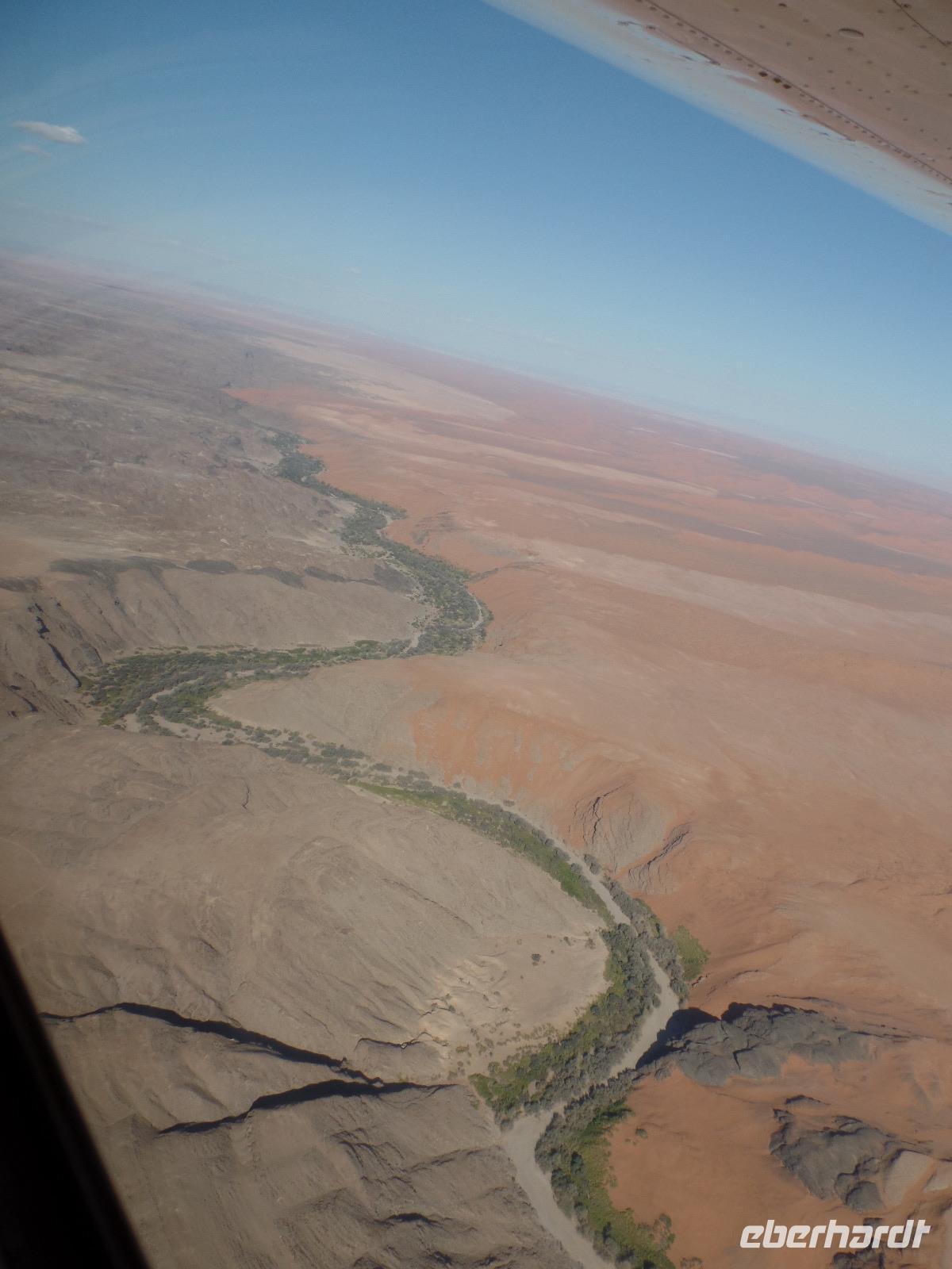 Wir hielten in der Nähe eine Robbenkolonie und bekamen neben frischen Austern allerlei Leckereien, die das Meer so bietet. Der Sekt setzte dem ganzen das bekannte i-Tüpfelchen auf. Wir genossen das Essen und die restliche Fahrt in vollen Zügen. Zurück in Swakopmund wartete das nächste Abenteuer schon auf uns. Wir nahmen an einem Rundflug mit zwei kleinen Propellermaschinen über die Wüste Namibias teil. Der Rundflug startete in Swakopmund, über den Kuiseb Canyon zur Düne 45 im Sossusvlei weiter über das Diamentensperrgebiet zur Conception Bay und endete wieder an der Walvis Bay in Swakopmund. Über zwei Stunden atemberaubende Aussichten und bekannte fantastische Landschaften, die wir vorher schon mit dem Bus besichtigt hatten, machten uns sprachlos. Den Abend verbrachten wir wieder in geselliger Runde in einem der ansässigen Restaurants.
