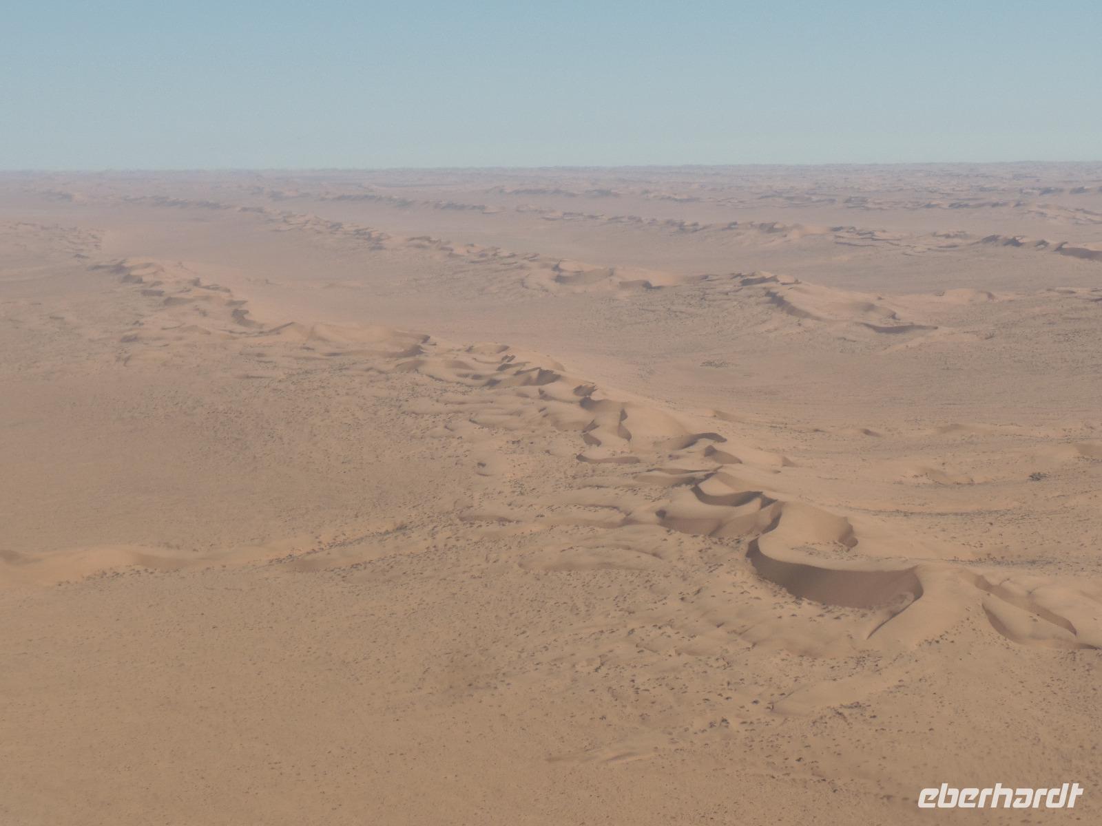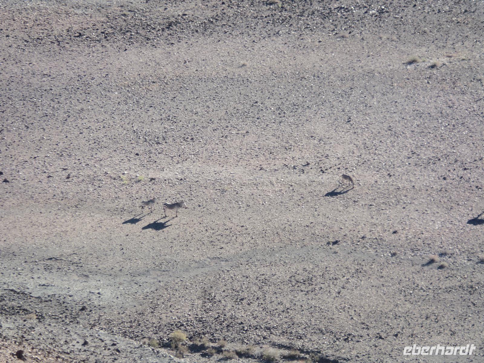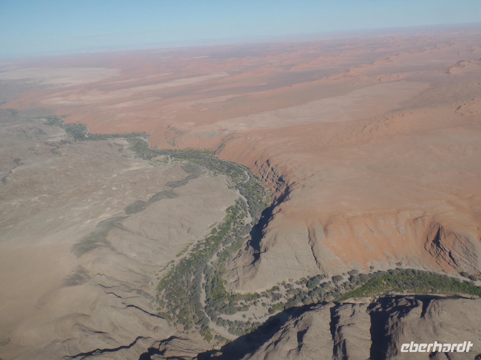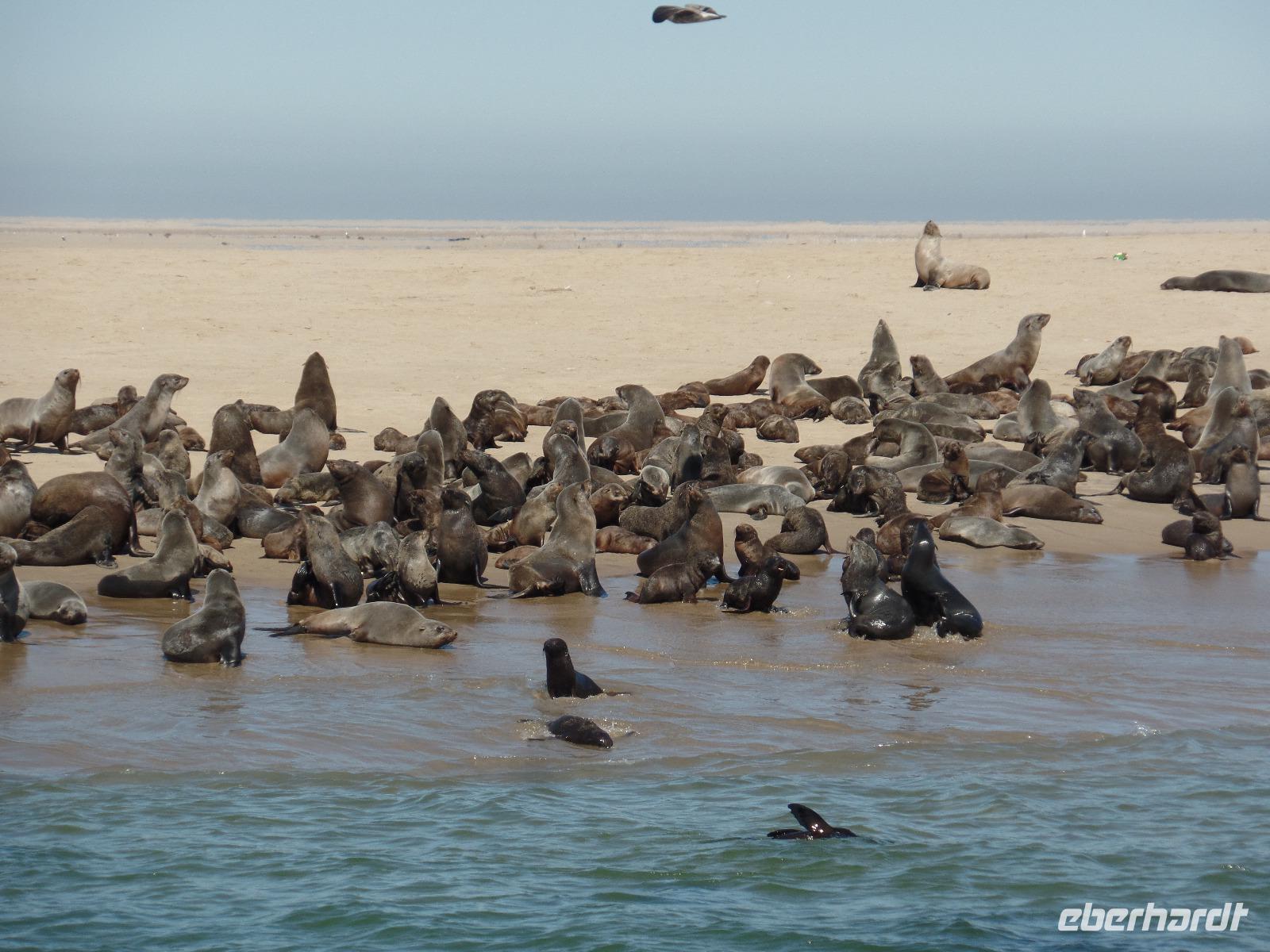Wir hielten in der Nähe eine Robbenkolonie und bekamen neben frischen Austern allerlei Leckereien, die das Meer so bietet. Der Sekt setzte dem ganzen das bekannte i-Tüpfelchen auf. Wir genossen das Essen und die restliche Fahrt in vollen Zügen. Zurück in Swakopmund wartete das nächste Abenteuer schon auf uns. Wir nahmen an einem Rundflug mit zwei kleinen Propellermaschinen über die Wüste Namibias teil. Der Rundflug startete in Swakopmund, über den Kuiseb Canyon zur Düne 45 im Sossusvlei weiter über das Diamentensperrgebiet zur Conception Bay und endete wieder an der Walvis Bay in Swakopmund. Über zwei Stunden atemberaubende Aussichten und bekannte fantastische Landschaften, die wir vorher schon mit dem Bus besichtigt hatten, machten uns sprachlos. Den Abend verbrachten wir wieder in geselliger Runde in einem der ansässigen Restaurants.