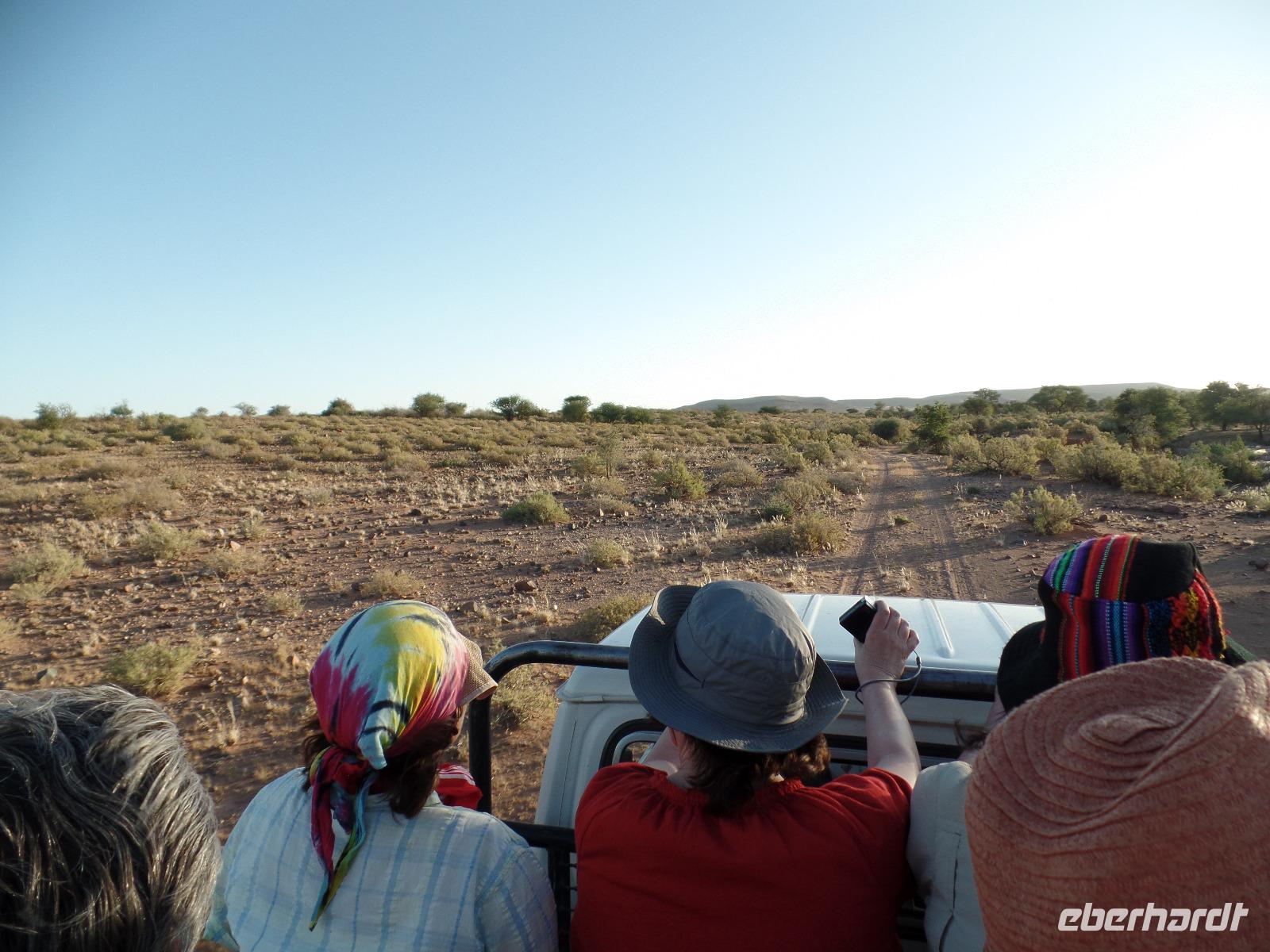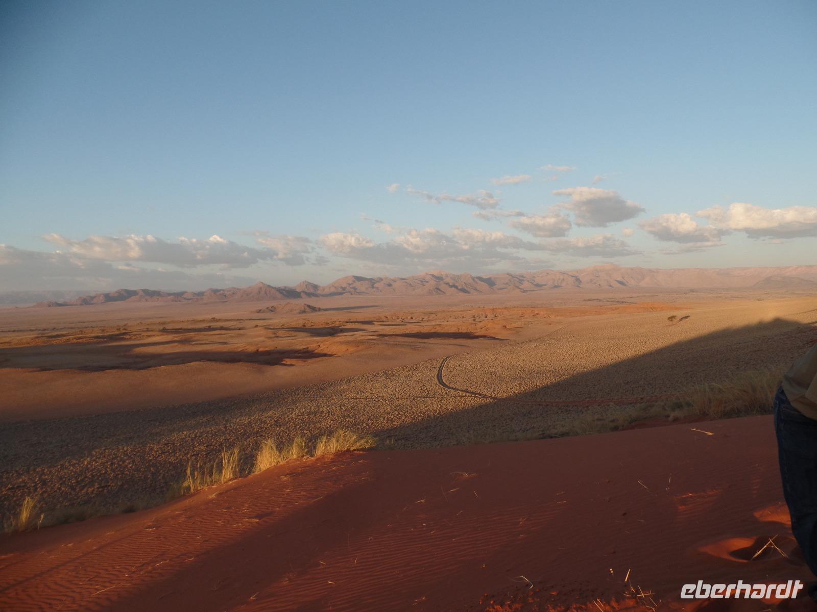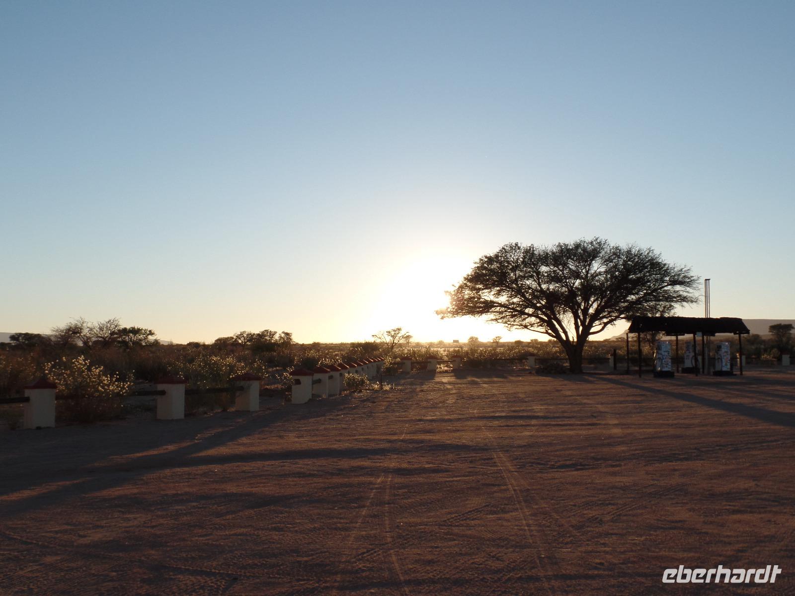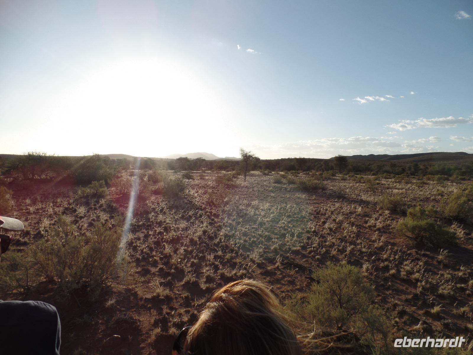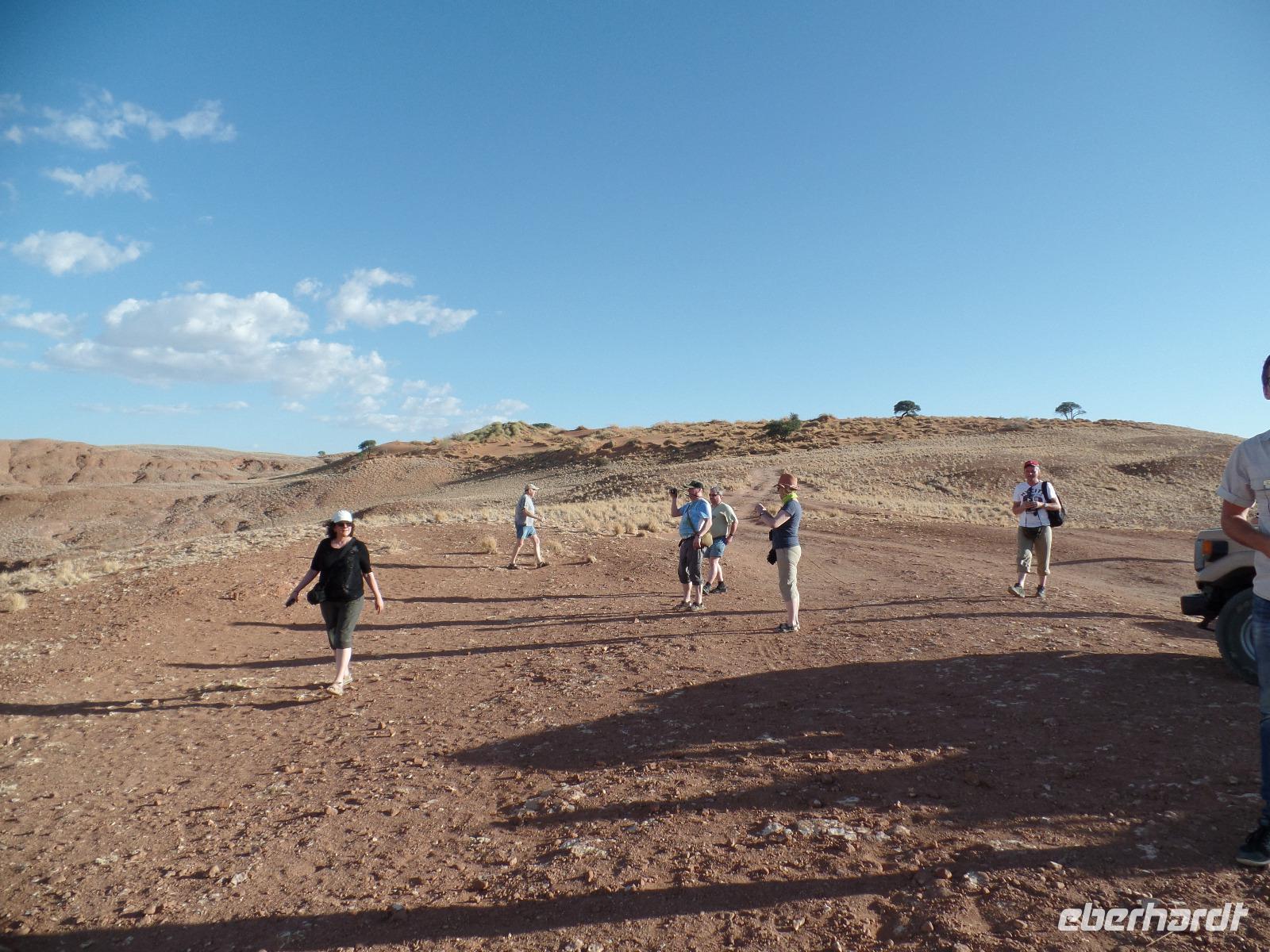 Die ersten Sonnenstrahlen stiegen über die umliegenden Berge der Farm und schon wuselte es um das Farmhaus. Die Hühner wollten gefüttert werden, kleine Rotkopfpapageien wirbelten auf den Blechdächern der Bungalows, die drei Kinder der Familie Dabis waren munter und der Duft frischen Kaffees wehte um die Nase. Nach einem guten Frühstück zeigt uns Jörg seinen Gemüsegarten, was man doch eher als Gemüsefelder bezeichnen konnte. Auch die eigene Solaranlage mit Werkstatt versetzte uns in Staunen. Wir schrieben gerne ein paar Zeilen in das Gästebuch und verabschiedeten uns von der herzlichen Familie. Erster Stopp des Tages war der Ort Maltahöhe. Ein kleiner Laden schien seit einigen Jahrzehnten alles zu sammeln, was interessant schien. Alte Dosen hingen von der Decke, die Wände waren mit Sprachen aus der gesamten Welt beschrieben, alte Nähmaschinen und Kinderwagen konnte man entdecken ... ein richtiger kleiner Krämerladen war das. Gespannt, was uns noch am heutigen Tag erwartet, fuhren wir durch die wunderschöne namibische Wüstenlandschaft weiter zur Grenze der Namib. Unsere Lodge für die nächsten zwei Nächte war wie eine kleine Oase. Der Pool wurde gleich von einigen auf seine „Frische" getestet. Was für eine angenehme Abkühlung! Am späten Nachmittag brachen wir noch auf, eine einzigartige Jeeptour in der rötlich schimmernden Wüstenlandschaft zu unternehmen. Die langsam untergehende Sonne lies die angrenzende Namib in jeder Minute anders aussehen. Auf einer Anhöhe beobachteten wir bei Gin Tonic und guter Laune den fantastischen Sonnenuntergang. In der Ferne konnte man einige Oryxe laufen sehen, sogar ein Hochzeitspaar nutzte die wundervolle Stimmung um zu heiraten. Wir stimmten einige Lieder an und fuhren vergnügt in die Lodge zurück, wo wir gemeinsam aßen.