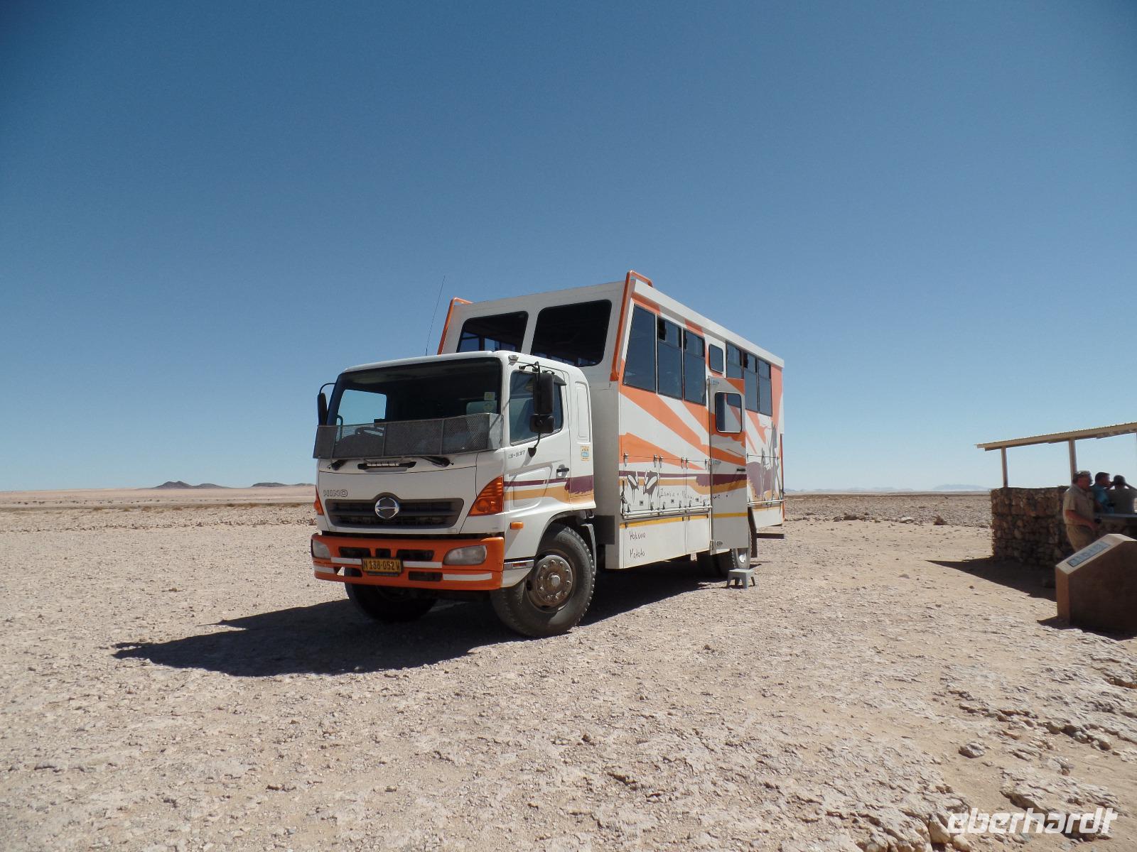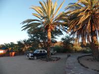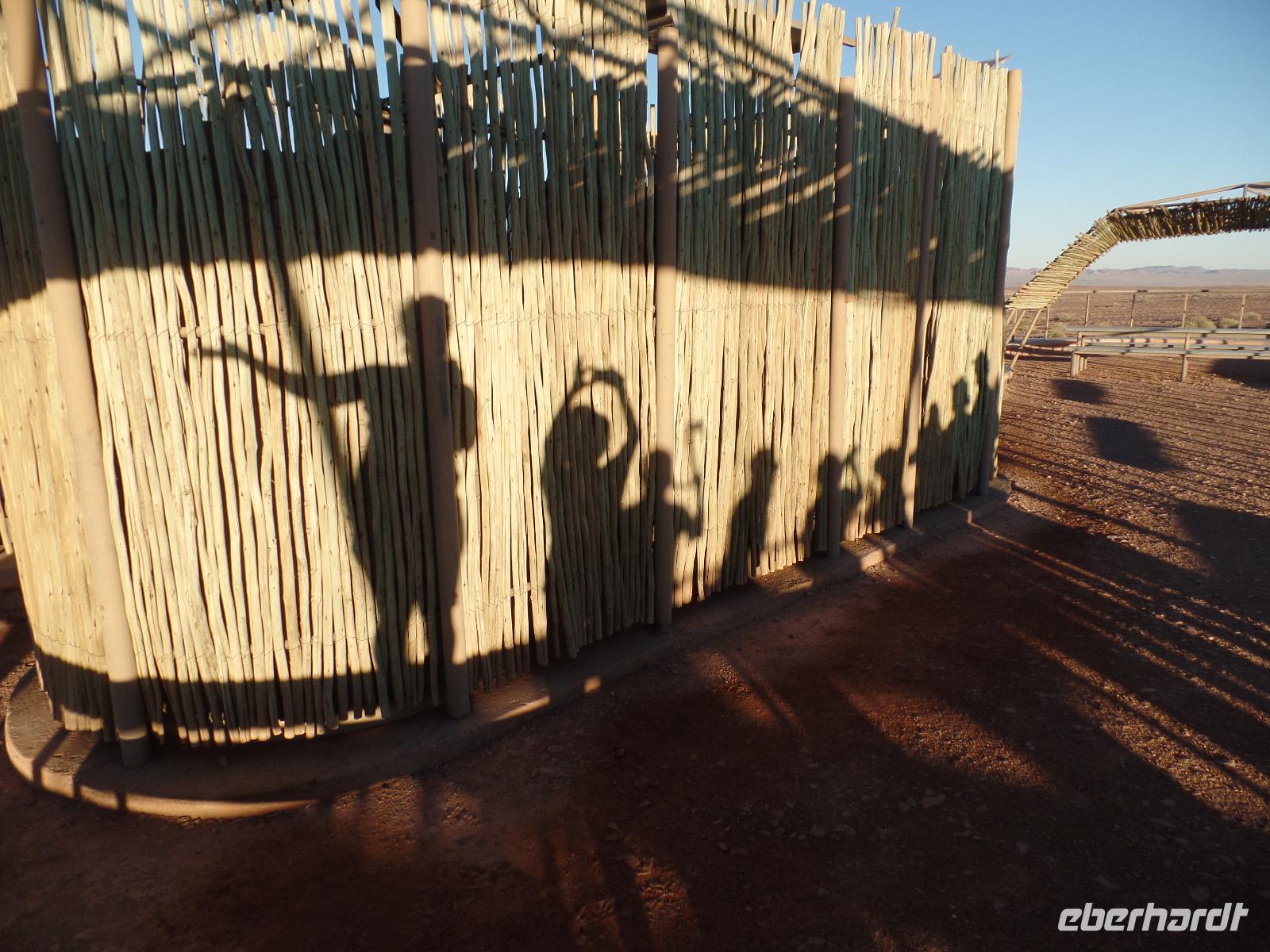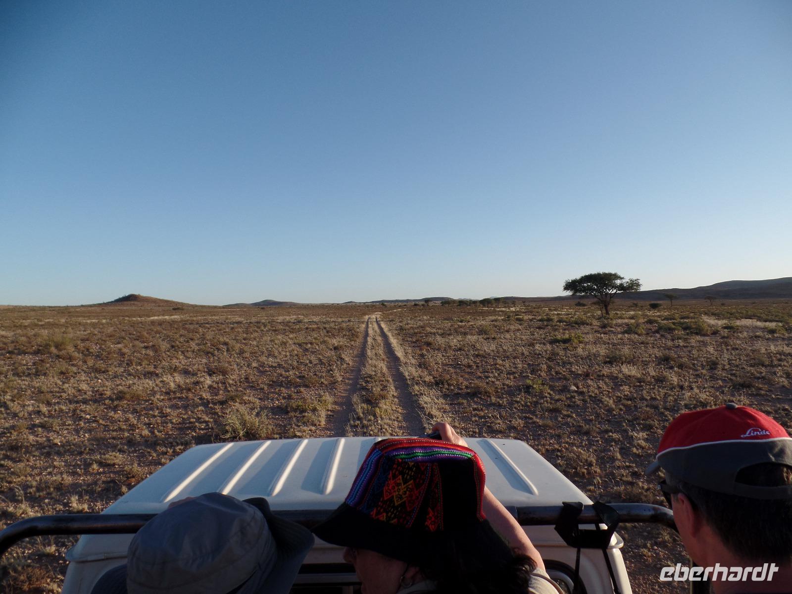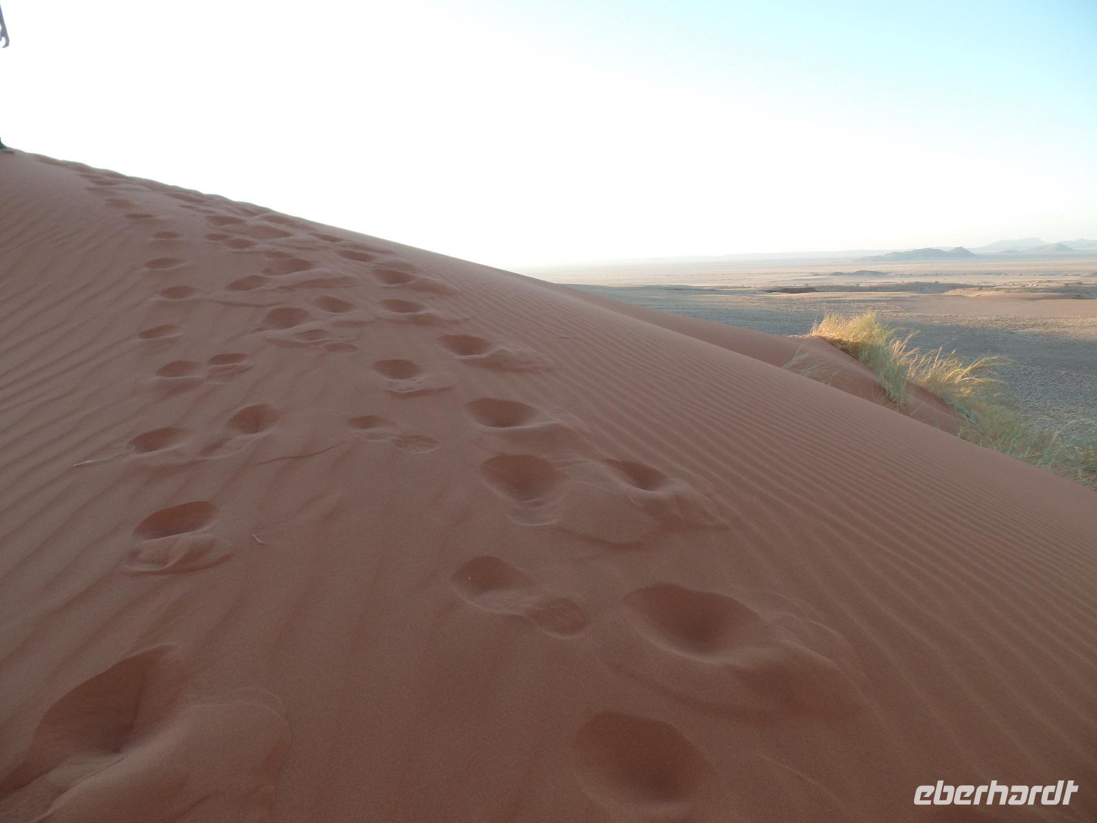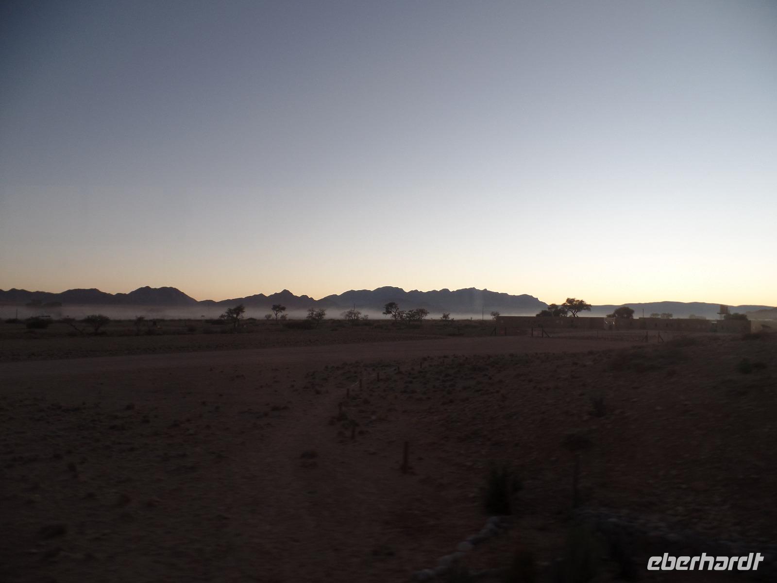 Die ersten Sonnenstrahlen stiegen über die umliegenden Berge der Farm und schon wuselte es um das Farmhaus. Die Hühner wollten gefüttert werden, kleine Rotkopfpapageien wirbelten auf den Blechdächern der Bungalows, die drei Kinder der Familie Dabis waren munter und der Duft frischen Kaffees wehte um die Nase. Nach einem guten Frühstück zeigt uns Jörg seinen Gemüsegarten, was man doch eher als Gemüsefelder bezeichnen konnte. Auch die eigene Solaranlage mit Werkstatt versetzte uns in Staunen. Wir schrieben gerne ein paar Zeilen in das Gästebuch und verabschiedeten uns von der herzlichen Familie. Erster Stopp des Tages war der Ort Maltahöhe. Ein kleiner Laden schien seit einigen Jahrzehnten alles zu sammeln, was interessant schien. Alte Dosen hingen von der Decke, die Wände waren mit Sprachen aus der gesamten Welt beschrieben, alte Nähmaschinen und Kinderwagen konnte man entdecken ... ein richtiger kleiner Krämerladen war das. Gespannt, was uns noch am heutigen Tag erwartet, fuhren wir durch die wunderschöne namibische Wüstenlandschaft weiter zur Grenze der Namib. Unsere Lodge für die nächsten zwei Nächte war wie eine kleine Oase. Der Pool wurde gleich von einigen auf seine „Frische" getestet. Was für eine angenehme Abkühlung! Am späten Nachmittag brachen wir noch auf, eine einzigartige Jeeptour in der rötlich schimmernden Wüstenlandschaft zu unternehmen. Die langsam untergehende Sonne lies die angrenzende Namib in jeder Minute anders aussehen. Auf einer Anhöhe beobachteten wir bei Gin Tonic und guter Laune den fantastischen Sonnenuntergang. In der Ferne konnte man einige Oryxe laufen sehen, sogar ein Hochzeitspaar nutzte die wundervolle Stimmung um zu heiraten. Wir stimmten einige Lieder an und fuhren vergnügt in die Lodge zurück, wo wir gemeinsam aßen.